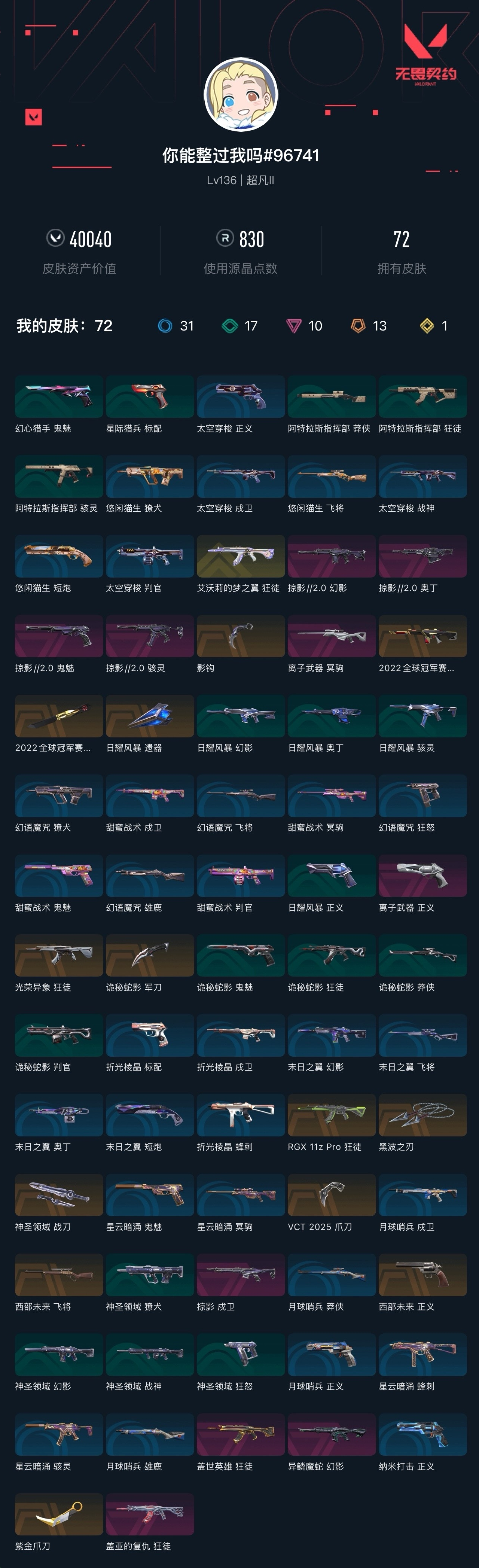 【无畏契约】【yhwww6645】等级:136,已用无畏点40040,已用源晶点830,金皮:狂徒-艾沃莉的梦之翼__橙皮:近战-黑波之刃|近战-紫金爪刀|近战-神圣领域 战刀|飞将-西部未来|正义-西部未来|近战-vct 2025 爪刀|近战-诡秘蛇影 军刀|狂徒-光荣异象|近战-日耀风暴 遗器|狂徒-rgx 11z pro|近战-2022全球冠军赛 蝴蝶刀|幻影-2022全球冠军赛|近战-影钩__紫皮:狂徒-盖世英雄|狂徒-盖亚的复仇|冥驹-离子武器|正义-离子武器|戍卫-掠影|幻影-异鳞魔蛇|骇灵-掠影2.0|奥丁-掠影2.0|鬼魅-掠影2.0|幻影-掠影2.0__段位:超凡__蓝皮:正义-纳米打击|鬼魅-星云暗涌|骇灵-星云暗涌|正义-月球哨兵|莽侠-月球哨兵|戍卫-月球哨兵|雄鹿-月球哨兵|冥驹-星云暗涌|蜂刺-星云暗涌|蜂刺-折光棱晶|戍卫-折光棱晶|标配-折光棱晶|飞将-末日之翼|幻影-末日之翼|短炮-末日之翼|奥丁-末日之翼|鬼魅-甜蜜战术|判官-甜蜜战术|戍卫-甜蜜战术|雄鹿-幻语魔咒|獠犬-幻语魔咒|飞将-幻语魔咒|狂怒-幻语魔咒|正义-太空穿梭|战神-太空穿梭|判官-太空穿梭|戍卫-太空穿梭|骇灵-阿特拉斯指挥部|莽侠-阿特拉斯指挥部|狂徒-阿特拉斯指挥部__绿皮:獠犬-神圣领域|狂怒-神圣领域|战神-神圣领域|幻影-神圣领域|判官-诡秘蛇影|鬼魅-诡秘蛇影|莽侠-诡秘蛇影|狂徒-诡秘蛇影|正义-日耀风暴|幻影-日耀风暴|奥丁-日耀风暴|短炮-悠闲猫生|飞将-悠闲猫生|獠犬-悠闲猫生|标配-星际猎兵|鬼魅-幻心猎手__英雄:尚勃勒|维斯|黑梦|斯凯|暮蝶|盖可|霓虹|壹决|星礈|k/o|幽影|夜露|钢锁|海神|奇乐|炼狱|铁臂|贤者|猎枭|钛狐|芮娜|零|捷风|蝰蛇|不死鸟|幻棱|雷兹|禁灭