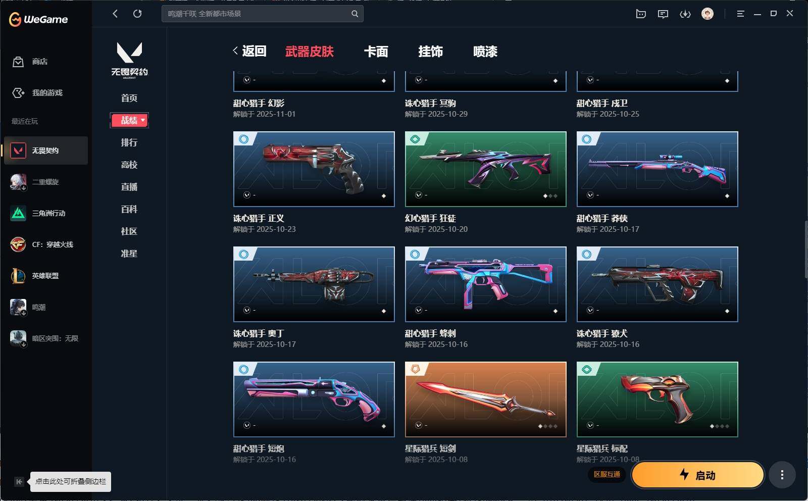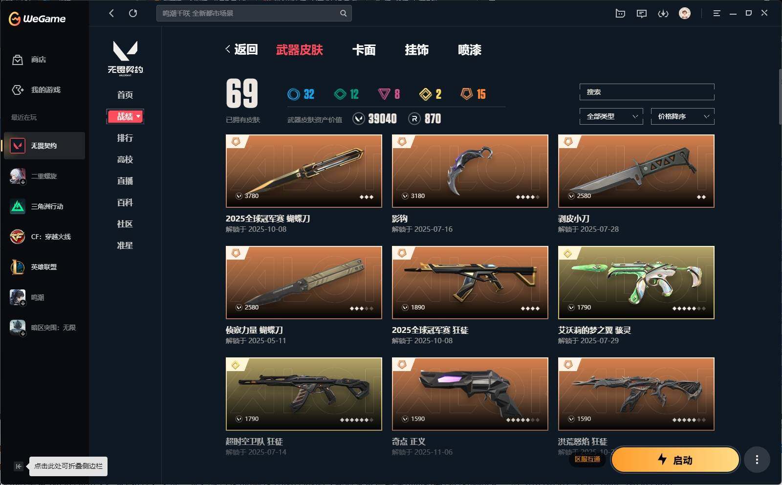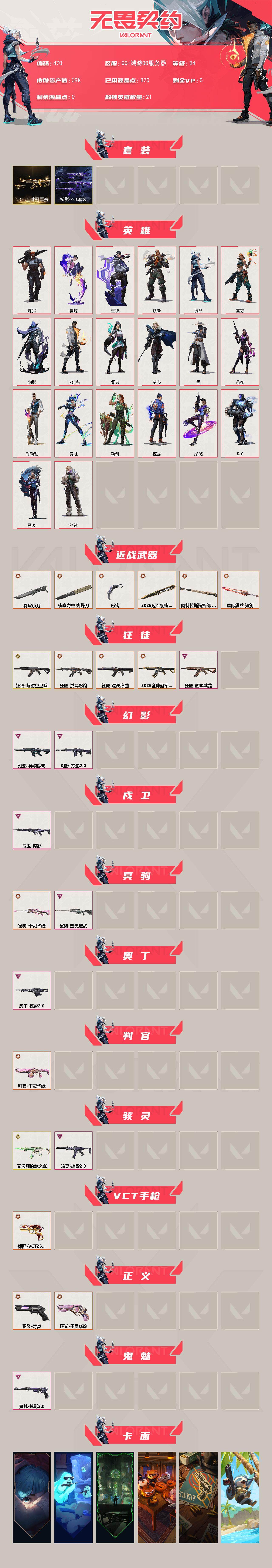 【470】xl16685 【套装】:2025全球冠军赛套装,掠影//2.0套装 【英雄】:炼狱,暮蝶,壹决,铁臂,捷风,雷兹,幽影,不死鸟,贤者,猎枭,零,芮娜,尚勃勒,霓虹,斯凯,夜露,星礈,k/o,黑梦,钢锁 【近战 武器】:近战武器-2025全球冠军赛 蝴蝶刀,近战武器-影钩,近战武器-侦察力量 蝴蝶刀,近战武器-剥皮小刀,近战武器-阿特拉斯指挥部 甩棍,近战武器-星际猎兵 短剑 【狂徒】:狂徒-超时空卫队,狂徒-2025全球冠军赛,狂徒-洪荒怒焰,狂徒-混沌序曲,狂徒-耀鳞威龙 【幻影】:幻影-异鳞魔蛇,幻影-掠影//2.0 【戍卫】:戍卫-掠影 【冥驹】:冥驹-千灵华绽,冥驹-堕天遗武 【奥丁】:奥丁-掠影//2.0 【判官】:判官-千灵华绽 【骇灵】:骇灵-艾沃莉的梦之翼,骇灵-掠影//2.0 【vct手呛】:标配-vct25 x edg 【正义】:正义-奇点,正义-千灵华绽 【鬼魅】:鬼魅-掠影//2.0 【卡面】:《双城之战》拥抱 卡面,精灵大战 卡面,欢迎来到底城 卡面,南瓜盛典 卡面,正义的化身 卡面,树懒大作战 卡面,红鳞松叶 卡面,clutch 卡面,无畏契约go!第一卷:芮娜 卡面,无畏契约go!第一卷:零 卡面,《双城之战》金克丝 卡面,代号红色 卡面,新兵报到 卡面,v契约 卡面,无畏契约 卡面 【喷漆】:嗨宝南瓜灯 喷漆,嘭! 喷漆,都算到了 喷漆,控场勿近 喷漆,霓光四射 喷漆,倒吸一口凉气 喷漆,买装还是存钱 喷漆,暴走萝莉 喷漆,蕊形灯 喷漆,胜利属于无畏契约 喷漆,glhf 喷漆,无畏契约 喷漆 【挂饰】:伞绳 挂饰,《双城之战》小蛋糕 挂饰,第九季//第三幕 纪念币 挂饰,第九季//第二幕 纪念币 挂饰,vct x edg 挂饰,天外飞客 挂饰,海豹的认可 挂饰,无畏契约 纪念币 挂饰