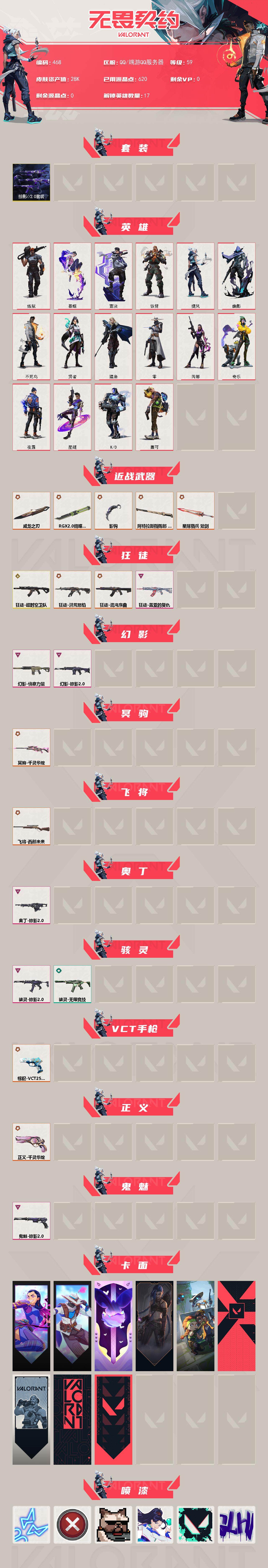 【468】xl17070 【套装】:掠影//2.0套装 【英雄】:炼狱,暮蝶,壹决,铁臂,捷风,幽影,不死鸟,贤者,猎枭,零,芮娜,奇乐,夜露,星礈,k/o,盖可 【近战 武器】:近战武器-影钩,近战武器-rgx 11z pro//2.0 蝴蝶刀,近战武器-威龙之刃,近战武器-阿特拉斯指挥部 甩棍,近战武器-星际猎兵 短剑 【狂徒】:狂徒-超时空卫队,狂徒-洪荒怒焰,狂徒-混沌序曲,狂徒-盖亚的复仇 【幻影】:幻影-侦察力量,幻影-掠影//2.0 【冥驹】:冥驹-千灵华绽 【飞将】:飞将-西部未来 【奥丁】:奥丁-掠影//2.0 【骇灵】:骇灵-掠影//2.0,骇灵-无限竞技 【vct手呛】:标配-vct25 x lev 【正义】:正义-千灵华绽 【鬼魅】:鬼魅-掠影//2.0 【卡面】:无畏契约go!第一卷:芮娜 卡面,无畏契约go!第一卷:零 卡面,化茧成蝶 卡面,《双城之战》金克丝 卡面,别冒尖 卡面,代号红色 卡面,新兵报到 卡面,v契约 卡面,无畏契约 卡面 【喷漆】:霓光四射 喷漆,买装还是存钱 喷漆,关门放狗 喷漆,无畏契约go!第一卷:贤者 喷漆,胜利属于无畏契约 喷漆,glhf 喷漆,无畏契约 喷漆 【挂饰】:无畏契约go!第一卷 零 挂饰,鱼骨头 挂饰,迷你k/o 挂饰,薰衣草之心 挂饰,天外飞客 挂饰,无畏契约 纪念币 挂饰