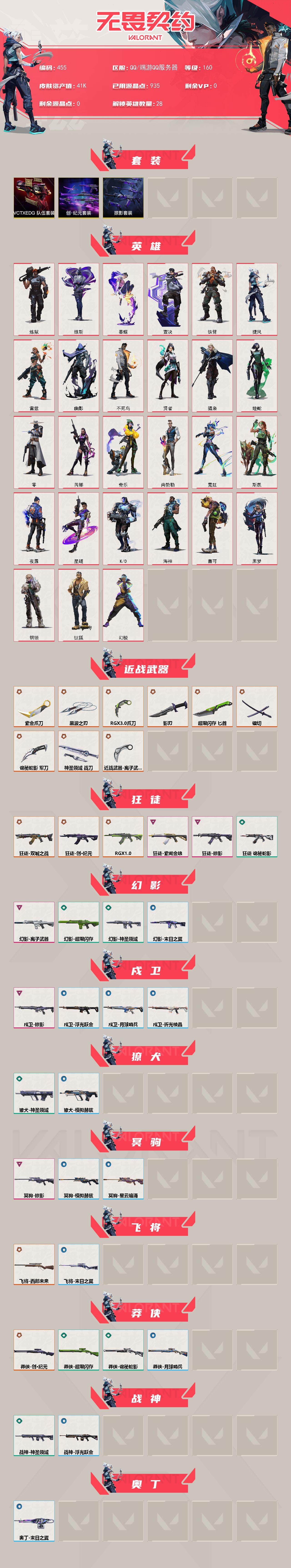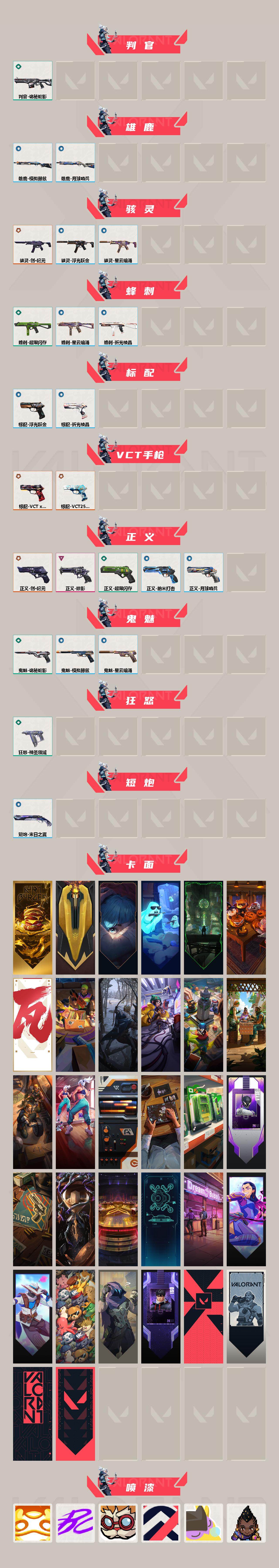 【455】【套装】:创·纪元套装,vctxedg 队伍套装,掠影套装 【英雄】:幻棱,炼狱,维斯,暮蝶,钛狐,壹决,铁臂,捷风,雷兹,幽影,不死鸟,贤者,猎枭,蝰蛇,零,芮娜,奇乐,尚勃勒,霓虹,斯凯,夜露,星礈,k/o,海神,盖可,黑梦,钢锁 【近战 武器】:近战武器-紫金爪刀,近战武器-rgx 11z pro//3.0 爪刀,近战武器-黑波之刃,近战武器-镭切,近战武器-离子武器//2.0 爪刀,近战武器-超限闪存 匕首,近战武器-影刃,近战武器-诡秘蛇影 军刀,近战武器-神圣领域 战刀 【狂徒】:狂徒-双城之战,狂徒-创·纪元,狂徒-rgx 11z pro,狂徒-掠影,狂徒-紫阙金琅,狂徒-诡秘蛇影 【幻影】:幻影-离子武器,幻影-超限闪存,幻影-神圣领域,幻影-末日之翼 【戍卫】:戍卫-掠影,戍卫-浮光跃金,戍卫-月球哨兵,戍卫-折光棱晶 【獠犬】:獠犬-神圣领域,獠犬-模拟赫兹 【冥驹】:冥驹-掠影,冥驹-模拟赫兹,冥驹-星云暗涌 【飞将】:飞将-西部未来,飞将-末日之翼 【莽侠】:莽侠-创·纪元,莽侠-超限闪存,莽侠-诡秘蛇影,莽侠-月球哨兵 【战神】:战神-神圣领域,战神-浮光跃金 【奥丁】:奥丁-末日之翼 【判官】:判官-诡秘蛇影 【雄鹿】:雄鹿-模拟赫兹,雄鹿-月球哨兵 【骇灵】:骇灵-创·纪元,骇灵-浮光跃金,骇灵-星云暗涌 【蜂刺】:蜂刺-超限闪存,蜂刺-星云暗涌,蜂刺-折光棱晶 【标配】:标配-浮光跃金,标配-折光棱晶 【vct手呛】:标配-vct x edg,标配-vct25 x lev 【正义】:正义-创·纪元,正义-掠影,正义-超限闪存,正义-纳米打击,正义-月球哨兵 【鬼魅】:鬼魅-诡秘蛇影,鬼魅-模拟赫兹,鬼魅-星云暗涌 【狂怒】:狂怒-神圣领域 【短炮】:短炮-末日之翼 【卡面】:终章:激斗汉堡 卡面,进入射程 卡面,《双城之战》拥抱 卡面,精灵大战 卡面,欢迎来到底城 卡面,南瓜盛典 卡面,vct cn首冠 卡面,唱片的故事 卡面,钢弓与箭弦 卡面,排除故障 卡面,战术桌游 卡面,悠享食光 卡面,修车达人 卡面,热舞环节 卡面,模拟赫兹 卡面,浮光跃金 卡面,超限闪存 卡面,维斯工牌 卡面,正义的化身 卡面,时间到 卡面,最高舞台 卡面,声感陷阱设计图 卡面,梦幻奶茶 卡面,无畏契约go!第一卷:芮娜 卡面,无畏契约go!第一卷:零 卡面,同步耍酷 卡面,黑影先生的咖啡! 卡面,壹决工牌 卡面,代号红色 卡面,新兵报到 卡面,v契约 卡面,无畏契约 卡面 【喷漆】:嗨宝南瓜灯 喷漆,嘭! 喷漆,都算到了 喷漆,控场勿近 喷漆,皮蛋呼呼 喷漆,像素星礈 喷漆,图谋不轨的零 喷漆,小丑猫 喷漆,模拟赫兹 喷漆,高丽风情小熊 喷漆,蹲到一个 喷漆,全力集中 喷漆,超限闪存 喷漆,rua一下 喷漆,熊抱 喷漆,蛋糕还是爆能器? 喷漆,高丽风情小虎 喷漆,记在小本本 喷漆,防弹企鹅 喷漆,高丽风情小蛙 喷漆,超级粉丝 喷漆,黯兽卖萌 喷漆,捷风差距 喷漆,拼一呛 喷漆,别挡我的路! 喷漆,买装还是存钱 喷漆,暴走萝莉 喷漆,凌空惊吓 喷漆,胜利属于无畏契约 喷漆,glhf 喷漆,无畏契约 喷漆 【挂饰】:终章:猫猫木乃伊 挂饰,悠闲鸡块 挂饰,伞绳 挂饰,《双城之战》小蛋糕 挂饰,第九季//第三幕 纪念币 挂饰,拳击战术熊 挂饰,工具腰带 挂饰,无畏契约go!第一卷 芮娜 挂饰,无畏契约go!第一卷 零 挂饰,暗藏猫腻 挂饰,高丽风情 挂饰,鱼骨头 挂饰,熔岩灯 挂饰,超限闪存 挂饰,瞬云履 挂饰,迷你k/o 挂饰,模拟赫兹 挂饰,第九季//第二幕 纪念币 挂饰,薰衣草之心 挂饰,袖珍捷风 挂饰,z世代特饮 挂饰,第九季//第一幕 纪念币 挂饰,犯困的布鲁诺 挂饰,vct x edg 挂饰,天外飞客 挂饰,《双城之战》魄罗 挂饰,无畏契约 纪念币 挂饰