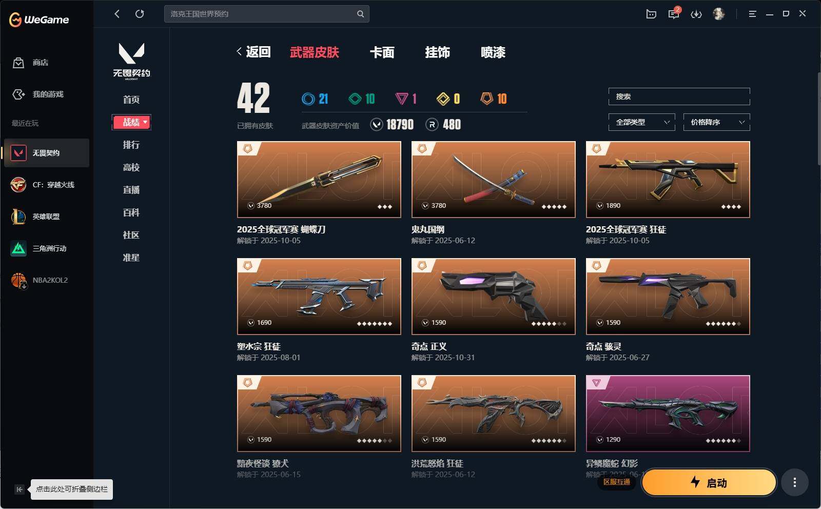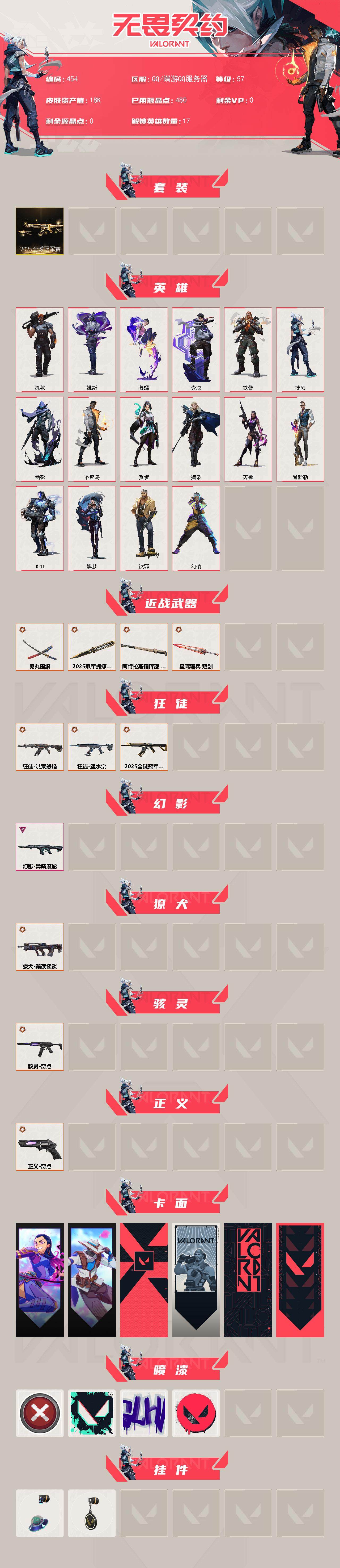【454】【套装】:2025全球冠军赛套装 【英雄】:幻棱,炼狱,维斯,暮蝶,钛狐,壹决,铁臂,捷风,幽影,不死鸟,贤者,猎枭,芮娜,尚勃勒,k/o,黑梦 【近战 武器】:近战武器-2025全球冠军赛 蝴蝶刀,近战武器-鬼丸国纲,近战武器-阿特拉斯指挥部 甩棍,近战武器-星际猎兵 短剑 【狂徒】:狂徒-2025全球冠军赛,狂徒-洪荒怒焰,狂徒-塑水宗 【幻影】:幻影-异鳞魔蛇 【獠犬】:獠犬-黯夜怪谈 【骇灵】:骇灵-奇点 【正义】:正义-奇点 【卡面】:无畏契约go!第一卷:芮娜 卡面,无畏契约go!第一卷:零 卡面,代号红色 卡面,新兵报到 卡面,v契约 卡面,无畏契约 卡面 【喷漆】:买装还是存钱 喷漆,胜利属于无畏契约 喷漆,glhf 喷漆,无畏契约 喷漆 【挂饰】:天外飞客 挂饰,无畏契约 纪念币 挂饰