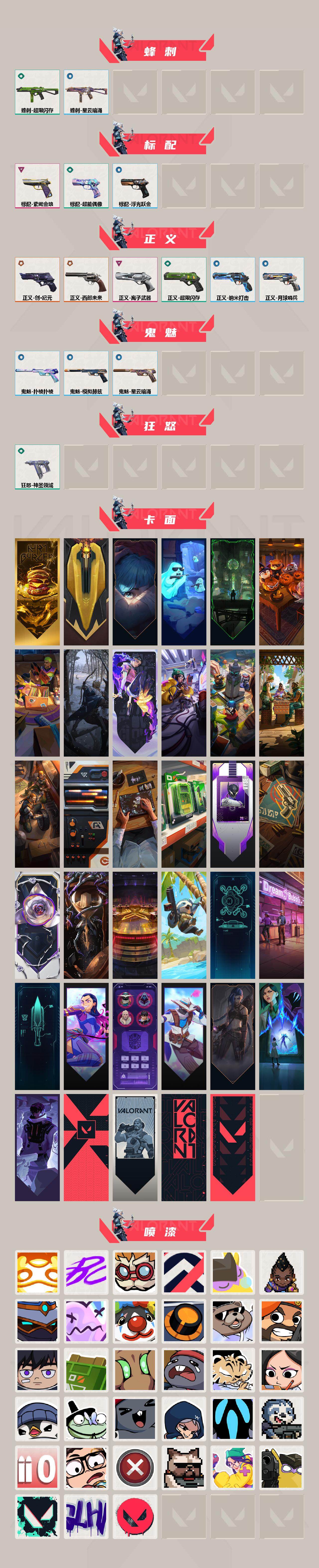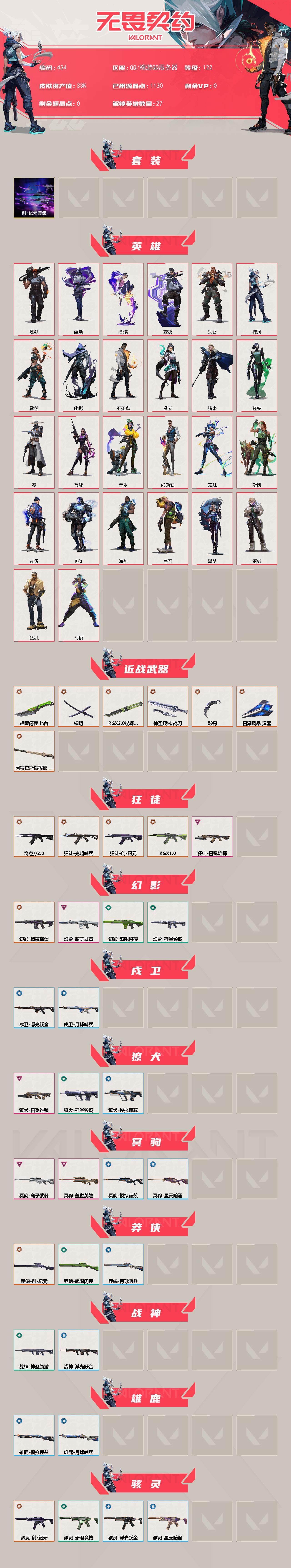 【434】【套装】:创·纪元套装 【英雄】:幻棱,炼狱,维斯,暮蝶,钛狐,壹决,铁臂,捷风,雷兹,幽影,不死鸟,贤者,猎枭,蝰蛇,零,芮娜,奇乐,尚勃勒,霓虹,斯凯,夜露,k/o,海神,盖可,黑梦,钢锁 【近战 武器】:近战武器-影钩,近战武器-rgx 11z pro//2.0 蝴蝶刀,近战武器-镭切,近战武器-超限闪存 匕首,近战武器-神圣领域 战刀,近战武器-日耀风暴 遗器,近战武器-阿特拉斯指挥部 甩棍 【狂徒】:狂徒-光明哨兵,狂徒-奇点//2.0,狂徒-创·纪元,狂徒-rgx 11z pro,狂徒-日冕雄师 【幻影】:幻影-黯夜怪谈,幻影-离子武器,幻影-超限闪存,幻影-神圣领域 【戍卫】:戍卫-浮光跃金,戍卫-月球哨兵 【獠犬】:獠犬-日冕雄师,獠犬-神圣领域,獠犬-模拟赫兹 【冥驹】:冥驹-盖世英雄,冥驹-离子武器,冥驹-模拟赫兹,冥驹-星云暗涌 【莽侠】:莽侠-创·纪元,莽侠-超限闪存,莽侠-月球哨兵 【战神】:战神-神圣领域,战神-浮光跃金 【雄鹿】:雄鹿-模拟赫兹,雄鹿-月球哨兵 【骇灵】:骇灵-创·纪元,骇灵-无限竞技,骇灵-浮光跃金,骇灵-星云暗涌 【蜂刺】:蜂刺-超限闪存,蜂刺-星云暗涌 【标配】:标配-紫阙金琅,标配-超能偶像,标配-浮光跃金 【正义】:正义-创·纪元,正义-西部未来,正义-离子武器,正义-超限闪存,正义-纳米打击,正义-月球哨兵 【鬼魅】:鬼魅-模拟赫兹,鬼魅-扑棱扑棱,鬼魅-星云暗涌 【狂怒】:狂怒-神圣领域 【卡面】:终章:激斗汉堡 卡面,进入射程 卡面,《双城之战》拥抱 卡面,精灵大战 卡面,欢迎来到底城 卡面,南瓜盛典 卡面,唱片的故事 卡面,钢弓与箭弦 卡面,无畏契约:暮蝶 卡面,排除故障 卡面,战术桌游 卡面,悠享食光 卡面,修车达人 卡面,模拟赫兹 卡面,浮光跃金 卡面,超限闪存 卡面,维斯工牌 卡面,正义的化身 卡面,铁之华 卡面,时间到 卡面,最高舞台 卡面,树懒大作战 卡面,声感陷阱设计图 卡面,梦幻奶茶 卡面,零点嗅探设计图 卡面,无畏契约go!第一卷:芮娜 卡面,清除名单 卡面,无畏契约go!第一卷:零 卡面,《双城之战》金克丝 卡面,蝰蛇vs幽影 卡面,逆向独行 卡面 ,代号红色 卡面,新兵报到 卡面,v契约 卡面,无畏契约 卡面 【喷漆】:嗨宝南瓜灯 喷漆,嘭! 喷漆,都算到了 喷漆,控场勿近 喷漆,皮蛋呼呼 喷漆,像素星礈 喷漆,图谋不轨的零 喷漆,伤心心 喷漆,小丑猫 喷漆,模拟赫兹 喷漆,高丽风情小熊 喷漆,蹲到一个 喷漆,全力集中 喷漆,超限闪存 喷漆,rua一下 喷漆,熊抱 喷漆,高丽风情小虎 喷漆,记在小本本 喷漆,防弹企鹅 喷漆,高丽风情小蛙 喷漆,超级粉丝 喷漆,捷风差距 喷漆,惊声尖叫 喷漆,审判之爪 喷漆,拼一呛 喷漆,新潮流 喷漆,买装还是存钱 喷漆,关门放狗 喷漆,无畏契约go!第一卷:奇乐 喷漆,放下武器 喷漆,胜利属于无畏契约 喷漆,glhf 喷漆,无畏契约 喷漆 【挂饰】:终章:猫猫木乃伊 挂饰,悠闲鸡块 挂饰,伞绳 挂饰,《双城之战》小蛋糕 挂饰,第九季//第三幕 纪念币 挂饰,拳击战术熊 挂饰,工具腰带 挂饰,无畏契约go!第一卷 芮娜 挂饰,无畏契约go!第一卷 零 挂饰,暗藏猫腻 挂饰,高丽风情 挂饰,熔岩灯 挂饰,超限闪存 挂饰,迷你k/o 挂饰,模拟赫兹 挂饰,第九季//第二幕 纪念币 挂饰,薰衣草之心 挂饰,终章:这瓜保熟 挂饰,糖葫芦 挂饰,袖珍捷风 挂饰,迷你浓缩 挂饰,第九季//第一幕 纪念币 挂饰,第八季//第二幕 纪念币 挂饰 ,天外飞客 挂饰,海豹的认可 挂饰,无畏契约 纪念币 挂饰