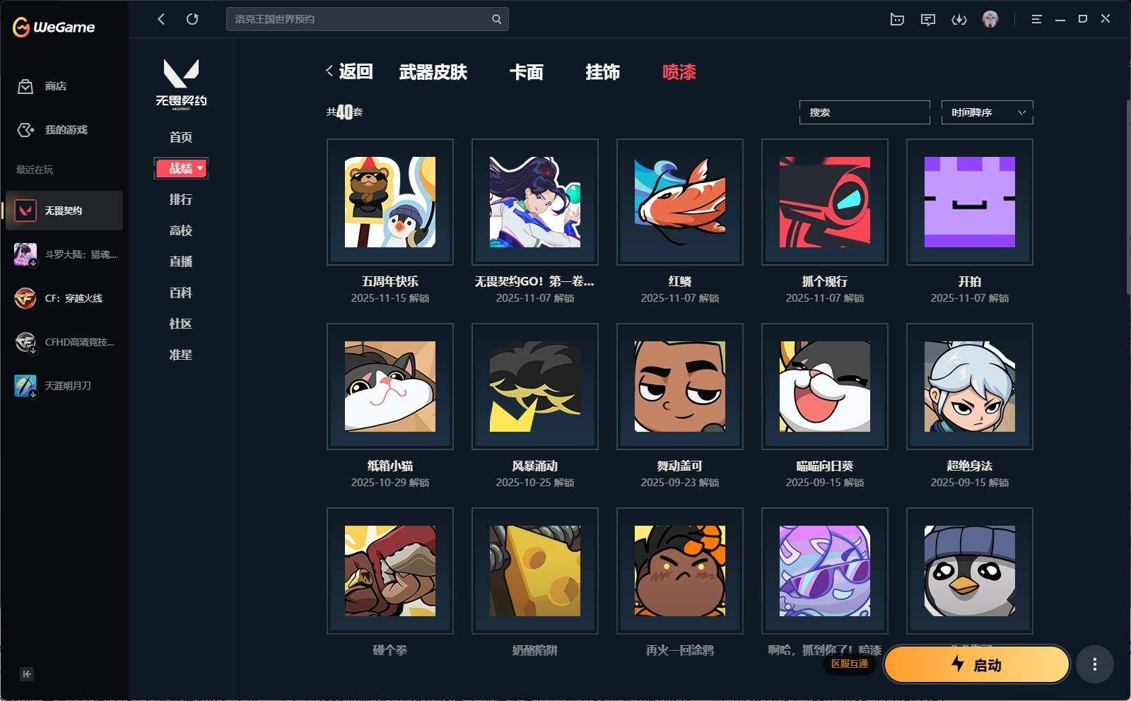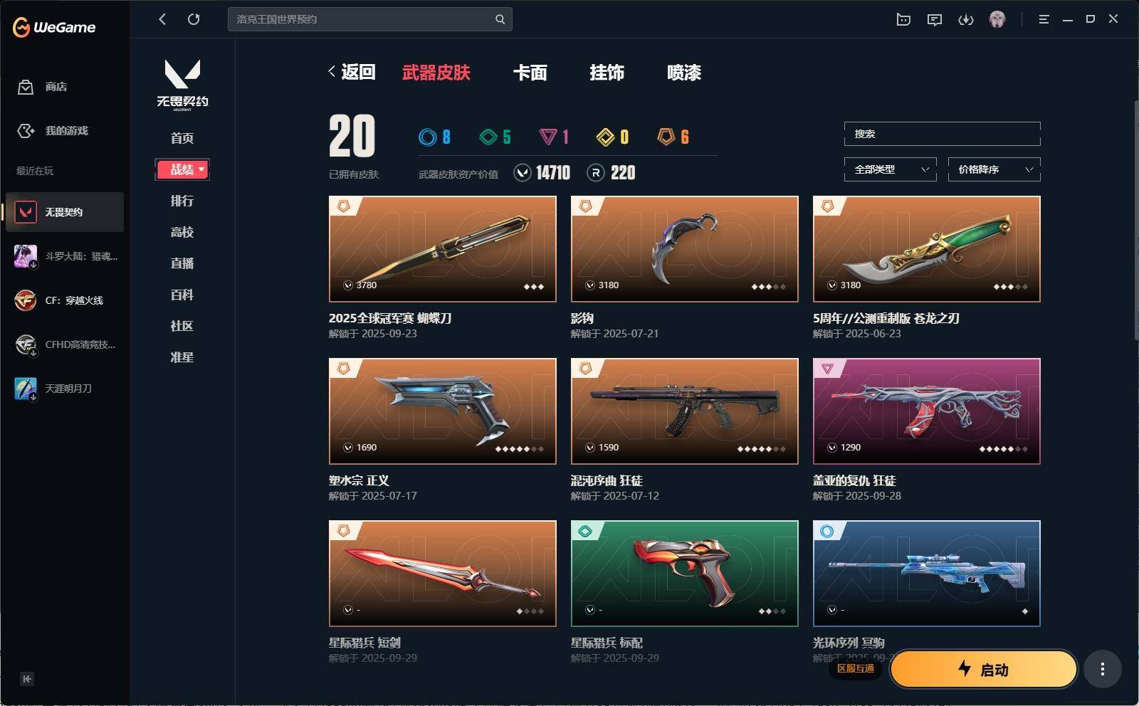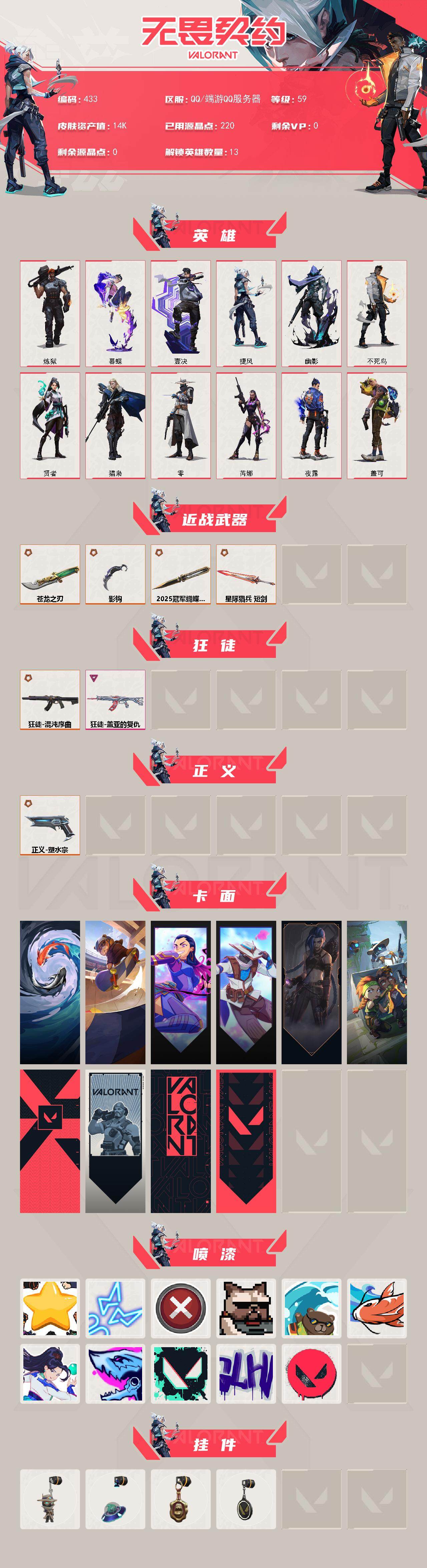 【433】【英雄】:炼狱,暮蝶,壹决,捷风,幽影,不死鸟,贤者,猎枭,零,芮娜,夜露,盖可 【近战 武器】:近战武器-2025全球冠军赛 蝴蝶刀,近战武器-影钩,近战武器-5周年//公测重制版 苍龙之刃,近战武器-星际猎兵 短剑 【狂徒】:狂徒-混沌序曲,狂徒-盖亚的复仇 【正义】:正义-塑水宗 【卡面】:红鳞松叶 卡面,clutch 卡面,无畏契约go!第一卷:芮娜 卡面,无畏契约go!第一卷:零 卡面,《双城之战》金克丝 卡面,别冒尖 卡面,代号红色 卡面,新兵报到 卡面,v契约 卡面,无畏契约 卡面 【喷漆】:五人成星 喷漆,霓光四射 喷漆,买装还是存钱 喷漆,关门放狗 喷漆,酷熊冲浪 喷漆,红鳞 喷漆,无畏契约go!第一卷:贤者 喷漆,暴走萝莉 喷漆,胜利属于无畏契约 喷漆,glhf 喷漆,无畏契约 喷漆 【挂饰】:无畏契约go!第一卷 零 挂饰,天外飞客 挂饰,海豹的认可 挂饰,无畏契约 纪念币 挂饰