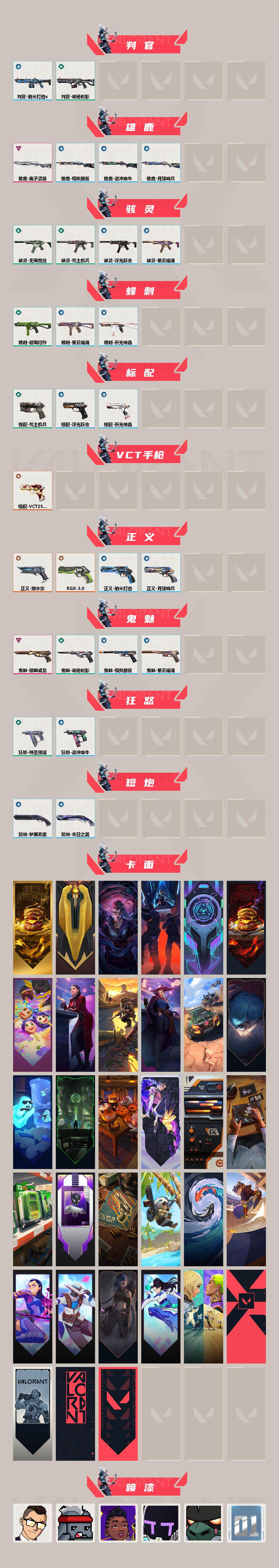 【414】【英雄】:幻棱,炼狱,维斯,暮蝶,钛狐,壹决,铁臂,捷风,雷兹,幽影,不死鸟,贤者,猎枭,蝰蛇,零,芮娜,奇乐,尚勃勒,霓虹,斯凯,夜露,星礈,k/o,海神,盖可,黑梦,钢锁 【近战 武器】:近战武器-影钩,近战武器-rgx 11z pro//2.0 蝴蝶刀,近战武器-剥皮小刀,近战武器-紫金爪刀,近战武器-鬼丸国纲,近战武器-荒土机兵 热能刀,近战武器-诡秘蛇影 军刀,近战武器-神圣领域 战刀,近战武器-日耀风暴 遗器,近战武器-星际猎兵 短剑 【狂徒】:狂徒-2025全球冠军赛,狂徒-塑水宗,狂徒-噬影者,狂徒-rgx 11z pro,狂徒-a x 颗秒,狂徒-盖亚的复仇,狂徒-紫阙金琅,狂徒-离子武器//2.0,狂徒-荒土机兵,狂徒-诡秘蛇影 【幻影】:幻影-混沌序曲//2.0,幻影-天界神兵//2.0,幻影-侦察力量,幻影-神圣领域,幻影-纳米打击,幻影-末日之翼 【戍卫】:戍卫-紫阙金琅,戍卫-逆冲蛮牛,戍卫-月球哨兵,戍卫-折光棱晶 【獠犬】:獠犬-781-a协议,獠犬-神圣领域,獠犬-逆冲蛮牛 【冥驹】:冥驹-盖世英雄,冥驹-荒土机兵,冥驹-星云暗涌 【飞将】:飞将-末日之翼 【莽侠】:莽侠-诡秘蛇影,莽侠-月球哨兵 【战神】:战神-神圣领域,战神-浮光跃金 【奥丁】:奥丁-纳米打击,奥丁-末日之翼 【判官】:判官-诡秘蛇影,判官-纳米打击x 【雄鹿】:雄鹿-离子武器,雄鹿-模拟赫兹,雄鹿-逆冲蛮牛,雄鹿-月球哨兵 【骇灵】:骇灵-荒土机兵,骇灵-无限竞技,骇灵-浮光跃金,骇灵-星云暗涌 【蜂刺】:蜂刺-超限闪存,蜂刺-星云暗涌,蜂刺-折光棱晶 【标配】:标配-荒土机兵,标配-浮光跃金,标配-折光棱晶 【vct手呛】:标配-vct25 x edg 【正义】:正义-rgx 11z pro//3.0,正义-塑水宗,正义-纳米打击,正义-月球哨兵 【鬼魅】:鬼魅-耀鳞威龙,鬼魅-诡秘蛇影,鬼魅-模拟赫兹,鬼魅-星云暗涌 【狂怒】:狂怒-神圣领域,狂怒-逆冲蛮牛 【短炮】:短炮-梦魇恶魔,短炮-末日之翼 【卡面】:终章:激斗汉堡 卡面,进入射程 卡面,分崩离析 卡面,纳米打击 卡面,抑制技术 卡面,激斗汉堡 卡面,瓦娃脸雪糕 p2 卡面,从黄昏到黎明 卡面,荒土机兵 卡面,银弹猎手 卡面,逆冲蛮牛 卡面,《双城之战》拥抱 卡面,精灵大战 卡面,欢迎来到底城 卡面,南瓜盛典 卡面,无畏契约:暮蝶 卡面,模拟赫兹 卡面,浮光跃金 卡面,超限闪存 卡面,维斯工牌 卡面,正义的化身 卡面,树懒大作战 卡面,红鳞松叶 卡面,clutch 卡面,无畏契约go!第一卷:芮娜 卡面,无畏契约go!第一卷:零 卡面,《双城之战》金克丝 卡面,无畏契约go!第一卷:贤者 卡面,钢锁vs盖可 卡面,代号红色 卡面,新兵报到 卡面,v契约 卡面,无畏契约 卡面,暗潮 卡面 【喷漆】:小小心意 喷漆,战“素”兔 喷漆,宇宙的指引 喷漆,请求重启 喷漆,逆冲蛮牛 喷漆,纳米打击 喷漆,鼻尖上的蝴蝶 喷漆,简笔画黯兽 喷漆,独守蝰腹 喷漆,他们将落荒而逃 喷漆,通缉:战术企鹅 喷漆,荒土机兵 喷漆,别挡我吃球! 喷漆,嗨宝南瓜灯 喷漆,嘭! 喷漆,都算到了 喷漆,控场勿近 喷漆,伤心心 喷漆,rua一下 喷漆,熊抱 喷漆,高丽风情小虎 喷漆,记在小本本 喷漆,防弹企鹅 喷漆,高丽风情小蛙 喷漆,审判之爪 喷漆,双人比心 喷漆,买装还是存钱 喷漆,关门放狗 喷漆,无畏契约go!第一卷:芮娜 喷漆,无畏契约go!第一卷:贤者 喷漆,胜利属于无畏契约 喷漆,glhf 喷漆,无畏契约 喷漆 【挂饰】:终章:猫猫木乃伊 挂饰,荒土机兵 挂饰,悠闲鸡块 挂饰,猫猫木乃伊 挂饰,水壶 挂饰,纳米打击 挂饰,逆冲蛮牛 挂饰,可爱糖糖 挂饰,伞绳 挂饰,《双城之战》小蛋糕 挂饰,第九季//第三幕 纪念币 挂饰,鱼骨头 挂饰,迷你k/o 挂饰,模拟赫兹 挂饰,第九季//第二幕 纪念币 挂饰,薰衣草之心 挂饰,vct x edg 挂饰,天外飞客 挂饰,《双城之战》魄罗 挂饰,海豹的认可 挂饰,无畏契约 纪念币 挂饰