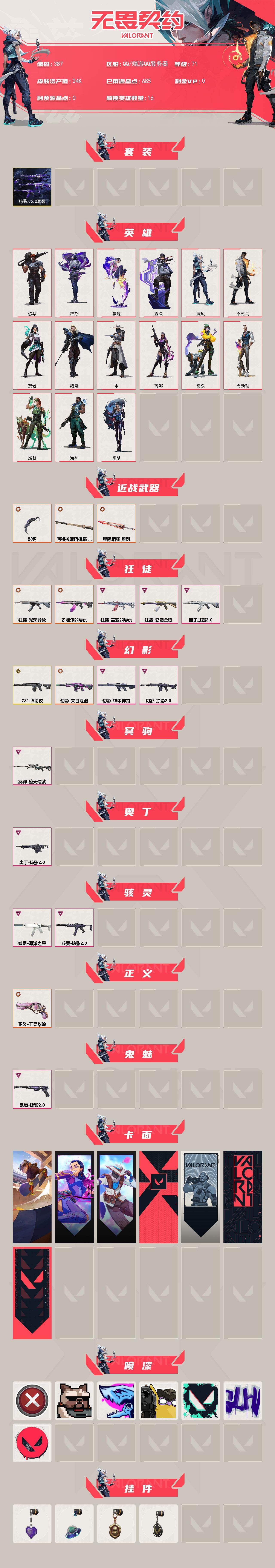 【387】【套装】:掠影//2.0套装 【英雄】:炼狱,维斯,暮蝶,壹决,捷风,不死鸟,贤者,猎枭,零,芮娜,奇乐,尚勃勒,斯凯,海神,黑梦 【近战 武器】:近战武器-影钩,近战武器-阿特拉斯指挥部 甩棍,近战武器-星际猎兵 短剑 【狂徒】:狂徒-光荣异象,狂徒-多弥尔的复仇,狂徒-盖亚的复仇,狂徒-紫阙金琅,狂徒-离子武器//2.0 【幻影】:幻影-781-a协议,幻影-末日泡泡,幻影-神中神罚,幻影-掠影//2.0 【冥驹】:冥驹-堕天遗武 【奥丁】:奥丁-掠影//2.0 【骇灵】:骇灵-海洋之星,骇灵-掠影//2.0 【正义】:正义-千灵华绽 【鬼魅】:鬼魅-掠影//2.0 【卡面】:clutch 卡面,无畏契约go!第一卷:芮娜 卡面,无畏契约go!第一卷:零 卡面,代号红色 卡面,新兵报到 卡面,v契约 卡面,无畏契约 卡面 【喷漆】:买装还是存钱 喷漆,关门放狗 喷漆,暴走萝莉 喷漆,放下武器 喷漆,胜利属于无畏契约 喷漆,glhf 喷漆,无畏契约 喷漆 【挂饰】:薰衣草之心 挂饰,天外飞客 挂饰,海豹的认可 挂饰,无畏契约 纪念币 挂饰