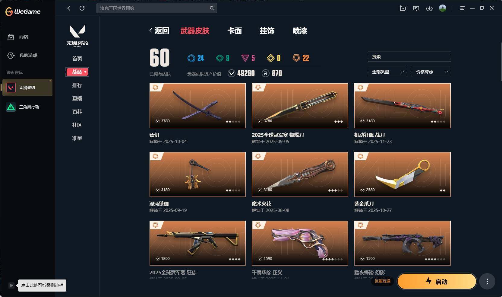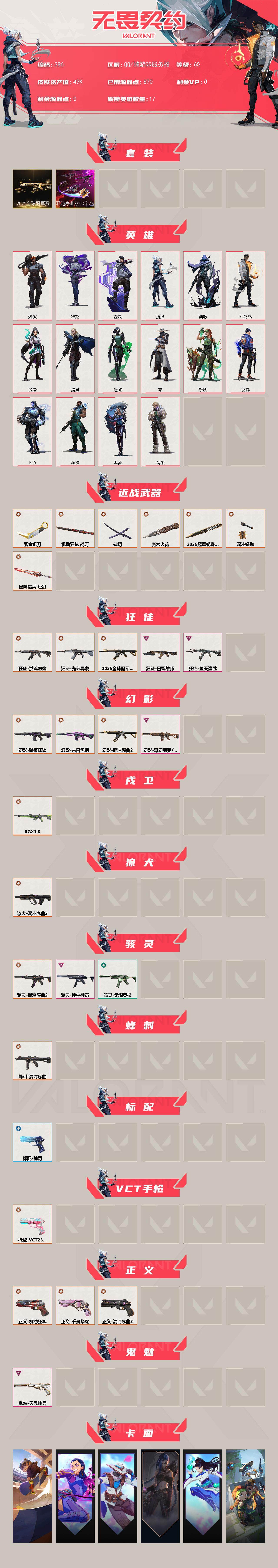 【386】【套装】:2025全球冠军赛套装,混沌序曲//2.0套装 【英雄】:炼狱,维斯,壹决,捷风,幽影,不死鸟,贤者,猎枭,蝰蛇,零,斯凯,夜露,k/o,海神,黑梦,钢锁 【近战 武器】:近战武器-2025全球冠军赛 蝴蝶刀,近战武器-混沌链枷,近战武器-魔术火花,近战武器-紫金爪刀,近战武器-镭切,近战武器-机动狂飙 战刀,近战武器-星际猎兵 短剑,近战武器-魔术火花 【狂徒】:狂徒-2025全球冠军赛,狂徒-洪荒怒焰,狂徒-光荣异象,狂徒-堕天遗武,狂徒-日冕雄师 【幻影】:幻影-黯夜怪谈,幻影-末日泡泡,幻影-混沌序曲//2.0,幻影-奇幻朋克//3.0 【戍卫】:戍卫-rgx 11z pro 【獠犬】:獠犬-混沌序曲//2.0 【骇灵】:骇灵-混沌序曲//2.0,骇灵-神中神罚,骇灵-无限竞技 【蜂刺】:蜂刺-混沌序曲 【标配】:标配-神罚 【vct手呛】:标配-vct25 x blg 【正义】:正义-机动狂飙,正义-千灵华绽,正义-混沌序曲//2.0 【鬼魅】:鬼魅-天界神兵 【卡面】:clutch 卡面,无畏契约go!第一卷:芮娜 卡面,无畏契约go!第一卷:零 卡面,《双城之战》金克丝 卡面,无畏契约go!第一卷:贤者 卡面,别冒尖 卡面,代号红色 卡面,新兵报到 卡面,v契约 卡面,无畏契约 卡面 【喷漆】:霓光四射 喷漆,买装还是存钱 喷漆,关门放狗 喷漆,无畏契约go!第一卷:捷风 喷漆,无畏契约go!第一卷:贤者 喷漆,暴走萝莉 喷漆,胜利属于无畏契约 喷漆,glhf 喷漆,无畏契约 喷漆 【挂饰】:无畏契约go!第一卷 零 挂饰,薰衣草之心 挂饰,天外飞客 挂饰,《双城之战》魄罗 挂饰,无畏契约 纪念币 挂饰