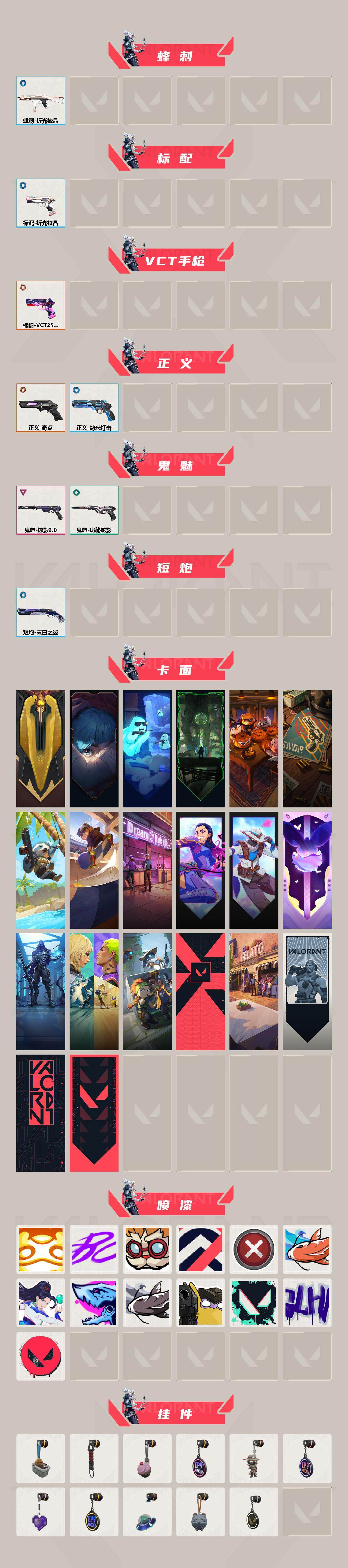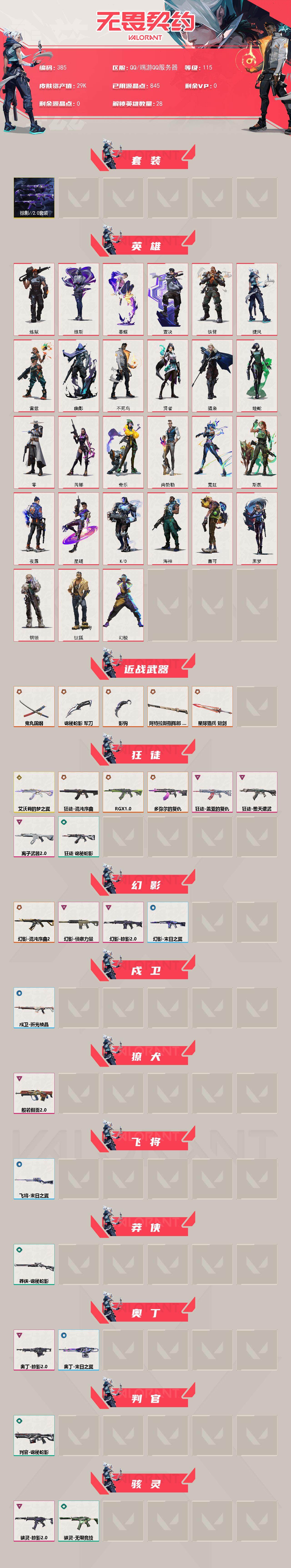 【385】【套装】:掠影//2.0套装 【英雄】:幻棱,炼狱,维斯,暮蝶,钛狐,壹决,铁臂,捷风,雷兹,幽影,不死鸟,贤者,猎枭,蝰蛇,零,芮娜,奇乐,尚勃勒,霓虹,斯凯,夜露,星礈,k/o,海神,盖可,黑梦,钢锁 【近战 武器】:近战武器-影钩,近战武器-鬼丸国纲,近战武器-诡秘蛇影 军刀,近战武器-阿特拉斯指挥部 甩棍,近战武器-星际猎兵 短剑 【狂徒】:狂徒-艾沃莉的梦之翼,狂徒-混沌序曲,狂徒-rgx 11z pro,狂徒-多弥尔的复仇,狂徒-堕天遗武,狂徒-盖亚的复仇,狂徒-离子武器//2.0,狂徒-诡秘蛇影 【幻影】:幻影-混沌序曲//2.0,幻影-侦察力量,幻影-掠影//2.0,幻影-末日之翼 【戍卫】:戍卫-折光棱晶 【獠犬】:獠犬-般若假面//2.0 【飞将】:飞将-末日之翼 【莽侠】:莽侠-诡秘蛇影 【奥丁】:奥丁-掠影//2.0,奥丁-末日之翼 【判官】:判官-诡秘蛇影 【骇灵】:骇灵-掠影//2.0,骇灵-无限竞技 【蜂刺】:蜂刺-折光棱晶 【标配】:标配-折光棱晶 【vct手呛】:标配-vct25 x prx 【正义】:正义-奇点,正义-纳米打击 【鬼魅】:鬼魅-掠影//2.0,鬼魅-诡秘蛇影 【短炮】:短炮-末日之翼 【卡面】:进入射程 卡面,《双城之战》拥抱 卡面,精灵大战 卡面,欢迎来到底城 卡面,南瓜盛典 卡面,正义的化身 卡面,树懒大作战 卡面,clutch 卡面,梦幻奶茶 卡面,无畏契约go!第一卷:芮娜 卡面,无畏契约go!第一卷:零 卡面,化茧成蝶 卡面,暗呛 卡面,钢锁vs盖可 卡面,别冒尖 卡面,代号红色 卡面,冰淇淋店 卡面,新兵报到 卡面,v契约 卡面,无畏契约 卡面 【喷漆】:嗨宝南瓜灯 喷漆,嘭! 喷漆,都算到了 喷漆,控场勿近 喷漆,买装还是存钱 喷漆,红鳞 喷漆,无畏契约go!第一卷:贤者 喷漆,暴走萝莉 喷漆,松叶 喷漆,放下武器 喷漆,胜利属于无畏契约 喷漆,glhf 喷漆,无畏契约 喷漆 【挂饰】:悠闲鸡块 挂饰,伞绳 挂饰,《双城之战》小蛋糕 挂饰,第九季//第三幕 纪念币 挂饰,无畏契约go!第一卷 零 挂饰,第九季//第二幕 纪念币 挂饰,薰衣草之心 挂饰,第九季//第一幕 纪念币 挂饰,天外飞客 挂饰,《双城之战》魄罗 挂饰,无畏契约 纪念币 挂饰