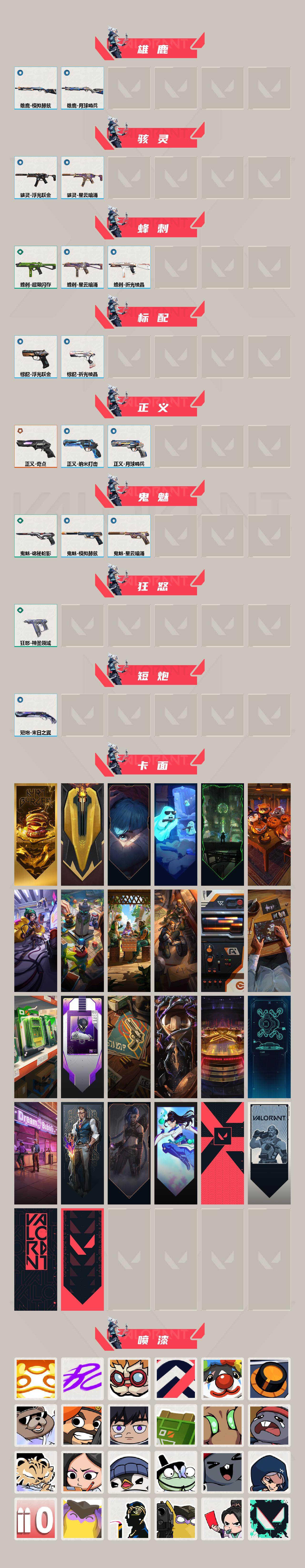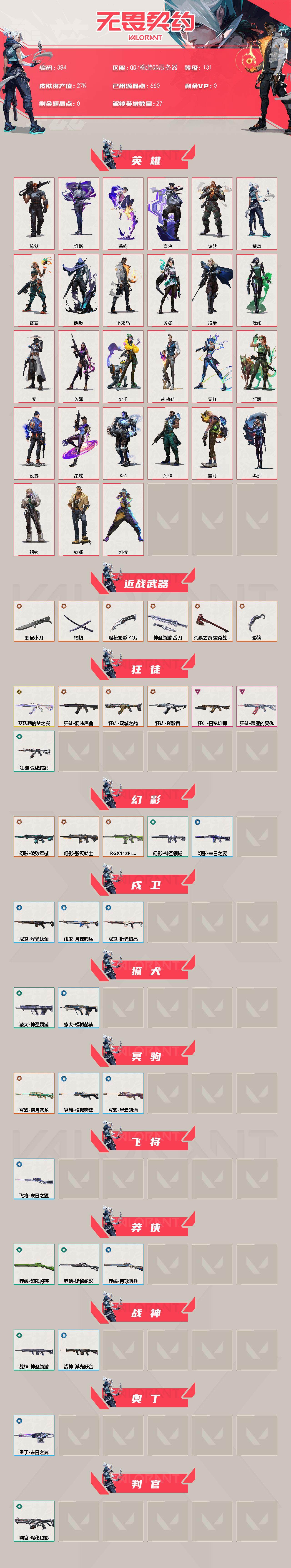 【384】【英雄】:幻棱,炼狱,维斯,暮蝶,钛狐,壹决,铁臂,捷风,雷兹,幽影,不死鸟,贤者,猎枭,蝰蛇,零,芮娜,奇乐,尚勃勒,霓虹,斯凯,夜露,星礈,k/o,海神,盖可,黑梦,钢锁 【近战 武器】:近战武器-影钩,近战武器-剥皮小刀,近战武器-镭切,近战武器-荒狼之颚 蛮勇战斧,近战武器-诡秘蛇影 军刀,近战武器-神圣领域 战刀 【狂徒】:狂徒-艾沃莉的梦之翼,狂徒-混沌序曲,狂徒-双城之战,狂徒-噬影者,狂徒-盖亚的复仇,狂徒-日冕雄师,狂徒-诡秘蛇影 【幻影】:幻影-毁灭骑士,幻影-破败军械,幻影-rgx 11z pro//2.0,幻影-神圣领域,幻影-末日之翼 【戍卫】:戍卫-浮光跃金,戍卫-月球哨兵,戍卫-折光棱晶 【獠犬】:獠犬-神圣领域,獠犬-模拟赫兹 【冥驹】:冥驹-偃月苍龙,冥驹-模拟赫兹,冥驹-星云暗涌 【飞将】:飞将-末日之翼 【莽侠】:莽侠-超限闪存,莽侠-诡秘蛇影,莽侠-月球哨兵 【战神】:战神-神圣领域,战神-浮光跃金 【奥丁】:奥丁-末日之翼 【判官】:判官-诡秘蛇影 【雄鹿】:雄鹿-模拟赫兹,雄鹿-月球哨兵 【骇灵】:骇灵-浮光跃金,骇灵-星云暗涌 【蜂刺】:蜂刺-超限闪存,蜂刺-星云暗涌,蜂刺-折光棱晶 【标配】:标配-浮光跃金,标配-折光棱晶 【正义】:正义-奇点,正义-纳米打击,正义-月球哨兵 【鬼魅】:鬼魅-诡秘蛇影,鬼魅-模拟赫兹,鬼魅-星云暗涌 【狂怒】:狂怒-神圣领域 【短炮】:短炮-末日之翼 【卡面】:终章:激斗汉堡 卡面,进入射程 卡面,《双城之战》拥抱 卡面,精灵大战 卡面,欢迎来到底城 卡面,南瓜盛典 卡面,排除故障 卡面,战术桌游 卡面,悠享食光 卡面,修车达人 卡面,模拟赫兹 卡面,浮光跃金 卡面,超限闪存 卡面,维斯工牌 卡面,正义的化身 卡面,时间到 卡面,最高舞台 卡面,声感陷阱设计图 卡面,梦幻奶茶 卡面,无畏契约:尚勃勒 卡面,《双城之战》金克丝 卡面,无畏契约go!第一卷:贤者 卡面,代号红色 卡面,新兵报到 卡面,v契约 卡面,无畏契约 卡面 【喷漆】:嗨宝南瓜灯 喷漆,嘭! 喷漆,都算到了 喷漆,控场勿近 喷漆,小丑猫 喷漆,模拟赫兹 喷漆,高丽风情小熊 喷漆,蹲到一个 喷漆,全力集中 喷漆,超限闪存 喷漆,rua一下 喷漆,熊抱 喷漆,高丽风情小虎 喷漆,记在小本本 喷漆,防弹企鹅 喷漆,高丽风情小蛙 喷漆,超级粉丝 喷漆,捷风差距 喷漆,拼一呛 喷漆,皮蛋萌舞 喷漆,致命优雅 喷漆,放下武器 喷漆,红牌退场 喷漆,胜利属于无畏契约 喷漆,glhf 喷漆,无畏契约 喷漆 【挂饰】:终章:猫猫木乃伊 挂饰,悠闲鸡块 挂饰,伞绳 挂饰,《双城之战》小蛋糕 挂饰,第九季//第三幕 纪念币 挂饰,无畏契约go!第一卷 芮娜 挂饰,无畏契约go!第一卷 零 挂饰,暗藏猫腻 挂饰,高丽风情 挂饰,熔岩灯 挂饰,超限闪存 挂饰,迷你k/o 挂饰,模拟赫兹 挂饰,第九季//第二幕 纪念币 挂饰,薰衣草之心 挂饰,袖珍捷风 挂饰,第九季//第一幕 纪念币 挂饰,无畏契约 纪念币 挂饰