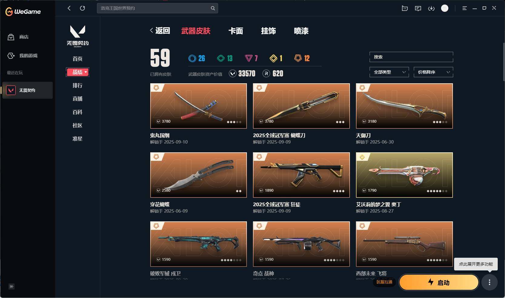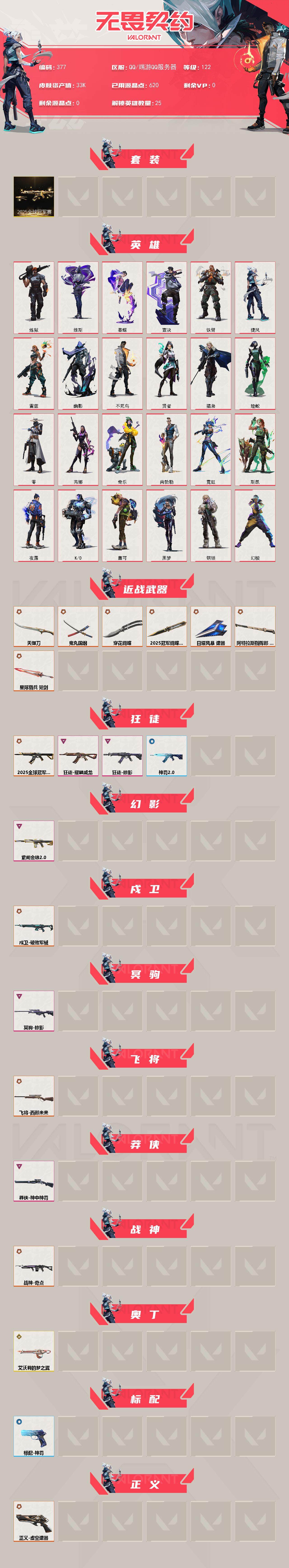 【377】【套装】:2025全球冠军赛套装 【英雄】:幻棱,炼狱,维斯,暮蝶,壹决,铁臂,捷风,雷兹,幽影,不死鸟,贤者,猎枭,蝰蛇,零,芮娜,奇乐,尚勃勒,霓虹,斯凯,夜露,k/o,盖可,黑梦,钢锁 【近战 武器】:近战武器-2025全球冠军赛 蝴蝶刀,近战武器-穿花蝴蝶,近战武器-鬼丸国纲,近战武器-天御刀,近战武器-日耀风暴 遗器,近战武器-阿特拉斯指挥部 甩棍,近战武器-星际猎兵 短剑 【狂徒】:狂徒-2025全球冠军赛,狂徒-掠影,狂徒-耀鳞威龙,狂徒-神罚//2.0 【幻影】:幻影-紫阙金琅//2.0 【戍卫】:戍卫-破败军械 【冥驹】:冥驹-掠影 【飞将】:飞将-西部未来 【莽侠】:莽侠-神中神罚 【战神】:战神-奇点 【奥丁】:奥丁-艾沃莉的梦之翼 【标配】:标配-神罚 【正义】:正义-虚空遗器 【鬼魅】:鬼魅-盖亚的复仇 【短炮】:短炮-般若假面 【卡面】:分崩离析 卡面,clutch 卡面,虹吸式咖啡壶 卡面,无畏契约go!第一卷:芮娜 卡面,无畏契约go!第一卷:零 卡面,《双城之战》金克丝 卡面,无畏契约go!第一卷:贤者 卡面,代号红色 卡面,新兵报到 卡面,v契约 卡面,无畏契约 卡面 【喷漆】:小小心意 喷漆,买装还是存钱 喷漆,关门放狗 喷漆,松叶 喷漆,胜利属于无畏契约 喷漆,glhf 喷漆,无畏契约 喷漆 【挂饰】:无畏契约go!第一卷 芮娜 挂饰,鱼骨头 挂饰,天外飞客 挂饰,无畏契约 纪念币 挂饰