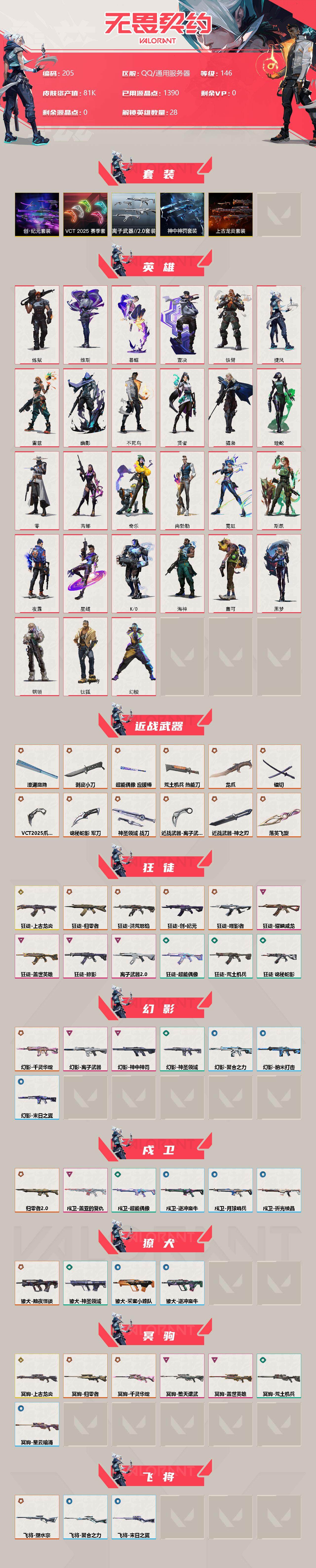 【205】【套装】:上古龙炎套装,vct 2025 赛季套装,创·纪元套装,离子武器//2.0套装,神中神罚套装 【英雄】:幻棱,炼狱,维斯,暮蝶,钛狐,壹决,铁臂,捷风,雷兹,幽影,不死鸟,贤者,猎枭,蝰蛇,零,芮娜,奇乐,尚勃勒,霓虹,斯凯,夜露,星礈,k/o,海神,盖可,黑梦,钢锁 【近战 武器】:近战武器-神之刃,近战武器-剥皮小刀,近战武器-vct 2025 爪刀,近战武器-落英飞旋,近战武器-镭切,近战武器-澄湖潋滟,近战武器-离子武器//2.0 爪刀,近战武器-龙爪,近战武器-超能偶像 应援棒,近战武器-荒土机兵 热能刀,近战武器-诡秘蛇影 军刀,近战武器-神圣领域 战刀 【狂徒】:狂徒-上古龙炎,狂徒-归零者,狂徒-洪荒怒焰,狂徒-创·纪元,狂徒-噬影者,狂徒-掠影,狂徒-盖世英雄,狂徒-耀鳞威龙,狂徒-离子武器//2.0,狂徒-超能偶像,狂徒-荒土机兵,狂徒-诡秘蛇影 【幻影】:幻影-千灵华绽,幻影-离子武器,幻影-神中神罚,幻影-神圣领域,幻影-聚合之力,幻影-纳米打击,幻影-末日之翼 【戍卫】:戍卫-归零者//2.0,戍卫-盖亚的复仇,戍卫-超能偶像,戍卫-逆冲蛮牛,戍卫-月球哨兵,戍卫-折光棱晶 【獠犬】:獠犬-黯夜怪谈,獠犬-神圣领域,獠犬-采蜜小蜂队,獠犬-逆冲蛮牛 【冥驹】:冥驹-上古龙炎,冥驹-归零者,冥驹-千灵华绽,冥驹-堕天遗武,冥驹-盖世英雄,冥驹-荒土机兵,冥驹-星云暗涌 【飞将】:飞将-塑水宗,飞将-聚合之力,飞将-末日之翼 【莽侠】:莽侠-创·纪元,莽侠-神中神罚,莽侠-诡秘蛇影,莽侠-月球哨兵 【战神】:战神-离子武器//2.0,战神-神圣领域,战神-采蜜小蜂队 【奥丁】:奥丁-西部未来,奥丁-纳米打击,奥丁-末日之翼 【判官】:判官-上古龙炎,判官-超能偶像,判官-诡秘蛇影,判官-采蜜小蜂队,判官-纳米打击x 【雄鹿】:雄鹿-逆冲蛮牛,雄鹿-月球哨兵 【骇灵】:骇灵-创·纪元,骇灵-离子武器//2.0,骇灵-神中神罚,骇灵-荒土机兵,骇灵-星云暗涌 【蜂刺】:蜂刺-聚合之力,蜂刺-星云暗涌,蜂刺-折光棱晶 【标配】:标配-紫阙金琅,标配-超能偶像,标配-荒土机兵,标配-折光棱晶 【正义】:正义-千灵华绽,正义-创·纪元,正义-西部未来,正义-离子武器,正义-纳米打击,正义-月球哨兵 【鬼魅】:鬼魅-耀鳞威龙,鬼魅-流星兵团,鬼魅-诡秘蛇影,鬼魅-采蜜小蜂队,鬼魅-星云暗涌 【狂怒】:狂怒-上古龙炎,狂怒-离子武器//2.0,狂怒-神中神罚,狂怒-神圣领域,狂怒-聚合之力,狂怒-逆冲蛮牛 【短炮】:短炮-末日之翼 【卡面】:进入射程 卡面,分崩离析 卡面,纳米打击 卡面,抑制技术 卡面,激斗汉堡 卡面,瓦娃脸雪糕 p2 卡面,从黄昏到黎明 卡面,荒土机兵 卡面,银弹猎手 卡面,逆冲蛮牛 卡面,《双城之战》拥抱 卡面,精灵大战 卡面,欢迎来到底城 卡面,南瓜盛典 卡面,正义的化身 卡面,终章:生意人麦宝 卡面,铁之华 卡面,失而复得 卡面,时间到 卡面,最高舞台 卡面,复活专家 卡面,归乡 // 蝰蛇 卡面,超能偶像 卡面,生意人麦宝 卡面,声感陷阱设计图 卡面,钢锁工牌 卡面,战术小伙伴的夏日 卡面,采蜜小蜂队 卡面,聚合之力 卡面,梦幻奶茶 卡面,终章:打造专属狂徒 卡面,趁热吃 卡面,源能反应 卡面,暂别喧嚣 卡面,零点嗅探设计图 卡面,脚踝终结者 卡面 ,无畏契约go!第一卷:芮娜 卡面,无畏契约go!第一卷:零 卡面,《双城之战》金克丝 卡面,势不可挡//盖可 卡面,无畏契约go!第一卷:贤者 卡面,铁臂设计图 卡面,代号红色 卡面,冰淇淋店 卡面,新兵报到 卡面,v契约 卡面,无畏契约 卡面 【喷漆】:小小心意 喷漆,战“素”兔 喷漆,宇宙的指引 喷漆,请求重启 喷漆,逆冲蛮牛 喷漆,纳米打击 喷漆,鼻尖上的蝴蝶 喷漆,简笔画黯兽 喷漆,独守蝰腹 喷漆,他们将落荒而逃 喷漆,通缉:战术企鹅 喷漆,荒土机兵 喷漆,别挡我吃球! 喷漆,嗨宝南瓜灯 喷漆,嘭! 喷漆,都算到了 喷漆,控场勿近 喷漆,伤心心 喷漆,又被闪了 喷漆,终极羞辱 喷漆,超级粉丝 喷漆,黯兽卖萌 喷漆,捷风差距 喷漆,惊声尖叫 喷漆,五人成星 喷漆,超能偶像 喷漆,放我出去 喷漆,审判之爪 喷漆,掩护我 喷漆,大佬发呛 喷漆,边缘试探 喷漆,拼一呛 喷漆,聚合之力 喷漆,采蜜小蜂队 喷漆,梦幻小队 喷漆,五个全都齐了 喷漆,我觉得不行 喷漆,我的刀呢? 喷漆,买装还是存钱 喷漆,酷熊冲浪 喷漆,无畏契约go!第一卷:芮娜 喷漆,松叶 喷漆,凌空惊吓 喷漆,胜利属于无畏契约 喷漆,glhf 喷漆,无畏契约 喷漆 【挂饰】:终章:猫猫木乃伊 挂饰,荒土机兵 挂饰,悠闲鸡块 挂饰,猫猫木乃伊 挂饰,水壶 挂饰,纳米打击 挂饰,逆冲蛮牛 挂饰,可爱糖糖 挂饰,伞绳 挂饰,《双城之战》小蛋糕 挂饰,第九季//第三幕 纪念币 挂饰,鱼骨头 挂饰,第九季//第二幕 纪念币 挂饰,薰衣草之心 挂饰,终章:这瓜保熟 挂饰,炼狱雪糕 挂饰,糖葫芦 挂饰,袖珍捷风 挂饰,冲上云霄 挂饰,超能偶像 挂饰,迷你浓缩 挂饰,这瓜保熟 挂饰,采蜜小蜂队 挂饰,第九季//第一幕 纪念币 挂饰,聚合之力 挂饰,终章:迷你机甲 挂饰,战术河童 挂饰,荧光棒 挂饰,第八季//第三幕 纪念币 挂饰,天外飞客 挂饰,红鳞松叶 挂饰,《双城之战》魄罗 挂饰,幸运中国结 挂饰,第七季//第二幕 纪念币 挂饰,无畏契约 纪念币 挂饰