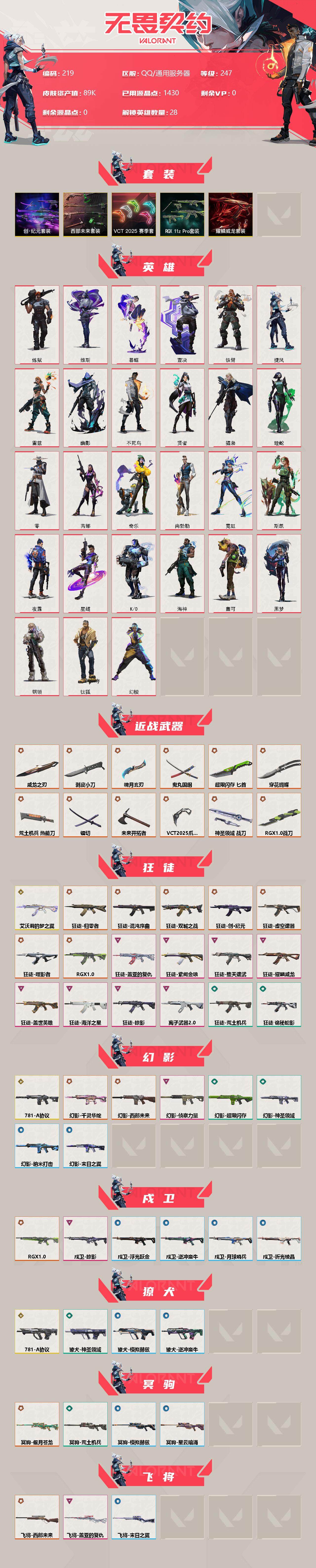 【219】【套装】:rgx 11z pro套装,vct 2025 赛季套装,西部未来套装,创·纪元套装,耀鳞威龙套装 【英雄】:幻棱,炼狱,维斯,暮蝶,钛狐,壹决,铁臂,捷风,雷兹,幽影,不死鸟,贤者,猎枭,蝰蛇,零,芮娜,奇乐,尚勃勒,霓虹,斯凯,夜露,星礈,k/o,海神,盖可,黑梦,钢锁 【近战 武器】:近战武器-rgx 11z pro 战刀,近战武器-穿花蝴蝶,近战武器-剥皮小刀,近战武器-vct 2025 爪刀,近战武器-镭切,近战武器-威龙之刃,近战武器-鬼丸国纲,近战武器-未来开拓者,近战武器-超限闪存 匕首,近战武器-荒土机兵 热能刀,近战武器-魄月玄刃,近战武器-神圣领域 战刀 【狂徒】:狂徒-艾沃莉的梦之翼,狂徒-归零者,狂徒-混沌序曲,狂徒-双城之战,狂徒-创·纪元,狂徒-虚空遗器,狂徒-噬影者,狂徒-rgx 11z pro,狂徒-堕天遗武,狂徒-掠影,狂徒-盖世英雄,狂徒-盖亚的复仇,狂徒-海洋之星,狂徒-耀鳞威龙,狂徒-紫阙金琅,狂徒-离子武器//2.0,狂徒-荒土机兵,狂徒-诡秘蛇影 【幻影】:幻影-781-a协议,幻影-千灵华绽,幻影-西部未来,幻影-侦察力量,幻影-超限闪存,幻影-神圣领域,幻影-纳米打击,幻影-末日之翼,幻影-西部未来 【戍卫】:戍卫-rgx 11z pro,戍卫-掠影,戍卫-浮光跃金,戍卫-逆冲蛮牛,戍卫-月球哨兵,戍卫-折光棱晶 【獠犬】:獠犬-781-a协议,獠犬-神圣领域,獠犬-模拟赫兹,獠犬-逆冲蛮牛 【冥驹】:冥驹-偃月苍龙,冥驹-荒土机兵,冥驹-模拟赫兹,冥驹-星云暗涌 【飞将】:飞将-西部未来,飞将-盖亚的复仇,飞将-末日之翼 【莽侠】:莽侠-创·纪元,莽侠-超限闪存,莽侠-诡秘蛇影,莽侠-月球哨兵 【战神】:战神-神圣领域,战神-浮光跃金 【奥丁】:奥丁-艾沃莉的梦之翼,奥丁-西部未来,奥丁-纳米打击,奥丁-末日之翼 【判官】:判官-上古龙炎,判官-诡秘蛇影,判官-纳米打击x 【雄鹿】:雄鹿-模拟赫兹,雄鹿-逆冲蛮牛,雄鹿-月球哨兵 【骇灵】:骇灵-塑水宗,骇灵-创·纪元,骇灵-荒土机兵,骇灵-浮光跃金,骇灵-星云暗涌 【蜂刺】:蜂刺-rgx 11z pro,蜂刺-超限闪存,蜂刺-星云暗涌,蜂刺-折光棱晶 【标配】:标配-超能偶像,标配-荒土机兵,标配-浮光跃金,标配-折光棱晶 【vct手呛】:标配-vct25 x blg 【正义】:正义-塑水宗,正义-创·纪元,正义-西部未来,正义-超限闪存,正义-沙尘幻旅,正义-复古浪潮,正义-纳米打击,正义-游戏结束,正义-月球哨兵 【鬼魅】:鬼魅-耀鳞威龙,鬼魅-流星兵团,鬼魅-光导纤维,鬼魅-模拟赫兹,鬼魅-宿怨,鬼魅-星云暗涌 【狂怒】:狂怒-rgx 11z pro,狂怒-紫阙金琅//2.0,狂怒-神圣领域,狂怒-逆冲蛮牛 【短炮】:短炮-末日之翼 【卡面】:终章:激斗汉堡 卡面,进入射程 卡面,分崩离析 卡面,纳米打击 卡面,抑制技术 卡面,激斗汉堡 卡面,瓦娃脸雪糕 p2 卡面,从黄昏到黎明 卡面,荒土机兵 卡面,银弹猎手 卡面,逆冲蛮牛 卡面,《双城之战》拥抱 卡面,精灵大战 卡面,欢迎来到底城 卡面,南瓜盛典 卡面,唱片的故事 卡面,钢弓与箭弦 卡面,排除故障 卡面,战术桌游 卡面,悠享食光 卡面,修车达人 卡面,热舞环节 卡面,模拟赫兹 卡面,浮光跃金 卡面,超限闪存 卡面,维斯工牌 卡面,正义的化身 卡面,终章:生意人麦宝 卡面,铁之华 卡面,时间到 卡面,最高舞台 卡面,声感陷阱设计图 卡面,梦幻奶茶 卡面,终章:打造专属狂徒 卡面,趁热吃 卡面,源能反应 卡面,零点嗅探设计图 卡面,终章:瓦娃脸雪糕 卡面,表象之下 卡面,沙雕爆能器 卡面,无畏契约go!第一卷:芮娜 卡面,清除名单 卡面,无畏契约go!第一卷:零 卡面,终章:同步耍酷 卡面,龍记 卡面,化茧成蝶 卡面,无垠星环 卡面,《双城之战》金克丝 卡面,同步耍酷 卡面,完美调谐 卡面 ,暗呛 卡面,终章:黑影先生的咖啡! 卡面,铁臂vs雷兹 卡面,夯实根基 卡面,"luie" 卡面,热烈欢迎 卡面,铁臂设计图 卡面,代号红色 卡面,冰淇淋店 卡面,新兵报到 卡面,友军火力 卡面,v契约 卡面,无畏契约 卡面 【喷漆】:小小心意 喷漆,战“素”兔 喷漆,宇宙的指引 喷漆,请求重启 喷漆,逆冲蛮牛 喷漆,纳米打击 喷漆,鼻尖上的蝴蝶 喷漆,简笔画黯兽 喷漆,独守蝰腹 喷漆,他们将落荒而逃 喷漆,通缉:战术企鹅 喷漆,荒土机兵 喷漆,别挡我吃球! 喷漆,嗨宝南瓜灯 喷漆,嘭! 喷漆,都算到了 喷漆,控场勿近 喷漆,皮蛋呼呼 喷漆,像素星礈 喷漆,图谋不轨的零 喷漆,小丑猫 喷漆,模拟赫兹 喷漆,高丽风情小熊 喷漆,蹲到一个 喷漆,全力集中 喷漆,超限闪存 喷漆,rua一下 喷漆,熊抱 喷漆,高丽风情小虎 喷漆,记在小本本 喷漆,防弹企鹅 喷漆,高丽风情小蛙 喷漆,超级粉丝 喷漆,捷风差距 喷漆,惊声尖叫 喷漆,拼一呛 喷漆,我觉得不行 喷漆,我的刀呢? 喷漆,uwu 喷漆,新潮流 喷漆,双击点赞 喷漆,买装还是存钱 喷漆,醒狮贺春 喷漆,无畏契约go!第一卷:芮娜 喷漆,红鳞 喷漆,无畏契约go!第一卷:零 喷漆,无畏契约go!第一卷:捷风 喷漆,无畏契约go!第一卷:贤者 喷漆,暴走萝莉 喷漆,松叶 喷漆,无畏契约go!第一卷:奇乐 喷漆,旅行小熊 喷漆,蕊形灯 喷漆,凌空惊吓 喷漆,老铁困了 喷漆,口袋贤者 喷漆,胜利属于无畏契约 喷漆,glhf 喷漆,无畏契约 喷漆 【挂饰】:v25第三幕:超凡 挂饰,终章:猫猫木乃伊 挂饰,荒土机兵 挂饰,悠闲鸡块 挂饰,猫猫木乃伊 挂饰,水壶 挂饰,纳米打击 挂饰,逆冲蛮牛 挂饰,可爱糖糖 挂饰,伞绳 挂饰,《双城之战》小蛋糕 挂饰,第九季//第三幕 纪念币 挂饰,拳击战术熊 挂饰,工具腰带 挂饰,暗藏猫腻 挂饰,高丽风情 挂饰,鱼骨头 挂饰,熔岩灯 挂饰,超限闪存 挂饰,迷你k/o 挂饰,模拟赫