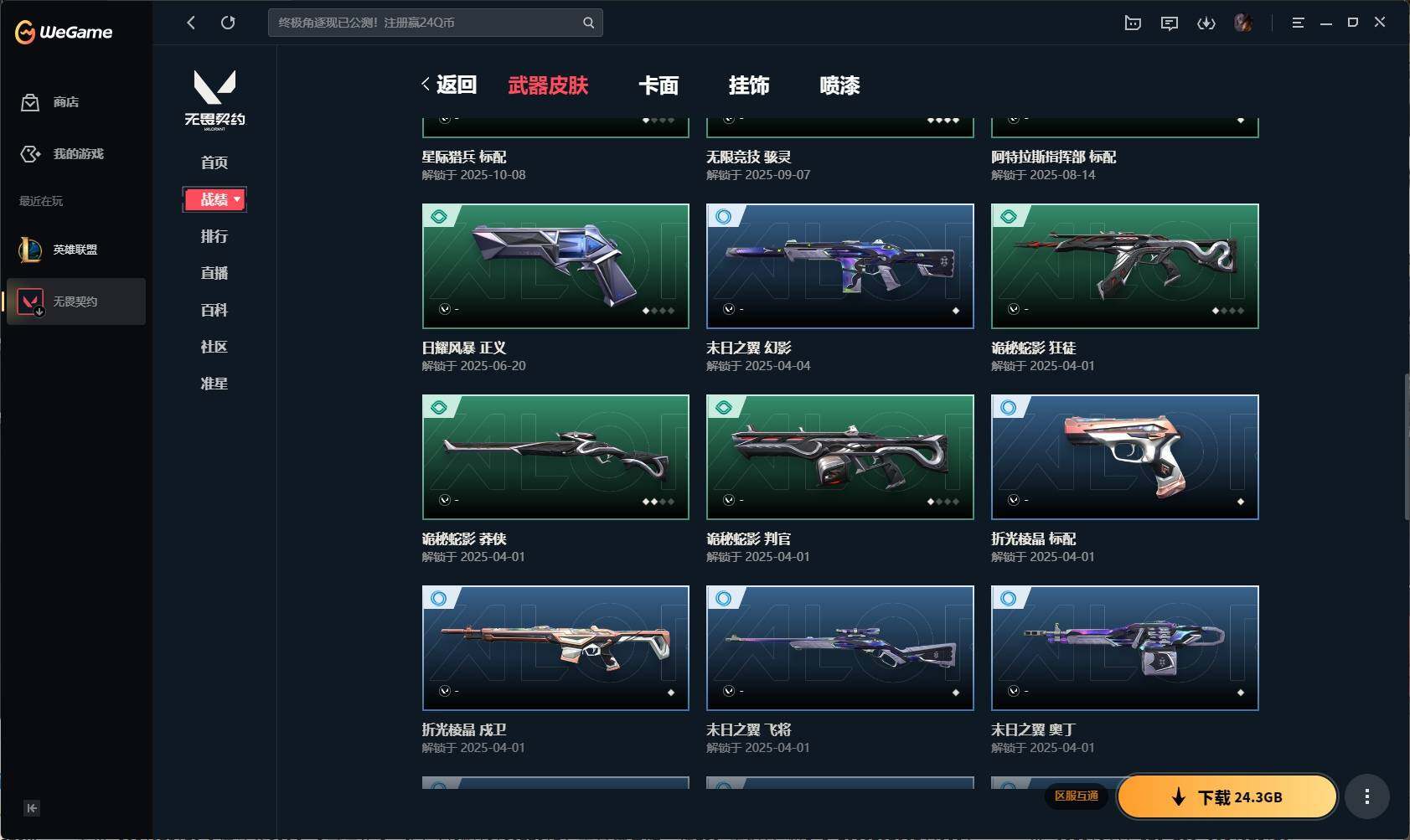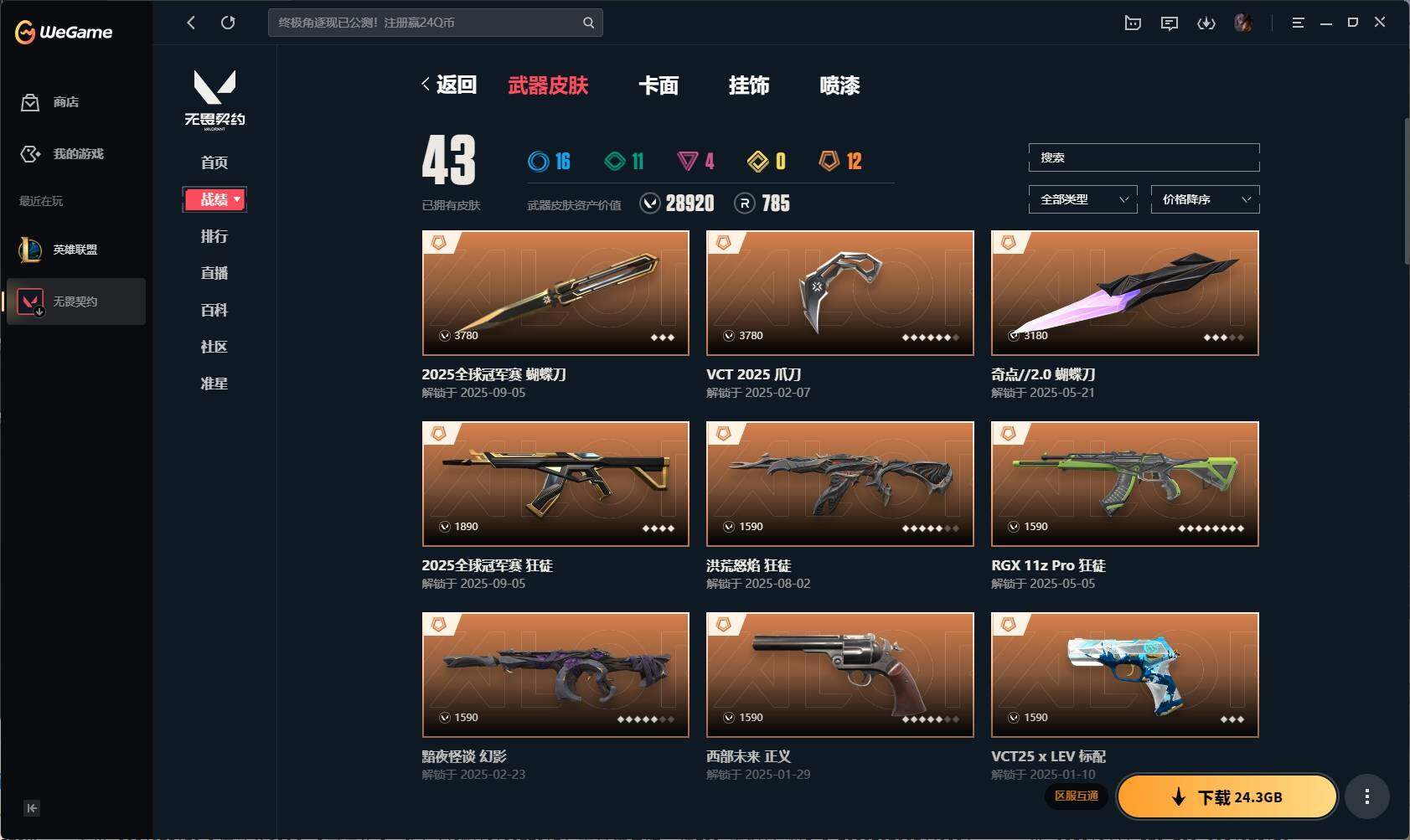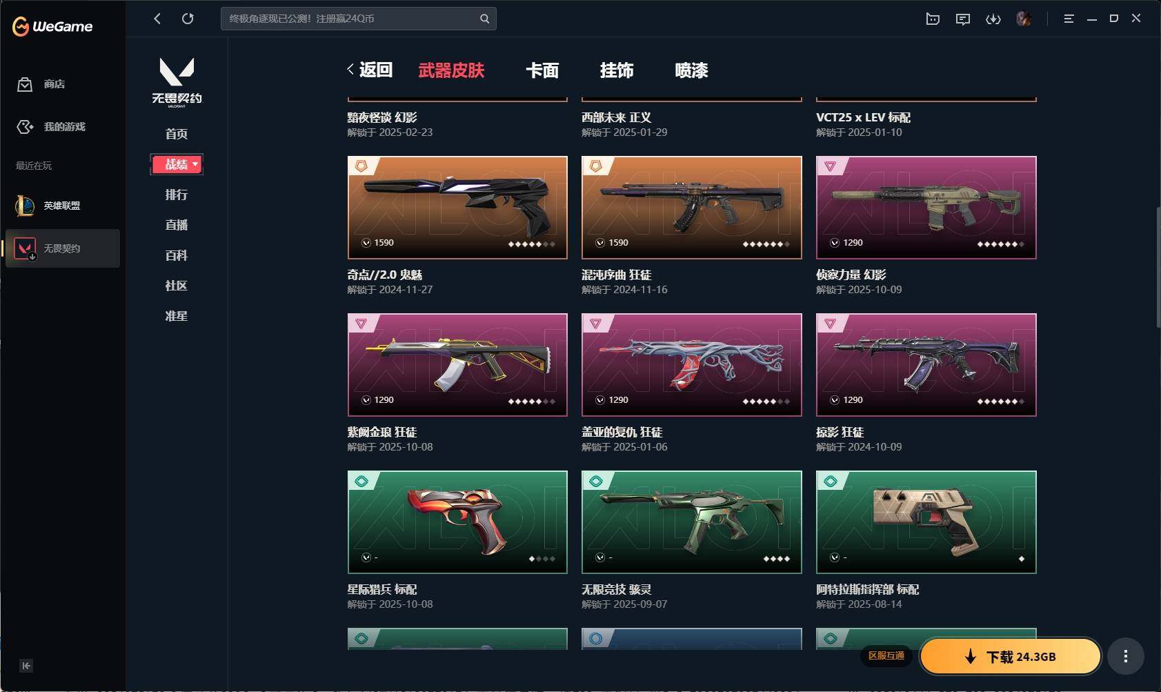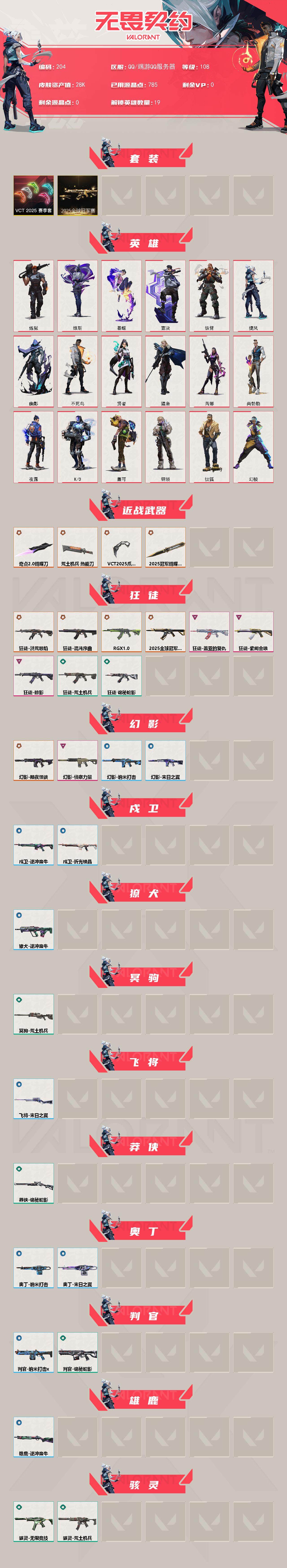 【204】【套装】:2025全球冠军赛套装,vct 2025 赛季套装 【英雄】:幻棱,炼狱,维斯,暮蝶,钛狐,壹决,铁臂,捷风,幽影,不死鸟,贤者,猎枭,芮娜,尚勃勒,夜露,k/o,盖可,钢锁 【近战 武器】:近战武器-2025全球冠军赛 蝴蝶刀,近战武器-奇点//2.0 蝴蝶刀,近战武器-vct 2025 爪刀,近战武器-荒土机兵 热能刀 【狂徒】:狂徒-2025全球冠军赛,狂徒-洪荒怒焰,狂徒-混沌序曲,狂徒-rgx 11z pro,狂徒-掠影,狂徒-盖亚的复仇,狂徒-紫阙金琅,狂徒-荒土机兵,狂徒-诡秘蛇影 【幻影】:幻影-黯夜怪谈,幻影-侦察力量,幻影-纳米打击,幻影-末日之翼 【戍卫】:戍卫-逆冲蛮牛,戍卫-折光棱晶 【獠犬】:獠犬-逆冲蛮牛 【冥驹】:冥驹-荒土机兵 【飞将】:飞将-末日之翼 【莽侠】:莽侠-诡秘蛇影 【奥丁】:奥丁-纳米打击,奥丁-末日之翼 【判官】:判官-诡秘蛇影,判官-纳米打击x 【雄鹿】:雄鹿-逆冲蛮牛 【骇灵】:骇灵-荒土机兵,骇灵-无限竞技 【蜂刺】:蜂刺-折光棱晶 【标配】:标配-荒土机兵,标配-折光棱晶 【vct手呛】:标配-vct25 x lev 【正义】:正义-西部未来,正义-纳米打击 【鬼魅】:鬼魅-奇点//2.0,鬼魅-星云暗涌 【狂怒】:狂怒-逆冲蛮牛 【短炮】:短炮-末日之翼 【卡面】:终章:激斗汉堡 卡面,进入射程 卡面,分崩离析 卡面,纳米打击 卡面,抑制技术 卡面,激斗汉堡 卡面,瓦娃脸雪糕 p2 卡面,从黄昏到黎明 卡面,荒土机兵 卡面,银弹猎手 卡面,逆冲蛮牛 卡面,《双城之战》拥抱 卡面,精灵大战 卡面,欢迎来到底城 卡面,南瓜盛典 卡面,无畏契约:暮蝶 卡面,修车达人 卡面,热舞环节 卡面,正义的化身 卡面,红鳞松叶 卡面,clutch 卡面,无畏契约go!第一卷:芮娜 卡面,无畏契约go!第一卷:零 卡面,化茧成蝶 卡面,无垠星环 卡面,《双城之战》金克丝 卡面,没有什么能逃过我的眼睛 卡面,钢锁vs盖可 卡面,别冒尖 卡面,势不可挡//k/o 卡面,代号红色 卡面,新兵报到 卡面,v契约 卡面,无畏契约 卡面 【喷漆】:小小心意 喷漆,战“素”兔 喷漆,宇宙的指引 喷漆,请求重启 喷漆,逆冲蛮牛 喷漆,纳米打击 喷漆,鼻尖上的蝴蝶 喷漆,简笔画黯兽 喷漆,独守蝰腹 喷漆,他们将落荒而逃 喷漆,通缉:战术企鹅 喷漆,荒土机兵 喷漆,别挡我吃球! 喷漆,嗨宝南瓜灯 喷漆,嘭! 喷漆,都算到了 喷漆,控场勿近 喷漆,伤心心 喷漆,小丑猫 喷漆,熊抱 喷漆,战术熊与伙伴们 喷漆,买装还是存钱 喷漆,关门放狗 喷漆,无畏契约go!第一卷:零 喷漆,胜利属于无畏契约 喷漆,glhf 喷漆,无畏契约 喷漆 【挂饰】:终章:猫猫木乃伊 挂饰,荒土机兵 挂饰,悠闲鸡块 挂饰,猫猫木乃伊 挂饰,水壶 挂饰,纳米打击 挂饰,逆冲蛮牛 挂饰,可爱糖糖 挂饰,伞绳 挂饰,《双城之战》小蛋糕 挂饰,第九季//第三幕 纪念币 挂饰,无畏契约go!第一卷 芮娜 挂饰,无畏契约go!第一卷 零 挂饰,鱼骨头 挂饰,熔岩灯 挂饰,第九季//第二幕 纪念币 挂饰,z世代特饮 挂饰,迷你机甲 挂饰,天外飞客 挂饰,无畏契约 纪念币 挂饰