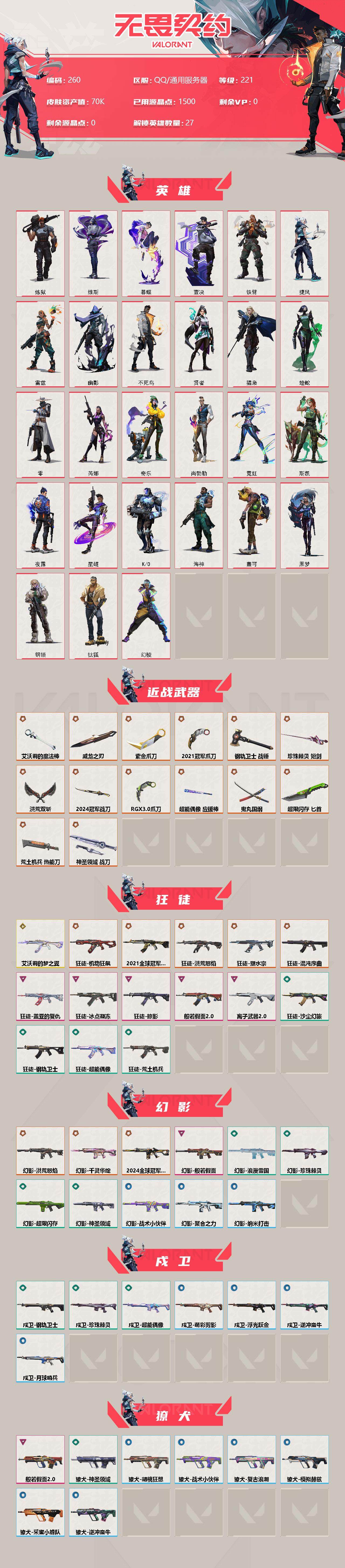 【260】【套装】:2024全球冠军赛套装,2021全球冠军赛套装,艾沃莉的梦之翼套装,洪荒怒焰套装,般若假面//2.0套装 【英雄】:幻棱,炼狱,维斯,暮蝶,钛狐,壹决,铁臂,捷风,雷兹,幽影,不死鸟,贤者,猎枭,蝰蛇,零,芮娜,奇乐,尚勃勒,霓虹,斯凯,夜露,星礈,k/o,海神,盖可,黑梦,钢锁 【近战 武器】:近战武器-2024全球冠军赛 战刀,近战武器-2021全球冠军赛 爪刀,近战武器-紫金爪刀,近战武器-rgx 11z pro//3.0 爪刀,近战武器-艾沃莉的魔法棒,近战武器-威龙之刃,近战武器-鬼丸国纲,近战武器-珍珠棘贝 短剑,近战武器-超能偶像 应援棒,近战武器-超限闪存 匕首,近战武器-钢轨卫士 战锤,近战武器-洪荒双斩,近战武器-荒土机兵 热能刀,近战武器-神圣领域 战刀 【狂徒】:狂徒-艾沃莉的梦之翼,狂徒-2021全球冠军赛,狂徒-洪荒怒焰,狂徒-混沌序曲,狂徒-机动狂飙,狂徒-塑水宗,狂徒-般若假面//2.0,狂徒-冰点凝冻,狂徒-掠影,狂徒-盖亚的复仇,狂徒-离子武器//2.0,狂徒-超能偶像,狂徒-钢轨卫士,狂徒-荒土机兵,狂徒-沙尘幻旅 【幻影】:幻影-2024全球冠军赛,幻影-洪荒怒焰,幻影-千灵华绽,幻影-般若假面,幻影-超限闪存,幻影-浪漫雪国,幻影-珍珠棘贝,幻影-神圣领域,幻影-聚合之力,幻影-纳米打击,幻影-战术小伙伴 【戍卫】:戍卫-超能偶像,戍卫-钢轨卫士,戍卫-珍珠棘贝,戍卫-浮光跃金,戍卫-萌彩剪影,戍卫-逆冲蛮牛,戍卫-月球哨兵 【獠犬】:獠犬-般若假面//2.0,獠犬-神圣领域,獠犬-采蜜小蜂队,獠犬-复古浪潮,獠犬-胡桃狂想,獠犬-模拟赫兹,獠犬-逆冲蛮牛,獠犬-战术小伙伴 【冥驹】:冥驹-偃月苍龙,冥驹-荒土机兵,冥驹-复古浪潮,冥驹-胡桃狂想,冥驹-模拟赫兹,冥驹-星云暗涌 【飞将】:飞将-沙尘幻旅,飞将-聚合之力,飞将-光导纤维 【莽侠】:莽侠-超限闪存,莽侠-深海水族,莽侠-月球哨兵 【战神】:战神-般若假面//2.0,战神-神圣领域,战神-采蜜小蜂队,战神-浮光跃金,战神-萌彩剪影,战神-深海水族 【奥丁】:奥丁-艾沃莉的梦之翼,奥丁-纳米打击,奥丁-战术小伙伴 【判官】:判官-全息波普,判官-超能偶像,判官-采蜜小蜂队,判官-萌彩剪影,判官-纳米打击x 【雄鹿】:雄鹿-起源,雄鹿-复古浪潮,雄鹿-模拟赫兹,雄鹿-逆冲蛮牛,雄鹿-月球哨兵 【骇灵】:骇灵-艾沃莉的梦之翼,骇灵-洪荒怒焰,骇灵-荒土机兵,骇灵-沙尘幻旅,骇灵-珍珠棘贝,骇灵-浮光跃金,骇灵-光导纤维,骇灵-星云暗涌 【蜂刺】:蜂刺-超限闪存,蜂刺-胡桃狂想,蜂刺-聚合之力,蜂刺-深海水族,蜂刺-战术小伙伴,蜂刺-星云暗涌 【标配】:标配-超能偶像,标配-荒土机兵,标配-浮光跃金,标配-光导纤维 【正义】:正义-离子武器,正义-超限闪存,正义-复古浪潮,正义-纳米打击,正义-月球哨兵 【鬼魅】:鬼魅-艾沃莉的梦之翼,鬼魅-天界神兵,鬼魅-诡秘蛇影,鬼魅-采蜜小蜂队,鬼魅-光导纤维,鬼魅-胡桃狂想,鬼魅-模拟赫兹,鬼魅-星云暗涌 【狂怒】:狂怒-般若假面//2.0,狂怒-钢轨卫士,狂怒-珍珠棘贝,狂怒-神圣领域,狂怒-聚合之力,狂怒-萌彩剪影,狂怒-逆冲蛮牛 【短炮】:短炮-洪荒怒焰,短炮-钢轨卫士,短炮-深海水族 【卡面】:终章:激斗汉堡 卡面,进入射程 卡面,分崩离析 卡面,纳米打击 卡面,抑制技术 卡面,激斗汉堡 卡面,瓦娃脸雪糕 p2 卡面,从黄昏到黎明 卡面,荒土机兵 卡面,银弹猎手 卡面,逆冲蛮牛 卡面,《双城之战》拥抱 卡面,精灵大战 卡面,欢迎来到底城 卡面,南瓜盛典 卡面,唱片的故事 卡面,钢弓与箭弦 卡面,无畏契约:暮蝶 卡面,排除故障 卡面,战术桌游 卡面,悠享食光 卡面,修车达人 卡面,模拟赫兹 卡面,浮光跃金 卡面,超限闪存 卡面,维斯工牌 卡面,正义的化身 卡面,终章:生意人麦宝 卡面,铁之华 卡面,2024全球冠军赛 卡面,失而复得 卡面,时间到 卡面,最高舞台 卡面,复活专家 卡面,归乡 // 蝰蛇 卡面,超能偶像 卡面,生意人麦宝 卡面,音熊登场 卡面,声感陷阱设计图 卡面,钢锁工牌 卡面,战术小伙伴的夏日 卡面,采蜜小蜂队 卡面,聚合之力 卡面,梦幻奶茶 卡面,源能反应 卡面,零点嗅探设计图 卡面,终章:瓦娃脸雪糕 卡面,表象之下 卡面,虹吸式咖啡壶 卡面,源能者美容 卡面,脚踝终结者 卡面 ,夜班 卡面,瓦娃脸雪糕 卡面 ,沙雕爆能器 卡面,无畏契约go!第一卷:芮娜 卡面,深海水族 卡面,珍珠棘贝 卡面,复古浪潮 卡面,盖可工牌 卡面,清除名单 卡面,无畏契约go!第一卷:零 卡面,终章:同步耍酷 卡面,龍记 卡面,化茧成蝶 卡面,比比看谁快? 卡面,《双城之战》金克丝 卡面,蝰蛇vs幽影 卡面,势不可挡//盖可 卡面,逆向独行 卡面 ,同步耍酷 卡面,完美调谐 卡面 ,没有什么能逃过我的眼睛 卡面,光导纤维 卡面,战术小伙伴 卡面,钢轨卫士 卡面,暗呛 卡面,一击全倒 卡面,黑影先生的咖啡! 卡面,天台狂欢 卡面,胡桃狂想 卡面,沙尘幻旅 卡面,壹决工牌 卡面,萌彩剪影 卡面,势不可挡//k/o 卡面,夯实根基 卡面,铁臂设计图 卡面,代号红色 卡面,新兵报到 卡面,v契约 卡面,无畏契约 卡面 【喷漆】:小小心意 喷漆,战“素”兔 喷漆,宇宙的指引 喷漆,请求重启 喷漆,逆冲蛮牛 喷漆,纳米打击 喷漆,鼻尖上的蝴蝶 喷漆,简笔画黯兽 喷漆,独守蝰腹 喷漆,他们将落荒而逃 喷漆,通缉:战术企鹅 喷漆,荒土机兵 喷漆,别挡我吃球! 喷漆,嗨宝南瓜灯 喷漆,嘭! 喷漆,都算到了 喷漆,控场勿近 喷漆,皮蛋呼呼 喷漆,像素星礈 喷漆,图谋不轨的零 喷漆,伤心心 喷漆,小丑猫 喷漆,模拟赫兹 喷漆,高丽风情小熊 喷漆,蹲到一个 喷漆,全