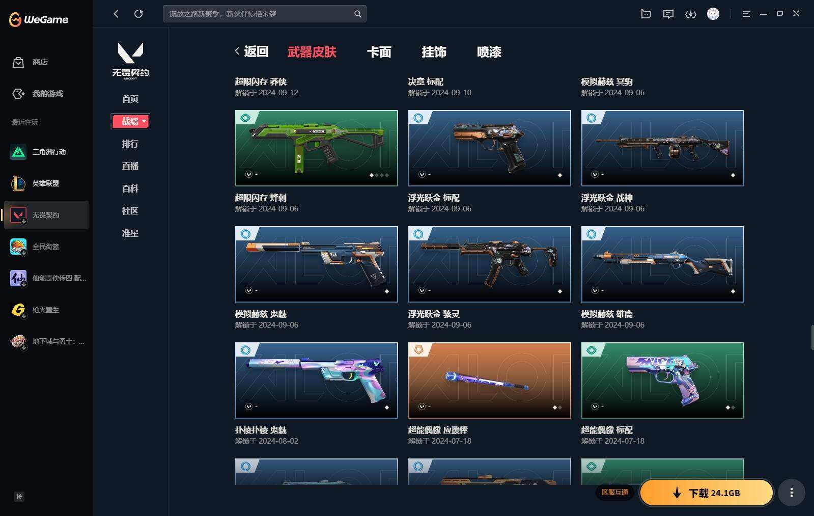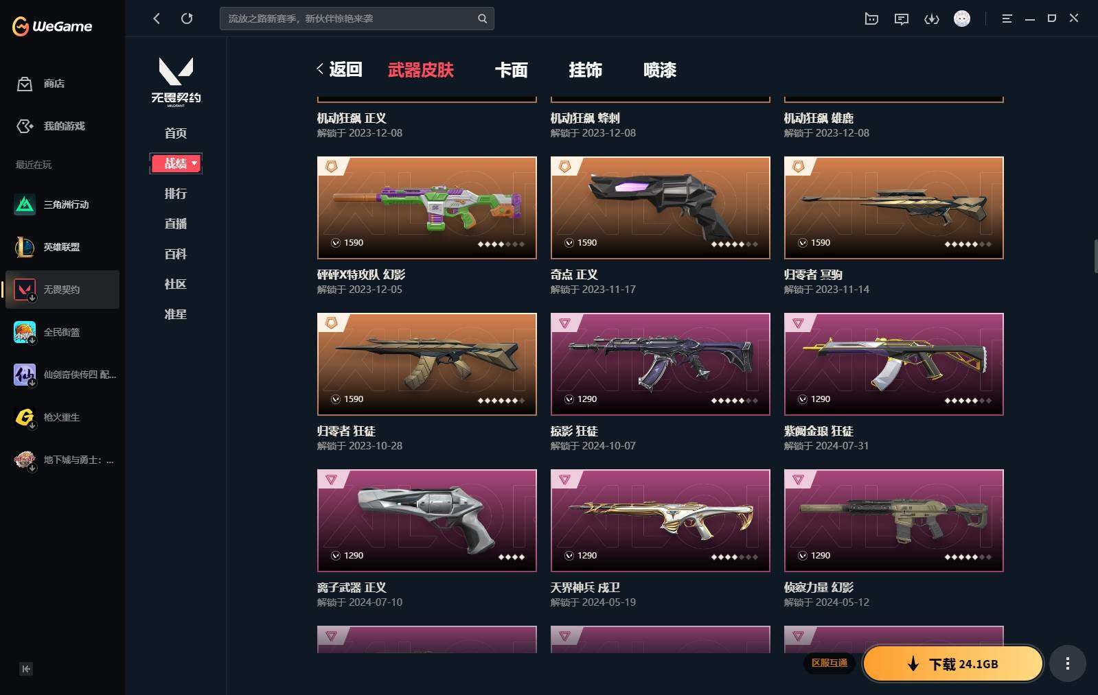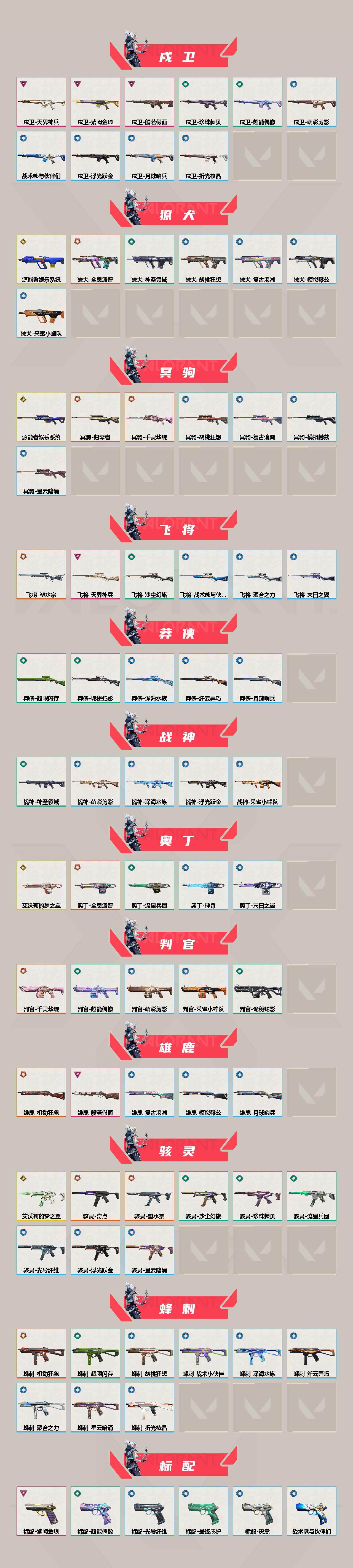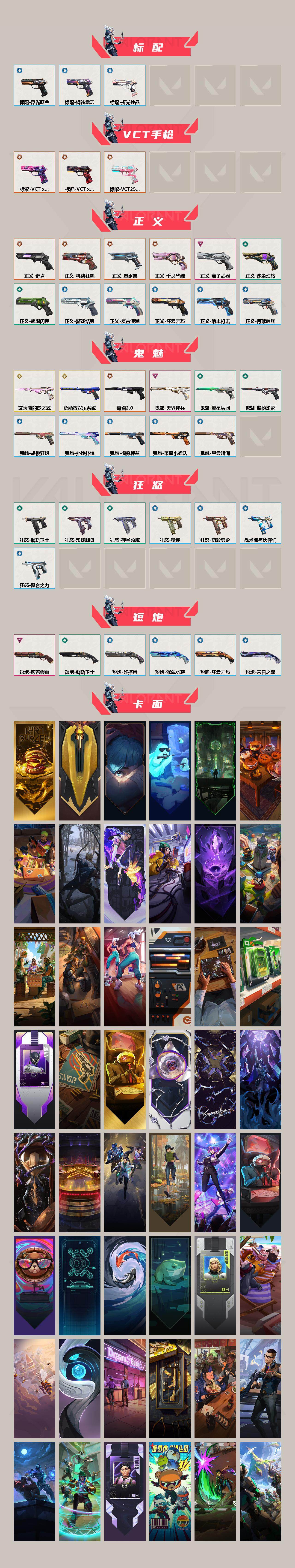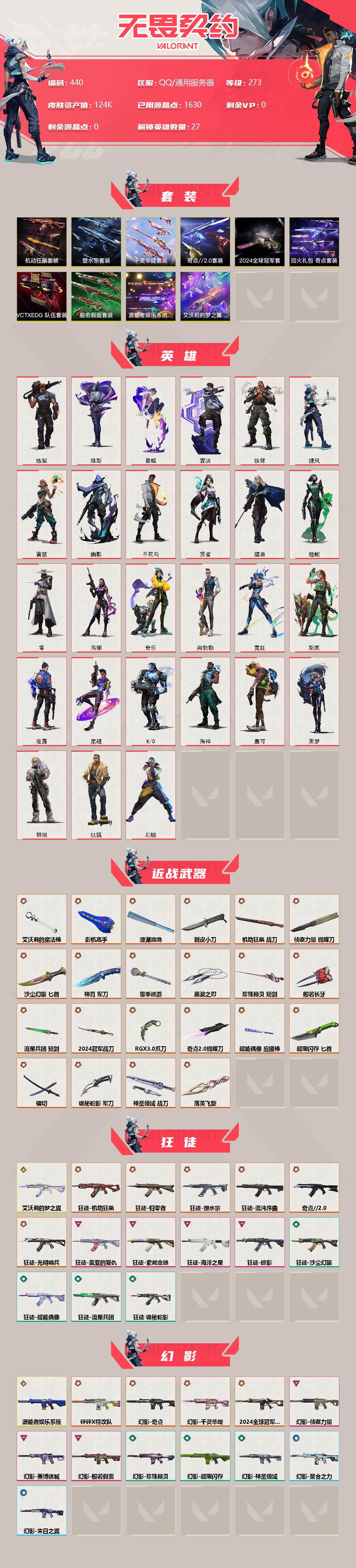 【440】【套装】:2024全球冠军赛套装,源能者娱乐系统套装,艾沃莉的梦之翼套装,塑水宗套装,千灵华绽套装,奇点//2.0套装,机动狂飙套装,vctxedg 队伍套装,回火礼包:奇点套装,般若假面套装 【英雄】:幻棱,炼狱,维斯,暮蝶,钛狐,壹决,铁臂,捷风,雷兹,幽影,不死鸟,贤者,猎枭,蝰蛇,零,芮娜,奇乐,尚勃勒,霓虹,斯凯,夜露,星礈,k/o,海神,盖可,黑梦,钢锁 【近战 武器】:近战武器-2024全球冠军赛 战刀,近战武器-侦察力量 蝴蝶刀,近战武器-剥皮小刀,近战武器-奇点//2.0 蝴蝶刀,近战武器-rgx 11z pro//3.0 爪刀,近战武器-黑波之刃,近战武器-落英飞旋,近战武器-镭切,近战武器-艾沃莉的魔法棒,近战武器-澄湖潋滟,近战武器-珍珠棘贝 短剑,近战武器-般若长牙,近战武器-流星兵团 短剑,近战武器-超能偶像 应援棒,近战武器-超限闪存 匕首,近战武器-机动狂飙 战刀,近战武器-街机高手,近战武器-沙尘幻旅 匕首,近战武器-神罚 军刀,近战武器-雪季巡游,近战武器-诡秘蛇影 军刀,近战武器-神圣领域 战刀 【狂徒】:狂徒-艾沃莉的梦之翼,狂徒-光明哨兵,狂徒-归零者,狂徒-混沌序曲,狂徒-机动狂飙,狂徒-奇点//2.0,狂徒-塑水宗,狂徒-掠影,狂徒-盖亚的复仇,狂徒-海洋之星,狂徒-紫阙金琅,狂徒-超能偶像,狂徒-流星兵团,狂徒-沙尘幻旅,狂徒-诡秘蛇影 【幻影】:幻影-源能者娱乐系统,幻影-2024全球冠军赛,幻影-砰砰x特攻队,幻影-奇点,幻影-千灵华绽,幻影-般若假面,幻影-赛博迷城,幻影-侦察力量,幻影-超限闪存,幻影-珍珠棘贝,幻影-神圣领域,幻影-聚合之力,幻影-末日之翼 【戍卫】:戍卫-般若假面,戍卫-天界神兵,戍卫-紫阙金琅,戍卫-超能偶像,戍卫-珍珠棘贝,戍卫-浮光跃金,戍卫-萌彩剪影,戍卫-战术熊与伙伴们,戍卫-月球哨兵,戍卫-折光棱晶 【獠犬】:獠犬-源能者娱乐系统,獠犬-全息波普,獠犬-神圣领域,獠犬-采蜜小蜂队,獠犬-复古浪潮,獠犬-胡桃狂想,獠犬-模拟赫兹 【冥驹】:冥驹-源能者娱乐系统,冥驹-归零者,冥驹-千灵华绽,冥驹-复古浪潮,冥驹-胡桃狂想,冥驹-模拟赫兹,冥驹-星云暗涌 【飞将】:飞将-塑水宗,飞将-天界神兵,飞将-沙尘幻旅,飞将-聚合之力,飞将-战术熊与伙伴们,飞将-末日之翼 【莽侠】:莽侠-超限闪存,莽侠-诡秘蛇影,莽侠-深海水族,莽侠-纤云弄巧,莽侠-月球哨兵 【战神】:战神-神圣领域,战神-采蜜小蜂队,战神-浮光跃金,战神-萌彩剪影,战神-深海水族 【奥丁】:奥丁-艾沃莉的梦之翼,奥丁-全息波普,奥丁-流星兵团,奥丁-神罚,奥丁-末日之翼 【判官】:判官-千灵华绽,判官-超能偶像,判官-诡秘蛇影,判官-采蜜小蜂队,判官-萌彩剪影 【雄鹿】:雄鹿-机动狂飙,雄鹿-般若假面,雄鹿-复古浪潮,雄鹿-模拟赫兹,雄鹿-月球哨兵 【骇灵】:骇灵-艾沃莉的梦之翼,骇灵-奇点,骇灵-塑水宗,骇灵-流星兵团,骇灵-沙尘幻旅,骇灵-珍珠棘贝,骇灵-浮光跃金,骇灵-光导纤维,骇灵-星云暗涌 【蜂刺】:蜂刺-机动狂飙,蜂刺-超限闪存,蜂刺-胡桃狂想,蜂刺-聚合之力,蜂刺-深海水族,蜂刺-纤云弄巧,蜂刺-战术小伙伴,蜂刺-星云暗涌,蜂刺-折光棱晶 【标配】:标配-紫阙金琅,标配-超能偶像,标配-浮光跃金,标配-钢铁意志,标配-光导纤维,标配-决意,标配-战术熊与伙伴们,标配-最终庇护,标配-折光棱晶 【vct手呛】:标配-vct x edg,标配-vct x prx,标配-vct25 x blg 【正义】:正义-机动狂飙,正义-奇点,正义-千灵华绽,正义-塑水宗,正义-离子武器,正义-超限闪存,正义-沙尘幻旅,正义-复古浪潮,正义-纳米打击,正义-纤云弄巧,正义-游戏结束,正义-月球哨兵 【鬼魅】:鬼魅-艾沃莉的梦之翼,鬼魅-源能者娱乐系统,鬼魅-奇点//2.0,鬼魅-天界神兵,鬼魅-流星兵团,鬼魅-诡秘蛇影,鬼魅-采蜜小蜂队,鬼魅-胡桃狂想,鬼魅-模拟赫兹,鬼魅-扑棱扑棱,鬼魅-星云暗涌 【狂怒】:狂怒-钢轨卫士,狂怒-珍珠棘贝,狂怒-神圣领域,狂怒-聚合之力,狂怒-萌彩剪影,狂怒-猛袭,狂怒-战术熊与伙伴们 【短炮】:短炮-般若假面,短炮-钢轨卫士,短炮-好搭档,短炮-深海水族,短炮-纤云弄巧,短炮-末日之翼 【卡面】:终章:激斗汉堡 卡面,进入射程 卡面,《双城之战》拥抱 卡面,精灵大战 卡面,欢迎来到底城 卡面,南瓜盛典 卡面,唱片的故事 卡面,钢弓与箭弦 卡面,无畏契约:暮蝶 卡面,排除故障 卡面,奇点//2.0 卡面,战术桌游 卡面,悠享食光 卡面,修车达人 卡面,热舞环节 卡面,模拟赫兹 卡面,浮光跃金 卡面,超限闪存 卡面,维斯工牌 卡面,正义的化身 卡面,终章:生意人麦宝 卡面,铁之华 卡面,2024全球冠军赛 卡面,失而复得 卡面,时间到 卡面,最高舞台 卡面,复活专家 卡面,归乡 // 蝰蛇 卡面,超能偶像 卡面,生意人麦宝 卡面,音熊登场 卡面,声感陷阱设计图 卡面,红鳞松叶 卡面,霓帧牛蛙 卡面,钢锁工牌 卡面,战术小伙伴的夏日 卡面,采蜜小蜂队 卡面,聚合之力 卡面,梦幻奶茶 卡面,终章:打造专属狂徒 卡面,趁热吃 卡面,西装暴徒 卡面,失控边缘 卡面,哨卫者之领域 卡面,暮蝶工牌 卡面,战术熊与伙伴们 卡面,源能反应 卡面,流星兵团 卡面,纤云弄巧 卡面,暂别喧嚣 卡面,打造专属狂徒 卡面,零点嗅探设计图 卡面,表象之下 卡面,虹吸式咖啡壶 卡面,源能者美容 卡面,脚踝终结者 卡面 ,夜班 卡面,瓦娃脸雪糕 卡面 ,沙雕爆能器 卡面,深海水族 卡面,珍珠棘贝 卡面,复古浪潮 卡面,盖可工牌 卡面,清除名单 卡面,《双城之战》金克丝 卡面,没有什么能逃过我的眼睛 卡面,光导纤维 卡面,战术小伙伴 卡面,钢轨卫士 
