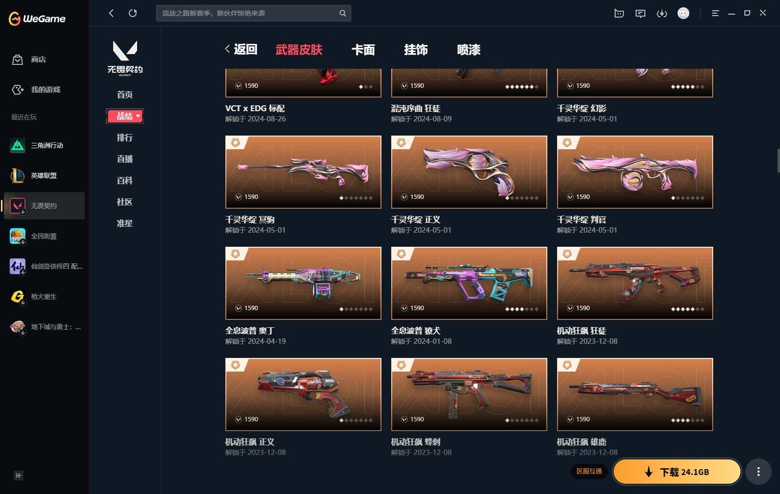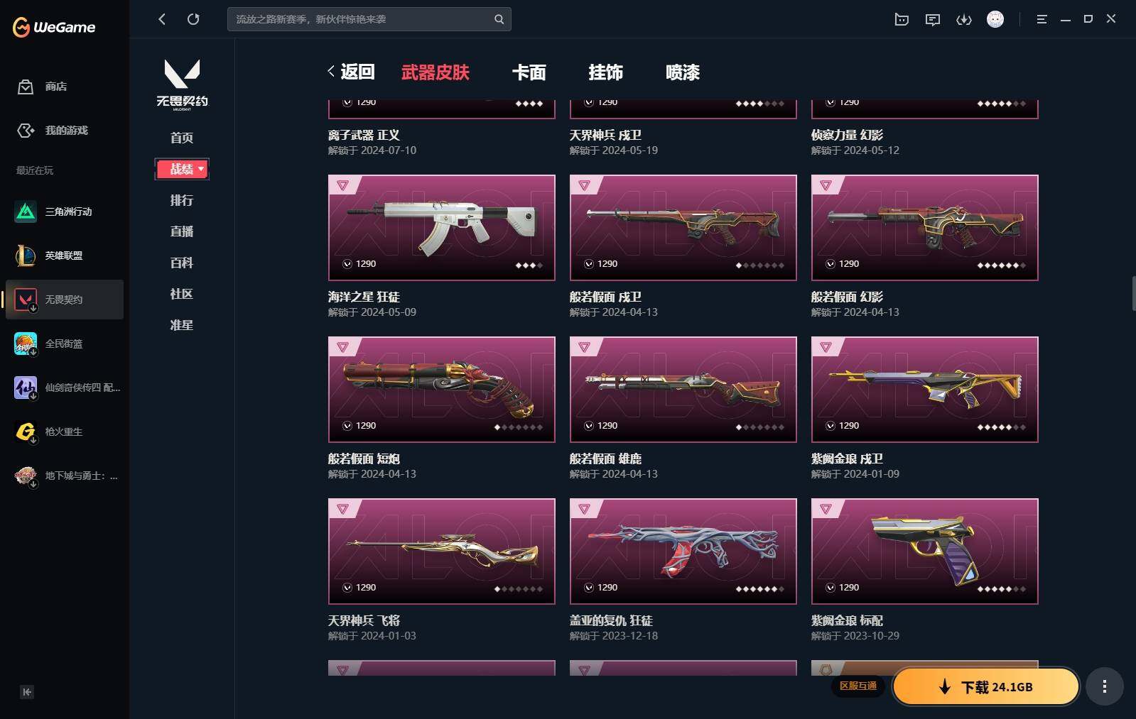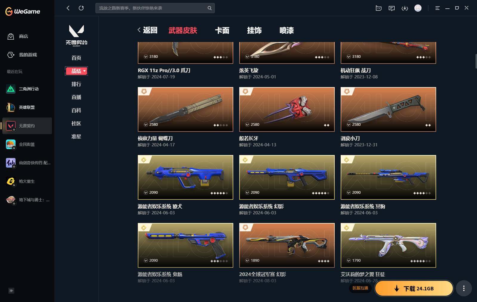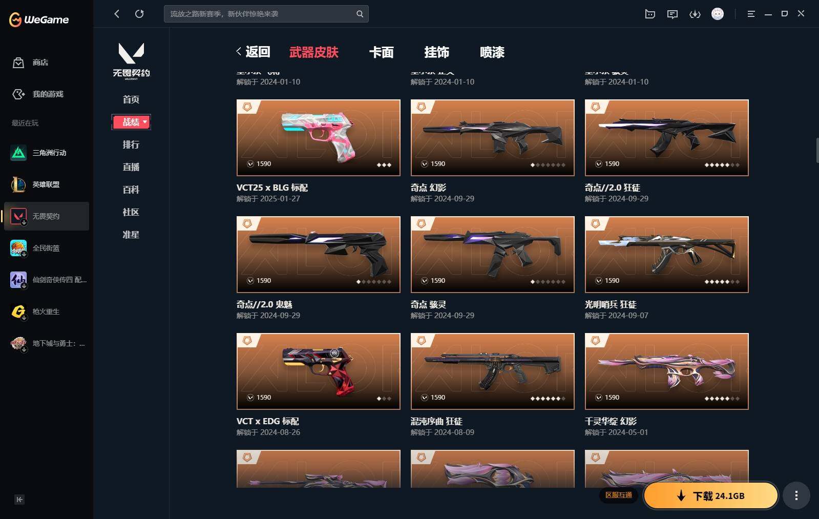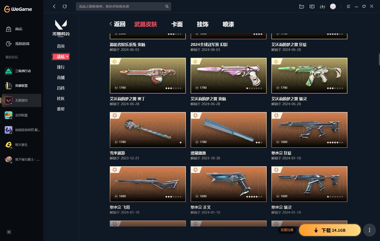 【440】【套装】:2024全球冠军赛套装,源能者娱乐系统套装,艾沃莉的梦之翼套装,塑水宗套装,千灵华绽套装,奇点//2.0套装,机动狂飙套装,vctxedg 队伍套装,回火礼包:奇点套装,般若假面套装 【英雄】:幻棱,炼狱,维斯,暮蝶,钛狐,壹决,铁臂,捷风,雷兹,幽影,不死鸟,贤者,猎枭,蝰蛇,零,芮娜,奇乐,尚勃勒,霓虹,斯凯,夜露,星礈,k/o,海神,盖可,黑梦,钢锁 【近战 武器】:近战武器-2024全球冠军赛 战刀,近战武器-侦察力量 蝴蝶刀,近战武器-剥皮小刀,近战武器-奇点//2.0 蝴蝶刀,近战武器-rgx 11z pro//3.0 爪刀,近战武器-黑波之刃,近战武器-落英飞旋,近战武器-镭切,近战武器-艾沃莉的魔法棒,近战武器-澄湖潋滟,近战武器-珍珠棘贝 短剑,近战武器-般若长牙,近战武器-流星兵团 短剑,近战武器-超能偶像 应援棒,近战武器-超限闪存 匕首,近战武器-机动狂飙 战刀,近战武器-街机高手,近战武器-沙尘幻旅 匕首,近战武器-神罚 军刀,近战武器-雪季巡游,近战武器-诡秘蛇影 军刀,近战武器-神圣领域 战刀 【狂徒】:狂徒-艾沃莉的梦之翼,狂徒-光明哨兵,狂徒-归零者,狂徒-混沌序曲,狂徒-机动狂飙,狂徒-奇点//2.0,狂徒-塑水宗,狂徒-掠影,狂徒-盖亚的复仇,狂徒-海洋之星,狂徒-紫阙金琅,狂徒-超能偶像,狂徒-流星兵团,狂徒-沙尘幻旅,狂徒-诡秘蛇影 【幻影】:幻影-源能者娱乐系统,幻影-2024全球冠军赛,幻影-砰砰x特攻队,幻影-奇点,幻影-千灵华绽,幻影-般若假面,幻影-赛博迷城,幻影-侦察力量,幻影-超限闪存,幻影-珍珠棘贝,幻影-神圣领域,幻影-聚合之力,幻影-末日之翼 【戍卫】:戍卫-般若假面,戍卫-天界神兵,戍卫-紫阙金琅,戍卫-超能偶像,戍卫-珍珠棘贝,戍卫-浮光跃金,戍卫-萌彩剪影,戍卫-战术熊与伙伴们,戍卫-月球哨兵,戍卫-折光棱晶 【獠犬】:獠犬-源能者娱乐系统,獠犬-全息波普,獠犬-神圣领域,獠犬-采蜜小蜂队,獠犬-复古浪潮,獠犬-胡桃狂想,獠犬-模拟赫兹 【冥驹】:冥驹-源能者娱乐系统,冥驹-归零者,冥驹-千灵华绽,冥驹-复古浪潮,冥驹-胡桃狂想,冥驹-模拟赫兹,冥驹-星云暗涌 【飞将】:飞将-塑水宗,飞将-天界神兵,飞将-沙尘幻旅,飞将-聚合之力,飞将-战术熊与伙伴们,飞将-末日之翼 【莽侠】:莽侠-超限闪存,莽侠-诡秘蛇影,莽侠-深海水族,莽侠-纤云弄巧,莽侠-月球哨兵 【战神】:战神-神圣领域,战神-采蜜小蜂队,战神-浮光跃金,战神-萌彩剪影,战神-深海水族 【奥丁】:奥丁-艾沃莉的梦之翼,奥丁-全息波普,奥丁-流星兵团,奥丁-神罚,奥丁-末日之翼 【判官】:判官-千灵华绽,判官-超能偶像,判官-诡秘蛇影,判官-采蜜小蜂队,判官-萌彩剪影 【雄鹿】:雄鹿-机动狂飙,雄鹿-般若假面,雄鹿-复古浪潮,雄鹿-模拟赫兹,雄鹿-月球哨兵 【骇灵】:骇灵-艾沃莉的梦之翼,骇灵-奇点,骇灵-塑水宗,骇灵-流星兵团,骇灵-沙尘幻旅,骇灵-珍珠棘贝,骇灵-浮光跃金,骇灵-光导纤维,骇灵-星云暗涌 【蜂刺】:蜂刺-机动狂飙,蜂刺-超限闪存,蜂刺-胡桃狂想,蜂刺-聚合之力,蜂刺-深海水族,蜂刺-纤云弄巧,蜂刺-战术小伙伴,蜂刺-星云暗涌,蜂刺-折光棱晶 【标配】:标配-紫阙金琅,标配-超能偶像,标配-浮光跃金,标配-钢铁意志,标配-光导纤维,标配-决意,标配-战术熊与伙伴们,标配-最终庇护,标配-折光棱晶 【vct手呛】:标配-vct x edg,标配-vct x prx,标配-vct25 x blg 【正义】:正义-机动狂飙,正义-奇点,正义-千灵华绽,正义-塑水宗,正义-离子武器,正义-超限闪存,正义-沙尘幻旅,正义-复古浪潮,正义-纳米打击,正义-纤云弄巧,正义-游戏结束,正义-月球哨兵 【鬼魅】:鬼魅-艾沃莉的梦之翼,鬼魅-源能者娱乐系统,鬼魅-奇点//2.0,鬼魅-天界神兵,鬼魅-流星兵团,鬼魅-诡秘蛇影,鬼魅-采蜜小蜂队,鬼魅-胡桃狂想,鬼魅-模拟赫兹,鬼魅-扑棱扑棱,鬼魅-星云暗涌 【狂怒】:狂怒-钢轨卫士,狂怒-珍珠棘贝,狂怒-神圣领域,狂怒-聚合之力,狂怒-萌彩剪影,狂怒-猛袭,狂怒-战术熊与伙伴们 【短炮】:短炮-般若假面,短炮-钢轨卫士,短炮-好搭档,短炮-深海水族,短炮-纤云弄巧,短炮-末日之翼 【卡面】:终章:激斗汉堡 卡面,进入射程 卡面,《双城之战》拥抱 卡面,精灵大战 卡面,欢迎来到底城 卡面,南瓜盛典 卡面,唱片的故事 卡面,钢弓与箭弦 卡面,无畏契约:暮蝶 卡面,排除故障 卡面,奇点//2.0 卡面,战术桌游 卡面,悠享食光 卡面,修车达人 卡面,热舞环节 卡面,模拟赫兹 卡面,浮光跃金 卡面,超限闪存 卡面,维斯工牌 卡面,正义的化身 卡面,终章:生意人麦宝 卡面,铁之华 卡面,2024全球冠军赛 卡面,失而复得 卡面,时间到 卡面,最高舞台 卡面,复活专家 卡面,归乡 // 蝰蛇 卡面,超能偶像 卡面,生意人麦宝 卡面,音熊登场 卡面,声感陷阱设计图 卡面,红鳞松叶 卡面,霓帧牛蛙 卡面,钢锁工牌 卡面,战术小伙伴的夏日 卡面,采蜜小蜂队 卡面,聚合之力 卡面,梦幻奶茶 卡面,终章:打造专属狂徒 卡面,趁热吃 卡面,西装暴徒 卡面,失控边缘 卡面,哨卫者之领域 卡面,暮蝶工牌 卡面,战术熊与伙伴们 卡面,源能反应 卡面,流星兵团 卡面,纤云弄巧 卡面,暂别喧嚣 卡面,打造专属狂徒 卡面,零点嗅探设计图 卡面,表象之下 卡面,虹吸式咖啡壶 卡面,源能者美容 卡面,脚踝终结者 卡面 ,夜班 卡面,瓦娃脸雪糕 卡面 ,沙雕爆能器 卡面,深海水族 卡面,珍珠棘贝 卡面,复古浪潮 卡面,盖可工牌 卡面,清除名单 卡面,《双城之战》金克丝 卡面,没有什么能逃过我的眼睛 卡面,光导纤维 卡面,战术小伙伴 卡面,钢轨卫士 