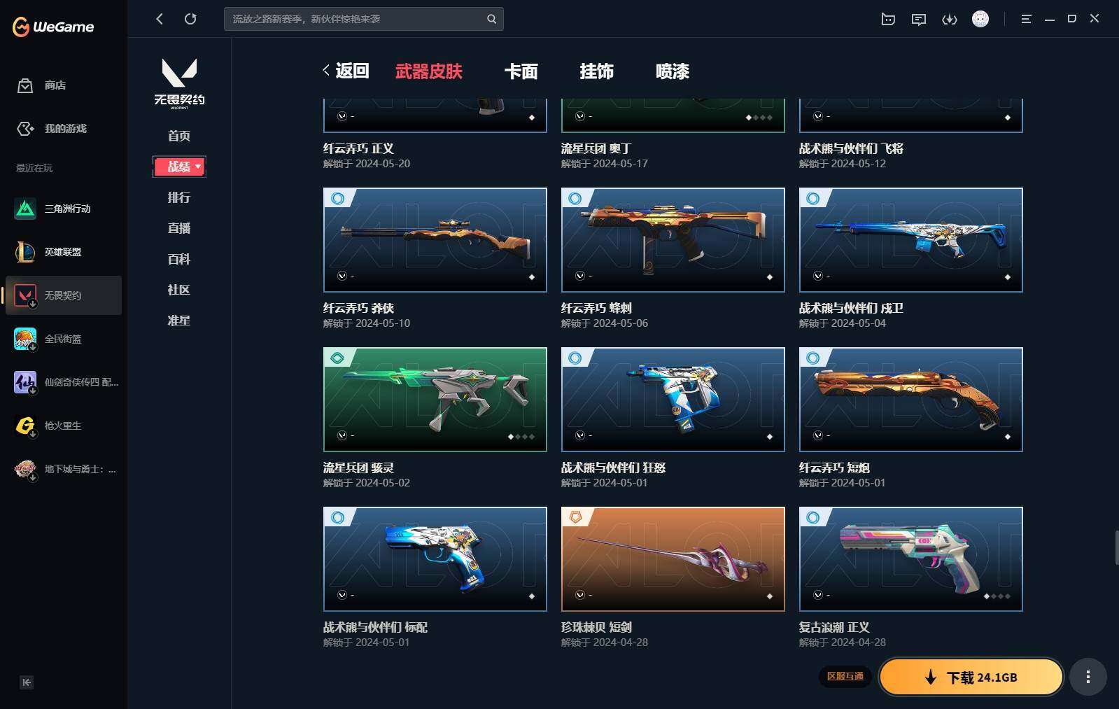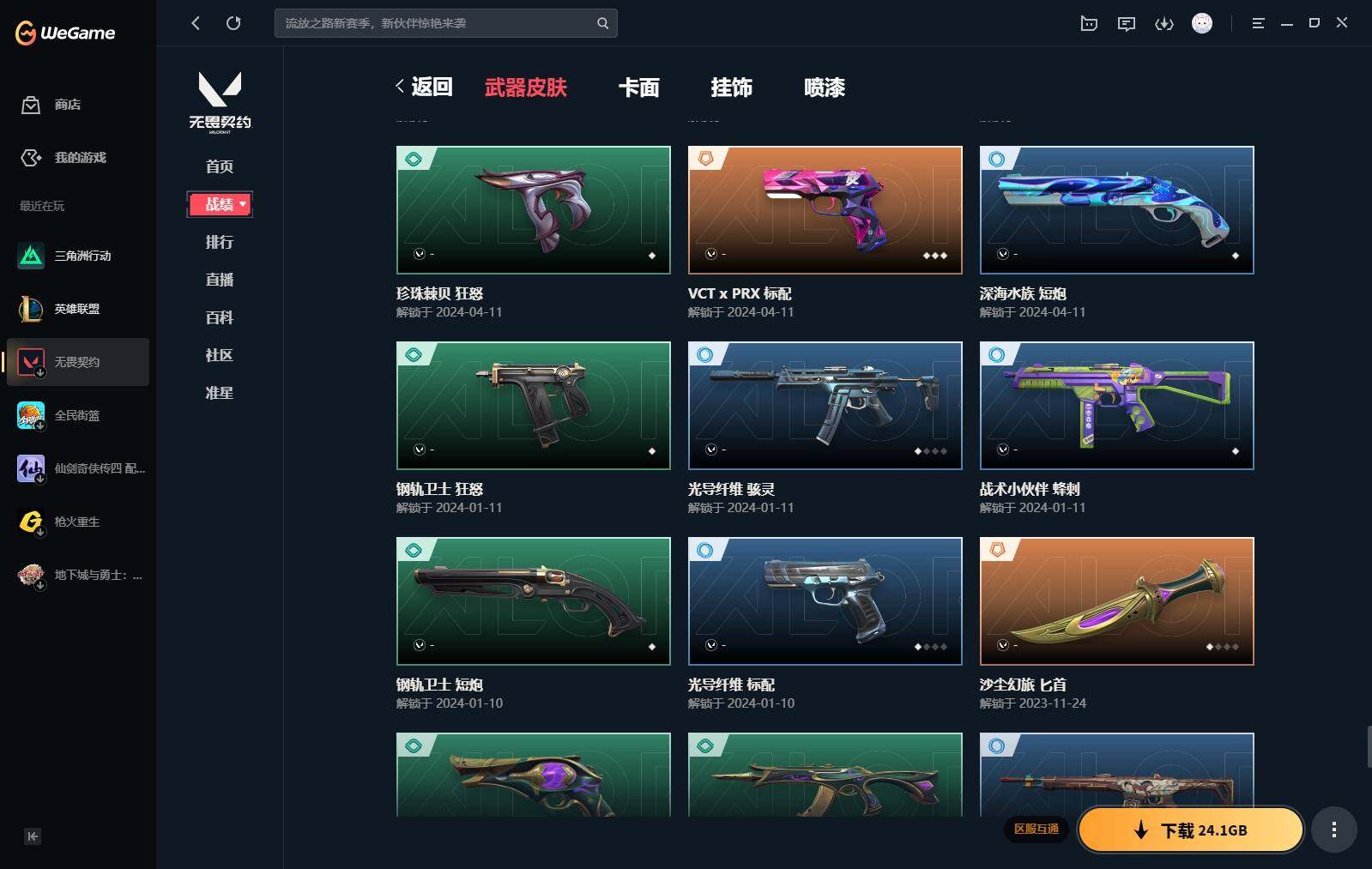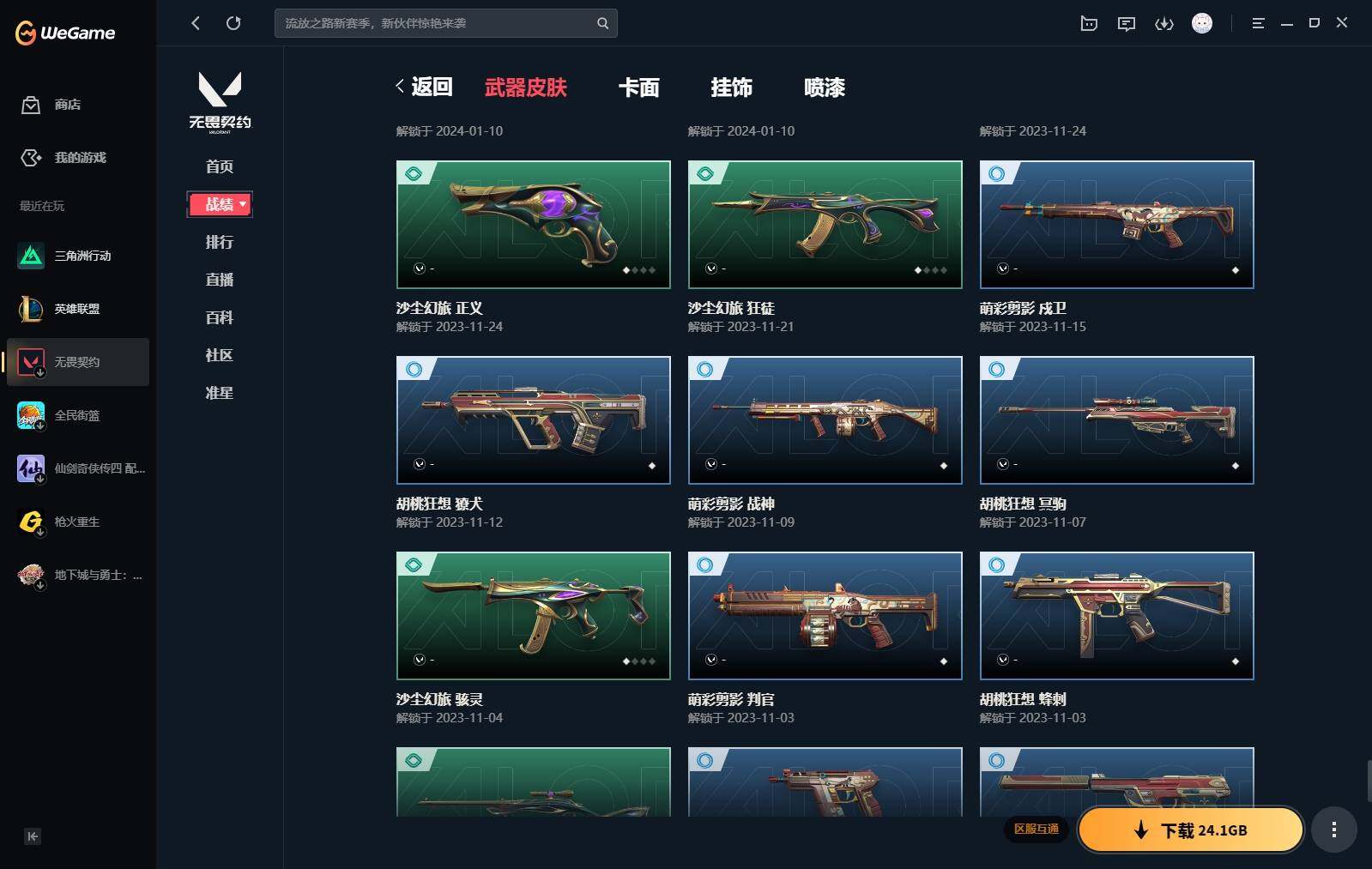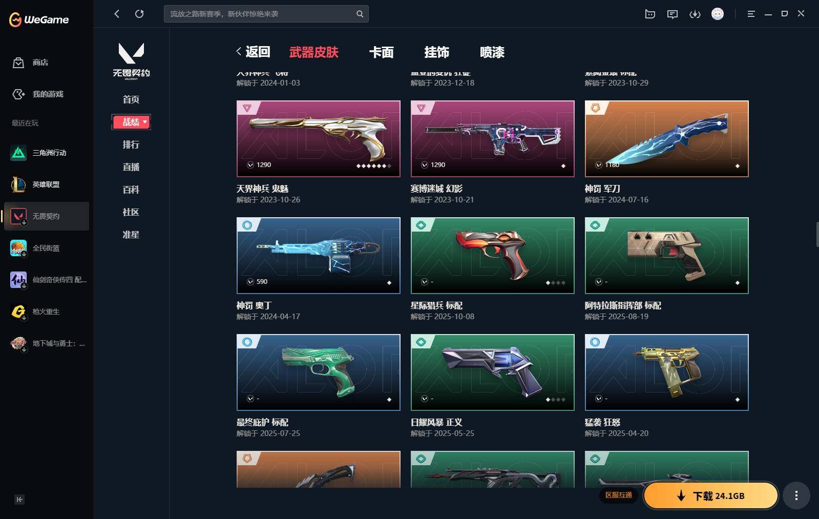 【440】【套装】:2024全球冠军赛套装,源能者娱乐系统套装,艾沃莉的梦之翼套装,塑水宗套装,千灵华绽套装,奇点//2.0套装,机动狂飙套装,vctxedg 队伍套装,回火礼包:奇点套装,般若假面套装 【英雄】:幻棱,炼狱,维斯,暮蝶,钛狐,壹决,铁臂,捷风,雷兹,幽影,不死鸟,贤者,猎枭,蝰蛇,零,芮娜,奇乐,尚勃勒,霓虹,斯凯,夜露,星礈,k/o,海神,盖可,黑梦,钢锁 【近战 武器】:近战武器-2024全球冠军赛 战刀,近战武器-侦察力量 蝴蝶刀,近战武器-剥皮小刀,近战武器-奇点//2.0 蝴蝶刀,近战武器-rgx 11z pro//3.0 爪刀,近战武器-黑波之刃,近战武器-落英飞旋,近战武器-镭切,近战武器-艾沃莉的魔法棒,近战武器-澄湖潋滟,近战武器-珍珠棘贝 短剑,近战武器-般若长牙,近战武器-流星兵团 短剑,近战武器-超能偶像 应援棒,近战武器-超限闪存 匕首,近战武器-机动狂飙 战刀,近战武器-街机高手,近战武器-沙尘幻旅 匕首,近战武器-神罚 军刀,近战武器-雪季巡游,近战武器-诡秘蛇影 军刀,近战武器-神圣领域 战刀 【狂徒】:狂徒-艾沃莉的梦之翼,狂徒-光明哨兵,狂徒-归零者,狂徒-混沌序曲,狂徒-机动狂飙,狂徒-奇点//2.0,狂徒-塑水宗,狂徒-掠影,狂徒-盖亚的复仇,狂徒-海洋之星,狂徒-紫阙金琅,狂徒-超能偶像,狂徒-流星兵团,狂徒-沙尘幻旅,狂徒-诡秘蛇影 【幻影】:幻影-源能者娱乐系统,幻影-2024全球冠军赛,幻影-砰砰x特攻队,幻影-奇点,幻影-千灵华绽,幻影-般若假面,幻影-赛博迷城,幻影-侦察力量,幻影-超限闪存,幻影-珍珠棘贝,幻影-神圣领域,幻影-聚合之力,幻影-末日之翼 【戍卫】:戍卫-般若假面,戍卫-天界神兵,戍卫-紫阙金琅,戍卫-超能偶像,戍卫-珍珠棘贝,戍卫-浮光跃金,戍卫-萌彩剪影,戍卫-战术熊与伙伴们,戍卫-月球哨兵,戍卫-折光棱晶 【獠犬】:獠犬-源能者娱乐系统,獠犬-全息波普,獠犬-神圣领域,獠犬-采蜜小蜂队,獠犬-复古浪潮,獠犬-胡桃狂想,獠犬-模拟赫兹 【冥驹】:冥驹-源能者娱乐系统,冥驹-归零者,冥驹-千灵华绽,冥驹-复古浪潮,冥驹-胡桃狂想,冥驹-模拟赫兹,冥驹-星云暗涌 【飞将】:飞将-塑水宗,飞将-天界神兵,飞将-沙尘幻旅,飞将-聚合之力,飞将-战术熊与伙伴们,飞将-末日之翼 【莽侠】:莽侠-超限闪存,莽侠-诡秘蛇影,莽侠-深海水族,莽侠-纤云弄巧,莽侠-月球哨兵 【战神】:战神-神圣领域,战神-采蜜小蜂队,战神-浮光跃金,战神-萌彩剪影,战神-深海水族 【奥丁】:奥丁-艾沃莉的梦之翼,奥丁-全息波普,奥丁-流星兵团,奥丁-神罚,奥丁-末日之翼 【判官】:判官-千灵华绽,判官-超能偶像,判官-诡秘蛇影,判官-采蜜小蜂队,判官-萌彩剪影 【雄鹿】:雄鹿-机动狂飙,雄鹿-般若假面,雄鹿-复古浪潮,雄鹿-模拟赫兹,雄鹿-月球哨兵 【骇灵】:骇灵-艾沃莉的梦之翼,骇灵-奇点,骇灵-塑水宗,骇灵-流星兵团,骇灵-沙尘幻旅,骇灵-珍珠棘贝,骇灵-浮光跃金,骇灵-光导纤维,骇灵-星云暗涌 【蜂刺】:蜂刺-机动狂飙,蜂刺-超限闪存,蜂刺-胡桃狂想,蜂刺-聚合之力,蜂刺-深海水族,蜂刺-纤云弄巧,蜂刺-战术小伙伴,蜂刺-星云暗涌,蜂刺-折光棱晶 【标配】:标配-紫阙金琅,标配-超能偶像,标配-浮光跃金,标配-钢铁意志,标配-光导纤维,标配-决意,标配-战术熊与伙伴们,标配-最终庇护,标配-折光棱晶 【vct手呛】:标配-vct x edg,标配-vct x prx,标配-vct25 x blg 【正义】:正义-机动狂飙,正义-奇点,正义-千灵华绽,正义-塑水宗,正义-离子武器,正义-超限闪存,正义-沙尘幻旅,正义-复古浪潮,正义-纳米打击,正义-纤云弄巧,正义-游戏结束,正义-月球哨兵 【鬼魅】:鬼魅-艾沃莉的梦之翼,鬼魅-源能者娱乐系统,鬼魅-奇点//2.0,鬼魅-天界神兵,鬼魅-流星兵团,鬼魅-诡秘蛇影,鬼魅-采蜜小蜂队,鬼魅-胡桃狂想,鬼魅-模拟赫兹,鬼魅-扑棱扑棱,鬼魅-星云暗涌 【狂怒】:狂怒-钢轨卫士,狂怒-珍珠棘贝,狂怒-神圣领域,狂怒-聚合之力,狂怒-萌彩剪影,狂怒-猛袭,狂怒-战术熊与伙伴们 【短炮】:短炮-般若假面,短炮-钢轨卫士,短炮-好搭档,短炮-深海水族,短炮-纤云弄巧,短炮-末日之翼 【卡面】:终章:激斗汉堡 卡面,进入射程 卡面,《双城之战》拥抱 卡面,精灵大战 卡面,欢迎来到底城 卡面,南瓜盛典 卡面,唱片的故事 卡面,钢弓与箭弦 卡面,无畏契约:暮蝶 卡面,排除故障 卡面,奇点//2.0 卡面,战术桌游 卡面,悠享食光 卡面,修车达人 卡面,热舞环节 卡面,模拟赫兹 卡面,浮光跃金 卡面,超限闪存 卡面,维斯工牌 卡面,正义的化身 卡面,终章:生意人麦宝 卡面,铁之华 卡面,2024全球冠军赛 卡面,失而复得 卡面,时间到 卡面,最高舞台 卡面,复活专家 卡面,归乡 // 蝰蛇 卡面,超能偶像 卡面,生意人麦宝 卡面,音熊登场 卡面,声感陷阱设计图 卡面,红鳞松叶 卡面,霓帧牛蛙 卡面,钢锁工牌 卡面,战术小伙伴的夏日 卡面,采蜜小蜂队 卡面,聚合之力 卡面,梦幻奶茶 卡面,终章:打造专属狂徒 卡面,趁热吃 卡面,西装暴徒 卡面,失控边缘 卡面,哨卫者之领域 卡面,暮蝶工牌 卡面,战术熊与伙伴们 卡面,源能反应 卡面,流星兵团 卡面,纤云弄巧 卡面,暂别喧嚣 卡面,打造专属狂徒 卡面,零点嗅探设计图 卡面,表象之下 卡面,虹吸式咖啡壶 卡面,源能者美容 卡面,脚踝终结者 卡面 ,夜班 卡面,瓦娃脸雪糕 卡面 ,沙雕爆能器 卡面,深海水族 卡面,珍珠棘贝 卡面,复古浪潮 卡面,盖可工牌 卡面,清除名单 卡面,《双城之战》金克丝 卡面,没有什么能逃过我的眼睛 卡面,光导纤维 卡面,战术小伙伴 卡面,钢轨卫士 
