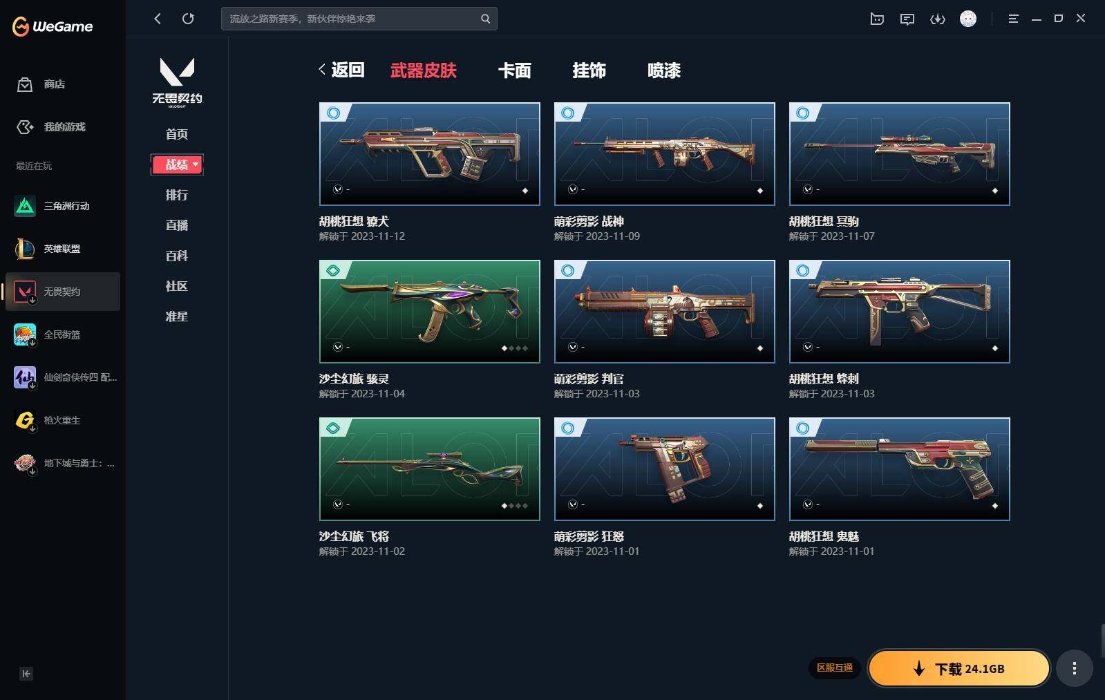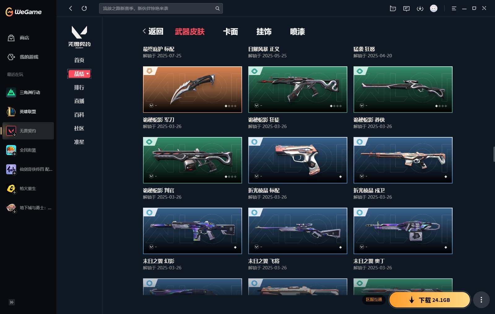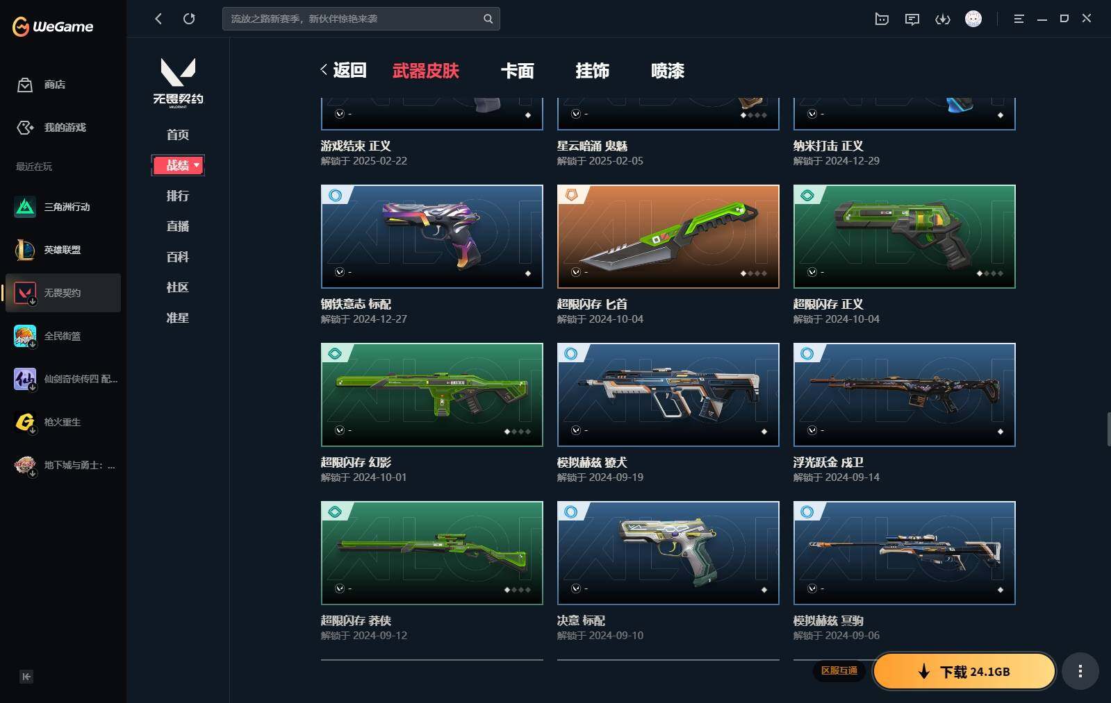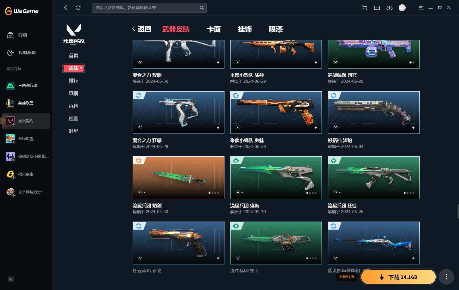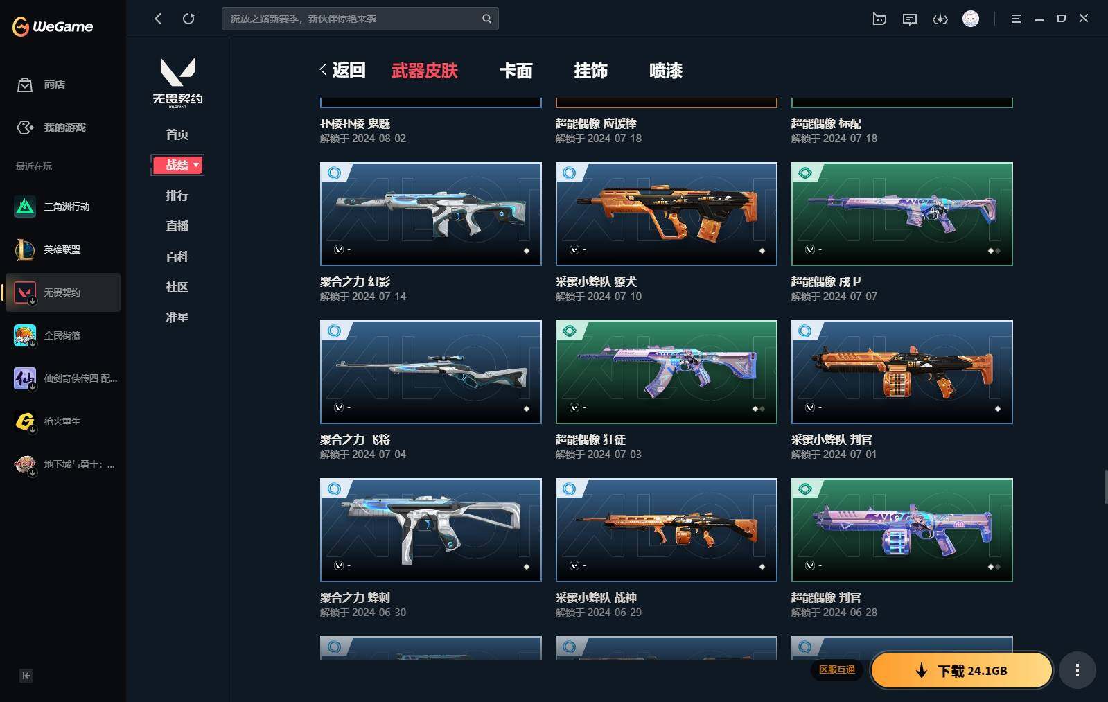 【440】【套装】:2024全球冠军赛套装,源能者娱乐系统套装,艾沃莉的梦之翼套装,塑水宗套装,千灵华绽套装,奇点//2.0套装,机动狂飙套装,vctxedg 队伍套装,回火礼包:奇点套装,般若假面套装 【英雄】:幻棱,炼狱,维斯,暮蝶,钛狐,壹决,铁臂,捷风,雷兹,幽影,不死鸟,贤者,猎枭,蝰蛇,零,芮娜,奇乐,尚勃勒,霓虹,斯凯,夜露,星礈,k/o,海神,盖可,黑梦,钢锁 【近战 武器】:近战武器-2024全球冠军赛 战刀,近战武器-侦察力量 蝴蝶刀,近战武器-剥皮小刀,近战武器-奇点//2.0 蝴蝶刀,近战武器-rgx 11z pro//3.0 爪刀,近战武器-黑波之刃,近战武器-落英飞旋,近战武器-镭切,近战武器-艾沃莉的魔法棒,近战武器-澄湖潋滟,近战武器-珍珠棘贝 短剑,近战武器-般若长牙,近战武器-流星兵团 短剑,近战武器-超能偶像 应援棒,近战武器-超限闪存 匕首,近战武器-机动狂飙 战刀,近战武器-街机高手,近战武器-沙尘幻旅 匕首,近战武器-神罚 军刀,近战武器-雪季巡游,近战武器-诡秘蛇影 军刀,近战武器-神圣领域 战刀 【狂徒】:狂徒-艾沃莉的梦之翼,狂徒-光明哨兵,狂徒-归零者,狂徒-混沌序曲,狂徒-机动狂飙,狂徒-奇点//2.0,狂徒-塑水宗,狂徒-掠影,狂徒-盖亚的复仇,狂徒-海洋之星,狂徒-紫阙金琅,狂徒-超能偶像,狂徒-流星兵团,狂徒-沙尘幻旅,狂徒-诡秘蛇影 【幻影】:幻影-源能者娱乐系统,幻影-2024全球冠军赛,幻影-砰砰x特攻队,幻影-奇点,幻影-千灵华绽,幻影-般若假面,幻影-赛博迷城,幻影-侦察力量,幻影-超限闪存,幻影-珍珠棘贝,幻影-神圣领域,幻影-聚合之力,幻影-末日之翼 【戍卫】:戍卫-般若假面,戍卫-天界神兵,戍卫-紫阙金琅,戍卫-超能偶像,戍卫-珍珠棘贝,戍卫-浮光跃金,戍卫-萌彩剪影,戍卫-战术熊与伙伴们,戍卫-月球哨兵,戍卫-折光棱晶 【獠犬】:獠犬-源能者娱乐系统,獠犬-全息波普,獠犬-神圣领域,獠犬-采蜜小蜂队,獠犬-复古浪潮,獠犬-胡桃狂想,獠犬-模拟赫兹 【冥驹】:冥驹-源能者娱乐系统,冥驹-归零者,冥驹-千灵华绽,冥驹-复古浪潮,冥驹-胡桃狂想,冥驹-模拟赫兹,冥驹-星云暗涌 【飞将】:飞将-塑水宗,飞将-天界神兵,飞将-沙尘幻旅,飞将-聚合之力,飞将-战术熊与伙伴们,飞将-末日之翼 【莽侠】:莽侠-超限闪存,莽侠-诡秘蛇影,莽侠-深海水族,莽侠-纤云弄巧,莽侠-月球哨兵 【战神】:战神-神圣领域,战神-采蜜小蜂队,战神-浮光跃金,战神-萌彩剪影,战神-深海水族 【奥丁】:奥丁-艾沃莉的梦之翼,奥丁-全息波普,奥丁-流星兵团,奥丁-神罚,奥丁-末日之翼 【判官】:判官-千灵华绽,判官-超能偶像,判官-诡秘蛇影,判官-采蜜小蜂队,判官-萌彩剪影 【雄鹿】:雄鹿-机动狂飙,雄鹿-般若假面,雄鹿-复古浪潮,雄鹿-模拟赫兹,雄鹿-月球哨兵 【骇灵】:骇灵-艾沃莉的梦之翼,骇灵-奇点,骇灵-塑水宗,骇灵-流星兵团,骇灵-沙尘幻旅,骇灵-珍珠棘贝,骇灵-浮光跃金,骇灵-光导纤维,骇灵-星云暗涌 【蜂刺】:蜂刺-机动狂飙,蜂刺-超限闪存,蜂刺-胡桃狂想,蜂刺-聚合之力,蜂刺-深海水族,蜂刺-纤云弄巧,蜂刺-战术小伙伴,蜂刺-星云暗涌,蜂刺-折光棱晶 【标配】:标配-紫阙金琅,标配-超能偶像,标配-浮光跃金,标配-钢铁意志,标配-光导纤维,标配-决意,标配-战术熊与伙伴们,标配-最终庇护,标配-折光棱晶 【vct手呛】:标配-vct x edg,标配-vct x prx,标配-vct25 x blg 【正义】:正义-机动狂飙,正义-奇点,正义-千灵华绽,正义-塑水宗,正义-离子武器,正义-超限闪存,正义-沙尘幻旅,正义-复古浪潮,正义-纳米打击,正义-纤云弄巧,正义-游戏结束,正义-月球哨兵 【鬼魅】:鬼魅-艾沃莉的梦之翼,鬼魅-源能者娱乐系统,鬼魅-奇点//2.0,鬼魅-天界神兵,鬼魅-流星兵团,鬼魅-诡秘蛇影,鬼魅-采蜜小蜂队,鬼魅-胡桃狂想,鬼魅-模拟赫兹,鬼魅-扑棱扑棱,鬼魅-星云暗涌 【狂怒】:狂怒-钢轨卫士,狂怒-珍珠棘贝,狂怒-神圣领域,狂怒-聚合之力,狂怒-萌彩剪影,狂怒-猛袭,狂怒-战术熊与伙伴们 【短炮】:短炮-般若假面,短炮-钢轨卫士,短炮-好搭档,短炮-深海水族,短炮-纤云弄巧,短炮-末日之翼 【卡面】:终章:激斗汉堡 卡面,进入射程 卡面,《双城之战》拥抱 卡面,精灵大战 卡面,欢迎来到底城 卡面,南瓜盛典 卡面,唱片的故事 卡面,钢弓与箭弦 卡面,无畏契约:暮蝶 卡面,排除故障 卡面,奇点//2.0 卡面,战术桌游 卡面,悠享食光 卡面,修车达人 卡面,热舞环节 卡面,模拟赫兹 卡面,浮光跃金 卡面,超限闪存 卡面,维斯工牌 卡面,正义的化身 卡面,终章:生意人麦宝 卡面,铁之华 卡面,2024全球冠军赛 卡面,失而复得 卡面,时间到 卡面,最高舞台 卡面,复活专家 卡面,归乡 // 蝰蛇 卡面,超能偶像 卡面,生意人麦宝 卡面,音熊登场 卡面,声感陷阱设计图 卡面,红鳞松叶 卡面,霓帧牛蛙 卡面,钢锁工牌 卡面,战术小伙伴的夏日 卡面,采蜜小蜂队 卡面,聚合之力 卡面,梦幻奶茶 卡面,终章:打造专属狂徒 卡面,趁热吃 卡面,西装暴徒 卡面,失控边缘 卡面,哨卫者之领域 卡面,暮蝶工牌 卡面,战术熊与伙伴们 卡面,源能反应 卡面,流星兵团 卡面,纤云弄巧 卡面,暂别喧嚣 卡面,打造专属狂徒 卡面,零点嗅探设计图 卡面,表象之下 卡面,虹吸式咖啡壶 卡面,源能者美容 卡面,脚踝终结者 卡面 ,夜班 卡面,瓦娃脸雪糕 卡面 ,沙雕爆能器 卡面,深海水族 卡面,珍珠棘贝 卡面,复古浪潮 卡面,盖可工牌 卡面,清除名单 卡面,《双城之战》金克丝 卡面,没有什么能逃过我的眼睛 卡面,光导纤维 卡面,战术小伙伴 卡面,钢轨卫士 