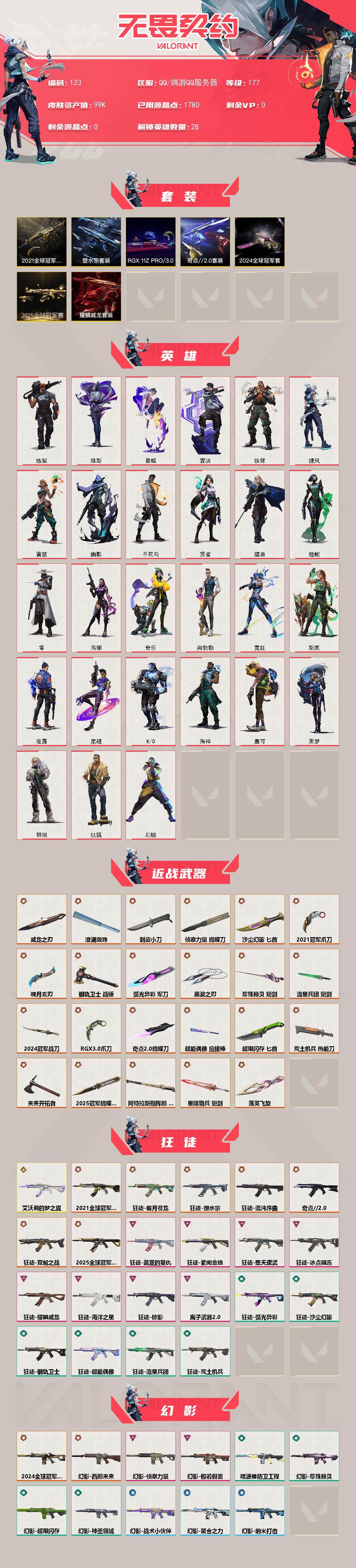 【123】xl32896 【套装】:2025全球冠军赛套装,2024全球冠军赛套装,2021全球冠军赛套装,西部未来套装,rgx 11z pro//3.0套装,塑水宗套装,奇点//2.0套装,耀鳞威龙套装 【英雄】:幻棱,炼狱,维斯,暮蝶,钛狐,壹决,铁臂,捷风,雷兹,幽影,不死鸟,贤者,猎枭,蝰蛇,零,芮娜,奇乐,尚勃勒,霓虹,斯凯,夜露,星礈,k/o,海神,盖可,黑梦,钢锁 【近战 武器】:近战武器-2025全球冠军赛 蝴蝶刀,近战武器-2024全球冠军赛 战刀,近战武器-2021全球冠军赛 爪刀,近战武器-侦察力量 蝴蝶刀,近战武器-剥皮小刀,近战武器-奇点//2.0 蝴蝶刀,近战武器-rgx 11z pro//3.0 爪刀,近战武器-黑波之刃,近战武器-落英飞旋,近战武器-威龙之刃,近战武器-澄湖潋滟,近战武器-未来开拓者,近战武器-珍珠棘贝 短剑,近战武器-流星兵团 短剑,近战武器-超能偶像 应援棒,近战武器-超限闪存 匕首,近战武器-钢轨卫士 战锤,近战武器-弧光异彩 军刀,近战武器-荒土机兵 热能刀,近战武器-魄月玄刃,近战武器-沙尘幻旅 匕首,近战武器-阿特拉斯指挥部 甩棍,近战武器-星际猎兵 短剑 【狂徒】:狂徒-艾沃莉的梦之翼,狂徒-2025全球冠军赛,狂徒-2021全球冠军赛,狂徒-混沌序曲,狂徒-奇点//2.0,狂徒-双城之战,狂徒-塑水宗,狂徒-偃月苍龙,狂徒-冰点凝冻,狂徒-堕天遗武,狂徒-掠影,狂徒-盖亚的复仇,狂徒-海洋之星,狂徒-耀鳞威龙,狂徒-紫阙金琅,狂徒-离子武器//2.0,狂徒-超能偶像,狂徒-钢轨卫士,狂徒-弧光异彩,狂徒-荒土机兵,狂徒-流星兵团,狂徒-沙尘幻旅 【幻影】:幻影-2024全球冠军赛,幻影-西部未来,幻影-般若假面,幻影-侦察力量,幻影-超限闪存,幻影-噬源兽防卫工程,幻影-珍珠棘贝,幻影-神圣领域,幻影-聚合之力,幻影-纳米打击,幻影-战术小伙伴,幻影-西部未来 【戍卫】:戍卫-破败军械,戍卫-超能偶像,戍卫-钢轨卫士,戍卫-珍珠棘贝,戍卫-彩梦之城,戍卫-浮光跃金,戍卫-萌彩剪影,戍卫-逆冲蛮牛,戍卫-沙场老兵,戍卫-战术熊与伙伴们,戍卫-月球哨兵 【獠犬】:獠犬-781-a协议,獠犬-弧光异彩,獠犬-神圣领域,獠犬-采蜜小蜂队,獠犬-复古浪潮,獠犬-胡桃狂想,獠犬-模拟赫兹,獠犬-逆冲蛮牛,獠犬-战术小伙伴 【冥驹】:冥驹-归零者,冥驹-偃月苍龙,冥驹-堕天遗武,冥驹-荒土机兵,冥驹-复古浪潮,冥驹-胡桃狂想,冥驹-模拟赫兹 【飞将】:飞将-塑水宗,飞将-西部未来,飞将-沙尘幻旅,飞将-聚合之力,飞将-信手涂鸦,飞将-光导纤维,飞将-战术熊与伙伴们 【莽侠】:莽侠-rgx 11z pro//3.0,莽侠-超限闪存,莽侠-深海水族,莽侠-纤云弄巧,莽侠-月球哨兵 【战神】:战神-奇点,战神-神圣领域,战神-采蜜小蜂队,战神-浮光跃金,战神-萌彩剪影,战神-深海水族 【奥丁】:奥丁-西部未来,奥丁-流星兵团,奥丁-纳米打击,奥丁-信手涂鸦,奥丁-战术小伙伴 【判官】:判官-偃月苍龙,判官-超能偶像,判官-采蜜小蜂队,判官-萌彩剪影,判官-纳米打击x 【雄鹿】:雄鹿-彩梦之城,雄鹿-复古浪潮,雄鹿-模拟赫兹,雄鹿-逆冲蛮牛,雄鹿-月球哨兵 【骇灵】:骇灵-塑水宗,骇灵-荒土机兵,骇灵-流星兵团,骇灵-沙尘幻旅,骇灵-珍珠棘贝,骇灵-浮光跃金,骇灵-光导纤维,骇灵-信手涂鸦,骇灵-星云暗涌 【蜂刺】:蜂刺-超限闪存,蜂刺-弧光异彩,蜂刺-胡桃狂想,蜂刺-聚合之力,蜂刺-深海水族,蜂刺-纤云弄巧,蜂刺-战术小伙伴,蜂刺-星云暗涌 【标配】:标配-超能偶像,标配-荒土机兵,标配-彩梦之城,标配-浮光跃金,标配-光导纤维,标配-战术熊与伙伴们 【vct手呛】:标配-vct x nrg 【正义】:正义-rgx 11z pro//3.0,正义-塑水宗,正义-西部未来,正义-超限闪存,正义-沙尘幻旅,正义-复古浪潮,正义-纳米打击,正义-纤云弄巧,正义-月球哨兵 【鬼魅】:鬼魅-破败军械,鬼魅-奇点//2.0,鬼魅-耀鳞威龙,鬼魅-流星兵团,鬼魅-采蜜小蜂队,鬼魅-光导纤维,鬼魅-胡桃狂想,鬼魅-模拟赫兹,鬼魅-信手涂鸦 【狂怒】:狂怒-钢轨卫士,狂怒-珍珠棘贝,狂怒-神圣领域,狂怒-聚合之力,狂怒-萌彩剪影,狂怒-逆冲蛮牛,狂怒-战术熊与伙伴们 【短炮】:短炮-钢轨卫士,短炮-弧光异彩,短炮-深海水族,短炮-纤云弄巧 【卡面】:终章:激斗汉堡 卡面,进入射程 卡面,分崩离析 卡面,纳米打击 卡面,抑制技术 卡面,激斗汉堡 卡面,瓦娃脸雪糕 p2 卡面,从黄昏到黎明 卡面,荒土机兵 卡面,银弹猎手 卡面,逆冲蛮牛 卡面,《双城之战》拥抱 卡面,精灵大战 卡面,欢迎来到底城 卡面,南瓜盛典 卡面,vct cn首冠 卡面,唱片的故事 卡面,钢弓与箭弦 卡面,排除故障 卡面,奇点//2.0 卡面,战术桌游 卡面,悠享食光 卡面,修车达人 卡面,热舞环节 卡面,模拟赫兹 卡面,浮光跃金 卡面,超限闪存 卡面,维斯工牌 卡面,正义的化身 卡面,终章:生意人麦宝 卡面,铁之华 卡面,2024全球冠军赛 卡面,失而复得 卡面,时间到 卡面,最高舞台 卡面,复活专家 卡面,归乡 // 蝰蛇 卡面,rgx 11z pro//3.0 卡面,超能偶像 卡面,生意人麦宝 卡面,音熊登场 卡面,先瓦为敬 银色 卡面,声感陷阱设计图 卡面,红鳞松叶 卡面,clutch 卡面,霓帧牛蛙 卡面,钢锁工牌 卡面,战术小伙伴的夏日 卡面,采蜜小蜂队 卡面,聚合之力 卡面,梦幻奶茶 卡面,终章:打造专属狂徒 卡面,趁热吃 卡面,西装暴徒 卡面,失控边缘 卡面,哨卫者之领域 卡面,暮蝶工牌 卡面,战术熊与伙伴们 卡面,源能反应 卡面,流星兵团 卡面,纤云弄巧 卡面,暂别喧嚣 卡面,打造专属狂徒 卡面,零点嗅探设计图 卡面,终章:瓦娃脸雪糕 卡面,表象之下 卡面,虹吸式咖啡壶 卡面,源能者美容 卡面,脚踝终结者 