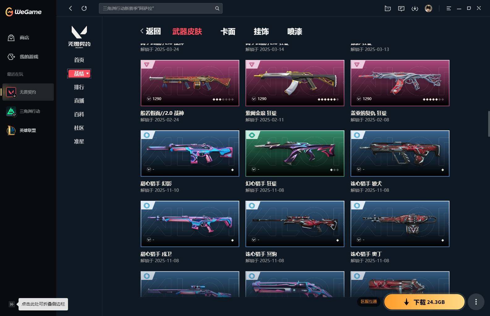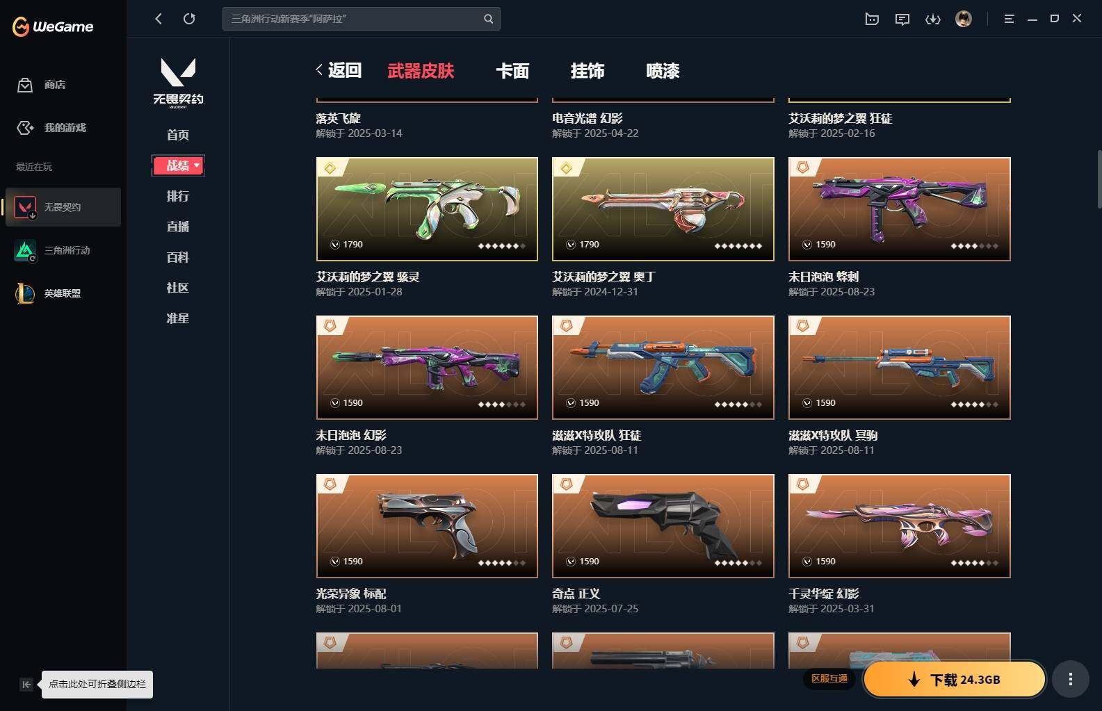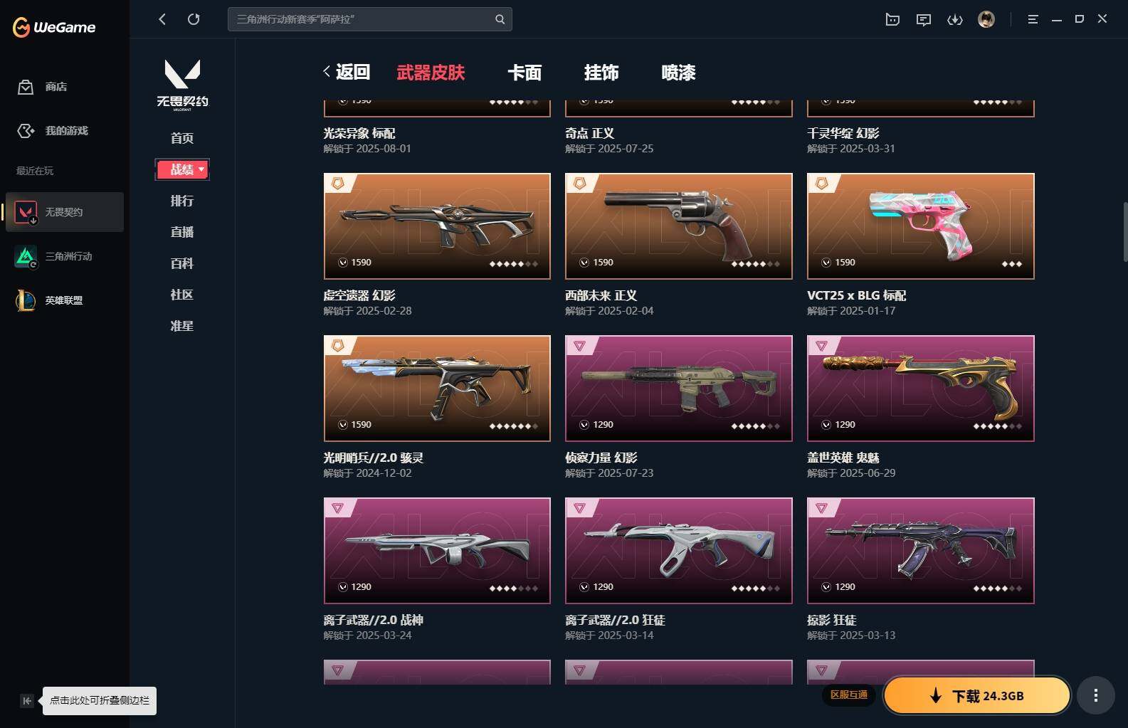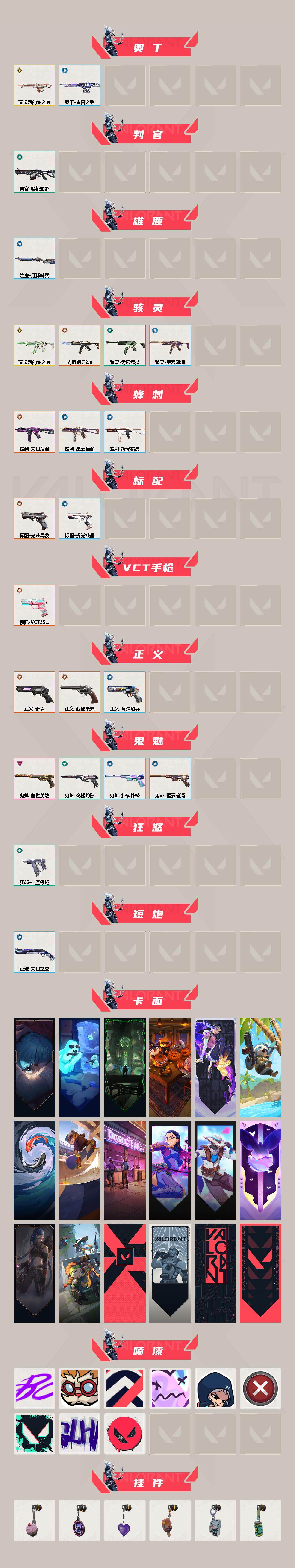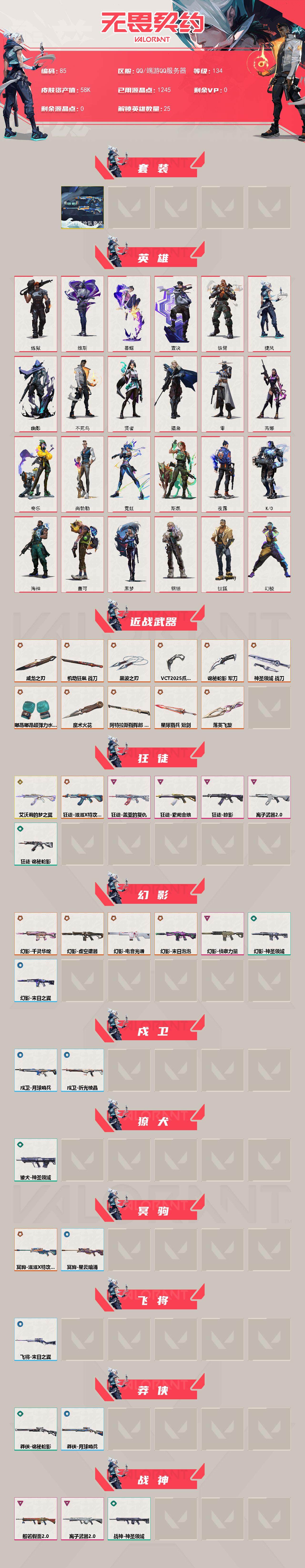 【85】xl15119 【套装】:滋滋x特攻队套装,vct 2025 赛季套装 【英雄】:幻棱,炼狱,维斯,暮蝶,钛狐,壹决,铁臂,捷风,幽影,不死鸟,贤者,猎枭,零,芮娜,奇乐,尚勃勒,霓虹,斯凯,夜露,k/o,海神,盖可,黑梦,钢锁 【近战 武器】:近战武器-魔术火花,近战武器-嘟昂嘟昂超弹力水球拳套,近战武器-vct 2025 爪刀,近战武器-黑波之刃,近战武器-落英飞旋,近战武器-威龙之刃,近战武器-机动狂飙 战刀,近战武器-诡秘蛇影 军刀,近战武器-神圣领域 战刀,近战武器-阿特拉斯指挥部 甩棍,近战武器-星际猎兵 短剑,近战武器-魔术火花 【狂徒】:狂徒-艾沃莉的梦之翼,狂徒-滋滋x特攻队,狂徒-掠影,狂徒-盖亚的复仇,狂徒-紫阙金琅,狂徒-离子武器//2.0,狂徒-诡秘蛇影 【幻影】:幻影-千灵华绽,幻影-虚空遗器,幻影-电音光谱,幻影-末日泡泡,幻影-侦察力量,幻影-神圣领域,幻影-末日之翼,幻影-电音光谱 【戍卫】:戍卫-月球哨兵,戍卫-折光棱晶 【獠犬】:獠犬-神圣领域 【冥驹】:冥驹-滋滋x特攻队,冥驹-星云暗涌 【飞将】:飞将-末日之翼 【莽侠】:莽侠-诡秘蛇影,莽侠-月球哨兵 【战神】:战神-般若假面//2.0,战神-离子武器//2.0,战神-神圣领域 【奥丁】:奥丁-艾沃莉的梦之翼,奥丁-末日之翼 【判官】:判官-诡秘蛇影 【雄鹿】:雄鹿-月球哨兵 【骇灵】:骇灵-艾沃莉的梦之翼,骇灵-光明哨兵//2.0,骇灵-无限竞技,骇灵-星云暗涌 【蜂刺】:蜂刺-末日泡泡,蜂刺-星云暗涌,蜂刺-折光棱晶 【标配】:标配-光荣异象,标配-折光棱晶 【vct手呛】:标配-vct25 x blg 【正义】:正义-奇点,正义-西部未来,正义-月球哨兵 【鬼魅】:鬼魅-盖世英雄,鬼魅-诡秘蛇影,鬼魅-扑棱扑棱,鬼魅-星云暗涌 【狂怒】:狂怒-神圣领域 【短炮】:短炮-末日之翼 【卡面】:《双城之战》拥抱 卡面,精灵大战 卡面,欢迎来到底城 卡面,南瓜盛典 卡面,无畏契约:暮蝶 卡面,树懒大作战 卡面,红鳞松叶 卡面,clutch 卡面,梦幻奶茶 卡面,无畏契约go!第一卷:芮娜 卡面,无畏契约go!第一卷:零 卡面,化茧成蝶 卡面,《双城之战》金克丝 卡面,别冒尖 卡面,代号红色 卡面,新兵报到 卡面,v契约 卡面,无畏契约 卡面 【喷漆】:嘭! 喷漆,都算到了 喷漆,控场勿近 喷漆,伤心心 喷漆,捷风差距 喷漆,买装还是存钱 喷漆,胜利属于无畏契约 喷漆,glhf 喷漆,无畏契约 喷漆 【挂饰】:《双城之战》小蛋糕 挂饰,第九季//第三幕 纪念币 挂饰,薰衣草之心 挂饰,炼狱雪糕 挂饰,袖珍捷风 挂饰,z世代特饮 挂饰,天外飞客 挂饰,红鳞松叶 挂饰,《双城之战》魄罗 挂饰,无畏契约 纪念币 挂饰