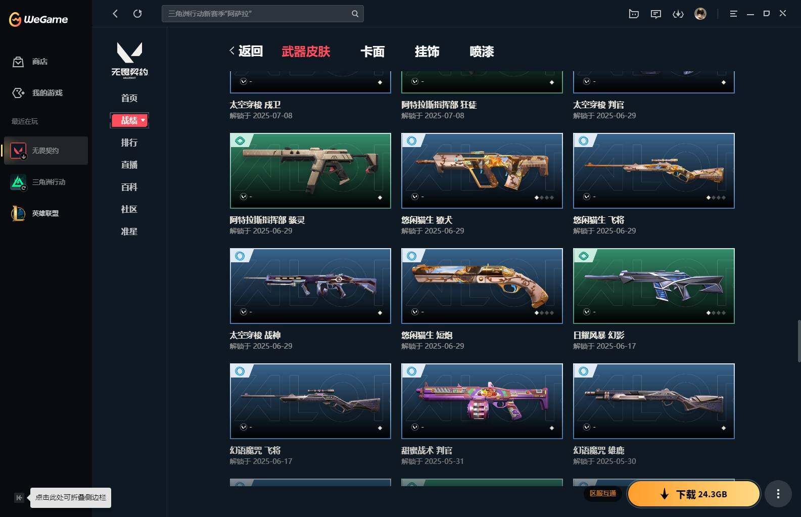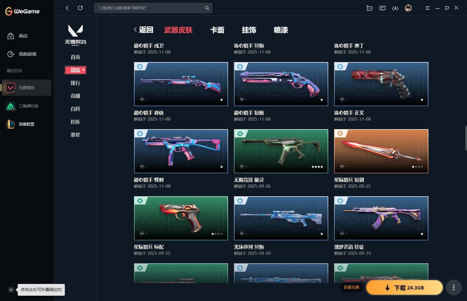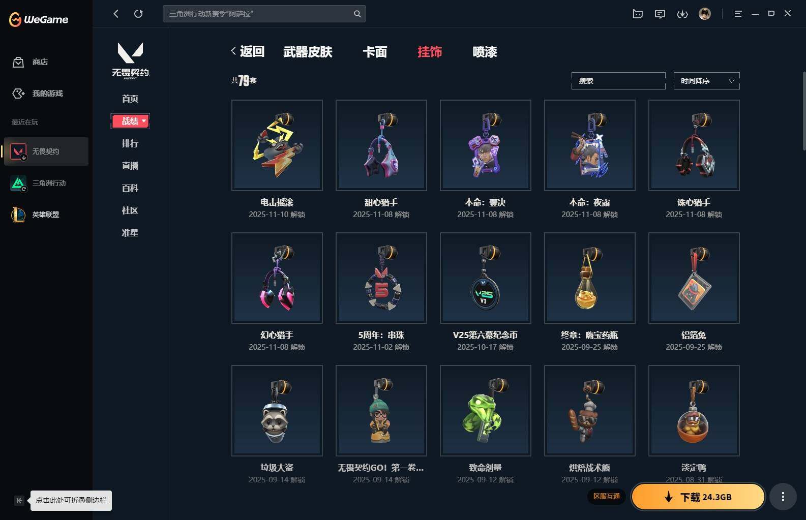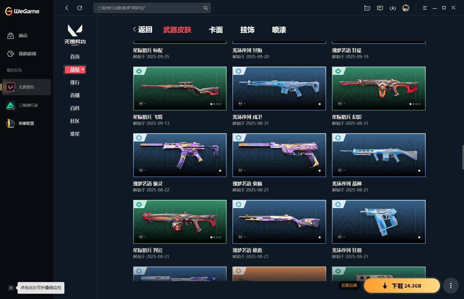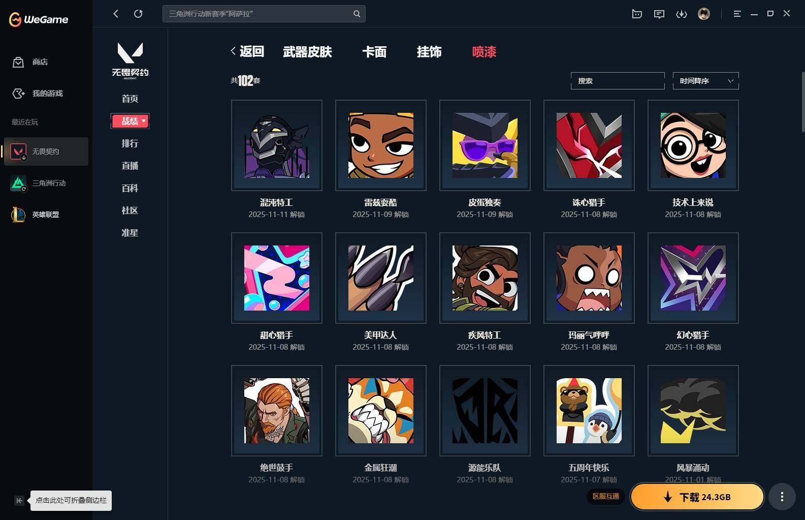 【85】xl15119 【套装】:滋滋x特攻队套装,vct 2025 赛季套装 【英雄】:幻棱,炼狱,维斯,暮蝶,钛狐,壹决,铁臂,捷风,幽影,不死鸟,贤者,猎枭,零,芮娜,奇乐,尚勃勒,霓虹,斯凯,夜露,k/o,海神,盖可,黑梦,钢锁 【近战 武器】:近战武器-魔术火花,近战武器-嘟昂嘟昂超弹力水球拳套,近战武器-vct 2025 爪刀,近战武器-黑波之刃,近战武器-落英飞旋,近战武器-威龙之刃,近战武器-机动狂飙 战刀,近战武器-诡秘蛇影 军刀,近战武器-神圣领域 战刀,近战武器-阿特拉斯指挥部 甩棍,近战武器-星际猎兵 短剑,近战武器-魔术火花 【狂徒】:狂徒-艾沃莉的梦之翼,狂徒-滋滋x特攻队,狂徒-掠影,狂徒-盖亚的复仇,狂徒-紫阙金琅,狂徒-离子武器//2.0,狂徒-诡秘蛇影 【幻影】:幻影-千灵华绽,幻影-虚空遗器,幻影-电音光谱,幻影-末日泡泡,幻影-侦察力量,幻影-神圣领域,幻影-末日之翼,幻影-电音光谱 【戍卫】:戍卫-月球哨兵,戍卫-折光棱晶 【獠犬】:獠犬-神圣领域 【冥驹】:冥驹-滋滋x特攻队,冥驹-星云暗涌 【飞将】:飞将-末日之翼 【莽侠】:莽侠-诡秘蛇影,莽侠-月球哨兵 【战神】:战神-般若假面//2.0,战神-离子武器//2.0,战神-神圣领域 【奥丁】:奥丁-艾沃莉的梦之翼,奥丁-末日之翼 【判官】:判官-诡秘蛇影 【雄鹿】:雄鹿-月球哨兵 【骇灵】:骇灵-艾沃莉的梦之翼,骇灵-光明哨兵//2.0,骇灵-无限竞技,骇灵-星云暗涌 【蜂刺】:蜂刺-末日泡泡,蜂刺-星云暗涌,蜂刺-折光棱晶 【标配】:标配-光荣异象,标配-折光棱晶 【vct手呛】:标配-vct25 x blg 【正义】:正义-奇点,正义-西部未来,正义-月球哨兵 【鬼魅】:鬼魅-盖世英雄,鬼魅-诡秘蛇影,鬼魅-扑棱扑棱,鬼魅-星云暗涌 【狂怒】:狂怒-神圣领域 【短炮】:短炮-末日之翼 【卡面】:《双城之战》拥抱 卡面,精灵大战 卡面,欢迎来到底城 卡面,南瓜盛典 卡面,无畏契约:暮蝶 卡面,树懒大作战 卡面,红鳞松叶 卡面,clutch 卡面,梦幻奶茶 卡面,无畏契约go!第一卷:芮娜 卡面,无畏契约go!第一卷:零 卡面,化茧成蝶 卡面,《双城之战》金克丝 卡面,别冒尖 卡面,代号红色 卡面,新兵报到 卡面,v契约 卡面,无畏契约 卡面 【喷漆】:嘭! 喷漆,都算到了 喷漆,控场勿近 喷漆,伤心心 喷漆,捷风差距 喷漆,买装还是存钱 喷漆,胜利属于无畏契约 喷漆,glhf 喷漆,无畏契约 喷漆 【挂饰】:《双城之战》小蛋糕 挂饰,第九季//第三幕 纪念币 挂饰,薰衣草之心 挂饰,炼狱雪糕 挂饰,袖珍捷风 挂饰,z世代特饮 挂饰,天外飞客 挂饰,红鳞松叶 挂饰,《双城之战》魄罗 挂饰,无畏契约 纪念币 挂饰