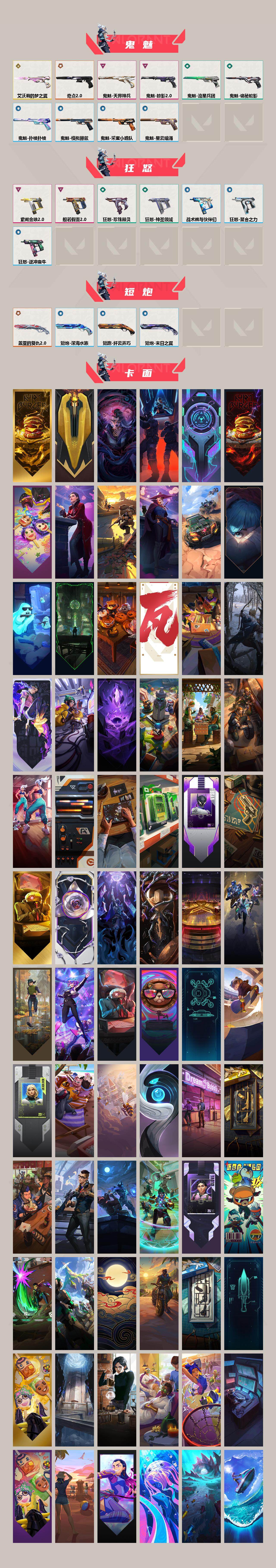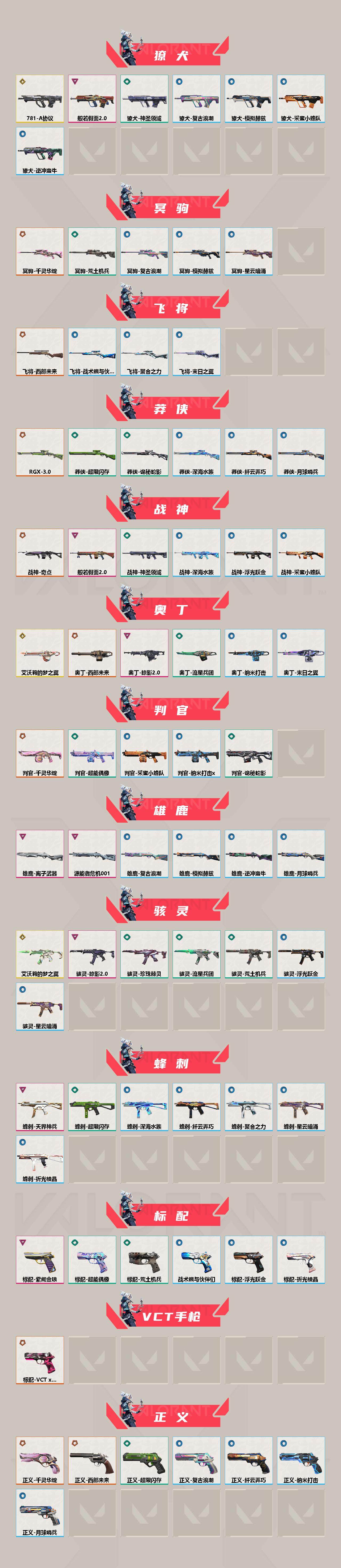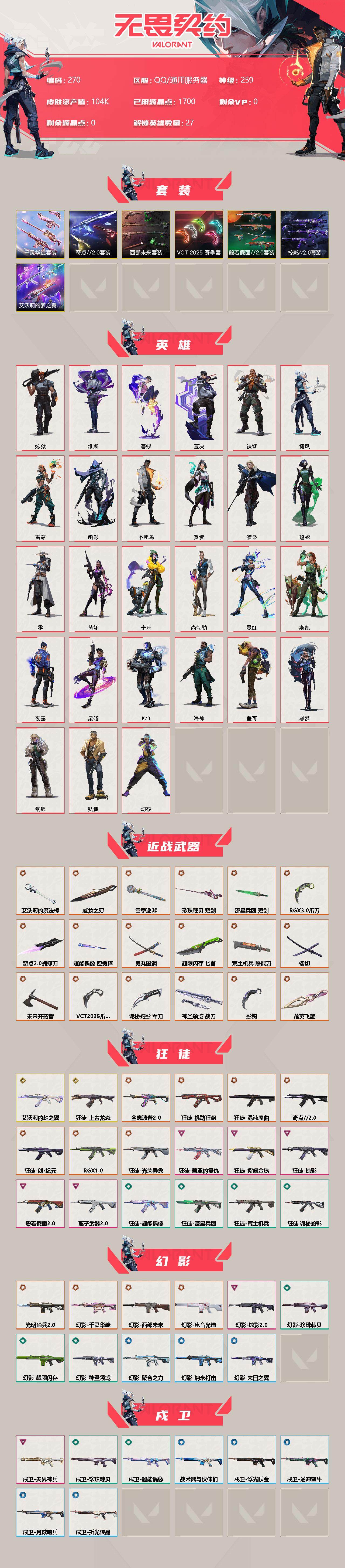 【270】【套装】:艾沃莉的梦之翼套装,vct 2025 赛季套装,西部未来套装,千灵华绽套装,奇点//2.0套装,般若假面//2.0套装,掠影//2.0套装 【英雄】:幻棱,炼狱,维斯,暮蝶,钛狐,壹决,铁臂,捷风,雷兹,幽影,不死鸟,贤者,猎枭,蝰蛇,零,芮娜,奇乐,尚勃勒,霓虹,斯凯,夜露,星礈,k/o,海神,盖可,黑梦,钢锁 【近战 武器】:近战武器-影钩,近战武器-奇点//2.0 蝴蝶刀,近战武器-vct 2025 爪刀,近战武器-rgx 11z pro//3.0 爪刀,近战武器-落英飞旋,近战武器-镭切,近战武器-艾沃莉的魔法棒,近战武器-威龙之刃,近战武器-鬼丸国纲,近战武器-未来开拓者,近战武器-珍珠棘贝 短剑,近战武器-流星兵团 短剑,近战武器-超能偶像 应援棒,近战武器-超限闪存 匕首,近战武器-荒土机兵 热能刀,近战武器-雪季巡游,近战武器-诡秘蛇影 军刀,近战武器-神圣领域 战刀 【狂徒】:狂徒-艾沃莉的梦之翼,狂徒-上古龙炎,狂徒-混沌序曲,狂徒-机动狂飙,狂徒-奇点//2.0,狂徒-全息波普//2.0,狂徒-创·纪元,狂徒-rgx 11z pro,狂徒-光荣异象,狂徒-般若假面//2.0,狂徒-掠影,狂徒-盖亚的复仇,狂徒-紫阙金琅,狂徒-离子武器//2.0,狂徒-超能偶像,狂徒-荒土机兵,狂徒-流星兵团,狂徒-诡秘蛇影 【幻影】:幻影-光明哨兵//2.0,幻影-千灵华绽,幻影-西部未来,幻影-电音光谱,幻影-掠影//2.0,幻影-超限闪存,幻影-珍珠棘贝,幻影-神圣领域,幻影-聚合之力,幻影-纳米打击,幻影-末日之翼,幻影-西部未来,幻影-电音光谱 【戍卫】:戍卫-天界神兵,戍卫-超能偶像,戍卫-珍珠棘贝,戍卫-浮光跃金,戍卫-逆冲蛮牛,戍卫-战术熊与伙伴们,戍卫-月球哨兵,戍卫-折光棱晶 【獠犬】:獠犬-781-a协议,獠犬-般若假面//2.0,獠犬-神圣领域,獠犬-采蜜小蜂队,獠犬-复古浪潮,獠犬-模拟赫兹,獠犬-逆冲蛮牛 【冥驹】:冥驹-千灵华绽,冥驹-荒土机兵,冥驹-复古浪潮,冥驹-模拟赫兹,冥驹-星云暗涌 【飞将】:飞将-西部未来,飞将-聚合之力,飞将-战术熊与伙伴们,飞将-末日之翼 【莽侠】:莽侠-rgx 11z pro//3.0,莽侠-超限闪存,莽侠-诡秘蛇影,莽侠-深海水族,莽侠-纤云弄巧,莽侠-月球哨兵 【战神】:战神-奇点,战神-般若假面//2.0,战神-神圣领域,战神-采蜜小蜂队,战神-浮光跃金,战神-深海水族 【奥丁】:奥丁-艾沃莉的梦之翼,奥丁-西部未来,奥丁-掠影//2.0,奥丁-流星兵团,奥丁-纳米打击,奥丁-末日之翼 【判官】:判官-千灵华绽,判官-超能偶像,判官-诡秘蛇影,判官-采蜜小蜂队,判官-纳米打击x 【雄鹿】:雄鹿-离子武器,雄鹿-源能者危机001,雄鹿-复古浪潮,雄鹿-模拟赫兹,雄鹿-逆冲蛮牛,雄鹿-月球哨兵 【骇灵】:骇灵-艾沃莉的梦之翼,骇灵-掠影//2.0,骇灵-荒土机兵,骇灵-流星兵团,骇灵-珍珠棘贝,骇灵-浮光跃金,骇灵-星云暗涌 【蜂刺】:蜂刺-天界神兵,蜂刺-超限闪存,蜂刺-聚合之力,蜂刺-深海水族,蜂刺-纤云弄巧,蜂刺-星云暗涌,蜂刺-折光棱晶 【标配】:标配-紫阙金琅,标配-超能偶像,标配-荒土机兵,标配-浮光跃金,标配-战术熊与伙伴们,标配-折光棱晶 【vct手呛】:标配-vct x krü 【正义】:正义-千灵华绽,正义-西部未来,正义-超限闪存,正义-复古浪潮,正义-纳米打击,正义-纤云弄巧,正义-月球哨兵 【鬼魅】:鬼魅-艾沃莉的梦之翼,鬼魅-奇点//2.0,鬼魅-天界神兵,鬼魅-掠影//2.0,鬼魅-流星兵团,鬼魅-诡秘蛇影,鬼魅-采蜜小蜂队,鬼魅-模拟赫兹,鬼魅-扑棱扑棱,鬼魅-星云暗涌 【狂怒】:狂怒-般若假面//2.0,狂怒-紫阙金琅//2.0,狂怒-珍珠棘贝,狂怒-神圣领域,狂怒-聚合之力,狂怒-逆冲蛮牛,狂怒-战术熊与伙伴们 【短炮】:短炮-盖亚的复仇//2.0,短炮-深海水族,短炮-纤云弄巧,短炮-末日之翼 【卡面】:终章:激斗汉堡 卡面,进入射程 卡面,分崩离析 卡面,纳米打击 卡面,抑制技术 卡面,激斗汉堡 卡面,瓦娃脸雪糕 p2 卡面,从黄昏到黎明 卡面,荒土机兵 卡面,银弹猎手 卡面,逆冲蛮牛 卡面,《双城之战》拥抱 卡面,精灵大战 卡面,欢迎来到底城 卡面,南瓜盛典 卡面,vct cn首冠 卡面,唱片的故事 卡面,钢弓与箭弦 卡面,无畏契约:暮蝶 卡面,排除故障 卡面,奇点//2.0 卡面,战术桌游 卡面,悠享食光 卡面,修车达人 卡面,热舞环节 卡面,模拟赫兹 卡面,浮光跃金 卡面,超限闪存 卡面,维斯工牌 卡面,正义的化身 卡面,终章:生意人麦宝 卡面,铁之华 卡面,失而复得 卡面,时间到 卡面,最高舞台 卡面,复活专家 卡面,归乡 // 蝰蛇 卡面,超能偶像 卡面,生意人麦宝 卡面,音熊登场 卡面,声感陷阱设计图 卡面,clutch 卡面,钢锁工牌 卡面,战术小伙伴的夏日 卡面,采蜜小蜂队 卡面,聚合之力 卡面,梦幻奶茶 卡面,终章:打造专属狂徒 卡面,趁热吃 卡面,西装暴徒 卡面,失控边缘 卡面,哨卫者之领域 卡面,暮蝶工牌 卡面,战术熊与伙伴们 卡面,源能反应 卡面,流星兵团 卡面,纤云弄巧 卡面,暂别喧嚣 卡面,打造专属狂徒 卡面,零点嗅探设计图 卡面,终章:瓦娃脸雪糕 卡面,表象之下 卡面,虹吸式咖啡壶 卡面,源能者美容 卡面,脚踝终结者 卡面 ,夜班 卡面,瓦娃脸雪糕 卡面 ,沙雕爆能器 卡面,无畏契约go!第一卷:芮娜 卡面,深海水族 卡面,珍珠棘贝 卡面,复古浪潮 卡面,盖可工牌 卡面,清除名单 卡面,无畏契约go!第一卷:零 卡面,无垠星环 卡面,《双城之战》金克丝 卡面,暗呛 卡面,无畏契约go!第一卷:贤者 卡面,代号红色 卡面,新兵报到 卡面,v契约 卡面,无畏契约 卡面,拯救宽体奇乐 卡面 【喷漆】:小小心意 喷漆,战“素”兔 喷漆,宇宙的指引 喷漆,请求重启 喷漆,逆冲蛮牛 喷漆,纳米