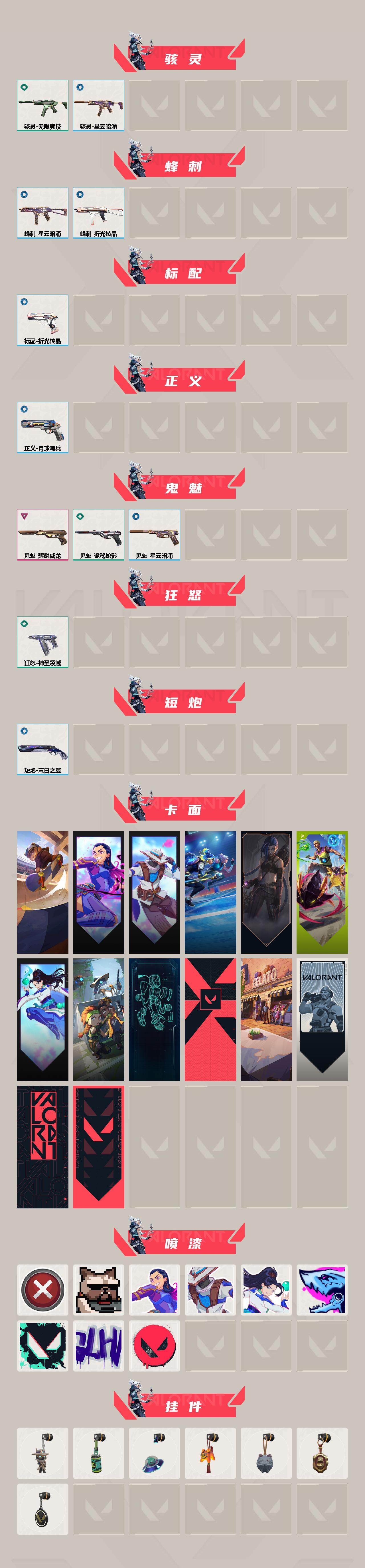 【66】xl18266 【英雄】:幻棱,炼狱,维斯,暮蝶,钛狐,壹决,铁臂,捷风,雷兹,幽影,不死鸟,贤者,猎枭,蝰蛇,零,芮娜,奇乐,尚勃勒,霓虹,斯凯,夜露,星礈,k/o,海神,盖可,黑梦,钢锁 【近战 武器】:近战武器-rgx 11z pro//2.0 蝴蝶刀,近战武器-灵魂冲击 镰刃,近战武器-夜刃诡镰,近战武器-诡秘蛇影 军刀,近战武器-神圣领域 战刀,近战武器-日耀风暴 遗器 【狂徒】:狂徒-洪荒怒焰,狂徒-塑水宗,狂徒-盖亚的复仇,狂徒-诡秘蛇影 【幻影】:幻影-天界神兵//2.0,幻影-神圣领域,幻影-神罚,幻影-末日之翼 【戍卫】:戍卫-月球哨兵,戍卫-折光棱晶 【獠犬】:獠犬-神圣领域 【冥驹】:冥驹-星云暗涌 【飞将】:飞将-末日之翼 【莽侠】:莽侠-诡秘蛇影,莽侠-月球哨兵 【战神】:战神-神圣领域 【奥丁】:奥丁-末日之翼 【判官】:判官-诡秘蛇影 【雄鹿】:雄鹿-月球哨兵 【骇灵】:骇灵-无限竞技,骇灵-星云暗涌 【蜂刺】:蜂刺-星云暗涌,蜂刺-折光棱晶 【标配】:标配-折光棱晶 【正义】:正义-月球哨兵 【鬼魅】:鬼魅-耀鳞威龙,鬼魅-诡秘蛇影,鬼魅-星云暗涌 【狂怒】:狂怒-神圣领域 【短炮】:短炮-末日之翼 【卡面】:clutch 卡面,无畏契约go!第一卷:芮娜 卡面,无畏契约go!第一卷:零 卡面,比比看谁快? 卡面,《双城之战》金克丝 卡面,势不可挡//盖可 卡面,无畏契约go!第一卷:贤者 卡面,别冒尖 卡面,铁臂设计图 卡面,代号红色 卡面,冰淇淋店 卡面,新兵报到 卡面,v契约 卡面,无畏契约 卡面 【喷漆】:买装还是存钱 喷漆,关门放狗 喷漆,无畏契约go!第一卷:芮娜 喷漆,无畏契约go!第一卷:零 喷漆,无畏契约go!第一卷:贤者 喷漆,暴走萝莉 喷漆,胜利属于无畏契约 喷漆,glhf 喷漆,无畏契约 喷漆 【挂饰】:无畏契约go!第一卷 零 挂饰,z世代特饮 挂饰,天外飞客 挂饰,好运福爪 挂饰,《双城之战》魄罗 挂饰,海豹的认可 挂饰,无畏契约 纪念币 挂饰