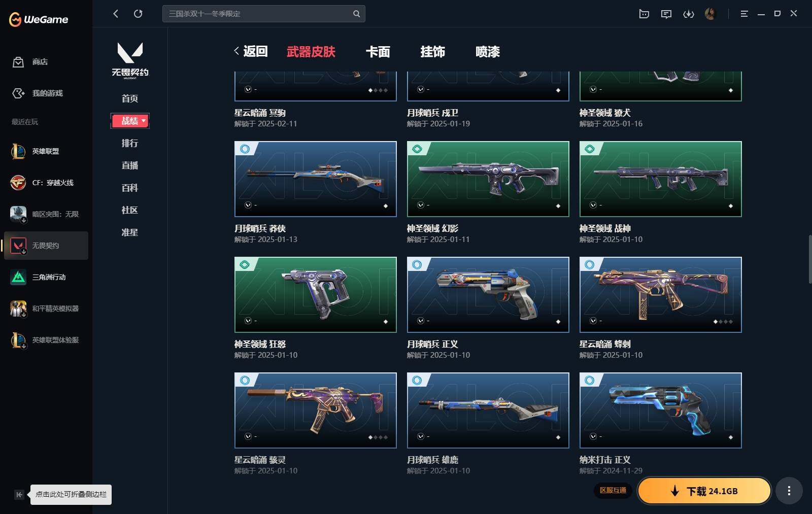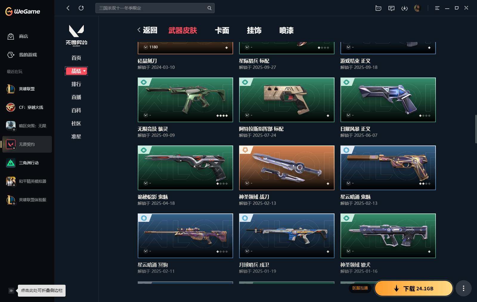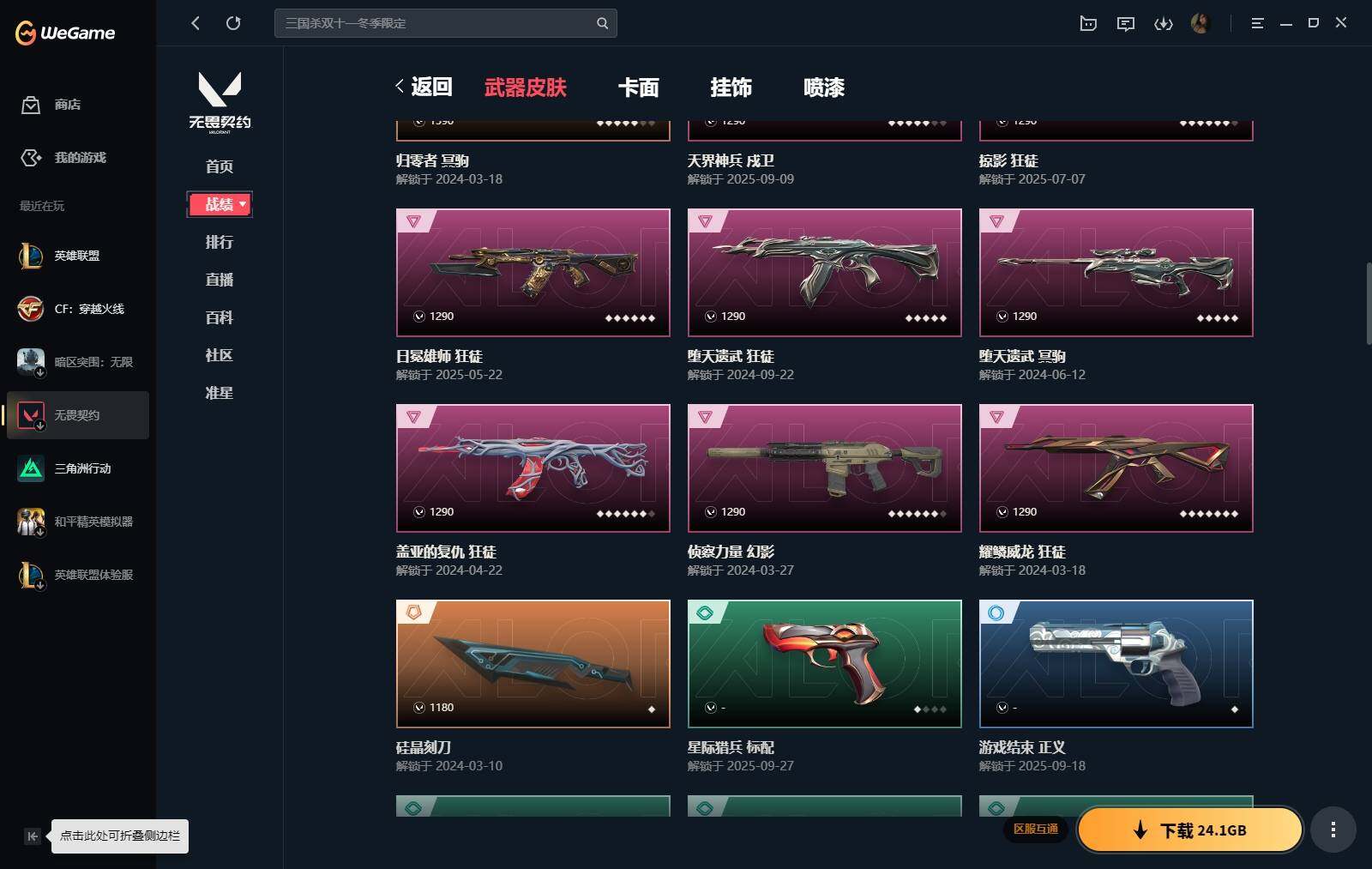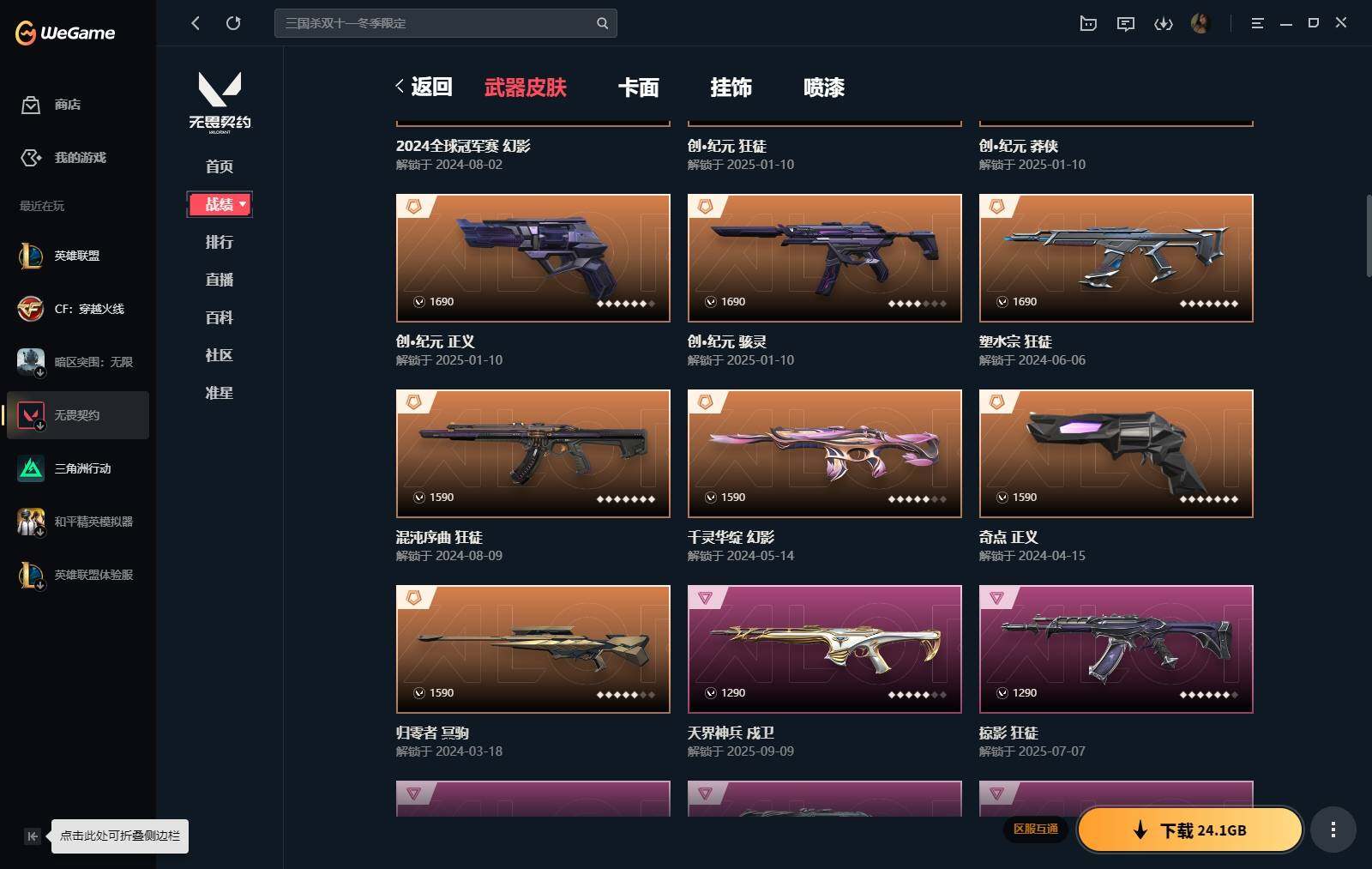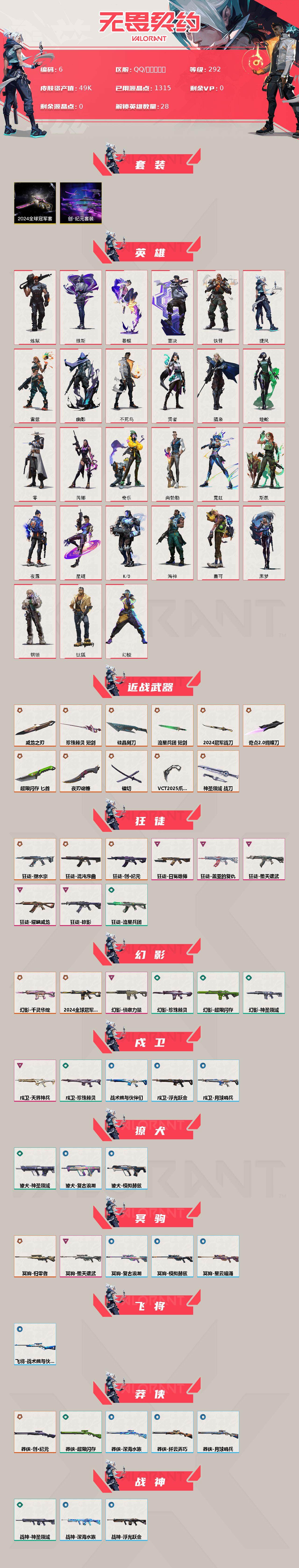 【6】【套装】:2024全球冠军赛套装,vct 2025 赛季套装,创·纪元套装 【英雄】:幻棱,炼狱,维斯,暮蝶,钛狐,壹决,铁臂,捷风,雷兹,幽影,不死鸟,贤者,猎枭,蝰蛇,零,芮娜,奇乐,尚勃勒,霓虹,斯凯,夜露,星礈,k/o,海神,盖可,黑梦,钢锁 【近战 武器】:近战武器-2024全球冠军赛 战刀,近战武器-奇点//2.0 蝴蝶刀,近战武器-vct 2025 爪刀,近战武器-镭切,近战武器-威龙之刃,近战武器-珍珠棘贝 短剑,近战武器-流星兵团 短剑,近战武器-超限闪存 匕首,近战武器-硅晶刻刀,近战武器-夜刃诡镰,近战武器-神圣领域 战刀 【狂徒】:狂徒-混沌序曲,狂徒-塑水宗,狂徒-创·纪元,狂徒-堕天遗武,狂徒-掠影,狂徒-盖亚的复仇,狂徒-日冕雄师,狂徒-耀鳞威龙,狂徒-流星兵团 【幻影】:幻影-2024全球冠军赛,幻影-千灵华绽,幻影-侦察力量,幻影-超限闪存,幻影-珍珠棘贝,幻影-神圣领域 【戍卫】:戍卫-天界神兵,戍卫-珍珠棘贝,戍卫-浮光跃金,戍卫-战术熊与伙伴们,戍卫-月球哨兵 【獠犬】:獠犬-神圣领域,獠犬-复古浪潮,獠犬-模拟赫兹 【冥驹】:冥驹-归零者,冥驹-堕天遗武,冥驹-复古浪潮,冥驹-模拟赫兹,冥驹-星云暗涌 【飞将】:飞将-战术熊与伙伴们 【莽侠】:莽侠-创·纪元,莽侠-超限闪存,莽侠-深海水族,莽侠-纤云弄巧,莽侠-月球哨兵 【战神】:战神-神圣领域,战神-浮光跃金,战神-深海水族 【奥丁】:奥丁-流星兵团 【雄鹿】:雄鹿-复古浪潮,雄鹿-模拟赫兹,雄鹿-月球哨兵 【骇灵】:骇灵-创·纪元,骇灵-流星兵团,骇灵-珍珠棘贝,骇灵-无限竞技,骇灵-浮光跃金,骇灵-星云暗涌 【蜂刺】:蜂刺-超限闪存,蜂刺-深海水族,蜂刺-纤云弄巧,蜂刺-星云暗涌 【标配】:标配-超能偶像,标配-浮光跃金,标配-战术熊与伙伴们 【正义】:正义-奇点,正义-创·纪元,正义-超限闪存,正义-复古浪潮,正义-纳米打击,正义-纤云弄巧,正义-游戏结束,正义-月球哨兵 【鬼魅】:鬼魅-流星兵团,鬼魅-诡秘蛇影,鬼魅-模拟赫兹,鬼魅-星云暗涌 【狂怒】:狂怒-珍珠棘贝,狂怒-神圣领域,狂怒-战术熊与伙伴们 【短炮】:短炮-深海水族,短炮-纤云弄巧 【卡面】:终章:激斗汉堡 卡面,进入射程 卡面,银弹猎手 卡面,《双城之战》拥抱 卡面,精灵大战 卡面,欢迎来到底城 卡面,南瓜盛典 卡面,唱片的故事 卡面,钢弓与箭弦 卡面,排除故障 卡面,战术桌游 卡面,悠享食光 卡面,修车达人 卡面,模拟赫兹 卡面,浮光跃金 卡面,超限闪存 卡面,维斯工牌 卡面,正义的化身 卡面,终章:生意人麦宝 卡面,铁之华 卡面,2024全球冠军赛 卡面,时间到 卡面,最高舞台 卡面,音熊登场 卡面,声感陷阱设计图 卡面,clutch 卡面,梦幻奶茶 卡面,终章:打造专属狂徒 卡面,趁热吃 卡面,西装暴徒 卡面,失控边缘 卡面,哨卫者之领域 卡面,暮蝶工牌 卡面,战术熊与伙伴们 卡面,源能反应 卡面,流星兵团 卡面,纤云弄巧 卡面,暂别喧嚣 卡面,打造专属狂徒 卡面,零点嗅探设计图 卡面,终章:瓦娃脸雪糕 卡面,表象之下 卡面,虹吸式咖啡壶 卡面,源能者美容 卡面,脚踝终结者 卡面 ,夜班 卡面,瓦娃脸雪糕 卡面 ,沙雕爆能器 卡面,无畏契约go!第一卷:芮娜 卡面,深海水族 卡面,珍珠棘贝 卡面,复古浪潮 卡面,盖可工牌 卡面,清除名单 卡面,无畏契约go!第一卷:零 卡面,化茧成蝶 卡面,势不可挡//盖可 卡面,暗呛 卡面,代号红色 卡面,新兵报到 卡面,v契约 卡面,无畏契约 卡面,809特遣队 卡面 【喷漆】:嗨宝南瓜灯 喷漆,嘭! 喷漆,都算到了 喷漆,控场勿近 喷漆,皮蛋呼呼 喷漆,像素星礈 喷漆,图谋不轨的零 喷漆,小丑猫 喷漆,模拟赫兹 喷漆,高丽风情小熊 喷漆,蹲到一个 喷漆,全力集中 喷漆,超限闪存 喷漆,rua一下 喷漆,熊抱 喷漆,高丽风情小虎 喷漆,记在小本本 喷漆,防弹企鹅 喷漆,高丽风情小蛙 喷漆,2024全球冠军赛 喷漆,超级粉丝 喷漆,捷风差距 喷漆,惊声尖叫 喷漆,拼一呛 喷漆,加油!加油! 喷漆,开心到爆炸 喷漆,皮蛋萌舞 喷漆,我觉得不行 喷漆,头号粉丝 喷漆,吸一口快乐 喷漆,永远的答案 喷漆,再来一次? 喷漆,别挡我的路! 喷漆,我的刀呢? 喷漆,当然可以 喷漆,流星兵团 喷漆,战术熊与伙伴们 喷漆,禁止喷漆 喷漆,纤云弄巧 喷漆,情绪控制 喷漆,哨卫滑步 喷漆,倒吸一口凉气 喷漆,uwu 喷漆,新潮流 喷漆,逮到一个 喷漆,一个人的孤岛 喷漆,双人比心 喷漆,不予置评 喷漆,三熊合一 喷漆,要喝完噢! 喷漆,双击点赞 喷漆,珍珠棘贝 喷漆,深海水族 喷漆,禁止标配 喷漆 ,铁臂尴尬 喷漆,买装还是存钱 喷漆,胜利属于无畏契约 喷漆,glhf 喷漆,无畏契约 喷漆 【挂饰】:终章:猫猫木乃伊 挂饰,悠闲鸡块 挂饰,伞绳 挂饰,《双城之战》小蛋糕 挂饰,第九季//第三幕 纪念币 挂饰,拳击战术熊 挂饰,工具腰带 挂饰,暗藏猫腻 挂饰,高丽风情 挂饰,鱼骨头 挂饰,熔岩灯 挂饰,超限闪存 挂饰,迷你k/o 挂饰,模拟赫兹 挂饰,第九季//第二幕 纪念币 挂饰,终章:这瓜保熟 挂饰,2024全球冠军赛 挂饰,糖葫芦 挂饰,袖珍捷风 挂饰,迷你浓缩 挂饰,第九季//第一幕 纪念币 挂饰,终章:迷你机甲 挂饰,犯困的布鲁诺 挂饰,战术河童 挂饰,招财猫熊 挂饰,迷你机甲 挂饰,荧光棒 挂饰,章鱼烧先生 挂饰,流星兵团 挂饰,云开见日 挂饰,第八季//第三幕 纪念币 挂饰,终章:扭结饼干 挂饰 ,战术抓娃娃:阿丹 挂饰 ,瓶中信 挂饰,复古浪潮 挂饰,深海水母 挂饰,传世莲华 挂饰,扭结饼干 挂饰 ,珍珠棘贝 挂饰,深海水族 挂饰 ,第八季//第二幕 纪念币 挂饰 ,天外飞客 挂饰,红鳞松叶 挂饰,第八季