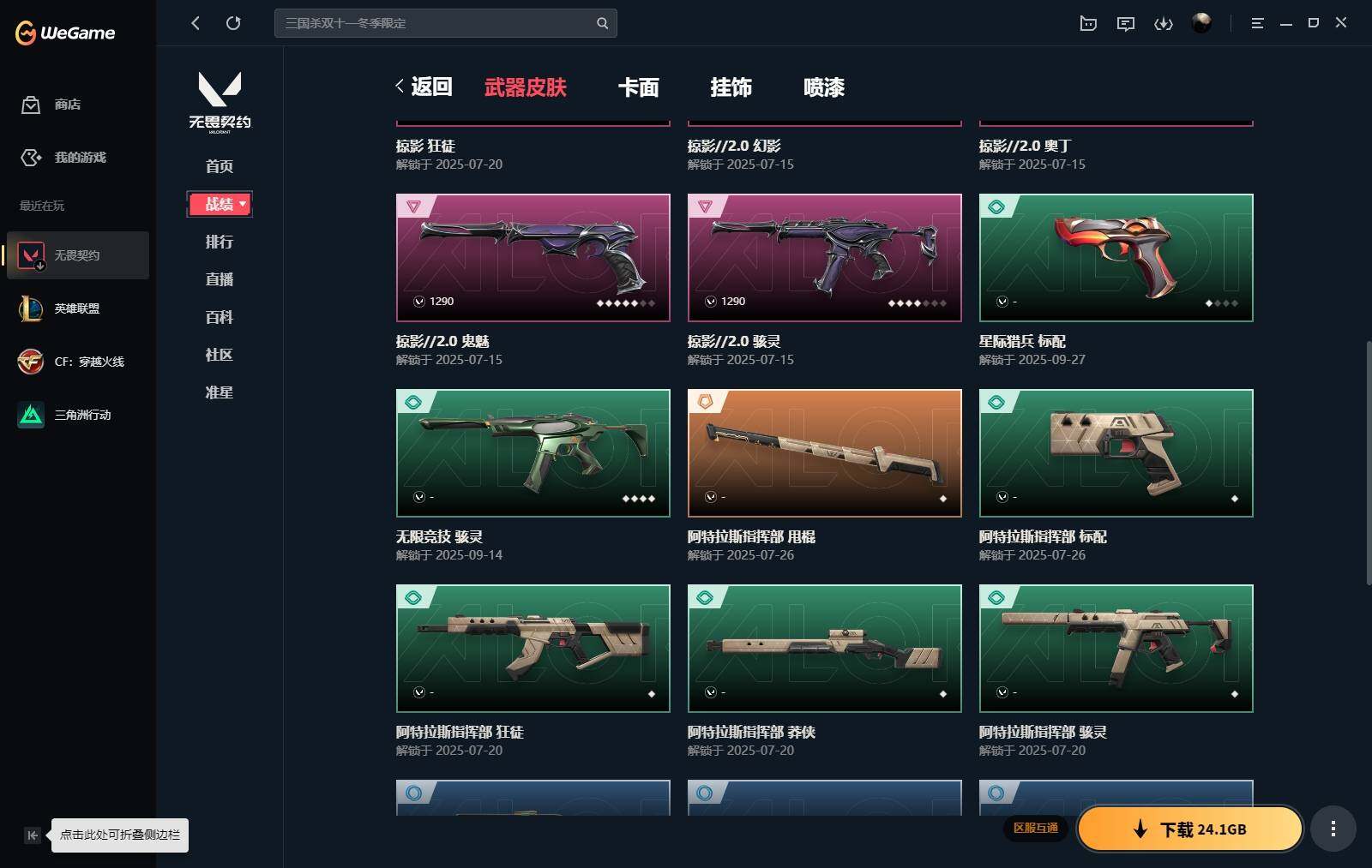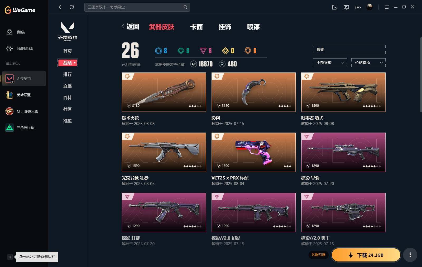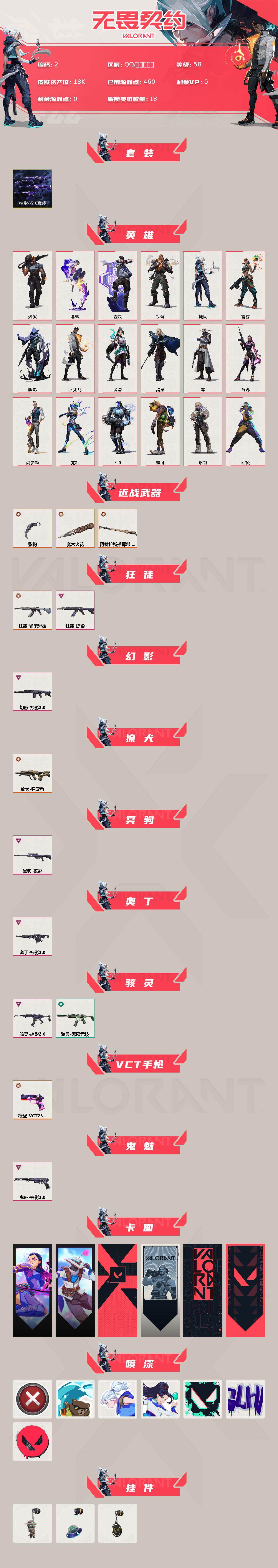 【2】xh 【套装】:掠影//2.0套装 【英雄】:幻棱,炼狱,暮蝶,壹决,铁臂,捷风,雷兹,幽影,不死鸟,贤者,猎枭,零,芮娜,尚勃勒,霓虹,k/o,盖可,钢锁 【近战 武器】:近战武器-魔术火花,近战武器-影钩,近战武器-阿特拉斯指挥部 甩棍,近战武器-魔术火花 【狂徒】:狂徒-光荣异象,狂徒-掠影 【幻影】:幻影-掠影//2.0 【獠犬】:獠犬-归零者 【冥驹】:冥驹-掠影 【奥丁】:奥丁-掠影//2.0 【骇灵】:骇灵-掠影//2.0,骇灵-无限竞技 【vct手呛】:标配-vct25 x prx 【鬼魅】:鬼魅-掠影//2.0 【卡面】:无畏契约go!第一卷:芮娜 卡面,无畏契约go!第一卷:零 卡面,代号红色 卡面,新兵报到 卡面,v契约 卡面,无畏契约 卡面 【喷漆】:买装还是存钱 喷漆,酷熊冲浪 喷漆,无畏契约go!第一卷:捷风 喷漆,无畏契约go!第一卷:贤者 喷漆,胜利属于无畏契约 喷漆,glhf 喷漆,无畏契约 喷漆 【挂饰】:无畏契约go!第一卷 零 挂饰,天外飞客 挂饰,无畏契约 纪念币 挂饰