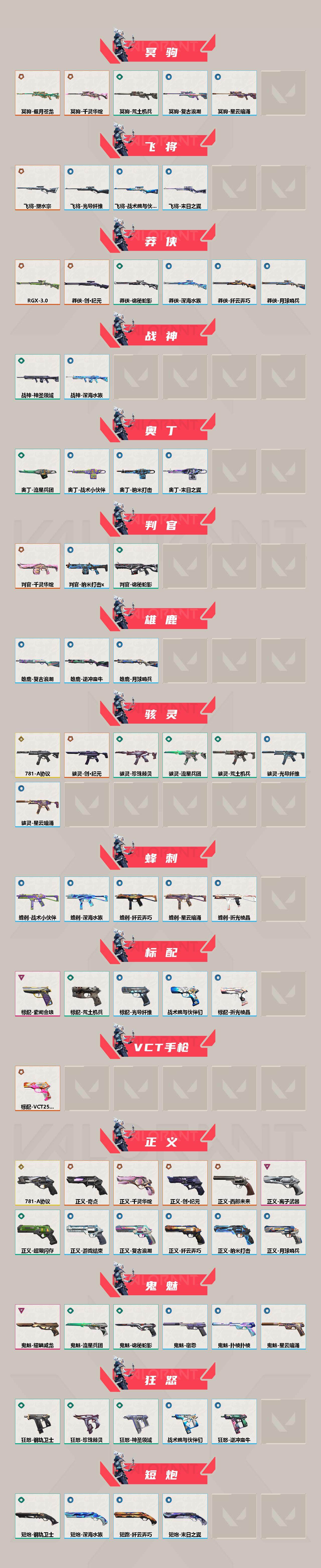【501】【套装】:2021全球冠军赛套装,781-a协议套装,创·纪元套装,千灵华绽套装,耀鳞威龙套装 【英雄】:幻棱,炼狱,维斯,暮蝶,钛狐,壹决,铁臂,捷风,雷兹,幽影,不死鸟,贤者,猎枭,蝰蛇,零,芮娜,奇乐,尚勃勒,霓虹,斯凯,夜露,星礈,k/o,海神,盖可,黑梦,钢锁 【近战 武器】:近战武器-2021全球冠军赛 爪刀,近战武器-侦察力量 蝴蝶刀,近战武器-落英飞旋,近战武器-镭切,近战武器-威龙之刃,近战武器-鬼丸国纲,近战武器-珍珠棘贝 短剑,近战武器-流星兵团 短剑,近战武器-盖亚之怒,近战武器-个人近战单位,近战武器-荒土机兵 热能刀,近战武器-诡秘蛇影 军刀,近战武器-神圣领域 战刀,近战武器-日耀风暴 遗器 【狂徒】:狂徒-2021全球冠军赛,狂徒-归零者,狂徒-混沌序曲,狂徒-塑水宗,狂徒-创·纪元,狂徒-虚空遗器,狂徒-噬影者,狂徒-rgx 11z pro,狂徒-堕天遗武,狂徒-盖亚的复仇,狂徒-日冕雄师,狂徒-耀鳞威龙,狂徒-紫阙金琅,狂徒-离子武器//2.0,狂徒-钢轨卫士,狂徒-荒土机兵,狂徒-流星兵团,狂徒-诡秘蛇影 【幻影】:幻影-781-a协议,幻影-砰砰x特攻队,幻影-破败军械,幻影-千灵华绽,幻影-西部未来,幻影-离子武器,幻影-侦察力量,幻影-珍珠棘贝,幻影-神圣领域,幻影-纳米打击,幻影-战术小伙伴,幻影-末日之翼,幻影-西部未来 【戍卫】:戍卫-天界神兵,戍卫-钢轨卫士,戍卫-珍珠棘贝,戍卫-逆冲蛮牛,戍卫-战术熊与伙伴们,戍卫-月球哨兵,戍卫-折光棱晶 【獠犬】:獠犬-781-a协议,獠犬-神圣领域,獠犬-复古浪潮,獠犬-逆冲蛮牛,獠犬-战术小伙伴 【冥驹】:冥驹-千灵华绽,冥驹-偃月苍龙,冥驹-荒土机兵,冥驹-复古浪潮,冥驹-星云暗涌 【飞将】:飞将-塑水宗,飞将-光导纤维,飞将-战术熊与伙伴们,飞将-末日之翼 【莽侠】:莽侠-rgx 11z pro//3.0,莽侠-创·纪元,莽侠-诡秘蛇影,莽侠-深海水族,莽侠-纤云弄巧,莽侠-月球哨兵 【战神】:战神-神圣领域,战神-深海水族 【奥丁】:奥丁-流星兵团,奥丁-纳米打击,奥丁-战术小伙伴,奥丁-末日之翼 【判官】:判官-千灵华绽,判官-诡秘蛇影,判官-纳米打击x 【雄鹿】:雄鹿-复古浪潮,雄鹿-逆冲蛮牛,雄鹿-月球哨兵 【骇灵】:骇灵-781-a协议,骇灵-创·纪元,骇灵-荒土机兵,骇灵-流星兵团,骇灵-珍珠棘贝,骇灵-光导纤维,骇灵-星云暗涌 【蜂刺】:蜂刺-深海水族,蜂刺-纤云弄巧,蜂刺-战术小伙伴,蜂刺-星云暗涌,蜂刺-折光棱晶 【标配】:标配-紫阙金琅,标配-荒土机兵,标配-光导纤维,标配-战术熊与伙伴们,标配-折光棱晶 【vct手呛】:标配-vct25 x fnc 【正义】:正义-781-a协议,正义-奇点,正义-千灵华绽,正义-创·纪元,正义-西部未来,正义-离子武器,正义-超限闪存,正义-复古浪潮,正义-纳米打击,正义-纤云弄巧,正义-游戏结束,正义-月球哨兵 【鬼魅】:鬼魅-耀鳞威龙,鬼魅-流星兵团,鬼魅-诡秘蛇影,鬼魅-扑棱扑棱,鬼魅-宿怨,鬼魅-星云暗涌 【狂怒】:狂怒-钢轨卫士,狂怒-珍珠棘贝,狂怒-神圣领域,狂怒-逆冲蛮牛,狂怒-战术熊与伙伴们 【短炮】:短炮-钢轨卫士,短炮-深海水族,短炮-纤云弄巧,短炮-末日之翼 【卡面】:终章:激斗汉堡 卡面,进入射程 卡面,分崩离析 卡面,纳米打击 卡面,抑制技术 卡面,激斗汉堡 卡面,瓦娃脸雪糕 p2 卡面,从黄昏到黎明 卡面,荒土机兵 卡面,银弹猎手 卡面,逆冲蛮牛 卡面,《双城之战》拥抱 卡面,精灵大战 卡面,欢迎来到底城 卡面,南瓜盛典 卡面,无畏契约:暮蝶 卡面,战术桌游 卡面,修车达人 卡面,正义的化身 卡面,时间到 卡面,最高舞台 卡面,红鳞松叶 卡面,梦幻奶茶 卡面,终章:打造专属狂徒 卡面,趁热吃 卡面,西装暴徒 卡面,失控边缘 卡面,哨卫者之领域 卡面,暮蝶工牌 卡面,战术熊与伙伴们 卡面,源能反应 卡面,流星兵团 卡面,纤云弄巧 卡面,暂别喧嚣 卡面,打造专属狂徒 卡面,零点嗅探设计图 卡面,终章:瓦娃脸雪糕 卡面,表象之下 卡面,虹吸式咖啡壶 卡面,源能者美容 卡面,脚踝终结者 卡面 ,夜班 卡面,瓦娃脸雪糕 卡面 ,沙雕爆能器 卡面,无畏契约go!第一卷:芮娜 卡面,深海水族 卡面,珍珠棘贝 卡面,复古浪潮 卡面,盖可工牌 卡面,清除名单 卡面,无畏契约go!第一卷:零 卡面,龍记 卡面,蝰蛇vs幽影 卡面,势不可挡//盖可 卡面,逆向独行 卡面 ,同步耍酷 卡面,完美调谐 卡面 ,没有什么能逃过我的眼睛 卡面,光导纤维 卡面,战术小伙伴 卡面,钢轨卫士 卡面,暗呛 卡面,无畏契约go!第一卷:贤者 卡面,夯实根基 卡面,"luie" 卡面,热烈欢迎 卡面,铁臂设计图 卡面,代号红色 卡面,新兵报到 卡面,v契约 卡面,无畏契约 卡面,781-a协议 卡面 【喷漆】:小小心意 喷漆,战“素”兔 喷漆,宇宙的指引 喷漆,请求重启 喷漆,逆冲蛮牛 喷漆,纳米打击 喷漆,鼻尖上的蝴蝶 喷漆,简笔画黯兽 喷漆,独守蝰腹 喷漆,他们将落荒而逃 喷漆,通缉:战术企鹅 喷漆,荒土机兵 喷漆,别挡我吃球! 喷漆,嗨宝南瓜灯 喷漆,嘭! 喷漆,都算到了 喷漆,控场勿近 喷漆,伤心心 喷漆,小丑猫 喷漆,熊抱 喷漆,超级粉丝 喷漆,捷风差距 喷漆,惊声尖叫 喷漆,拼一呛 喷漆,加油!加油! 喷漆,开心到爆炸 喷漆,皮蛋萌舞 喷漆,我觉得不行 喷漆,头号粉丝 喷漆,吸一口快乐 喷漆,永远的答案 喷漆,再来一次? 喷漆,别挡我的路! 喷漆,我的刀呢? 喷漆,当然可以 喷漆,流星兵团 喷漆,战术熊与伙伴们 喷漆,禁止喷漆 喷漆,纤云弄巧 喷漆,情绪控制 喷漆,哨卫滑步 喷漆,倒吸一口凉气 喷漆,uwu 喷漆,新潮流 喷漆,逮到一个 喷漆,一个人的孤岛 喷漆,双人比心 喷漆,不予