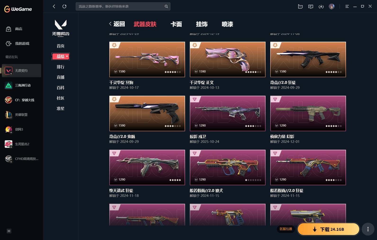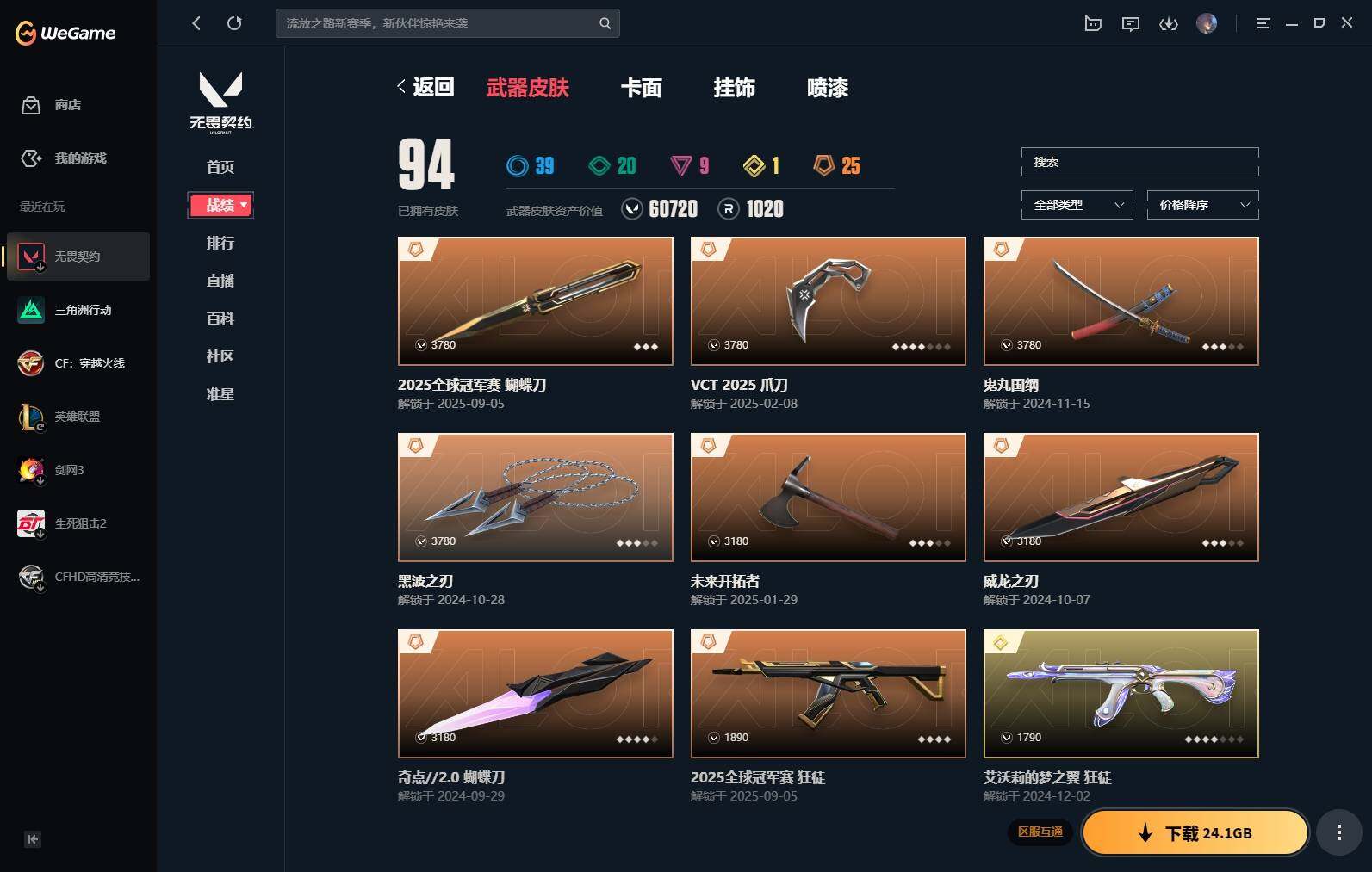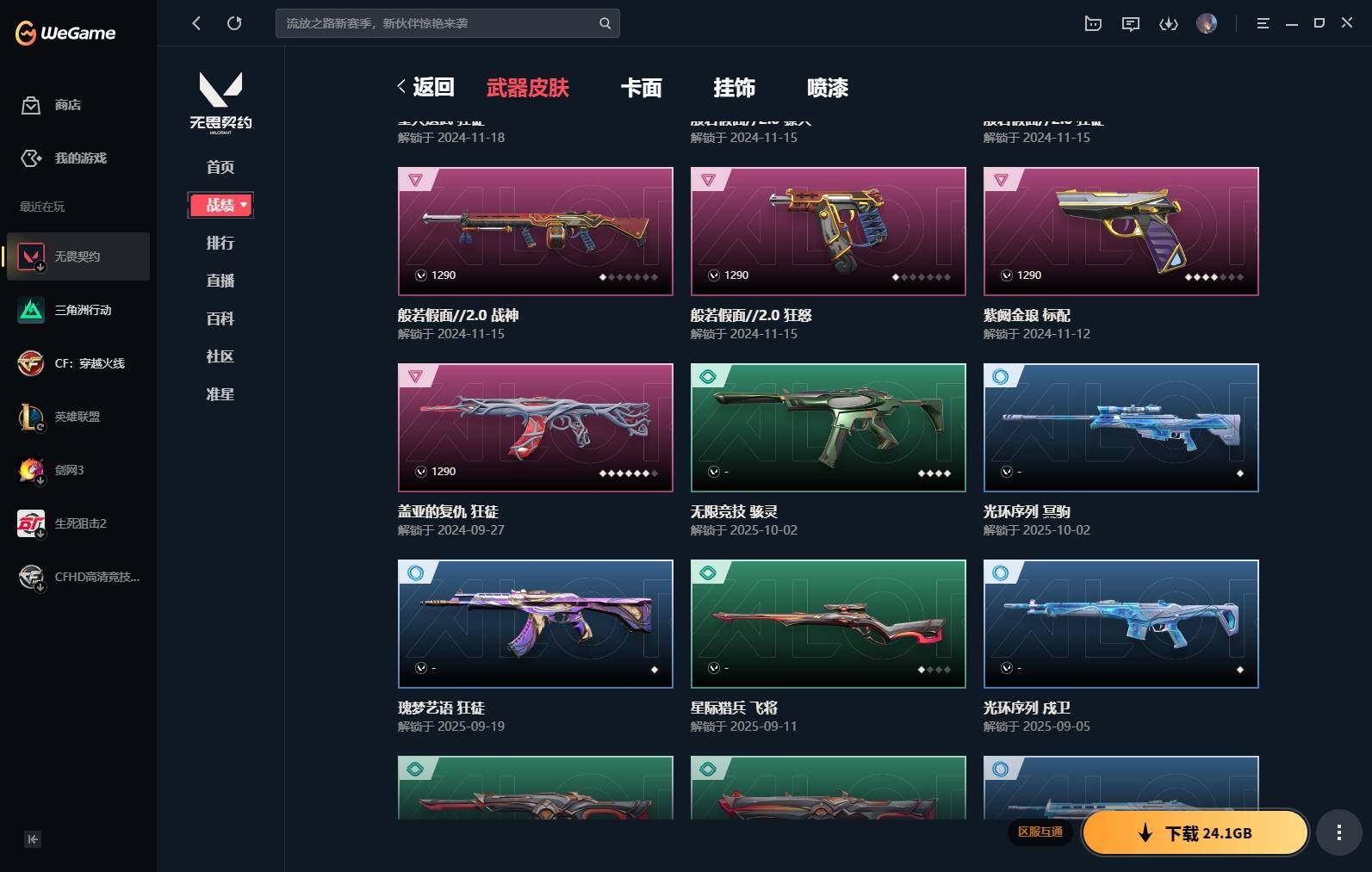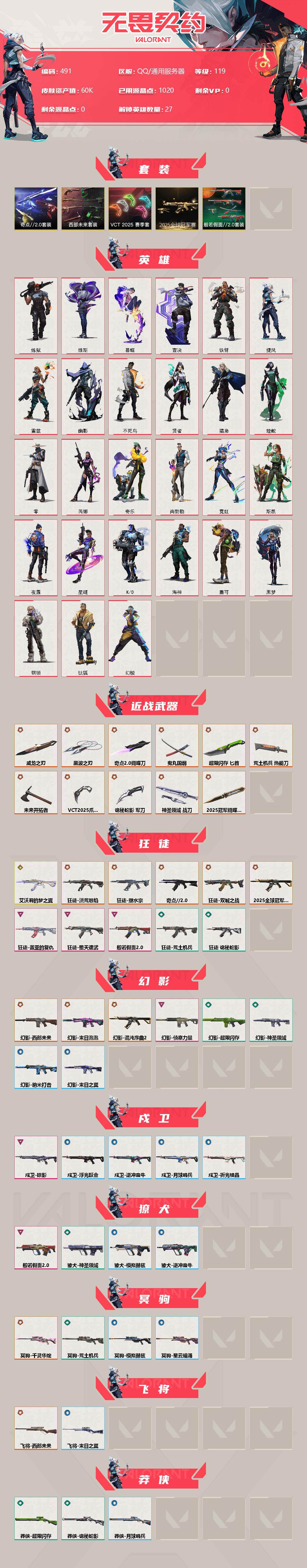 【491】【套装】:2025全球冠军赛套装,vct 2025 赛季套装,西部未来套装,奇点//2.0套装,般若假面//2.0套装 【英雄】:幻棱,炼狱,维斯,暮蝶,钛狐,壹决,铁臂,捷风,雷兹,幽影,不死鸟,贤者,猎枭,蝰蛇,零,芮娜,奇乐,尚勃勒,霓虹,斯凯,夜露,星礈,k/o,海神,盖可,黑梦,钢锁 【近战 武器】:近战武器-2025全球冠军赛 蝴蝶刀,近战武器-奇点//2.0 蝴蝶刀,近战武器-vct 2025 爪刀,近战武器-黑波之刃,近战武器-威龙之刃,近战武器-鬼丸国纲,近战武器-未来开拓者,近战武器-超限闪存 匕首,近战武器-荒土机兵 热能刀,近战武器-诡秘蛇影 军刀,近战武器-神圣领域 战刀 【狂徒】:狂徒-艾沃莉的梦之翼,狂徒-2025全球冠军赛,狂徒-洪荒怒焰,狂徒-奇点//2.0,狂徒-双城之战,狂徒-塑水宗,狂徒-般若假面//2.0,狂徒-堕天遗武,狂徒-盖亚的复仇,狂徒-荒土机兵,狂徒-诡秘蛇影 【幻影】:幻影-西部未来,幻影-末日泡泡,幻影-混沌序曲//2.0,幻影-侦察力量,幻影-超限闪存,幻影-神圣领域,幻影-纳米打击,幻影-末日之翼,幻影-西部未来 【戍卫】:戍卫-掠影,戍卫-浮光跃金,戍卫-逆冲蛮牛,戍卫-月球哨兵,戍卫-折光棱晶 【獠犬】:獠犬-般若假面//2.0,獠犬-神圣领域,獠犬-模拟赫兹,獠犬-逆冲蛮牛 【冥驹】:冥驹-千灵华绽,冥驹-荒土机兵,冥驹-模拟赫兹,冥驹-星云暗涌 【飞将】:飞将-西部未来,飞将-末日之翼 【莽侠】:莽侠-超限闪存,莽侠-诡秘蛇影,莽侠-月球哨兵 【战神】:战神-般若假面//2.0,战神-神圣领域,战神-浮光跃金 【奥丁】:奥丁-西部未来,奥丁-纳米打击,奥丁-末日之翼 【判官】:判官-诡秘蛇影,判官-纳米打击x 【雄鹿】:雄鹿-模拟赫兹,雄鹿-逆冲蛮牛,雄鹿-月球哨兵 【骇灵】:骇灵-荒土机兵,骇灵-无限竞技,骇灵-浮光跃金,骇灵-星云暗涌 【蜂刺】:蜂刺-超限闪存,蜂刺-星云暗涌,蜂刺-折光棱晶 【标配】:标配-紫阙金琅,标配-荒土机兵,标配-浮光跃金,标配-折光棱晶 【正义】:正义-千灵华绽,正义-西部未来,正义-超限闪存,正义-纳米打击,正义-月球哨兵 【鬼魅】:鬼魅-奇点//2.0,鬼魅-诡秘蛇影,鬼魅-模拟赫兹,鬼魅-星云暗涌 【狂怒】:狂怒-般若假面//2.0,狂怒-神圣领域,狂怒-逆冲蛮牛 【短炮】:短炮-末日之翼 【卡面】:终章:激斗汉堡 卡面,进入射程 卡面,分崩离析 卡面,纳米打击 卡面,抑制技术 卡面,激斗汉堡 卡面,瓦娃脸雪糕 p2 卡面,从黄昏到黎明 卡面,荒土机兵 卡面,银弹猎手 卡面,逆冲蛮牛 卡面,《双城之战》拥抱 卡面,精灵大战 卡面,欢迎来到底城 卡面,南瓜盛典 卡面,vct cn首冠 卡面,唱片的故事 卡面,钢弓与箭弦 卡面,无畏契约:暮蝶 卡面,排除故障 卡面,奇点//2.0 卡面,战术桌游 卡面,悠享食光 卡面,修车达人 卡面,热舞环节 卡面,模拟赫兹 卡面,浮光跃金 卡面,超限闪存 卡面,维斯工牌 卡面,正义的化身 卡面,归乡 // 蝰蛇 卡面,无畏契约go!第一卷:芮娜 卡面,无畏契约go!第一卷:零 卡面,《双城之战》金克丝 卡面,铁臂设计图 卡面,代号红色 卡面,新兵报到 卡面,v契约 卡面,无畏契约 卡面 【喷漆】:小小心意 喷漆,战“素”兔 喷漆,宇宙的指引 喷漆,请求重启 喷漆,逆冲蛮牛 喷漆,纳米打击 喷漆,鼻尖上的蝴蝶 喷漆,简笔画黯兽 喷漆,独守蝰腹 喷漆,他们将落荒而逃 喷漆,通缉:战术企鹅 喷漆,荒土机兵 喷漆,别挡我吃球! 喷漆,嗨宝南瓜灯 喷漆,嘭! 喷漆,都算到了 喷漆,控场勿近 喷漆,皮蛋呼呼 喷漆,像素星礈 喷漆,图谋不轨的零 喷漆,伤心心 喷漆,小丑猫 喷漆,模拟赫兹 喷漆,高丽风情小熊 喷漆,奇点//2.0 喷漆,蹲到一个 喷漆,全力集中 喷漆,超限闪存 喷漆,rua一下 喷漆,熊抱 喷漆,蛋糕还是爆能器? 喷漆,高丽风情小虎 喷漆,记在小本本 喷漆,防弹企鹅 喷漆,高丽风情小蛙 喷漆,双击点赞 喷漆,买装还是存钱 喷漆,胜利属于无畏契约 喷漆,glhf 喷漆,无畏契约 喷漆 【挂饰】:v25第三幕:超凡 挂饰,终章:猫猫木乃伊 挂饰,荒土机兵 挂饰,悠闲鸡块 挂饰,猫猫木乃伊 挂饰,水壶 挂饰,纳米打击 挂饰,逆冲蛮牛 挂饰,可爱糖糖 挂饰,伞绳 挂饰,《双城之战》小蛋糕 挂饰,第九季//第三幕 纪念币 挂饰,拳击战术熊 挂饰,工具腰带 挂饰,无畏契约go!第一卷 零 挂饰,暗藏猫腻 挂饰,高丽风情 挂饰,奇点//2.0 挂饰,鱼骨头 挂饰,熔岩灯 挂饰,超限闪存 挂饰,迷你k/o 挂饰,模拟赫兹 挂饰,第九季//第二幕 纪念币 挂饰,z世代特饮 挂饰,动力机箱 挂饰,天外飞客 挂饰,无畏契约 纪念币 挂饰