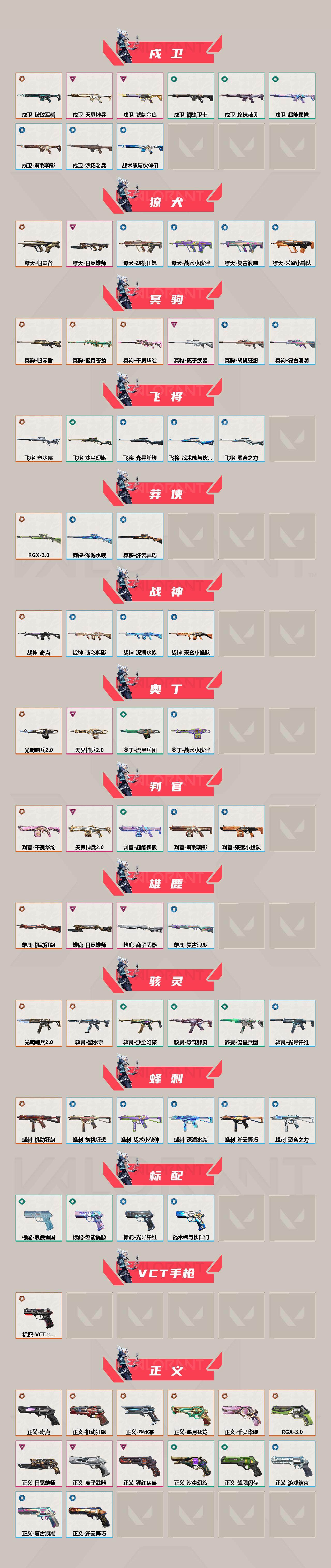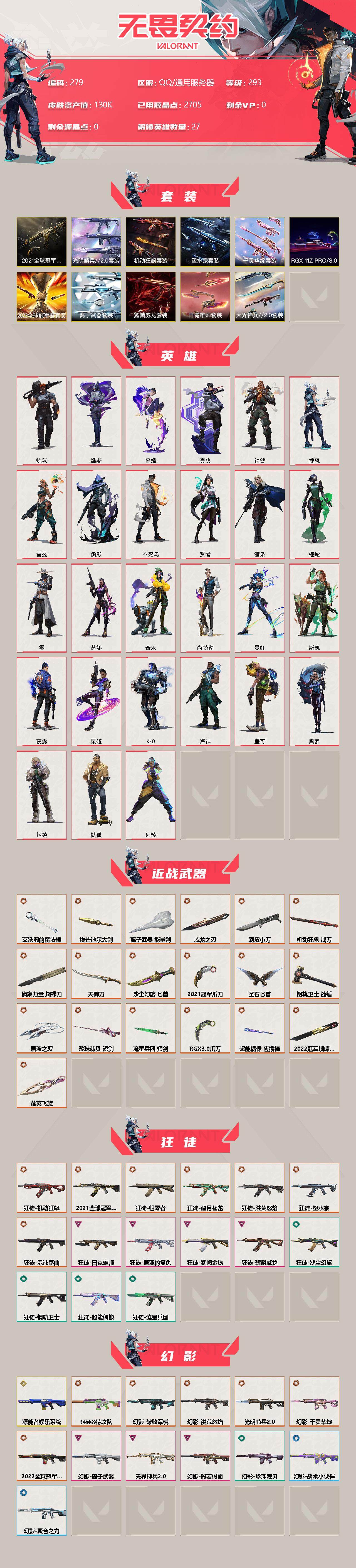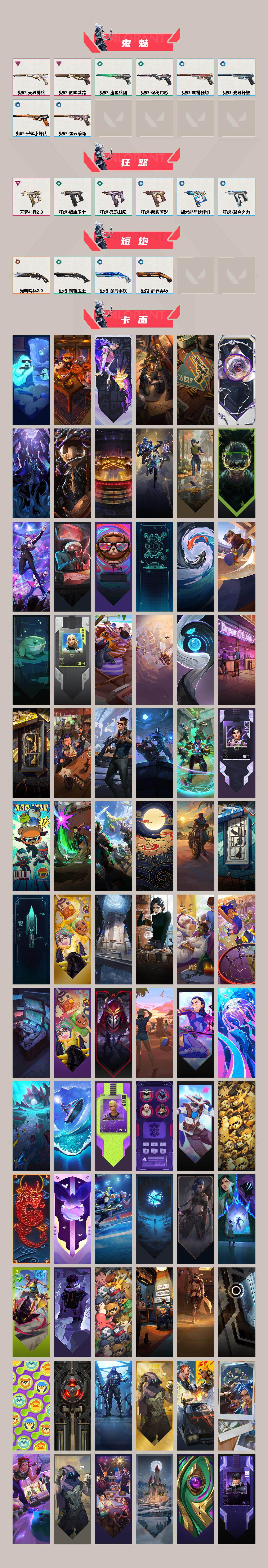 【279】【套装】:2022全球冠军赛套装,2021全球冠军赛套装,rgx 11z pro//3.0套装,塑水宗套装,千灵华绽套装,光明哨兵//2.0套装,机动狂飙套装,耀鳞威龙套装,离子武器套装,天界神兵//2.0套装,日冕雄师套装 【英雄】:幻棱,炼狱,维斯,暮蝶,钛狐,壹决,铁臂,捷风,雷兹,幽影,不死鸟,贤者,猎枭,蝰蛇,零,芮娜,奇乐,尚勃勒,霓虹,斯凯,夜露,星礈,k/o,海神,盖可,黑梦,钢锁 【近战 武器】:近战武器-2022全球冠军赛 蝴蝶刀,近战武器-2021全球冠军赛 爪刀,近战武器-侦察力量 蝴蝶刀,近战武器-剥皮小刀,近战武器-rgx 11z pro//3.0 爪刀,近战武器-黑波之刃,近战武器-落英飞旋,近战武器-艾沃莉的魔法棒,近战武器-威龙之刃,近战武器-埃芒迪尔大剑,近战武器-离子武器 能量剑,近战武器-珍珠棘贝 短剑,近战武器-流星兵团 短剑,近战武器-超能偶像 应援棒,近战武器-钢轨卫士 战锤,近战武器-机动狂飙 战刀,近战武器-沙尘幻旅 匕首,近战武器-圣石匕首,近战武器-天御刀 【狂徒】:狂徒-2021全球冠军赛,狂徒-归零者,狂徒-洪荒怒焰,狂徒-混沌序曲,狂徒-机动狂飙,狂徒-塑水宗,狂徒-偃月苍龙,狂徒-盖亚的复仇,狂徒-日冕雄师,狂徒-耀鳞威龙,狂徒-紫阙金琅,狂徒-超能偶像,狂徒-钢轨卫士,狂徒-流星兵团,狂徒-沙尘幻旅 【幻影】:幻影-源能者娱乐系统,幻影-2022全球冠军赛,幻影-光明哨兵//2.0,幻影-洪荒怒焰,幻影-砰砰x特攻队,幻影-破败军械,幻影-千灵华绽,幻影-般若假面,幻影-离子武器,幻影-天界神兵//2.0,幻影-珍珠棘贝,幻影-聚合之力,幻影-战术小伙伴 【戍卫】:戍卫-破败军械,戍卫-天界神兵,戍卫-紫阙金琅,戍卫-超能偶像,戍卫-钢轨卫士,戍卫-珍珠棘贝,戍卫-萌彩剪影,戍卫-沙场老兵,戍卫-战术熊与伙伴们 【獠犬】:獠犬-归零者,獠犬-日冕雄师,獠犬-采蜜小蜂队,獠犬-复古浪潮,獠犬-胡桃狂想,獠犬-战术小伙伴 【冥驹】:冥驹-归零者,冥驹-千灵华绽,冥驹-偃月苍龙,冥驹-离子武器,冥驹-复古浪潮,冥驹-胡桃狂想 【飞将】:飞将-塑水宗,飞将-沙尘幻旅,飞将-聚合之力,飞将-光导纤维,飞将-战术熊与伙伴们 【莽侠】:莽侠-rgx 11z pro//3.0,莽侠-深海水族,莽侠-纤云弄巧 【战神】:战神-奇点,战神-采蜜小蜂队,战神-萌彩剪影,战神-深海水族 【奥丁】:奥丁-光明哨兵//2.0,奥丁-天界神兵//2.0,奥丁-流星兵团,奥丁-战术小伙伴 【判官】:判官-千灵华绽,判官-天界神兵//2.0,判官-超能偶像,判官-采蜜小蜂队,判官-萌彩剪影 【雄鹿】:雄鹿-机动狂飙,雄鹿-离子武器,雄鹿-日冕雄师,雄鹿-复古浪潮 【骇灵】:骇灵-光明哨兵//2.0,骇灵-塑水宗,骇灵-流星兵团,骇灵-沙尘幻旅,骇灵-珍珠棘贝,骇灵-光导纤维 【蜂刺】:蜂刺-机动狂飙,蜂刺-胡桃狂想,蜂刺-聚合之力,蜂刺-深海水族,蜂刺-纤云弄巧,蜂刺-战术小伙伴 【标配】:标配-超能偶像,标配-浪漫雪国,标配-光导纤维,标配-战术熊与伙伴们 【vct手呛】:标配-vct x g2 【正义】:正义-rgx 11z pro//3.0,正义-机动狂飙,正义-奇点,正义-千灵华绽,正义-塑水宗,正义-偃月苍龙,正义-离子武器,正义-日冕雄师,正义-猩红猛兽,正义-超限闪存,正义-沙尘幻旅,正义-复古浪潮,正义-纤云弄巧,正义-游戏结束 【鬼魅】:鬼魅-天界神兵,鬼魅-耀鳞威龙,鬼魅-流星兵团,鬼魅-诡秘蛇影,鬼魅-采蜜小蜂队,鬼魅-光导纤维,鬼魅-胡桃狂想,鬼魅-星云暗涌 【狂怒】:狂怒-天界神兵//2.0,狂怒-钢轨卫士,狂怒-珍珠棘贝,狂怒-聚合之力,狂怒-萌彩剪影,狂怒-战术熊与伙伴们 【短炮】:短炮-光明哨兵//2.0,短炮-钢轨卫士,短炮-深海水族,短炮-纤云弄巧 【卡面】:精灵大战 卡面,南瓜盛典 卡面,无畏契约:暮蝶 卡面,修车达人 卡面,正义的化身 卡面,铁之华 卡面,失而复得 卡面,时间到 卡面,最高舞台 卡面,复活专家 卡面,归乡 // 蝰蛇 卡面,rgx 11z pro//3.0 卡面,超能偶像 卡面,生意人麦宝 卡面,音熊登场 卡面,声感陷阱设计图 卡面,红鳞松叶 卡面,clutch 卡面,霓帧牛蛙 卡面,钢锁工牌 卡面,战术小伙伴的夏日 卡面,采蜜小蜂队 卡面,聚合之力 卡面,梦幻奶茶 卡面,终章:打造专属狂徒 卡面,趁热吃 卡面,西装暴徒 卡面,失控边缘 卡面,哨卫者之领域 卡面,暮蝶工牌 卡面,战术熊与伙伴们 卡面,源能反应 卡面,流星兵团 卡面,纤云弄巧 卡面,暂别喧嚣 卡面,打造专属狂徒 卡面,零点嗅探设计图 卡面,终章:瓦娃脸雪糕 卡面,表象之下 卡面,虹吸式咖啡壶 卡面,源能者美容 卡面,脚踝终结者 卡面 ,夜班 卡面,瓦娃脸雪糕 卡面 ,vct x g2 卡面,沙雕爆能器 卡面,无畏契约go!第一卷:芮娜 卡面,深海水族 卡面,珍珠棘贝 卡面,复古浪潮 卡面,盖可工牌 卡面,清除名单 卡面,无畏契约go!第一卷:零 卡面,终章:同步耍酷 卡面,龍记 卡面,化茧成蝶 卡面,比比看谁快? 卡面,无垠星环 卡面,《双城之战》金克丝 卡面,蝰蛇vs幽影 卡面,势不可挡//盖可 卡面,逆向独行 卡面 ,同步耍酷 卡面,完美调谐 卡面 ,没有什么能逃过我的眼睛 卡面,光导纤维 卡面,战术小伙伴 卡面,钢轨卫士 卡面,暗呛 卡面,终章:黑影先生的咖啡! 卡面,铁臂vs雷兹 卡面,纪念照 p2 卡面,一击全倒 卡面,黑影先生的咖啡! 卡面,天台狂欢 卡面,胡桃狂想 卡面,沙尘幻旅 卡面,壹决工牌 卡面,萌彩剪影 卡面,势不可挡//k/o 卡面,夯实根基 卡面,"luie" 卡面,热烈欢迎 卡面,铁臂设计图 卡面,代号红色 卡面,新兵报到 卡面,v契约 卡面,无畏契约 卡面 【喷漆】:完美熟度 喷漆,控场勿近 喷漆,伤心心 喷漆,小丑猫 喷漆,熊抱 喷漆,又被闪了 喷漆,