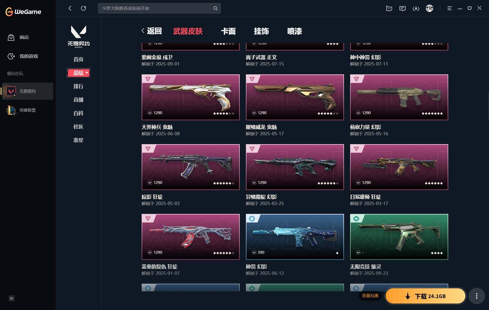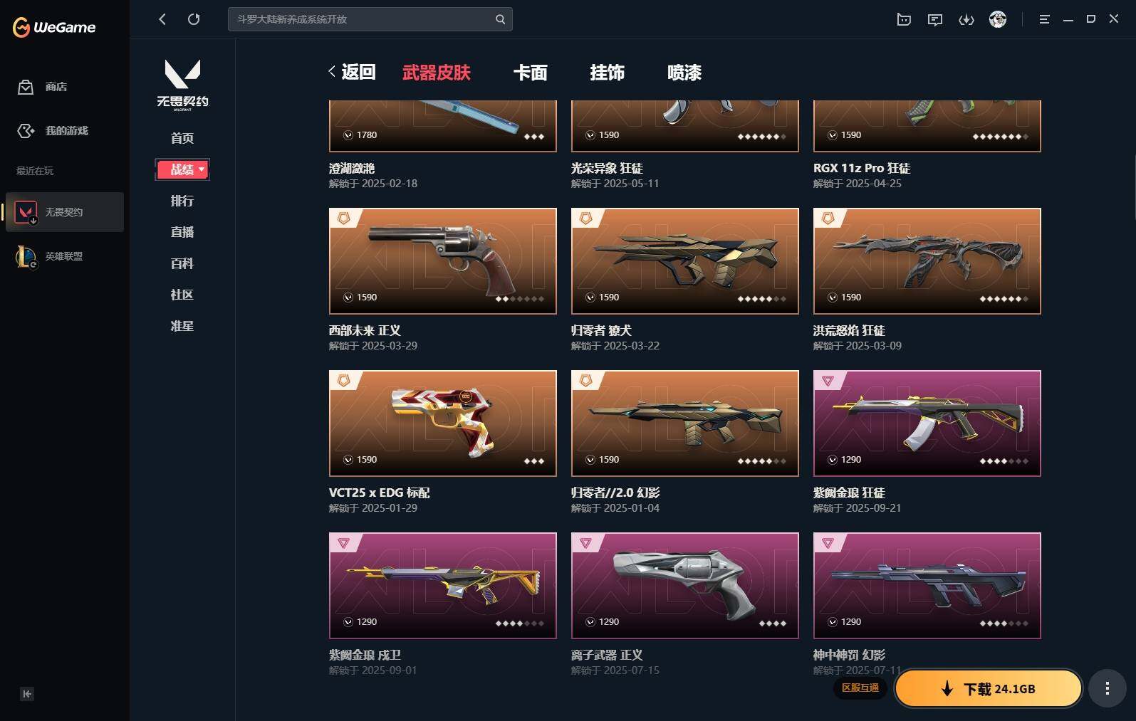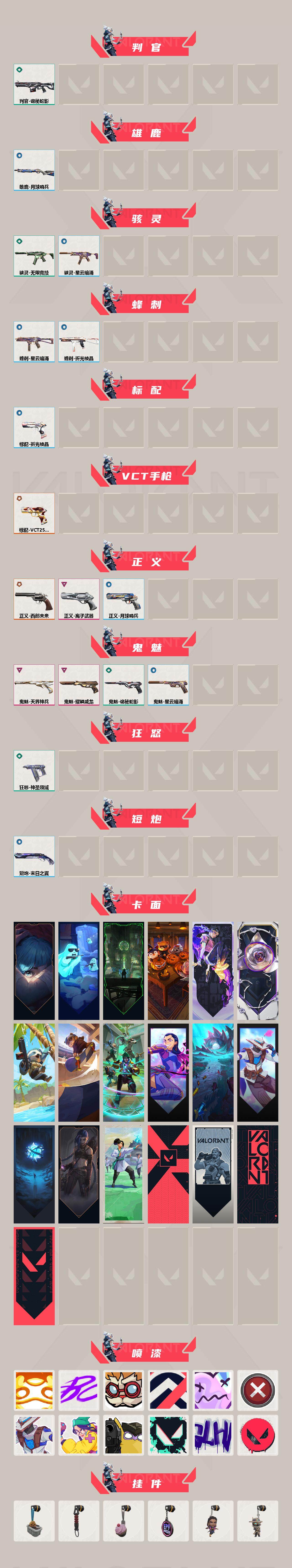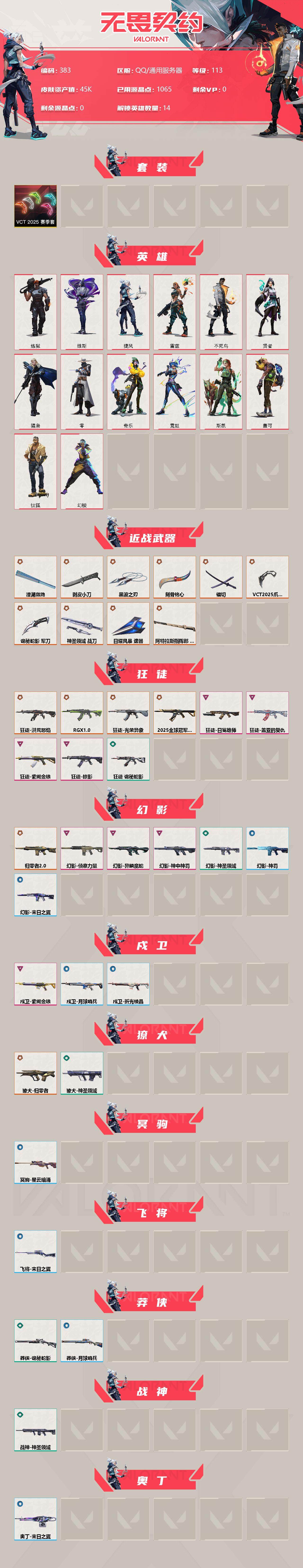 【383】【套装】:vct 2025 赛季套装 【英雄】:幻棱,炼狱,维斯,钛狐,捷风,雷兹,不死鸟,贤者,猎枭,零,奇乐,霓虹,斯凯,盖可 【近战 武器】:近战武器-剥皮小刀,近战武器-vct 2025 爪刀,近战武器-黑波之刃,近战武器-镭切,近战武器-澄湖潋滟,近战武器-刻骨铭心,近战武器-诡秘蛇影 军刀,近战武器-神圣领域 战刀,近战武器-日耀风暴 遗器,近战武器-阿特拉斯指挥部 甩棍 【狂徒】:狂徒-2025全球冠军赛,狂徒-洪荒怒焰,狂徒-rgx 11z pro,狂徒-光荣异象,狂徒-掠影,狂徒-盖亚的复仇,狂徒-日冕雄师,狂徒-紫阙金琅,狂徒-诡秘蛇影 【幻影】:幻影-归零者//2.0,幻影-侦察力量,幻影-异鳞魔蛇,幻影-神中神罚,幻影-神圣领域,幻影-神罚,幻影-末日之翼 【戍卫】:戍卫-紫阙金琅,戍卫-月球哨兵,戍卫-折光棱晶 【獠犬】:獠犬-归零者,獠犬-神圣领域 【冥驹】:冥驹-星云暗涌 【飞将】:飞将-末日之翼 【莽侠】:莽侠-诡秘蛇影,莽侠-月球哨兵 【战神】:战神-神圣领域 【奥丁】:奥丁-末日之翼 【判官】:判官-诡秘蛇影 【雄鹿】:雄鹿-月球哨兵 【骇灵】:骇灵-无限竞技,骇灵-星云暗涌 【蜂刺】:蜂刺-星云暗涌,蜂刺-折光棱晶 【标配】:标配-折光棱晶 【vct手呛】:标配-vct25 x edg 【正义】:正义-西部未来,正义-离子武器,正义-月球哨兵 【鬼魅】:鬼魅-天界神兵,鬼魅-耀鳞威龙,鬼魅-诡秘蛇影,鬼魅-星云暗涌 【狂怒】:狂怒-神圣领域 【短炮】:短炮-末日之翼 【卡面】:《双城之战》拥抱 卡面,精灵大战 卡面,欢迎来到底城 卡面,南瓜盛典 卡面,无畏契约:暮蝶 卡面,铁之华 卡面,树懒大作战 卡面,clutch 卡面,哨卫者之领域 卡面,无畏契约go!第一卷:芮娜 卡面,珍珠棘贝 卡面,无畏契约go!第一卷:零 卡面,无垠星环 卡面,《双城之战》金克丝 卡面,夯实根基 卡面,代号红色 卡面,新兵报到 卡面,v契约 卡面,无畏契约 卡面 【喷漆】:嗨宝南瓜灯 喷漆,嘭! 喷漆,都算到了 喷漆,控场勿近 喷漆,伤心心 喷漆,买装还是存钱 喷漆,无畏契约go!第一卷:零 喷漆,无畏契约go!第一卷:奇乐 喷漆,放下武器 喷漆,胜利属于无畏契约 喷漆,glhf 喷漆,无畏契约 喷漆 【挂饰】:悠闲鸡块 挂饰,伞绳 挂饰,《双城之战》小蛋糕 挂饰,第九季//第三幕 纪念币 挂饰,无畏契约go!第一卷 芮娜 挂饰,无畏契约go!第一卷 零 挂饰,薰衣草之心 挂饰,z世代特饮 挂饰,动力机箱 挂饰,vct x edg 挂饰,天外飞客 挂饰,《双城之战》魄罗 挂饰,无畏契约 纪念币 挂饰