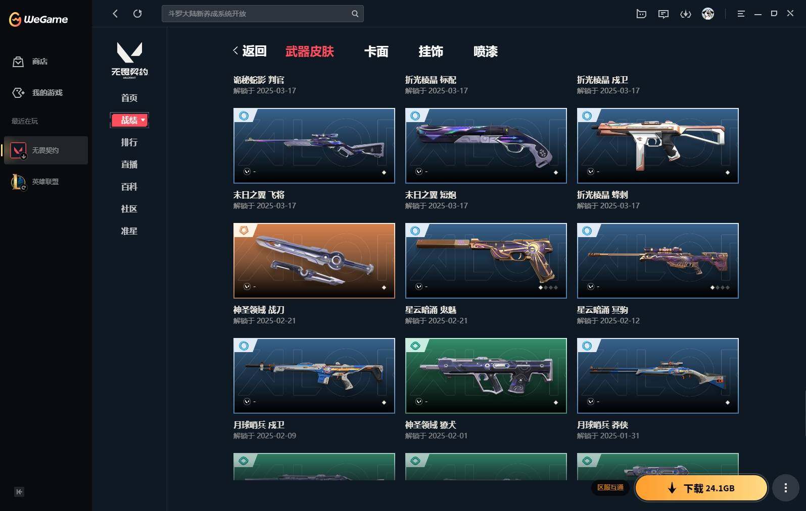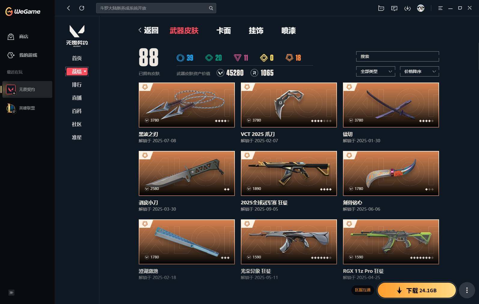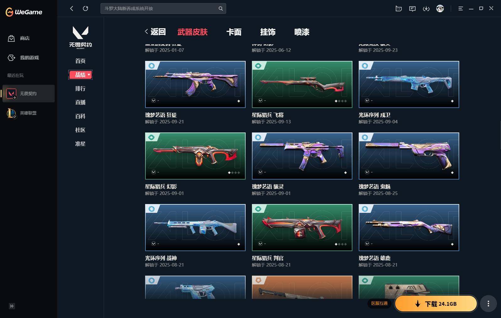【383】【套装】:vct 2025 赛季套装 【英雄】:幻棱,炼狱,维斯,钛狐,捷风,雷兹,不死鸟,贤者,猎枭,零,奇乐,霓虹,斯凯,盖可 【近战 武器】:近战武器-剥皮小刀,近战武器-vct 2025 爪刀,近战武器-黑波之刃,近战武器-镭切,近战武器-澄湖潋滟,近战武器-刻骨铭心,近战武器-诡秘蛇影 军刀,近战武器-神圣领域 战刀,近战武器-日耀风暴 遗器,近战武器-阿特拉斯指挥部 甩棍 【狂徒】:狂徒-2025全球冠军赛,狂徒-洪荒怒焰,狂徒-rgx 11z pro,狂徒-光荣异象,狂徒-掠影,狂徒-盖亚的复仇,狂徒-日冕雄师,狂徒-紫阙金琅,狂徒-诡秘蛇影 【幻影】:幻影-归零者//2.0,幻影-侦察力量,幻影-异鳞魔蛇,幻影-神中神罚,幻影-神圣领域,幻影-神罚,幻影-末日之翼 【戍卫】:戍卫-紫阙金琅,戍卫-月球哨兵,戍卫-折光棱晶 【獠犬】:獠犬-归零者,獠犬-神圣领域 【冥驹】:冥驹-星云暗涌 【飞将】:飞将-末日之翼 【莽侠】:莽侠-诡秘蛇影,莽侠-月球哨兵 【战神】:战神-神圣领域 【奥丁】:奥丁-末日之翼 【判官】:判官-诡秘蛇影 【雄鹿】:雄鹿-月球哨兵 【骇灵】:骇灵-无限竞技,骇灵-星云暗涌 【蜂刺】:蜂刺-星云暗涌,蜂刺-折光棱晶 【标配】:标配-折光棱晶 【vct手呛】:标配-vct25 x edg 【正义】:正义-西部未来,正义-离子武器,正义-月球哨兵 【鬼魅】:鬼魅-天界神兵,鬼魅-耀鳞威龙,鬼魅-诡秘蛇影,鬼魅-星云暗涌 【狂怒】:狂怒-神圣领域 【短炮】:短炮-末日之翼 【卡面】:《双城之战》拥抱 卡面,精灵大战 卡面,欢迎来到底城 卡面,南瓜盛典 卡面,无畏契约:暮蝶 卡面,铁之华 卡面,树懒大作战 卡面,clutch 卡面,哨卫者之领域 卡面,无畏契约go!第一卷:芮娜 卡面,珍珠棘贝 卡面,无畏契约go!第一卷:零 卡面,无垠星环 卡面,《双城之战》金克丝 卡面,夯实根基 卡面,代号红色 卡面,新兵报到 卡面,v契约 卡面,无畏契约 卡面 【喷漆】:嗨宝南瓜灯 喷漆,嘭! 喷漆,都算到了 喷漆,控场勿近 喷漆,伤心心 喷漆,买装还是存钱 喷漆,无畏契约go!第一卷:零 喷漆,无畏契约go!第一卷:奇乐 喷漆,放下武器 喷漆,胜利属于无畏契约 喷漆,glhf 喷漆,无畏契约 喷漆 【挂饰】:悠闲鸡块 挂饰,伞绳 挂饰,《双城之战》小蛋糕 挂饰,第九季//第三幕 纪念币 挂饰,无畏契约go!第一卷 芮娜 挂饰,无畏契约go!第一卷 零 挂饰,薰衣草之心 挂饰,z世代特饮 挂饰,动力机箱 挂饰,vct x edg 挂饰,天外飞客 挂饰,《双城之战》魄罗 挂饰,无畏契约 纪念币 挂饰