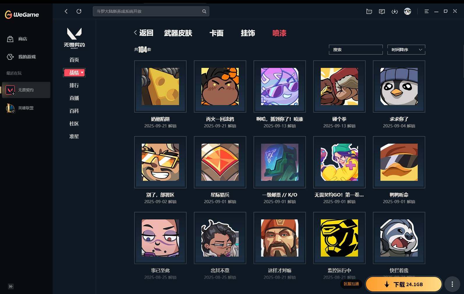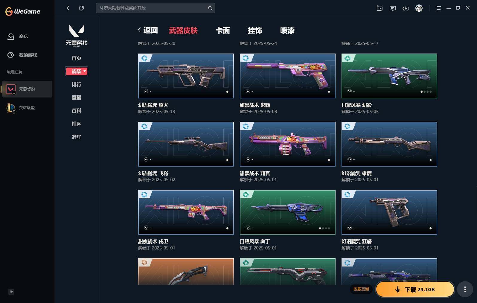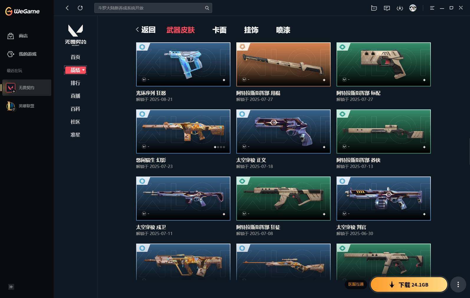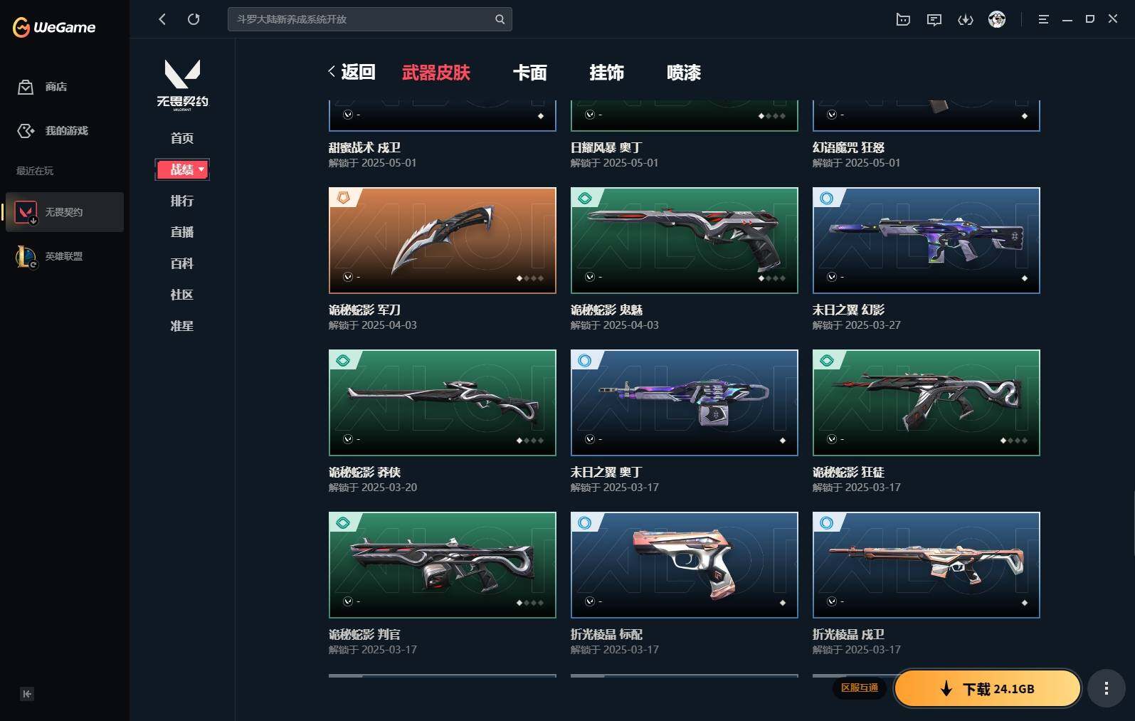 【383】【套装】:vct 2025 赛季套装 【英雄】:幻棱,炼狱,维斯,钛狐,捷风,雷兹,不死鸟,贤者,猎枭,零,奇乐,霓虹,斯凯,盖可 【近战 武器】:近战武器-剥皮小刀,近战武器-vct 2025 爪刀,近战武器-黑波之刃,近战武器-镭切,近战武器-澄湖潋滟,近战武器-刻骨铭心,近战武器-诡秘蛇影 军刀,近战武器-神圣领域 战刀,近战武器-日耀风暴 遗器,近战武器-阿特拉斯指挥部 甩棍 【狂徒】:狂徒-2025全球冠军赛,狂徒-洪荒怒焰,狂徒-rgx 11z pro,狂徒-光荣异象,狂徒-掠影,狂徒-盖亚的复仇,狂徒-日冕雄师,狂徒-紫阙金琅,狂徒-诡秘蛇影 【幻影】:幻影-归零者//2.0,幻影-侦察力量,幻影-异鳞魔蛇,幻影-神中神罚,幻影-神圣领域,幻影-神罚,幻影-末日之翼 【戍卫】:戍卫-紫阙金琅,戍卫-月球哨兵,戍卫-折光棱晶 【獠犬】:獠犬-归零者,獠犬-神圣领域 【冥驹】:冥驹-星云暗涌 【飞将】:飞将-末日之翼 【莽侠】:莽侠-诡秘蛇影,莽侠-月球哨兵 【战神】:战神-神圣领域 【奥丁】:奥丁-末日之翼 【判官】:判官-诡秘蛇影 【雄鹿】:雄鹿-月球哨兵 【骇灵】:骇灵-无限竞技,骇灵-星云暗涌 【蜂刺】:蜂刺-星云暗涌,蜂刺-折光棱晶 【标配】:标配-折光棱晶 【vct手呛】:标配-vct25 x edg 【正义】:正义-西部未来,正义-离子武器,正义-月球哨兵 【鬼魅】:鬼魅-天界神兵,鬼魅-耀鳞威龙,鬼魅-诡秘蛇影,鬼魅-星云暗涌 【狂怒】:狂怒-神圣领域 【短炮】:短炮-末日之翼 【卡面】:《双城之战》拥抱 卡面,精灵大战 卡面,欢迎来到底城 卡面,南瓜盛典 卡面,无畏契约:暮蝶 卡面,铁之华 卡面,树懒大作战 卡面,clutch 卡面,哨卫者之领域 卡面,无畏契约go!第一卷:芮娜 卡面,珍珠棘贝 卡面,无畏契约go!第一卷:零 卡面,无垠星环 卡面,《双城之战》金克丝 卡面,夯实根基 卡面,代号红色 卡面,新兵报到 卡面,v契约 卡面,无畏契约 卡面 【喷漆】:嗨宝南瓜灯 喷漆,嘭! 喷漆,都算到了 喷漆,控场勿近 喷漆,伤心心 喷漆,买装还是存钱 喷漆,无畏契约go!第一卷:零 喷漆,无畏契约go!第一卷:奇乐 喷漆,放下武器 喷漆,胜利属于无畏契约 喷漆,glhf 喷漆,无畏契约 喷漆 【挂饰】:悠闲鸡块 挂饰,伞绳 挂饰,《双城之战》小蛋糕 挂饰,第九季//第三幕 纪念币 挂饰,无畏契约go!第一卷 芮娜 挂饰,无畏契约go!第一卷 零 挂饰,薰衣草之心 挂饰,z世代特饮 挂饰,动力机箱 挂饰,vct x edg 挂饰,天外飞客 挂饰,《双城之战》魄罗 挂饰,无畏契约 纪念币 挂饰