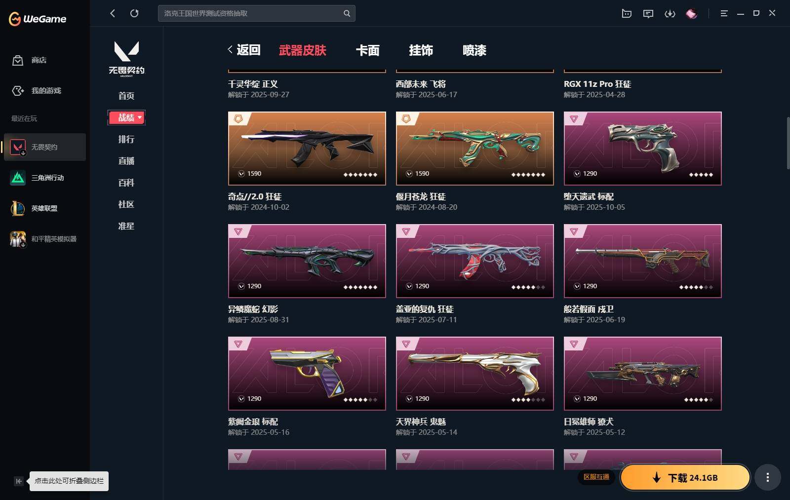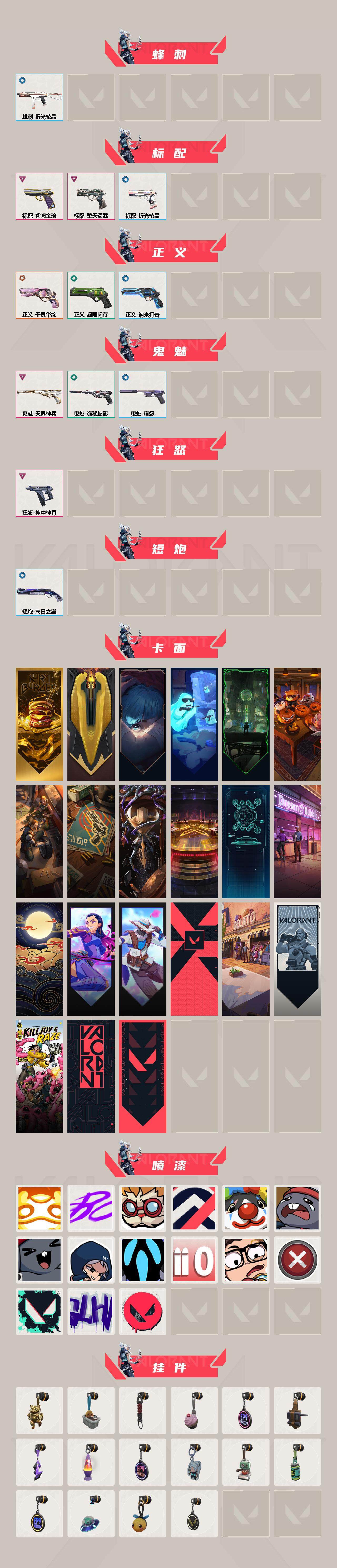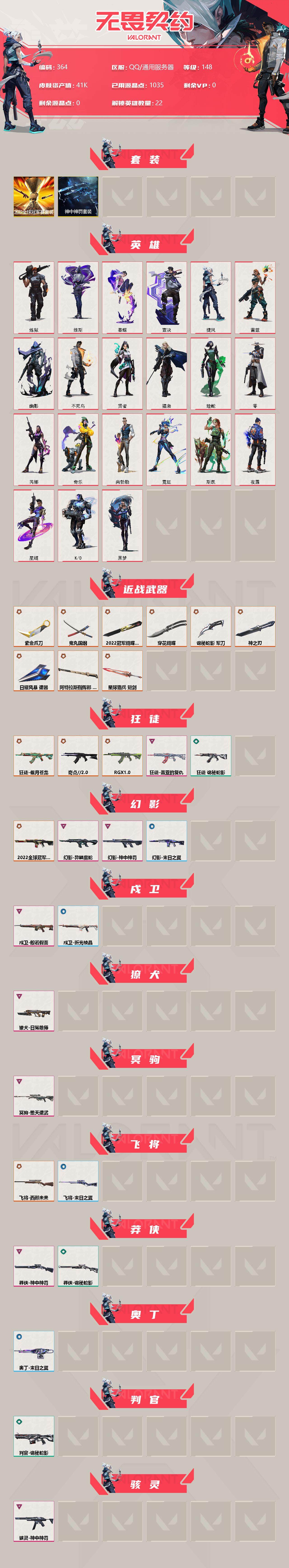 【364】【套装】:2022全球冠军赛套装,神中神罚套装 【英雄】:炼狱,维斯,暮蝶,壹决,捷风,雷兹,幽影,不死鸟,贤者,猎枭,蝰蛇,零,芮娜,奇乐,尚勃勒,霓虹,斯凯,夜露,星礈,k/o,黑梦 【近战 武器】:近战武器-2022全球冠军赛 蝴蝶刀,近战武器-神之刃,近战武器-穿花蝴蝶,近战武器-紫金爪刀,近战武器-鬼丸国纲,近战武器-诡秘蛇影 军刀,近战武器-日耀风暴 遗器,近战武器-阿特拉斯指挥部 甩棍,近战武器-星际猎兵 短剑 【狂徒】:狂徒-奇点//2.0,狂徒-偃月苍龙,狂徒-rgx 11z pro,狂徒-盖亚的复仇,狂徒-诡秘蛇影 【幻影】:幻影-2022全球冠军赛,幻影-异鳞魔蛇,幻影-神中神罚,幻影-末日之翼 【戍卫】:戍卫-般若假面,戍卫-折光棱晶 【獠犬】:獠犬-日冕雄师 【冥驹】:冥驹-堕天遗武 【飞将】:飞将-西部未来,飞将-末日之翼 【莽侠】:莽侠-神中神罚,莽侠-诡秘蛇影 【奥丁】:奥丁-末日之翼 【判官】:判官-诡秘蛇影 【骇灵】:骇灵-神中神罚 【蜂刺】:蜂刺-折光棱晶 【标配】:标配-堕天遗武,标配-紫阙金琅,标配-折光棱晶 【正义】:正义-千灵华绽,正义-超限闪存,正义-纳米打击 【鬼魅】:鬼魅-天界神兵,鬼魅-诡秘蛇影,鬼魅-宿怨 【狂怒】:狂怒-神中神罚 【短炮】:短炮-末日之翼 【卡面】:终章:激斗汉堡 卡面,进入射程 卡面,《双城之战》拥抱 卡面,精灵大战 卡面,欢迎来到底城 卡面,南瓜盛典 卡面,修车达人 卡面,正义的化身 卡面,时间到 卡面,最高舞台 卡面,声感陷阱设计图 卡面,梦幻奶茶 卡面,纤云弄巧 卡面,无畏契约go!第一卷:芮娜 卡面,无畏契约go!第一卷:零 卡面,代号红色 卡面,冰淇淋店 卡面,新兵报到 卡面,友军火力 卡面,v契约 卡面,无畏契约 卡面 【喷漆】:嗨宝南瓜灯 喷漆,嘭! 喷漆,都算到了 喷漆,控场勿近 喷漆,小丑猫 喷漆,熊抱 喷漆,超级粉丝 喷漆,捷风差距 喷漆,惊声尖叫 喷漆,拼一呛 喷漆,新潮流 喷漆,买装还是存钱 喷漆,胜利属于无畏契约 喷漆,glhf 喷漆,无畏契约 喷漆 【挂饰】:终章:猫猫木乃伊 挂饰,悠闲鸡块 挂饰,伞绳 挂饰,《双城之战》小蛋糕 挂饰,第九季//第三幕 纪念币 挂饰,工具腰带 挂饰,奇点//2.0 挂饰,熔岩灯 挂饰,第九季//第二幕 纪念币 挂饰,袖珍捷风 挂饰,迷你浓缩 挂饰,z世代特饮 挂饰,第九季//第一幕 纪念币 挂饰,天外飞客 挂饰,针织蜜蜂 挂饰,无畏契约 纪念币 挂饰