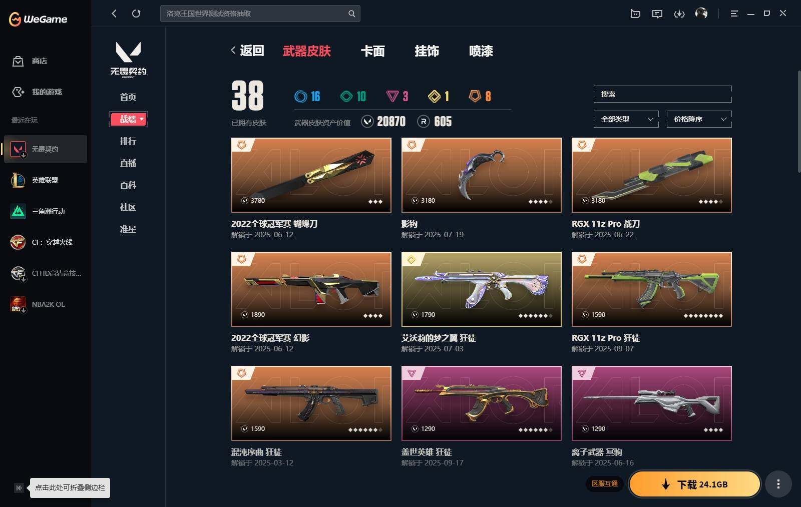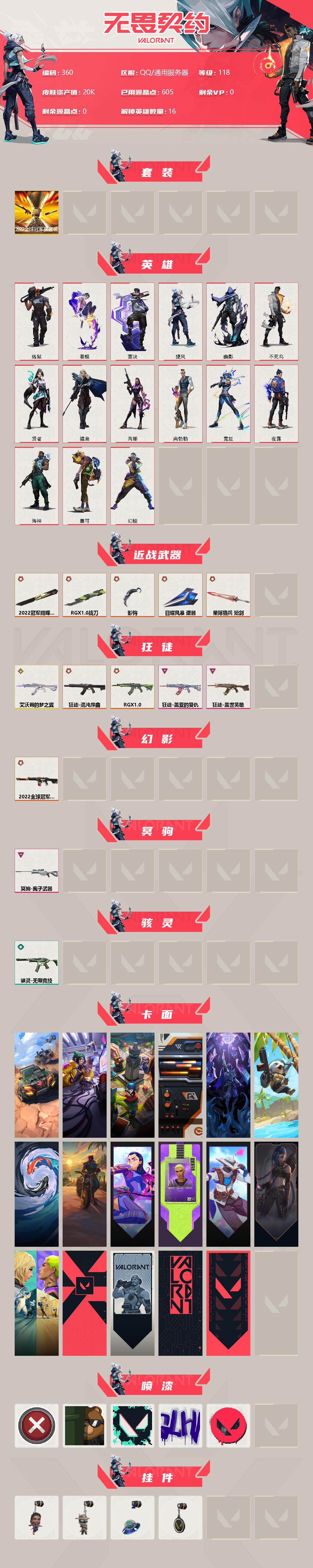 【360】【套装】:2022全球冠军赛套装 【英雄】:幻棱,炼狱,暮蝶,壹决,捷风,幽影,不死鸟,贤者,猎枭,芮娜,尚勃勒,霓虹,夜露,海神,盖可 【近战 武器】:近战武器-2022全球冠军赛 蝴蝶刀,近战武器-影钩,近战武器-rgx 11z pro 战刀,近战武器-日耀风暴 遗器,近战武器-星际猎兵 短剑 【狂徒】:狂徒-艾沃莉的梦之翼,狂徒-混沌序曲,狂徒-rgx 11z pro,狂徒-盖世英雄,狂徒-盖亚的复仇 【幻影】:幻影-2022全球冠军赛 【冥驹】:冥驹-离子武器 【骇灵】:骇灵-无限竞技 【卡面】:逆冲蛮牛 卡面,排除故障 卡面,战术桌游 卡面,模拟赫兹 卡面,失而复得 卡面,树懒大作战 卡面,红鳞松叶 卡面,暂别喧嚣 卡面,无畏契约go!第一卷:芮娜 卡面,盖可工牌 卡面,无畏契约go!第一卷:零 卡面,《双城之战》金克丝 卡面,钢锁vs盖可 卡面,代号红色 卡面,新兵报到 卡面,v契约 卡面,无畏契约 卡面 【喷漆】:买装还是存钱 喷漆,暗中偷瞄 喷漆,胜利属于无畏契约 喷漆,glhf 喷漆,无畏契约 喷漆 【挂饰】:无畏契约go!第一卷 芮娜 挂饰,无畏契约go!第一卷 零 挂饰,天外飞客 挂饰,无畏契约 纪念币 挂饰