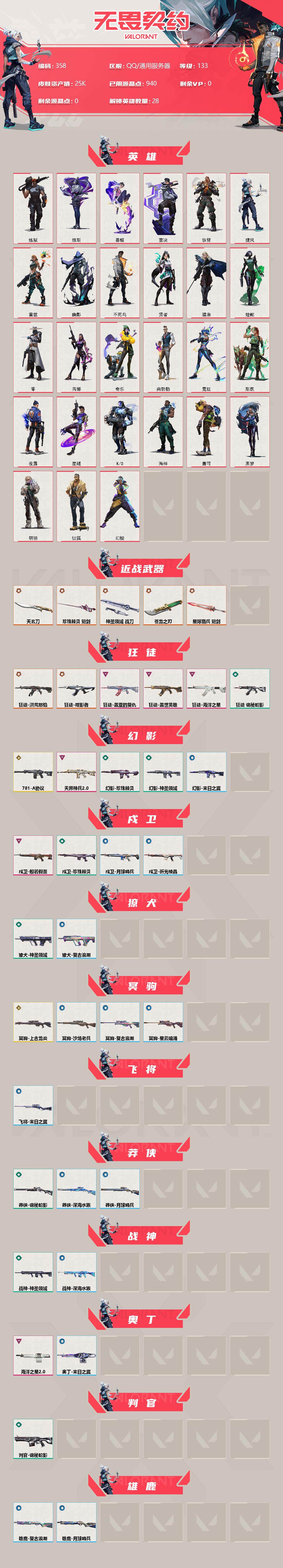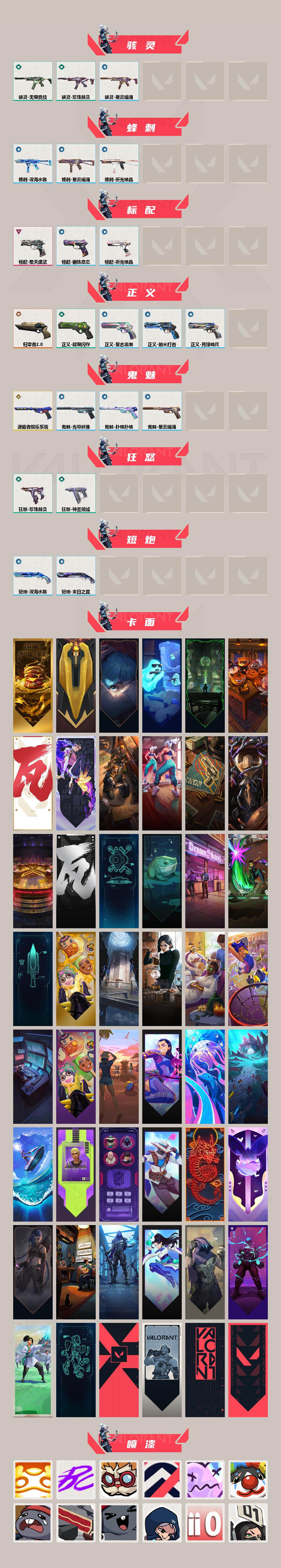 【358】【英雄】:幻棱,炼狱,维斯,暮蝶,钛狐,壹决,铁臂,捷风,雷兹,幽影,不死鸟,贤者,猎枭,蝰蛇,零,芮娜,奇乐,尚勃勒,霓虹,斯凯,夜露,星礈,k/o,海神,盖可,黑梦,钢锁 【近战 武器】:近战武器-5周年//公测重制版 苍龙之刃,近战武器-珍珠棘贝 短剑,近战武器-天玄刀,近战武器-神圣领域 战刀,近战武器-星际猎兵 短剑 【狂徒】:狂徒-洪荒怒焰,狂徒-噬影者,狂徒-盖世英雄,狂徒-盖亚的复仇,狂徒-海洋之星,狂徒-诡秘蛇影 【幻影】:幻影-781-a协议,幻影-天界神兵//2.0,幻影-珍珠棘贝,幻影-神圣领域,幻影-末日之翼 【戍卫】:戍卫-般若假面,戍卫-珍珠棘贝,戍卫-月球哨兵,戍卫-折光棱晶 【獠犬】:獠犬-神圣领域,獠犬-复古浪潮 【冥驹】:冥驹-上古龙炎,冥驹-复古浪潮,冥驹-沙场老兵,冥驹-星云暗涌 【飞将】:飞将-末日之翼 【莽侠】:莽侠-诡秘蛇影,莽侠-深海水族,莽侠-月球哨兵 【战神】:战神-神圣领域,战神-深海水族 【奥丁】:奥丁-海洋之星//2.0,奥丁-末日之翼 【判官】:判官-诡秘蛇影 【雄鹿】:雄鹿-复古浪潮,雄鹿-月球哨兵 【骇灵】:骇灵-珍珠棘贝,骇灵-无限竞技,骇灵-星云暗涌 【蜂刺】:蜂刺-深海水族,蜂刺-星云暗涌,蜂刺-折光棱晶 【标配】:标配-堕天遗武,标配-钢铁意志,标配-折光棱晶 【正义】:正义-归零者//2.0,正义-超限闪存,正义-复古浪潮,正义-纳米打击,正义-月球哨兵 【鬼魅】:鬼魅-源能者娱乐系统,鬼魅-光导纤维,鬼魅-扑棱扑棱,鬼魅-星云暗涌 【狂怒】:狂怒-珍珠棘贝,狂怒-神圣领域 【短炮】:短炮-深海水族,短炮-末日之翼 【卡面】:终章:激斗汉堡 卡面,进入射程 卡面,《双城之战》拥抱 卡面,精灵大战 卡面,欢迎来到底城 卡面,南瓜盛典 卡面,vct cn首冠 卡面,无畏契约:暮蝶 卡面,修车达人 卡面,热舞环节 卡面,正义的化身 卡面,时间到 卡面,最高舞台 卡面,先瓦为敬 银色 卡面,声感陷阱设计图 卡面,霓帧牛蛙 卡面,梦幻奶茶 卡面,源能反应 卡面,零点嗅探设计图 卡面,终章:瓦娃脸雪糕 卡面,表象之下 卡面,虹吸式咖啡壶 卡面,源能者美容 卡面,脚踝终结者 卡面 ,夜班 卡面,瓦娃脸雪糕 卡面 ,沙雕爆能器 卡面,无畏契约go!第一卷:芮娜 卡面,深海水族 卡面,珍珠棘贝 卡面,复古浪潮 卡面,盖可工牌 卡面,清除名单 卡面,无畏契约go!第一卷:零 卡面,龍记 卡面,化茧成蝶 卡面,《双城之战》金克丝 卡面,完美调谐 卡面 ,暗呛 卡面,无畏契约go!第一卷:贤者 卡面,黑影先生的咖啡! 卡面,势不可挡//k/o 卡面,夯实根基 卡面,铁臂设计图 卡面,代号红色 卡面,新兵报到 卡面,v契约 卡面,无畏契约 卡面 【喷漆】:嗨宝南瓜灯 喷漆,嘭! 喷漆,都算到了 喷漆,控场勿近 喷漆,伤心心 喷漆,小丑猫 喷漆,熊抱 喷漆,蛋糕还是爆能器? 喷漆,超级粉丝 喷漆,捷风差距 喷漆,拼一呛 喷漆,我觉得不行 喷漆,我的刀呢? 喷漆,情绪控制 喷漆,哨卫滑步 喷漆,倒吸一口凉气 喷漆,uwu 喷漆,新潮流 喷漆,逮到一个 喷漆,一个人的孤岛 喷漆,双人比心 喷漆,不予置评 喷漆,三熊合一 喷漆,要喝完噢! 喷漆,双击点赞 喷漆,珍珠棘贝 喷漆,深海水族 喷漆,禁止标配 喷漆 ,铁臂尴尬 喷漆,买装还是存钱 喷漆,醒狮贺春 喷漆,无畏契约go!第一卷:芮娜 喷漆,红鳞 喷漆,无畏契约go!第一卷:零 喷漆,无畏契约go!第一卷:捷风 喷漆,无畏契约go!第一卷:贤者 喷漆,暴走萝莉 喷漆,松叶 喷漆,无畏契约go!第一卷:奇乐 喷漆,旅行小熊 喷漆,蕊形灯 喷漆,老铁困了 喷漆,胜利属于无畏契约 喷漆,glhf 喷漆,无畏契约 喷漆 【挂饰】:终章:猫猫木乃伊 挂饰,悠闲鸡块 挂饰,伞绳 挂饰,《双城之战》小蛋糕 挂饰,第九季//第三幕 纪念币 挂饰,工具腰带 挂饰,鱼骨头 挂饰,熔岩灯 挂饰,第九季//第二幕 纪念币 挂饰,袖珍捷风 挂饰,迷你浓缩 挂饰,第九季//第一幕 纪念币 挂饰,荧光棒 挂饰,第八季//第三幕 纪念币 挂饰,终章:扭结饼干 挂饰 ,战术抓娃娃:阿丹 挂饰 ,瓶中信 挂饰,复古浪潮 挂饰,深海水母 挂饰,传世莲华 挂饰,扭结饼干 挂饰 ,珍珠棘贝 挂饰,深海水族 挂饰 ,第八季//第二幕 纪念币 挂饰 ,天外飞客 挂饰,好运福爪 挂饰,终章:晒出笑脸 挂饰,红鳞松叶 挂饰,《双城之战》魄罗 挂饰,酷闪轮滑 挂饰,瞄这里 挂饰,第八季//第一幕 纪念币 挂饰,第七季//第三幕 纪念币 挂饰,无畏契约 纪念币 挂饰