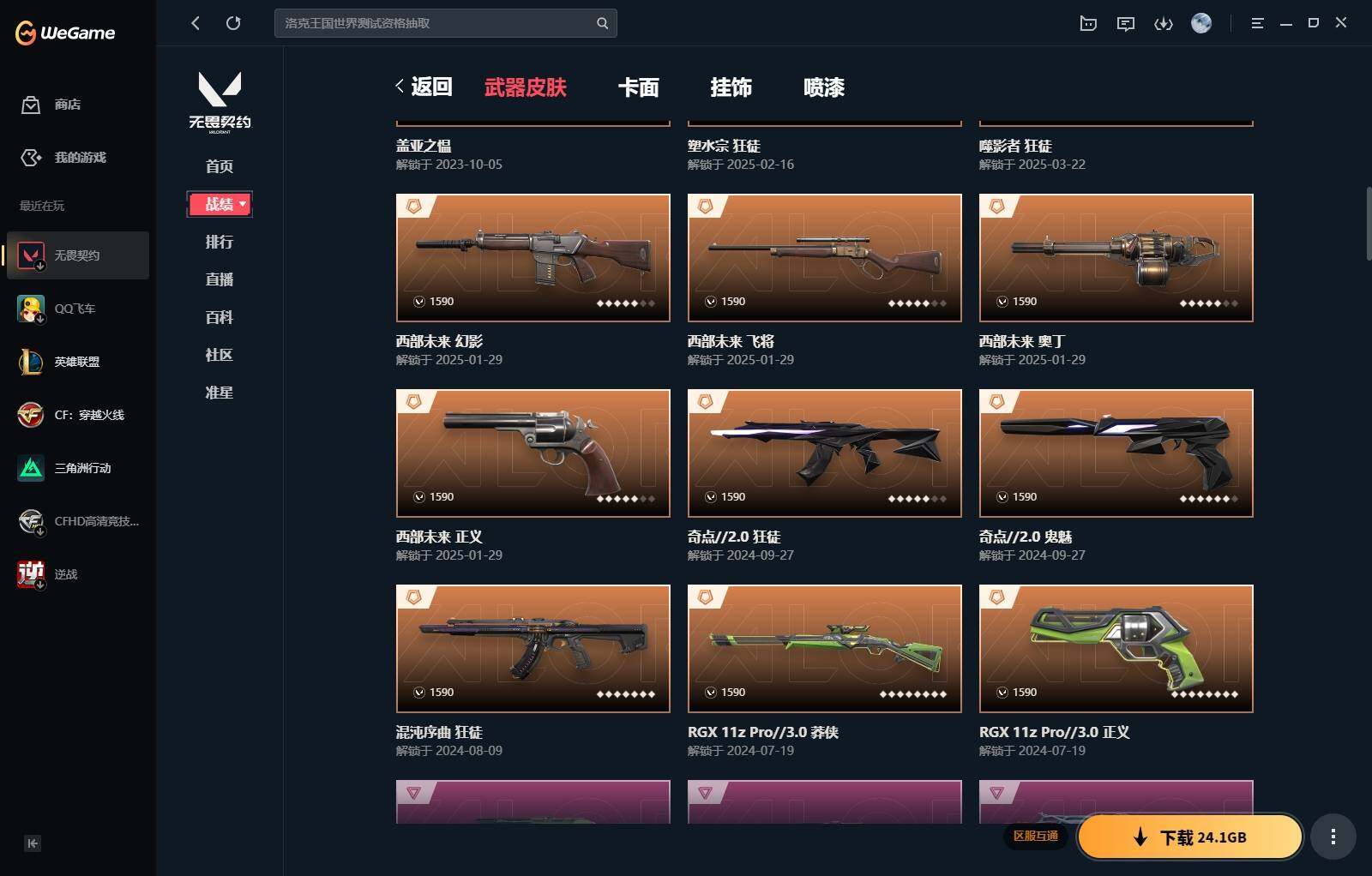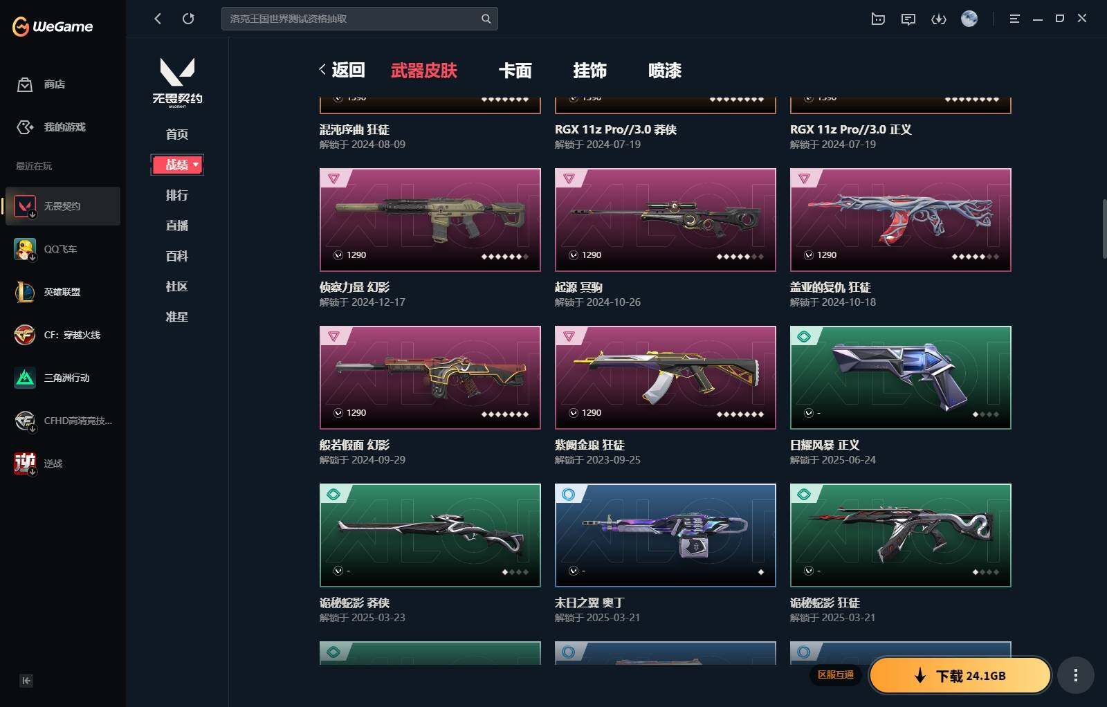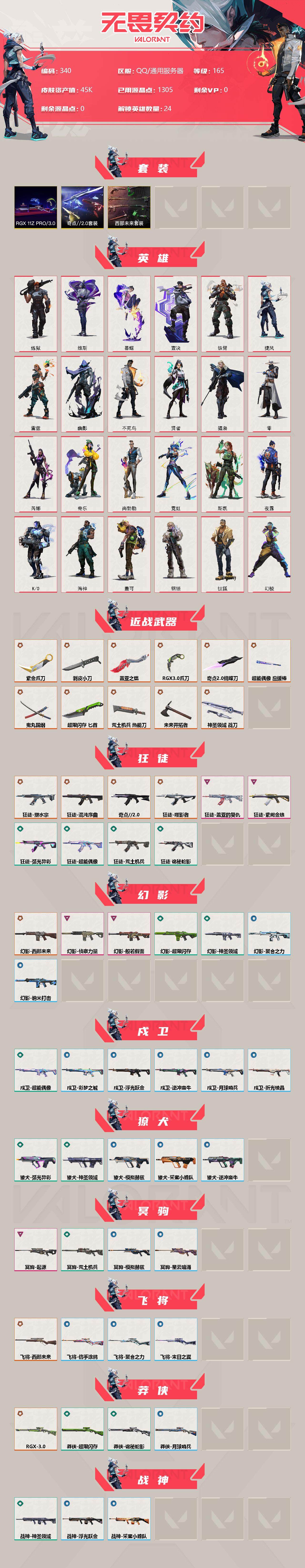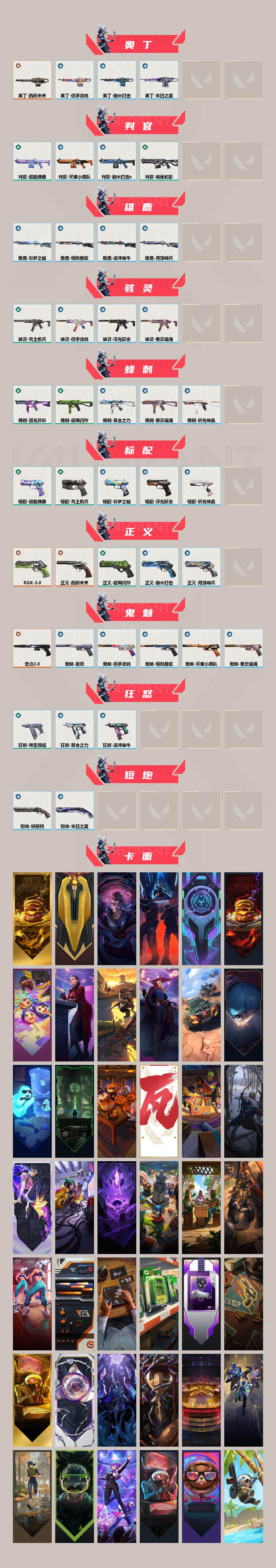 【340】【套装】:西部未来套装,rgx 11z pro//3.0套装,奇点//2.0套装 【英雄】:幻棱,炼狱,维斯,暮蝶,钛狐,壹决,铁臂,捷风,雷兹,幽影,不死鸟,贤者,猎枭,零,芮娜,奇乐,尚勃勒,霓虹,斯凯,夜露,k/o,海神,盖可,钢锁 【近战 武器】:近战武器-剥皮小刀,近战武器-奇点//2.0 蝴蝶刀,近战武器-紫金爪刀,近战武器-rgx 11z pro//3.0 爪刀,近战武器-鬼丸国纲,近战武器-未来开拓者,近战武器-超能偶像 应援棒,近战武器-超限闪存 匕首,近战武器-盖亚之愠,近战武器-荒土机兵 热能刀,近战武器-神圣领域 战刀 【狂徒】:狂徒-混沌序曲,狂徒-奇点//2.0,狂徒-塑水宗,狂徒-噬影者,狂徒-盖亚的复仇,狂徒-紫阙金琅,狂徒-超能偶像,狂徒-弧光异彩,狂徒-荒土机兵,狂徒-诡秘蛇影 【幻影】:幻影-西部未来,幻影-般若假面,幻影-侦察力量,幻影-超限闪存,幻影-神圣领域,幻影-聚合之力,幻影-纳米打击,幻影-西部未来 【戍卫】:戍卫-超能偶像,戍卫-彩梦之城,戍卫-浮光跃金,戍卫-逆冲蛮牛,戍卫-月球哨兵,戍卫-折光棱晶 【獠犬】:獠犬-弧光异彩,獠犬-神圣领域,獠犬-采蜜小蜂队,獠犬-模拟赫兹,獠犬-逆冲蛮牛 【冥驹】:冥驹-起源,冥驹-荒土机兵,冥驹-模拟赫兹,冥驹-星云暗涌 【飞将】:飞将-西部未来,飞将-聚合之力,飞将-信手涂鸦,飞将-末日之翼 【莽侠】:莽侠-rgx 11z pro//3.0,莽侠-超限闪存,莽侠-诡秘蛇影,莽侠-月球哨兵 【战神】:战神-神圣领域,战神-采蜜小蜂队,战神-浮光跃金 【奥丁】:奥丁-西部未来,奥丁-纳米打击,奥丁-信手涂鸦,奥丁-末日之翼 【判官】:判官-超能偶像,判官-诡秘蛇影,判官-采蜜小蜂队,判官-纳米打击x 【雄鹿】:雄鹿-彩梦之城,雄鹿-模拟赫兹,雄鹿-逆冲蛮牛,雄鹿-月球哨兵 【骇灵】:骇灵-荒土机兵,骇灵-浮光跃金,骇灵-信手涂鸦,骇灵-星云暗涌 【蜂刺】:蜂刺-超限闪存,蜂刺-弧光异彩,蜂刺-聚合之力,蜂刺-星云暗涌,蜂刺-折光棱晶 【标配】:标配-超能偶像,标配-荒土机兵,标配-彩梦之城,标配-浮光跃金,标配-折光棱晶 【正义】:正义-rgx 11z pro//3.0,正义-西部未来,正义-超限闪存,正义-纳米打击,正义-月球哨兵 【鬼魅】:鬼魅-奇点//2.0,鬼魅-采蜜小蜂队,鬼魅-模拟赫兹,鬼魅-宿怨,鬼魅-信手涂鸦,鬼魅-星云暗涌 【狂怒】:狂怒-神圣领域,狂怒-聚合之力,狂怒-逆冲蛮牛 【短炮】:短炮-好搭档,短炮-末日之翼 【卡面】:终章:激斗汉堡 卡面,进入射程 卡面,分崩离析 卡面,纳米打击 卡面,抑制技术 卡面,激斗汉堡 卡面,瓦娃脸雪糕 p2 卡面,从黄昏到黎明 卡面,荒土机兵 卡面,银弹猎手 卡面,逆冲蛮牛 卡面,《双城之战》拥抱 卡面,精灵大战 卡面,欢迎来到底城 卡面,南瓜盛典 卡面,vct cn首冠 卡面,唱片的故事 卡面,钢弓与箭弦 卡面,无畏契约:暮蝶 卡面,排除故障 卡面,奇点//2.0 卡面,战术桌游 卡面,悠享食光 卡面,修车达人 卡面,热舞环节 卡面,模拟赫兹 卡面,浮光跃金 卡面,超限闪存 卡面,维斯工牌 卡面,正义的化身 卡面,终章:生意人麦宝 卡面,铁之华 卡面,失而复得 卡面,时间到 卡面,最高舞台 卡面,复活专家 卡面,归乡 // 蝰蛇 卡面,rgx 11z pro//3.0 卡面,超能偶像 卡面,生意人麦宝 卡面,音熊登场 卡面,树懒大作战 卡面,声感陷阱设计图 卡面,红鳞松叶 卡面,钢锁工牌 卡面,战术小伙伴的夏日 卡面,采蜜小蜂队 卡面,聚合之力 卡面,梦幻奶茶 卡面,源能反应 卡面,零点嗅探设计图 卡面,无畏契约:蝰蛇 卡面,沙雕爆能器 卡面,无畏契约go!第一卷:芮娜 卡面,清除名单 卡面,无畏契约go!第一卷:零 卡面,龍记 卡面,《双城之战》金克丝 卡面,完美调谐 卡面 ,暗呛 卡面,夯实根基 卡面,"luie" 卡面,热烈欢迎 卡面,铁臂设计图 卡面,代号红色 卡面,冰淇淋店 卡面,新兵报到 卡面,友军火力 卡面,v契约 卡面,无畏契约 卡面 【喷漆】:小小心意 喷漆,战“素”兔 喷漆,宇宙的指引 喷漆,请求重启 喷漆,逆冲蛮牛 喷漆,纳米打击 喷漆,鼻尖上的蝴蝶 喷漆,简笔画黯兽 喷漆,独守蝰腹 喷漆,他们将落荒而逃 喷漆,通缉:战术企鹅 喷漆,荒土机兵 喷漆,别挡我吃球! 喷漆,嗨宝南瓜灯 喷漆,嘭! 喷漆,都算到了 喷漆,控场勿近 喷漆,皮蛋呼呼 喷漆,像素星礈 喷漆,图谋不轨的零 喷漆,伤心心 喷漆,小丑猫 喷漆,模拟赫兹 喷漆,高丽风情小熊 喷漆,奇点//2.0 喷漆,蹲到一个 喷漆,全力集中 喷漆,超限闪存 喷漆,rua一下 喷漆,熊抱 喷漆,蛋糕还是爆能器? 喷漆,高丽风情小虎 喷漆,记在小本本 喷漆,防弹企鹅 喷漆,高丽风情小蛙 喷漆,又被闪了 喷漆,终极羞辱 喷漆,超级粉丝 喷漆,黯兽卖萌 喷漆,捷风差距 喷漆,惊声尖叫 喷漆,2021冠军巡回赛花火 喷漆,五人成星 喷漆,超能偶像 喷漆,rgx 11z pro//3.0 喷漆,放我出去 喷漆,战术熊的巴拉莱卡琴 喷漆,掩护我 喷漆,大佬发呛 喷漆,边缘试探 喷漆,拼一呛 喷漆,聚合之力 喷漆,采蜜小蜂队 喷漆,梦幻小队 喷漆,五个全都齐了 喷漆,我觉得不行 喷漆,我的刀呢? 喷漆,喜欢哪种毒? 喷漆,双击点赞 喷漆,买装还是存钱 喷漆,醒狮贺春 喷漆,红鳞 喷漆,松叶 喷漆,旅行小熊 喷漆,蕊形灯 喷漆,凌空惊吓 喷漆,老铁困了 喷漆,口袋贤者 喷漆,胜利属于无畏契约 喷漆,glhf 喷漆,无畏契约 喷漆 【挂饰】:v25第三幕:超凡 挂饰,终章:猫猫木乃伊 挂饰,荒土机兵 挂饰,悠闲鸡块 挂饰,猫猫木乃伊 挂饰,水壶 挂饰,纳米打击 挂饰,逆冲蛮牛 挂饰,可爱糖糖 挂饰,伞绳 挂饰,《双城之战》小蛋糕 挂饰,第九季//第三幕 纪念币 挂饰,拳击战术熊 挂饰,工具腰带 挂饰,无