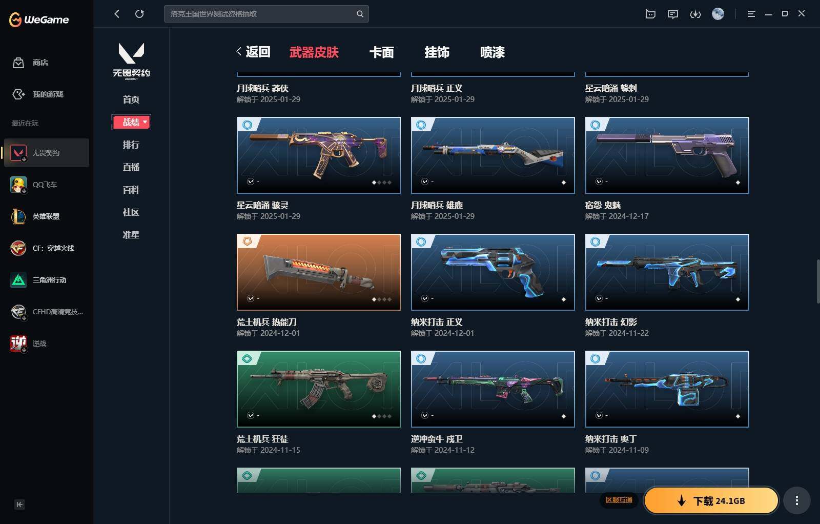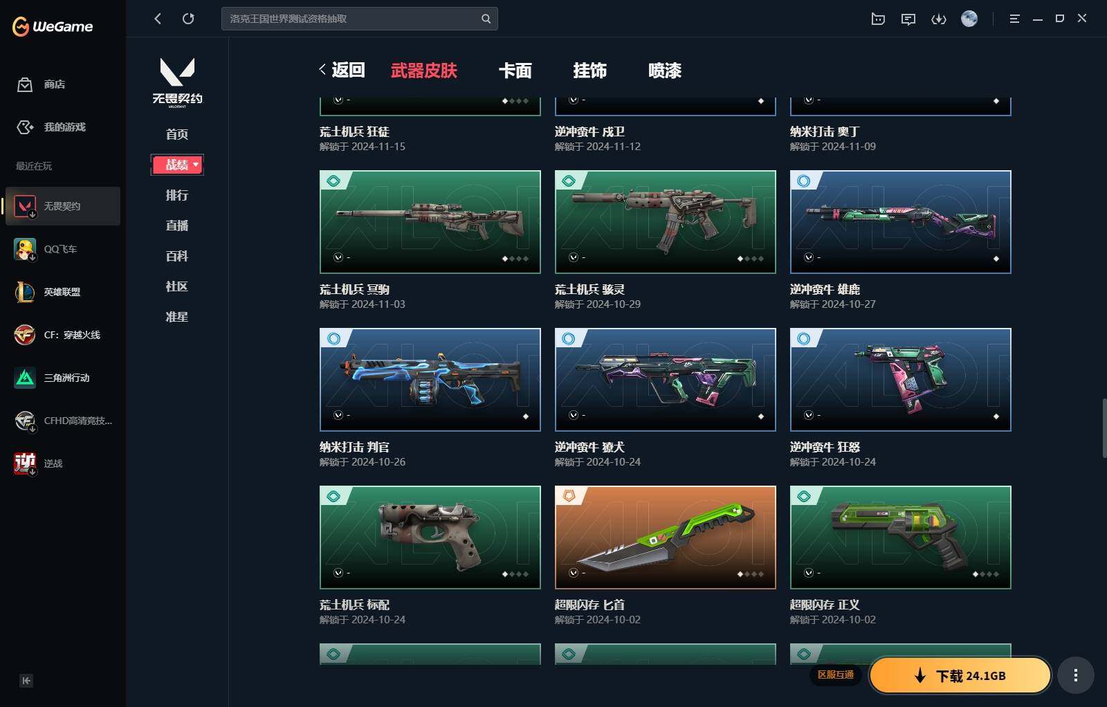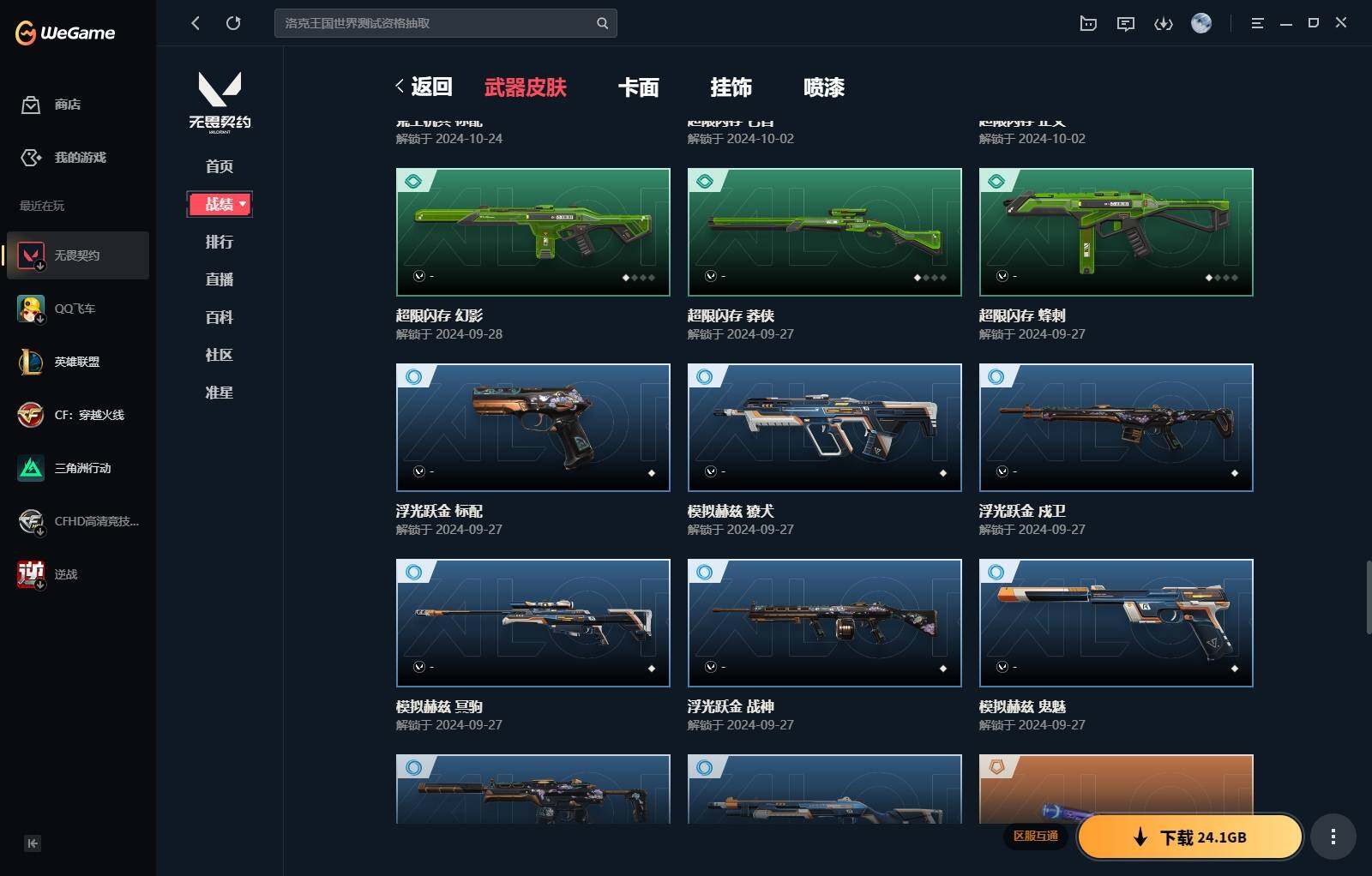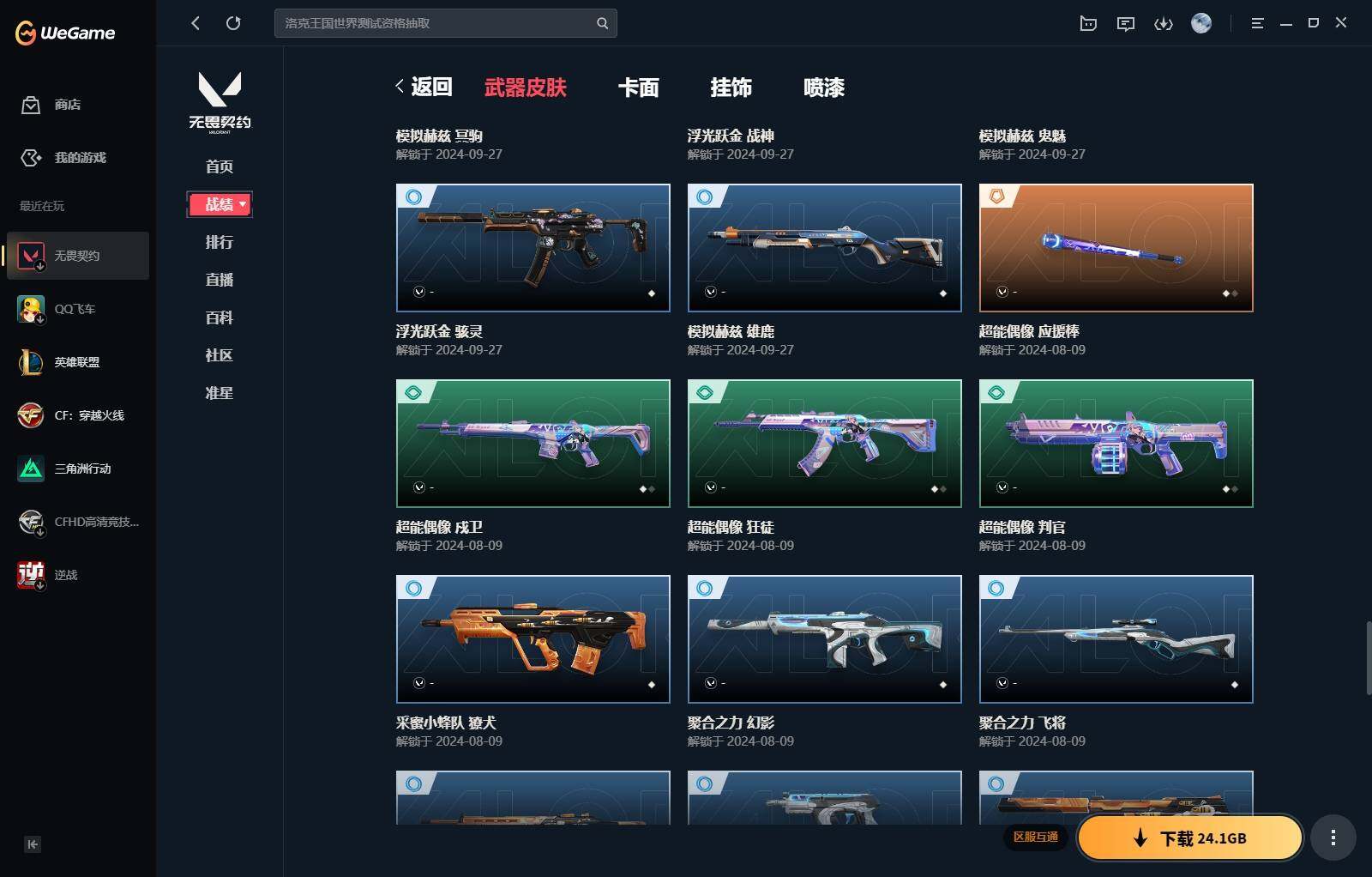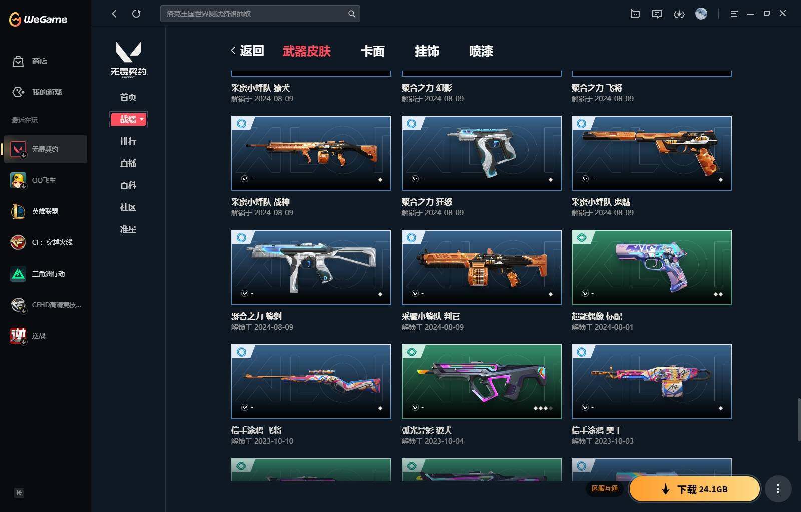 【340】【套装】:西部未来套装,rgx 11z pro//3.0套装,奇点//2.0套装 【英雄】:幻棱,炼狱,维斯,暮蝶,钛狐,壹决,铁臂,捷风,雷兹,幽影,不死鸟,贤者,猎枭,零,芮娜,奇乐,尚勃勒,霓虹,斯凯,夜露,k/o,海神,盖可,钢锁 【近战 武器】:近战武器-剥皮小刀,近战武器-奇点//2.0 蝴蝶刀,近战武器-紫金爪刀,近战武器-rgx 11z pro//3.0 爪刀,近战武器-鬼丸国纲,近战武器-未来开拓者,近战武器-超能偶像 应援棒,近战武器-超限闪存 匕首,近战武器-盖亚之愠,近战武器-荒土机兵 热能刀,近战武器-神圣领域 战刀 【狂徒】:狂徒-混沌序曲,狂徒-奇点//2.0,狂徒-塑水宗,狂徒-噬影者,狂徒-盖亚的复仇,狂徒-紫阙金琅,狂徒-超能偶像,狂徒-弧光异彩,狂徒-荒土机兵,狂徒-诡秘蛇影 【幻影】:幻影-西部未来,幻影-般若假面,幻影-侦察力量,幻影-超限闪存,幻影-神圣领域,幻影-聚合之力,幻影-纳米打击,幻影-西部未来 【戍卫】:戍卫-超能偶像,戍卫-彩梦之城,戍卫-浮光跃金,戍卫-逆冲蛮牛,戍卫-月球哨兵,戍卫-折光棱晶 【獠犬】:獠犬-弧光异彩,獠犬-神圣领域,獠犬-采蜜小蜂队,獠犬-模拟赫兹,獠犬-逆冲蛮牛 【冥驹】:冥驹-起源,冥驹-荒土机兵,冥驹-模拟赫兹,冥驹-星云暗涌 【飞将】:飞将-西部未来,飞将-聚合之力,飞将-信手涂鸦,飞将-末日之翼 【莽侠】:莽侠-rgx 11z pro//3.0,莽侠-超限闪存,莽侠-诡秘蛇影,莽侠-月球哨兵 【战神】:战神-神圣领域,战神-采蜜小蜂队,战神-浮光跃金 【奥丁】:奥丁-西部未来,奥丁-纳米打击,奥丁-信手涂鸦,奥丁-末日之翼 【判官】:判官-超能偶像,判官-诡秘蛇影,判官-采蜜小蜂队,判官-纳米打击x 【雄鹿】:雄鹿-彩梦之城,雄鹿-模拟赫兹,雄鹿-逆冲蛮牛,雄鹿-月球哨兵 【骇灵】:骇灵-荒土机兵,骇灵-浮光跃金,骇灵-信手涂鸦,骇灵-星云暗涌 【蜂刺】:蜂刺-超限闪存,蜂刺-弧光异彩,蜂刺-聚合之力,蜂刺-星云暗涌,蜂刺-折光棱晶 【标配】:标配-超能偶像,标配-荒土机兵,标配-彩梦之城,标配-浮光跃金,标配-折光棱晶 【正义】:正义-rgx 11z pro//3.0,正义-西部未来,正义-超限闪存,正义-纳米打击,正义-月球哨兵 【鬼魅】:鬼魅-奇点//2.0,鬼魅-采蜜小蜂队,鬼魅-模拟赫兹,鬼魅-宿怨,鬼魅-信手涂鸦,鬼魅-星云暗涌 【狂怒】:狂怒-神圣领域,狂怒-聚合之力,狂怒-逆冲蛮牛 【短炮】:短炮-好搭档,短炮-末日之翼 【卡面】:终章:激斗汉堡 卡面,进入射程 卡面,分崩离析 卡面,纳米打击 卡面,抑制技术 卡面,激斗汉堡 卡面,瓦娃脸雪糕 p2 卡面,从黄昏到黎明 卡面,荒土机兵 卡面,银弹猎手 卡面,逆冲蛮牛 卡面,《双城之战》拥抱 卡面,精灵大战 卡面,欢迎来到底城 卡面,南瓜盛典 卡面,vct cn首冠 卡面,唱片的故事 卡面,钢弓与箭弦 卡面,无畏契约:暮蝶 卡面,排除故障 卡面,奇点//2.0 卡面,战术桌游 卡面,悠享食光 卡面,修车达人 卡面,热舞环节 卡面,模拟赫兹 卡面,浮光跃金 卡面,超限闪存 卡面,维斯工牌 卡面,正义的化身 卡面,终章:生意人麦宝 卡面,铁之华 卡面,失而复得 卡面,时间到 卡面,最高舞台 卡面,复活专家 卡面,归乡 // 蝰蛇 卡面,rgx 11z pro//3.0 卡面,超能偶像 卡面,生意人麦宝 卡面,音熊登场 卡面,树懒大作战 卡面,声感陷阱设计图 卡面,红鳞松叶 卡面,钢锁工牌 卡面,战术小伙伴的夏日 卡面,采蜜小蜂队 卡面,聚合之力 卡面,梦幻奶茶 卡面,源能反应 卡面,零点嗅探设计图 卡面,无畏契约:蝰蛇 卡面,沙雕爆能器 卡面,无畏契约go!第一卷:芮娜 卡面,清除名单 卡面,无畏契约go!第一卷:零 卡面,龍记 卡面,《双城之战》金克丝 卡面,完美调谐 卡面 ,暗呛 卡面,夯实根基 卡面,"luie" 卡面,热烈欢迎 卡面,铁臂设计图 卡面,代号红色 卡面,冰淇淋店 卡面,新兵报到 卡面,友军火力 卡面,v契约 卡面,无畏契约 卡面 【喷漆】:小小心意 喷漆,战“素”兔 喷漆,宇宙的指引 喷漆,请求重启 喷漆,逆冲蛮牛 喷漆,纳米打击 喷漆,鼻尖上的蝴蝶 喷漆,简笔画黯兽 喷漆,独守蝰腹 喷漆,他们将落荒而逃 喷漆,通缉:战术企鹅 喷漆,荒土机兵 喷漆,别挡我吃球! 喷漆,嗨宝南瓜灯 喷漆,嘭! 喷漆,都算到了 喷漆,控场勿近 喷漆,皮蛋呼呼 喷漆,像素星礈 喷漆,图谋不轨的零 喷漆,伤心心 喷漆,小丑猫 喷漆,模拟赫兹 喷漆,高丽风情小熊 喷漆,奇点//2.0 喷漆,蹲到一个 喷漆,全力集中 喷漆,超限闪存 喷漆,rua一下 喷漆,熊抱 喷漆,蛋糕还是爆能器? 喷漆,高丽风情小虎 喷漆,记在小本本 喷漆,防弹企鹅 喷漆,高丽风情小蛙 喷漆,又被闪了 喷漆,终极羞辱 喷漆,超级粉丝 喷漆,黯兽卖萌 喷漆,捷风差距 喷漆,惊声尖叫 喷漆,2021冠军巡回赛花火 喷漆,五人成星 喷漆,超能偶像 喷漆,rgx 11z pro//3.0 喷漆,放我出去 喷漆,战术熊的巴拉莱卡琴 喷漆,掩护我 喷漆,大佬发呛 喷漆,边缘试探 喷漆,拼一呛 喷漆,聚合之力 喷漆,采蜜小蜂队 喷漆,梦幻小队 喷漆,五个全都齐了 喷漆,我觉得不行 喷漆,我的刀呢? 喷漆,喜欢哪种毒? 喷漆,双击点赞 喷漆,买装还是存钱 喷漆,醒狮贺春 喷漆,红鳞 喷漆,松叶 喷漆,旅行小熊 喷漆,蕊形灯 喷漆,凌空惊吓 喷漆,老铁困了 喷漆,口袋贤者 喷漆,胜利属于无畏契约 喷漆,glhf 喷漆,无畏契约 喷漆 【挂饰】:v25第三幕:超凡 挂饰,终章:猫猫木乃伊 挂饰,荒土机兵 挂饰,悠闲鸡块 挂饰,猫猫木乃伊 挂饰,水壶 挂饰,纳米打击 挂饰,逆冲蛮牛 挂饰,可爱糖糖 挂饰,伞绳 挂饰,《双城之战》小蛋糕 挂饰,第九季//第三幕 纪念币 挂饰,拳击战术熊 挂饰,工具腰带 挂饰,无