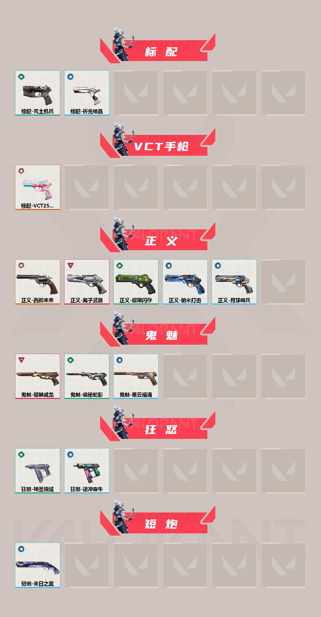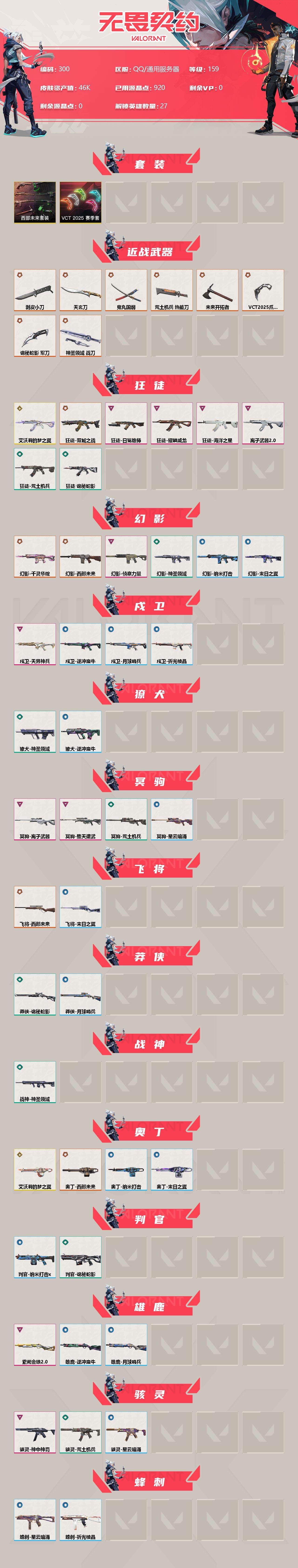 【300】【套装】:vct 2025 赛季套装,西部未来套装 【英雄】:幻棱,炼狱,维斯,暮蝶,钛狐,壹决,铁臂,捷风,雷兹,幽影,不死鸟,贤者,猎枭,蝰蛇,零,芮娜,奇乐,尚勃勒,霓虹,斯凯,夜露,星礈,k/o,海神,盖可,黑梦,钢锁 【近战 武器】:近战武器-剥皮小刀,近战武器-vct 2025 爪刀,近战武器-鬼丸国纲,近战武器-未来开拓者,近战武器-荒土机兵 热能刀,近战武器-天玄刀,近战武器-诡秘蛇影 军刀,近战武器-神圣领域 战刀 【狂徒】:狂徒-艾沃莉的梦之翼,狂徒-双城之战,狂徒-海洋之星,狂徒-日冕雄师,狂徒-耀鳞威龙,狂徒-离子武器//2.0,狂徒-荒土机兵,狂徒-诡秘蛇影 【幻影】:幻影-千灵华绽,幻影-西部未来,幻影-侦察力量,幻影-神圣领域,幻影-纳米打击,幻影-末日之翼,幻影-西部未来 【戍卫】:戍卫-天界神兵,戍卫-逆冲蛮牛,戍卫-月球哨兵,戍卫-折光棱晶 【獠犬】:獠犬-神圣领域,獠犬-逆冲蛮牛 【冥驹】:冥驹-堕天遗武,冥驹-离子武器,冥驹-荒土机兵,冥驹-星云暗涌 【飞将】:飞将-西部未来,飞将-末日之翼 【莽侠】:莽侠-诡秘蛇影,莽侠-月球哨兵 【战神】:战神-神圣领域 【奥丁】:奥丁-艾沃莉的梦之翼,奥丁-西部未来,奥丁-纳米打击,奥丁-末日之翼 【判官】:判官-诡秘蛇影,判官-纳米打击x 【雄鹿】:雄鹿-紫阙金琅//2.0,雄鹿-逆冲蛮牛,雄鹿-月球哨兵 【骇灵】:骇灵-神中神罚,骇灵-荒土机兵,骇灵-星云暗涌 【蜂刺】:蜂刺-星云暗涌,蜂刺-折光棱晶 【标配】:标配-荒土机兵,标配-折光棱晶 【vct手呛】:标配-vct25 x blg 【正义】:正义-西部未来,正义-离子武器,正义-超限闪存,正义-纳米打击,正义-月球哨兵 【鬼魅】:鬼魅-耀鳞威龙,鬼魅-诡秘蛇影,鬼魅-星云暗涌 【狂怒】:狂怒-神圣领域,狂怒-逆冲蛮牛 【短炮】:短炮-末日之翼 【卡面】:终章:激斗汉堡 卡面,进入射程 卡面,分崩离析 卡面,纳米打击 卡面,抑制技术 卡面,激斗汉堡 卡面,瓦娃脸雪糕 p2 卡面,从黄昏到黎明 卡面,荒土机兵 卡面,银弹猎手 卡面,逆冲蛮牛 卡面,《双城之战》拥抱 卡面,精灵大战 卡面,欢迎来到底城 卡面,南瓜盛典 卡面,修车达人 卡面,正义的化身 卡面,无畏契约go!第一卷:芮娜 卡面,无畏契约go!第一卷:零 卡面,《双城之战》金克丝 卡面,代号红色 卡面,新兵报到 卡面,v契约 卡面,无畏契约 卡面 【喷漆】:小小心意 喷漆,战“素”兔 喷漆,宇宙的指引 喷漆,请求重启 喷漆,逆冲蛮牛 喷漆,纳米打击 喷漆,鼻尖上的蝴蝶 喷漆,简笔画黯兽 喷漆,独守蝰腹 喷漆,他们将落荒而逃 喷漆,通缉:战术企鹅 喷漆,荒土机兵 喷漆,别挡我吃球! 喷漆,嗨宝南瓜灯 喷漆,嘭! 喷漆,都算到了 喷漆,控场勿近 喷漆,小丑猫 喷漆,熊抱 喷漆,终极羞辱 喷漆,买装还是存钱 喷漆,胜利属于无畏契约 喷漆,glhf 喷漆,无畏契约 喷漆 【挂饰】:终章:猫猫木乃伊 挂饰,荒土机兵 挂饰,悠闲鸡块 挂饰,猫猫木乃伊 挂饰,水壶 挂饰,纳米打击 挂饰,逆冲蛮牛 挂饰,可爱糖糖 挂饰,伞绳 挂饰,《双城之战》小蛋糕 挂饰,第九季//第三幕 纪念币 挂饰,工具腰带 挂饰,熔岩灯 挂饰,第九季//第二幕 纪念币 挂饰,天外飞客 挂饰,无畏契约 纪念币 挂饰
