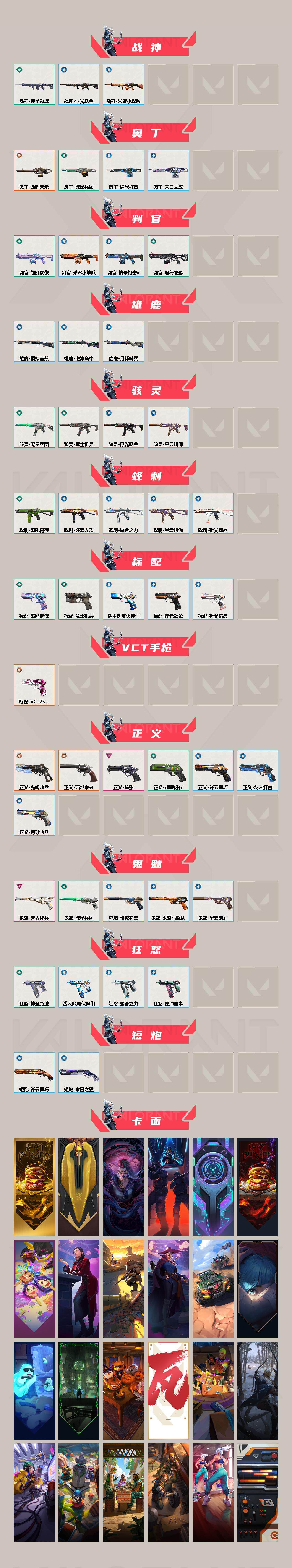 【298】【套装】:vct 2025 赛季套装,西部未来套装,掠影套装 【英雄】:幻棱,炼狱,维斯,暮蝶,钛狐,壹决,铁臂,捷风,雷兹,幽影,不死鸟,贤者,猎枭,蝰蛇,零,芮娜,奇乐,尚勃勒,霓虹,斯凯,夜露,星礈,k/o,海神,盖可,黑梦,钢锁 【近战 武器】:近战武器-侦察力量 蝴蝶刀,近战武器-vct 2025 爪刀,近战武器-鬼丸国纲,近战武器-未来开拓者,近战武器-流星兵团 短剑,近战武器-超能偶像 应援棒,近战武器-超限闪存 匕首,近战武器-荒土机兵 热能刀,近战武器-夜刃诡镰,近战武器-影刃,近战武器-神圣领域 战刀 【狂徒】:狂徒-洪荒怒焰,狂徒-混沌序曲,狂徒-堕天遗武,狂徒-掠影,狂徒-盖亚的复仇,狂徒-耀鳞威龙,狂徒-超能偶像,狂徒-荒土机兵,狂徒-流星兵团,狂徒-诡秘蛇影 【幻影】:幻影-千灵华绽,幻影-西部未来,幻影-般若假面,幻影-超限闪存,幻影-神圣领域,幻影-聚合之力,幻影-纳米打击,幻影-西部未来 【戍卫】:戍卫-掠影,戍卫-超能偶像,戍卫-浮光跃金,戍卫-逆冲蛮牛,戍卫-战术熊与伙伴们,戍卫-月球哨兵,戍卫-折光棱晶 【獠犬】:獠犬-神圣领域,獠犬-采蜜小蜂队,獠犬-模拟赫兹,獠犬-逆冲蛮牛 【冥驹】:冥驹-掠影,冥驹-荒土机兵,冥驹-模拟赫兹,冥驹-星云暗涌 【飞将】:飞将-西部未来,飞将-聚合之力,飞将-战术熊与伙伴们,飞将-末日之翼 【莽侠】:莽侠-超限闪存,莽侠-纤云弄巧,莽侠-月球哨兵 【战神】:战神-神圣领域,战神-采蜜小蜂队,战神-浮光跃金 【奥丁】:奥丁-西部未来,奥丁-流星兵团,奥丁-纳米打击,奥丁-末日之翼 【判官】:判官-超能偶像,判官-诡秘蛇影,判官-采蜜小蜂队,判官-纳米打击x 【雄鹿】:雄鹿-模拟赫兹,雄鹿-逆冲蛮牛,雄鹿-月球哨兵 【骇灵】:骇灵-荒土机兵,骇灵-流星兵团,骇灵-浮光跃金,骇灵-星云暗涌 【蜂刺】:蜂刺-超限闪存,蜂刺-聚合之力,蜂刺-纤云弄巧,蜂刺-星云暗涌,蜂刺-折光棱晶 【标配】:标配-超能偶像,标配-荒土机兵,标配-浮光跃金,标配-战术熊与伙伴们,标配-折光棱晶 【vct手呛】:标配-vct25 x krü 【正义】:正义-光明哨兵,正义-西部未来,正义-掠影,正义-超限闪存,正义-纳米打击,正义-纤云弄巧,正义-月球哨兵 【鬼魅】:鬼魅-天界神兵,鬼魅-流星兵团,鬼魅-采蜜小蜂队,鬼魅-模拟赫兹,鬼魅-星云暗涌 【狂怒】:狂怒-神圣领域,狂怒-聚合之力,狂怒-逆冲蛮牛,狂怒-战术熊与伙伴们 【短炮】:短炮-纤云弄巧,短炮-末日之翼 【卡面】:终章:激斗汉堡 卡面,进入射程 卡面,分崩离析 卡面,纳米打击 卡面,抑制技术 卡面,激斗汉堡 卡面,瓦娃脸雪糕 p2 卡面,从黄昏到黎明 卡面,荒土机兵 卡面,银弹猎手 卡面,逆冲蛮牛 卡面,《双城之战》拥抱 卡面,精灵大战 卡面,欢迎来到底城 卡面,南瓜盛典 卡面,vct cn首冠 卡面,唱片的故事 卡面,钢弓与箭弦 卡面,排除故障 卡面,战术桌游 卡面,悠享食光 卡面,修车达人 卡面,热舞环节 卡面,模拟赫兹 卡面,浮光跃金 卡面,超限闪存 卡面,维斯工牌 卡面,正义的化身 卡面,终章:生意人麦宝 卡面,铁之华 卡面,失而复得 卡面,时间到 卡面,最高舞台 卡面,复活专家 卡面,归乡 // 蝰蛇 卡面,超能偶像 卡面,生意人麦宝 卡面,声感陷阱设计图 卡面,clutch 卡面,钢锁工牌 卡面,战术小伙伴的夏日 卡面,采蜜小蜂队 卡面,聚合之力 卡面,梦幻奶茶 卡面,终章:打造专属狂徒 卡面,趁热吃 卡面,西装暴徒 卡面,失控边缘 卡面,哨卫者之领域 卡面,暮蝶工牌 卡面,战术熊与伙伴们 卡面,源能反应 卡面,流星兵团 卡面,纤云弄巧 卡面,暂别喧嚣 卡面,打造专属狂徒 卡面,零点嗅探设计图 卡面,无畏契约go!第一卷:芮娜 卡面,深海水族 卡面,清除名单 卡面,无畏契约go!第一卷:零 卡面,龍记 卡面,完美调谐 卡面 ,暗呛 卡面,代号红色 卡面,新兵报到 卡面,v契约 卡面,无畏契约 卡面 【喷漆】:小小心意 喷漆,战“素”兔 喷漆,宇宙的指引 喷漆,请求重启 喷漆,逆冲蛮牛 喷漆,纳米打击 喷漆,鼻尖上的蝴蝶 喷漆,简笔画黯兽 喷漆,独守蝰腹 喷漆,他们将落荒而逃 喷漆,通缉:战术企鹅 喷漆,荒土机兵 喷漆,别挡我吃球! 喷漆,嗨宝南瓜灯 喷漆,嘭! 喷漆,都算到了 喷漆,控场勿近 喷漆,皮蛋呼呼 喷漆,像素星礈 喷漆,图谋不轨的零 喷漆,小丑猫 喷漆,模拟赫兹 喷漆,高丽风情小熊 喷漆,蹲到一个 喷漆,全力集中 喷漆,超限闪存 喷漆,rua一下 喷漆,熊抱 喷漆,蛋糕还是爆能器? 喷漆,高丽风情小虎 喷漆,记在小本本 喷漆,防弹企鹅 喷漆,高丽风情小蛙 喷漆,又被闪了 喷漆,终极羞辱 喷漆,超级粉丝 喷漆,黯兽卖萌 喷漆,捷风差距 喷漆,惊声尖叫 喷漆,2021冠军巡回赛花火 喷漆,五人成星 喷漆,超能偶像 喷漆,放我出去 喷漆,掩护我 喷漆,大佬发呛 喷漆,边缘试探 喷漆,拼一呛 喷漆,聚合之力 喷漆,采蜜小蜂队 喷漆,梦幻小队 喷漆,五个全都齐了 喷漆,加油!加油! 喷漆,开心到爆炸 喷漆,皮蛋萌舞 喷漆,我觉得不行 喷漆,头号粉丝 喷漆,吸一口快乐 喷漆,永远的答案 喷漆,再来一次? 喷漆,别挡我的路! 喷漆,我的刀呢? 喷漆,当然可以 喷漆,流星兵团 喷漆,战术熊与伙伴们 喷漆,禁止喷漆 喷漆,纤云弄巧 喷漆,买装还是存钱 喷漆,醒狮贺春 喷漆,蕊形灯 喷漆,暗中偷瞄 喷漆,胜利属于无畏契约 喷漆,glhf 喷漆,无畏契约 喷漆 【挂饰】:v25第三幕:神话 挂饰,第九季:超凡 挂饰,终章:猫猫木乃伊 挂饰,荒土机兵 挂饰,悠闲鸡块 挂饰,猫猫木乃伊 挂饰,水壶 挂饰,纳米打击 挂饰,逆冲蛮牛 挂饰,可爱糖糖 挂饰,伞绳 挂饰,《双城之战