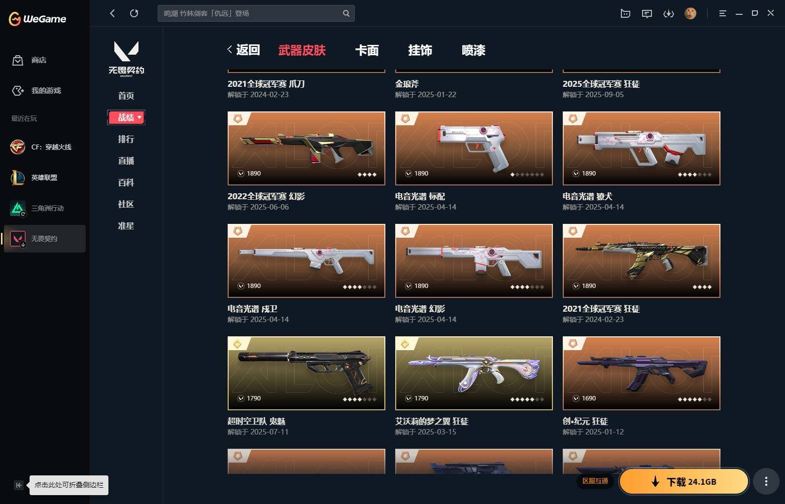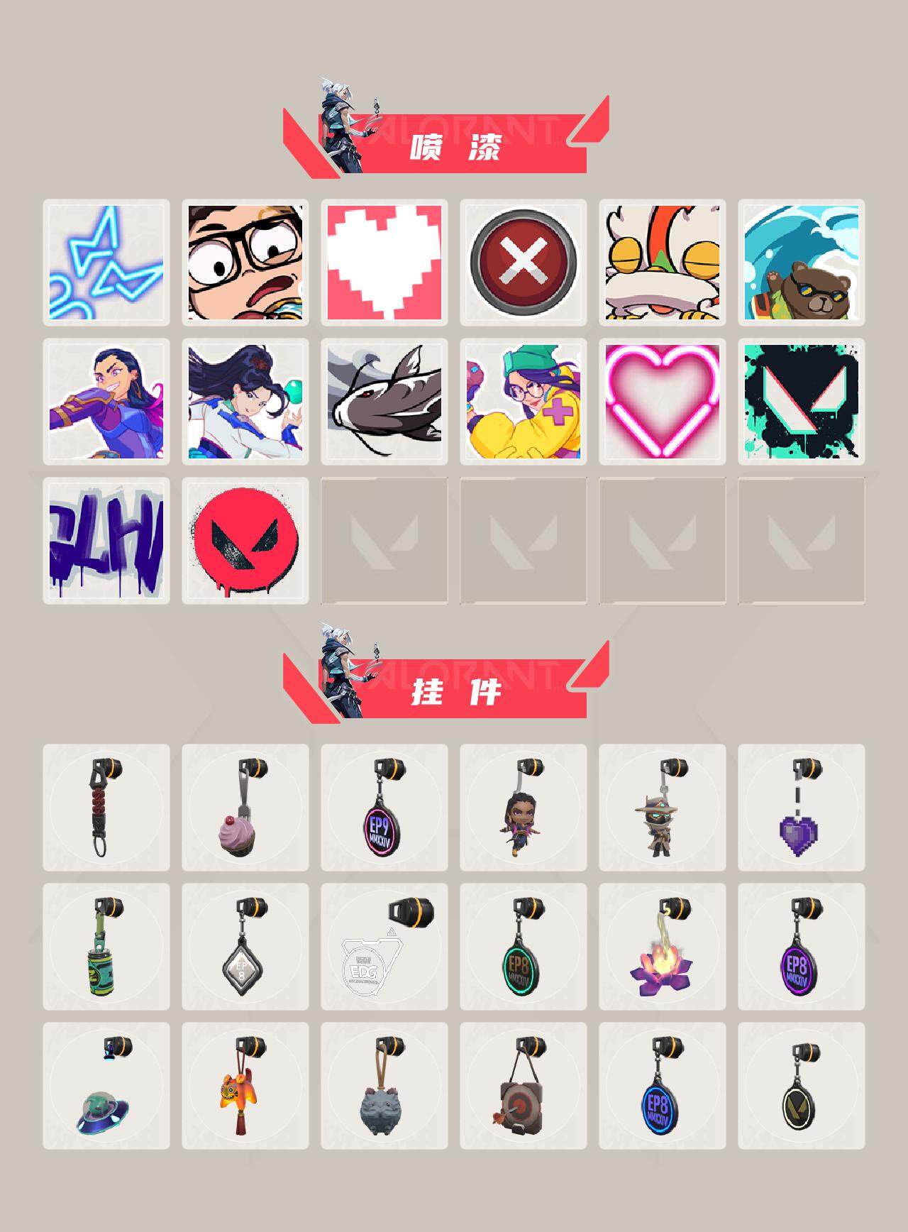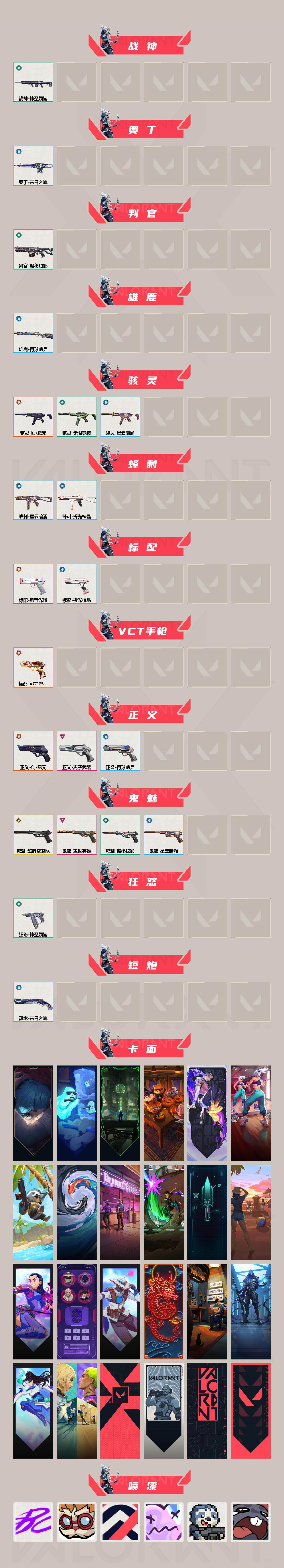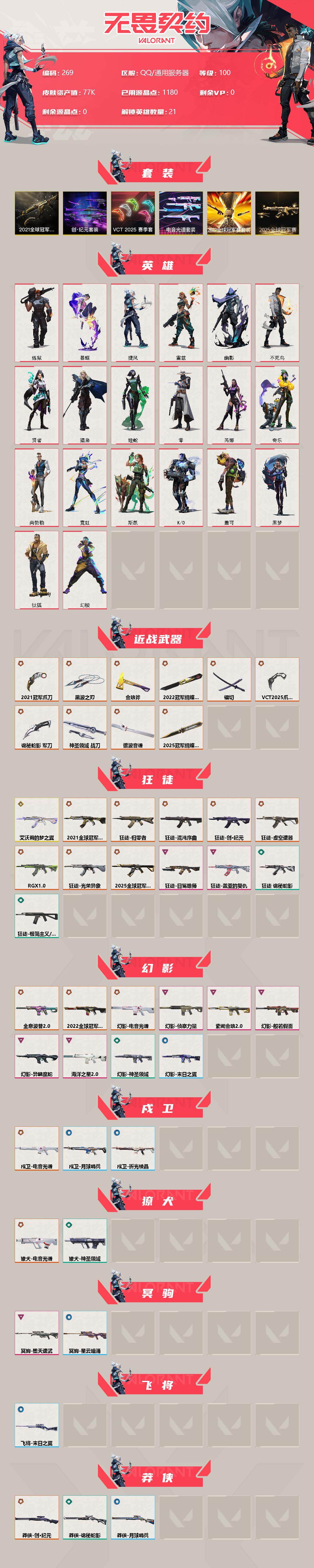 【269】【套装】:2025全球冠军赛套装,2022全球冠军赛套装,2021全球冠军赛套装,电音光谱套装,vct 2025 赛季套装,创·纪元套装 【英雄】:幻棱,炼狱,暮蝶,钛狐,捷风,雷兹,幽影,不死鸟,贤者,猎枭,蝰蛇,零,芮娜,奇乐,尚勃勒,霓虹,斯凯,k/o,盖可,黑梦 【近战 武器】:近战武器-2025全球冠军赛 蝴蝶刀,近战武器-2022全球冠军赛 蝴蝶刀,近战武器-2021全球冠军赛 爪刀,近战武器-谐波音谱,近战武器-vct 2025 爪刀,近战武器-黑波之刃,近战武器-镭切,近战武器-金琅斧,近战武器-诡秘蛇影 军刀,近战武器-神圣领域 战刀 【狂徒】:狂徒-艾沃莉的梦之翼,狂徒-2025全球冠军赛,狂徒-2021全球冠军赛,狂徒-归零者,狂徒-混沌序曲,狂徒-创·纪元,狂徒-虚空遗器,狂徒-rgx 11z pro,狂徒-光荣异象,狂徒-盖亚的复仇,狂徒-日冕雄师,狂徒-诡秘蛇影,狂徒-极简主义//2.0 【幻影】:幻影-2022全球冠军赛,幻影-全息波普//2.0,幻影-电音光谱,幻影-般若假面,幻影-侦察力量,幻影-紫阙金琅//2.0,幻影-异鳞魔蛇,幻影-海洋之星//2.0,幻影-神圣领域,幻影-末日之翼,幻影-电音光谱 【戍卫】:戍卫-电音光谱,戍卫-月球哨兵,戍卫-折光棱晶,戍卫-电音光谱 【獠犬】:獠犬-电音光谱,獠犬-神圣领域,獠犬-电音光谱 【冥驹】:冥驹-堕天遗武,冥驹-星云暗涌 【飞将】:飞将-末日之翼 【莽侠】:莽侠-创·纪元,莽侠-诡秘蛇影,莽侠-月球哨兵 【战神】:战神-神圣领域 【奥丁】:奥丁-末日之翼 【判官】:判官-诡秘蛇影 【雄鹿】:雄鹿-月球哨兵 【骇灵】:骇灵-创·纪元,骇灵-无限竞技,骇灵-星云暗涌 【蜂刺】:蜂刺-星云暗涌,蜂刺-折光棱晶 【标配】:标配-电音光谱,标配-折光棱晶,标配-电音光谱 【vct手呛】:标配-vct25 x edg 【正义】:正义-创·纪元,正义-离子武器,正义-月球哨兵 【鬼魅】:鬼魅-超时空卫队,鬼魅-盖世英雄,鬼魅-诡秘蛇影,鬼魅-星云暗涌 【狂怒】:狂怒-神圣领域 【短炮】:短炮-末日之翼 【卡面】:《双城之战》拥抱 卡面,精灵大战 卡面,欢迎来到底城 卡面,南瓜盛典 卡面,无畏契约:暮蝶 卡面,热舞环节 卡面,树懒大作战 卡面,红鳞松叶 卡面,梦幻奶茶 卡面,源能反应 卡面,零点嗅探设计图 卡面,沙雕爆能器 卡面,无畏契约go!第一卷:芮娜 卡面,清除名单 卡面,无畏契约go!第一卷:零 卡面,龍记 卡面,完美调谐 卡面 ,暗呛 卡面,无畏契约go!第一卷:贤者 卡面,钢锁vs盖可 卡面,代号红色 卡面,新兵报到 卡面,v契约 卡面,无畏契约 卡面 【喷漆】:嘭! 喷漆,都算到了 喷漆,控场勿近 喷漆,伤心心 喷漆,审判之爪 喷漆,我的刀呢? 喷漆,霓光四射 喷漆,新潮流 喷漆,双击点赞 喷漆,买装还是存钱 喷漆,醒狮贺春 喷漆,酷熊冲浪 喷漆,无畏契约go!第一卷:芮娜 喷漆,无畏契约go!第一卷:贤者 喷漆,松叶 喷漆,无畏契约go!第一卷:奇乐 喷漆,蕊形灯 喷漆,胜利属于无畏契约 喷漆,glhf 喷漆,无畏契约 喷漆 【挂饰】:伞绳 挂饰,《双城之战》小蛋糕 挂饰,第九季//第三幕 纪念币 挂饰,无畏契约go!第一卷 芮娜 挂饰,无畏契约go!第一卷 零 挂饰,薰衣草之心 挂饰,z世代特饮 挂饰,第八季:白银 挂饰,vct x edg 挂饰,第八季//第三幕 纪念币 挂饰,传世莲华 挂饰,第八季//第二幕 纪念币 挂饰 ,天外飞客 挂饰,好运福爪 挂饰,《双城之战》魄罗 挂饰,瞄这里 挂饰,第八季//第一幕 纪念币 挂饰,无畏契约 纪念币 挂饰