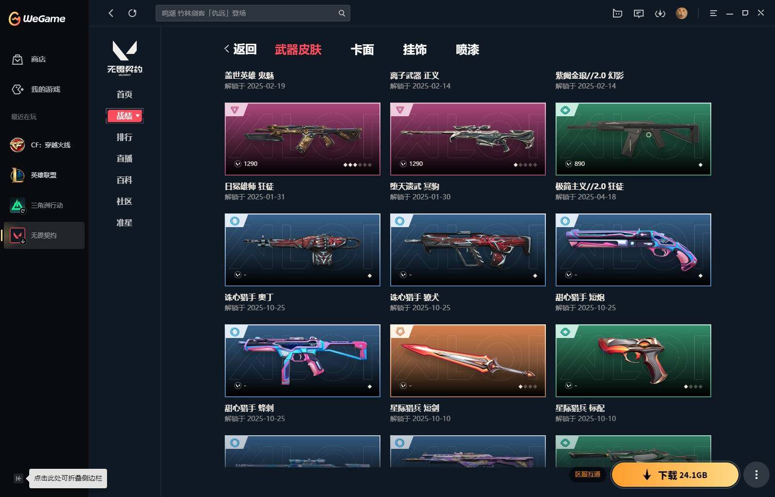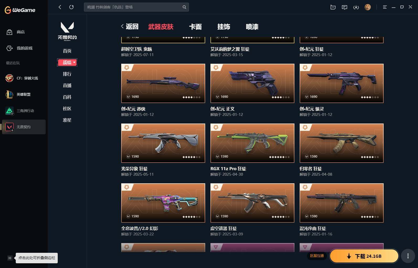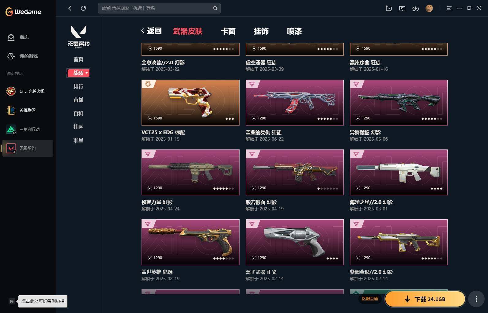 【269】【套装】:2025全球冠军赛套装,2022全球冠军赛套装,2021全球冠军赛套装,电音光谱套装,vct 2025 赛季套装,创·纪元套装 【英雄】:幻棱,炼狱,暮蝶,钛狐,捷风,雷兹,幽影,不死鸟,贤者,猎枭,蝰蛇,零,芮娜,奇乐,尚勃勒,霓虹,斯凯,k/o,盖可,黑梦 【近战 武器】:近战武器-2025全球冠军赛 蝴蝶刀,近战武器-2022全球冠军赛 蝴蝶刀,近战武器-2021全球冠军赛 爪刀,近战武器-谐波音谱,近战武器-vct 2025 爪刀,近战武器-黑波之刃,近战武器-镭切,近战武器-金琅斧,近战武器-诡秘蛇影 军刀,近战武器-神圣领域 战刀 【狂徒】:狂徒-艾沃莉的梦之翼,狂徒-2025全球冠军赛,狂徒-2021全球冠军赛,狂徒-归零者,狂徒-混沌序曲,狂徒-创·纪元,狂徒-虚空遗器,狂徒-rgx 11z pro,狂徒-光荣异象,狂徒-盖亚的复仇,狂徒-日冕雄师,狂徒-诡秘蛇影,狂徒-极简主义//2.0 【幻影】:幻影-2022全球冠军赛,幻影-全息波普//2.0,幻影-电音光谱,幻影-般若假面,幻影-侦察力量,幻影-紫阙金琅//2.0,幻影-异鳞魔蛇,幻影-海洋之星//2.0,幻影-神圣领域,幻影-末日之翼,幻影-电音光谱 【戍卫】:戍卫-电音光谱,戍卫-月球哨兵,戍卫-折光棱晶,戍卫-电音光谱 【獠犬】:獠犬-电音光谱,獠犬-神圣领域,獠犬-电音光谱 【冥驹】:冥驹-堕天遗武,冥驹-星云暗涌 【飞将】:飞将-末日之翼 【莽侠】:莽侠-创·纪元,莽侠-诡秘蛇影,莽侠-月球哨兵 【战神】:战神-神圣领域 【奥丁】:奥丁-末日之翼 【判官】:判官-诡秘蛇影 【雄鹿】:雄鹿-月球哨兵 【骇灵】:骇灵-创·纪元,骇灵-无限竞技,骇灵-星云暗涌 【蜂刺】:蜂刺-星云暗涌,蜂刺-折光棱晶 【标配】:标配-电音光谱,标配-折光棱晶,标配-电音光谱 【vct手呛】:标配-vct25 x edg 【正义】:正义-创·纪元,正义-离子武器,正义-月球哨兵 【鬼魅】:鬼魅-超时空卫队,鬼魅-盖世英雄,鬼魅-诡秘蛇影,鬼魅-星云暗涌 【狂怒】:狂怒-神圣领域 【短炮】:短炮-末日之翼 【卡面】:《双城之战》拥抱 卡面,精灵大战 卡面,欢迎来到底城 卡面,南瓜盛典 卡面,无畏契约:暮蝶 卡面,热舞环节 卡面,树懒大作战 卡面,红鳞松叶 卡面,梦幻奶茶 卡面,源能反应 卡面,零点嗅探设计图 卡面,沙雕爆能器 卡面,无畏契约go!第一卷:芮娜 卡面,清除名单 卡面,无畏契约go!第一卷:零 卡面,龍记 卡面,完美调谐 卡面 ,暗呛 卡面,无畏契约go!第一卷:贤者 卡面,钢锁vs盖可 卡面,代号红色 卡面,新兵报到 卡面,v契约 卡面,无畏契约 卡面 【喷漆】:嘭! 喷漆,都算到了 喷漆,控场勿近 喷漆,伤心心 喷漆,审判之爪 喷漆,我的刀呢? 喷漆,霓光四射 喷漆,新潮流 喷漆,双击点赞 喷漆,买装还是存钱 喷漆,醒狮贺春 喷漆,酷熊冲浪 喷漆,无畏契约go!第一卷:芮娜 喷漆,无畏契约go!第一卷:贤者 喷漆,松叶 喷漆,无畏契约go!第一卷:奇乐 喷漆,蕊形灯 喷漆,胜利属于无畏契约 喷漆,glhf 喷漆,无畏契约 喷漆 【挂饰】:伞绳 挂饰,《双城之战》小蛋糕 挂饰,第九季//第三幕 纪念币 挂饰,无畏契约go!第一卷 芮娜 挂饰,无畏契约go!第一卷 零 挂饰,薰衣草之心 挂饰,z世代特饮 挂饰,第八季:白银 挂饰,vct x edg 挂饰,第八季//第三幕 纪念币 挂饰,传世莲华 挂饰,第八季//第二幕 纪念币 挂饰 ,天外飞客 挂饰,好运福爪 挂饰,《双城之战》魄罗 挂饰,瞄这里 挂饰,第八季//第一幕 纪念币 挂饰,无畏契约 纪念币 挂饰