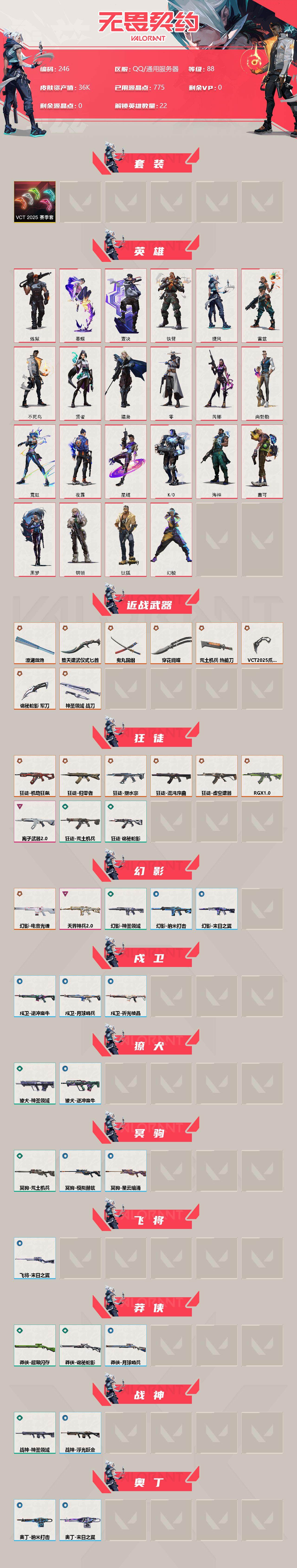 【246】【套装】:vct 2025 赛季套装 【英雄】:幻棱,炼狱,暮蝶,钛狐,壹决,铁臂,捷风,雷兹,不死鸟,贤者,猎枭,零,芮娜,尚勃勒,霓虹,夜露,星礈,k/o,海神,盖可,黑梦,钢锁 【近战 武器】:近战武器-穿花蝴蝶,近战武器-vct 2025 爪刀,近战武器-澄湖潋滟,近战武器-鬼丸国纲,近战武器-堕天遗武 仪式匕首,近战武器-荒土机兵 热能刀,近战武器-诡秘蛇影 军刀,近战武器-神圣领域 战刀 【狂徒】:狂徒-归零者,狂徒-混沌序曲,狂徒-机动狂飙,狂徒-塑水宗,狂徒-虚空遗器,狂徒-rgx 11z pro,狂徒-离子武器//2.0,狂徒-荒土机兵,狂徒-诡秘蛇影 【幻影】:幻影-电音光谱,幻影-天界神兵//2.0,幻影-神圣领域,幻影-纳米打击,幻影-末日之翼,幻影-电音光谱 【戍卫】:戍卫-逆冲蛮牛,戍卫-月球哨兵,戍卫-折光棱晶 【獠犬】:獠犬-神圣领域,獠犬-逆冲蛮牛 【冥驹】:冥驹-荒土机兵,冥驹-模拟赫兹,冥驹-星云暗涌 【飞将】:飞将-末日之翼 【莽侠】:莽侠-超限闪存,莽侠-诡秘蛇影,莽侠-月球哨兵 【战神】:战神-神圣领域,战神-浮光跃金 【奥丁】:奥丁-纳米打击,奥丁-末日之翼 【判官】:判官-诡秘蛇影,判官-纳米打击x 【雄鹿】:雄鹿-模拟赫兹,雄鹿-逆冲蛮牛,雄鹿-月球哨兵 【骇灵】:骇灵-荒土机兵,骇灵-浮光跃金,骇灵-星云暗涌 【蜂刺】:蜂刺-超限闪存,蜂刺-星云暗涌,蜂刺-折光棱晶 【标配】:标配-荒土机兵,标配-浮光跃金,标配-折光棱晶 【vct手呛】:标配-vct25 x prx 【正义】:正义-rgx 11z pro//3.0,正义-千灵华绽,正义-西部未来,正义-纳米打击,正义-月球哨兵 【鬼魅】:鬼魅-盖世英雄,鬼魅-诡秘蛇影,鬼魅-模拟赫兹,鬼魅-星云暗涌 【狂怒】:狂怒-神圣领域,狂怒-逆冲蛮牛 【短炮】:短炮-末日之翼 【卡面】:终章:激斗汉堡 卡面,进入射程 卡面,分崩离析 卡面,纳米打击 卡面,抑制技术 卡面,激斗汉堡 卡面,瓦娃脸雪糕 p2 卡面,从黄昏到黎明 卡面,荒土机兵 卡面,银弹猎手 卡面,逆冲蛮牛 卡面,《双城之战》拥抱 卡面,精灵大战 卡面,欢迎来到底城 卡面,南瓜盛典 卡面,vct cn首冠 卡面,战术桌游 卡面,悠享食光 卡面,修车达人 卡面,模拟赫兹 卡面,浮光跃金 卡面,超限闪存 卡面,维斯工牌 卡面,正义的化身 卡面,无畏契约go!第一卷:芮娜 卡面,无畏契约go!第一卷:零 卡面,《双城之战》金克丝 卡面,暗呛 卡面,代号红色 卡面,新兵报到 卡面,v契约 卡面,无畏契约 卡面 【喷漆】:小小心意 喷漆,战“素”兔 喷漆,宇宙的指引 喷漆,请求重启 喷漆,逆冲蛮牛 喷漆,纳米打击 喷漆,鼻尖上的蝴蝶 喷漆,简笔画黯兽 喷漆,独守蝰腹 喷漆,他们将落荒而逃 喷漆,通缉:战术企鹅 喷漆,荒土机兵 喷漆,别挡我吃球! 喷漆,嗨宝南瓜灯 喷漆,嘭! 喷漆,都算到了 喷漆,控场勿近 喷漆,蹲到一个 喷漆,全力集中 喷漆,超限闪存 喷漆,rua一下 喷漆,熊抱 喷漆,高丽风情小虎 喷漆,记在小本本 喷漆,防弹企鹅 喷漆,高丽风情小蛙 喷漆,买装还是存钱 喷漆,暴走萝莉 喷漆,胜利属于无畏契约 喷漆,glhf 喷漆,无畏契约 喷漆 【挂饰】:终章:猫猫木乃伊 挂饰,荒土机兵 挂饰,悠闲鸡块 挂饰,猫猫木乃伊 挂饰,水壶 挂饰,纳米打击 挂饰,逆冲蛮牛 挂饰,可爱糖糖 挂饰,伞绳 挂饰,《双城之战》小蛋糕 挂饰,第九季//第三幕 纪念币 挂饰,无畏契约go!第一卷 芮娜 挂饰,无畏契约go!第一卷 零 挂饰,鱼骨头 挂饰,熔岩灯 挂饰,超限闪存 挂饰,迷你k/o 挂饰,模拟赫兹 挂饰,第九季//第二幕 纪念币 挂饰,薰衣草之心 挂饰,天外飞客 挂饰,《双城之战》魄罗 挂饰,无畏契约 纪念币 挂饰