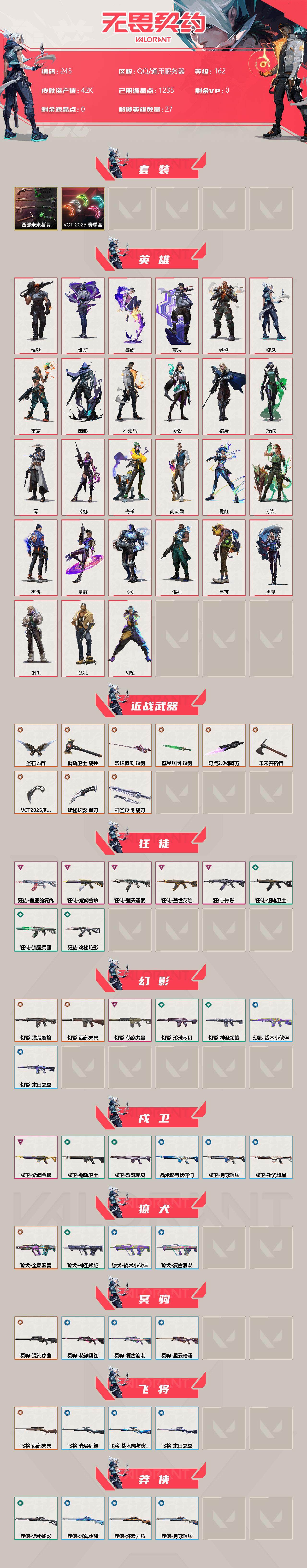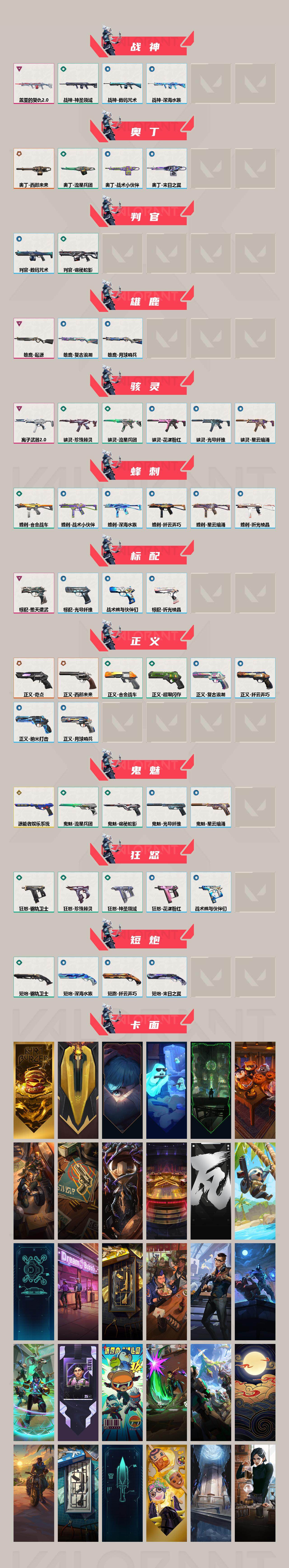 【245】【套装】:vct 2025 赛季套装,西部未来套装 【英雄】:幻棱,炼狱,维斯,暮蝶,钛狐,壹决,铁臂,捷风,雷兹,幽影,不死鸟,贤者,猎枭,蝰蛇,零,芮娜,奇乐,尚勃勒,霓虹,斯凯,夜露,星礈,k/o,海神,盖可,黑梦,钢锁 【近战 武器】:近战武器-奇点//2.0 蝴蝶刀,近战武器-vct 2025 爪刀,近战武器-未来开拓者,近战武器-珍珠棘贝 短剑,近战武器-流星兵团 短剑,近战武器-钢轨卫士 战锤,近战武器-圣石匕首,近战武器-诡秘蛇影 军刀,近战武器-神圣领域 战刀 【狂徒】:狂徒-堕天遗武,狂徒-掠影,狂徒-盖世英雄,狂徒-盖亚的复仇,狂徒-紫阙金琅,狂徒-钢轨卫士,狂徒-流星兵团,狂徒-诡秘蛇影 【幻影】:幻影-洪荒怒焰,幻影-西部未来,幻影-侦察力量,幻影-珍珠棘贝,幻影-神圣领域,幻影-战术小伙伴,幻影-末日之翼,幻影-西部未来 【戍卫】:戍卫-紫阙金琅,戍卫-钢轨卫士,戍卫-珍珠棘贝,戍卫-战术熊与伙伴们,戍卫-月球哨兵,戍卫-折光棱晶 【獠犬】:獠犬-全息波普,獠犬-神圣领域,獠犬-复古浪潮,獠犬-战术小伙伴 【冥驹】:冥驹-混沌序曲,冥驹-复古浪潮,冥驹-花漾粉红,冥驹-星云暗涌 【飞将】:飞将-西部未来,飞将-光导纤维,飞将-战术熊与伙伴们,飞将-末日之翼 【莽侠】:莽侠-诡秘蛇影,莽侠-深海水族,莽侠-纤云弄巧,莽侠-月球哨兵 【战神】:战神-盖亚的复仇//2.0,战神-神圣领域,战神-深海水族,战神-数码咒术 【奥丁】:奥丁-西部未来,奥丁-流星兵团,奥丁-战术小伙伴,奥丁-末日之翼 【判官】:判官-诡秘蛇影,判官-数码咒术 【雄鹿】:雄鹿-起源,雄鹿-复古浪潮,雄鹿-月球哨兵 【骇灵】:骇灵-离子武器//2.0,骇灵-流星兵团,骇灵-珍珠棘贝,骇灵-光导纤维,骇灵-花漾粉红,骇灵-星云暗涌 【蜂刺】:蜂刺-合金战车,蜂刺-深海水族,蜂刺-纤云弄巧,蜂刺-战术小伙伴,蜂刺-星云暗涌,蜂刺-折光棱晶 【标配】:标配-堕天遗武,标配-光导纤维,标配-战术熊与伙伴们,标配-折光棱晶 【正义】:正义-奇点,正义-西部未来,正义-超限闪存,正义-合金战车,正义-复古浪潮,正义-纳米打击,正义-纤云弄巧,正义-月球哨兵 【鬼魅】:鬼魅-源能者娱乐系统,鬼魅-流星兵团,鬼魅-诡秘蛇影,鬼魅-光导纤维,鬼魅-星云暗涌 【狂怒】:狂怒-钢轨卫士,狂怒-珍珠棘贝,狂怒-神圣领域,狂怒-花漾粉红,狂怒-战术熊与伙伴们 【短炮】:短炮-钢轨卫士,短炮-深海水族,短炮-纤云弄巧,短炮-末日之翼 【卡面】:终章:激斗汉堡 卡面,进入射程 卡面,《双城之战》拥抱 卡面,精灵大战 卡面,欢迎来到底城 卡面,南瓜盛典 卡面,修车达人 卡面,正义的化身 卡面,时间到 卡面,最高舞台 卡面,先瓦为敬 银色 卡面,树懒大作战 卡面,声感陷阱设计图 卡面,梦幻奶茶 卡面,终章:打造专属狂徒 卡面,趁热吃 卡面,西装暴徒 卡面,失控边缘 卡面,哨卫者之领域 卡面,暮蝶工牌 卡面,战术熊与伙伴们 卡面,源能反应 卡面,流星兵团 卡面,纤云弄巧 卡面,暂别喧嚣 卡面,打造专属狂徒 卡面,零点嗅探设计图 卡面,终章:瓦娃脸雪糕 卡面,表象之下 卡面,虹吸式咖啡壶 卡面,源能者美容 卡面,脚踝终结者 卡面 ,夜班 卡面,瓦娃脸雪糕 卡面 ,沙雕爆能器 卡面,无畏契约go!第一卷:芮娜 卡面,深海水族 卡面,珍珠棘贝 卡面,复古浪潮 卡面,盖可工牌 卡面,清除名单 卡面,无畏契约go!第一卷:零 卡面,终章:同步耍酷 卡面,龍记 卡面,化茧成蝶 卡面,比比看谁快? 卡面,无垠星环 卡面,《双城之战》金克丝 卡面,蝰蛇vs幽影 卡面,势不可挡//盖可 卡面,逆向独行 卡面 ,同步耍酷 卡面,完美调谐 卡面 ,没有什么能逃过我的眼睛 卡面,光导纤维 卡面,战术小伙伴 卡面,钢轨卫士 卡面,暗呛 卡面,势不可挡//k/o 卡面,"luie" 卡面,铁臂设计图 卡面,代号红色 卡面,冰淇淋店 卡面,新兵报到 卡面,v契约 卡面,无畏契约 卡面 【喷漆】:嗨宝南瓜灯 喷漆,嘭! 喷漆,都算到了 喷漆,控场勿近 喷漆,小丑猫 喷漆,熊抱 喷漆,超级粉丝 喷漆,捷风差距 喷漆,2021冠军巡回赛花火 喷漆,战术熊的巴拉莱卡琴 喷漆,审判之爪 喷漆,拼一呛 喷漆,加油!加油! 喷漆,开心到爆炸 喷漆,皮蛋萌舞 喷漆,我觉得不行 喷漆,头号粉丝 喷漆,吸一口快乐 喷漆,永远的答案 喷漆,再来一次? 喷漆,别挡我的路! 喷漆,我的刀呢? 喷漆,当然可以 喷漆,流星兵团 喷漆,战术熊与伙伴们 喷漆,禁止喷漆 喷漆,纤云弄巧 喷漆,霓光四射 喷漆,情绪控制 喷漆,哨卫滑步 喷漆,倒吸一口凉气 喷漆,uwu 喷漆,新潮流 喷漆,逮到一个 喷漆,一个人的孤岛 喷漆,双人比心 喷漆,不予置评 喷漆,三熊合一 喷漆,要喝完噢! 喷漆,双击点赞 喷漆,珍珠棘贝 喷漆,深海水族 喷漆,禁止标配 喷漆 ,铁臂尴尬 喷漆,买装还是存钱 喷漆,醒狮贺春 喷漆,萌化了 喷漆,无畏契约go!第一卷:芮娜 喷漆,红鳞 喷漆,无畏契约go!第一卷:零 喷漆,无畏契约go!第一卷:捷风 喷漆,无畏契约go!第一卷:贤者 喷漆,暴走萝莉 喷漆,松叶 喷漆,无畏契约go!第一卷:奇乐 喷漆,辣得好下饭 喷漆,飓刃涂鸦 喷漆 ,旅行小熊 喷漆,战术小伙伴 喷漆,又一个梦幻组合 喷漆,是大风刮来的 喷漆 ,静电火花 喷漆 ,今天的潮声甚是喧嚣 喷漆 ,请你冷静点 喷漆 ,蕊形灯 喷漆,这是你掉的吗? 喷漆,省钱大师 喷漆 ,皇冠拉花 喷漆,该转点了 喷漆,老铁困了 喷漆,胜利属于无畏契约 喷漆,glhf 喷漆,无畏契约 喷漆 【挂饰】:终章:猫猫木乃伊 挂饰,悠闲鸡块 挂饰,伞绳 挂饰,《双城之战》小蛋糕 挂饰,第九季//第三幕 纪念币 挂饰,工具腰带 挂饰,无畏契约go!第