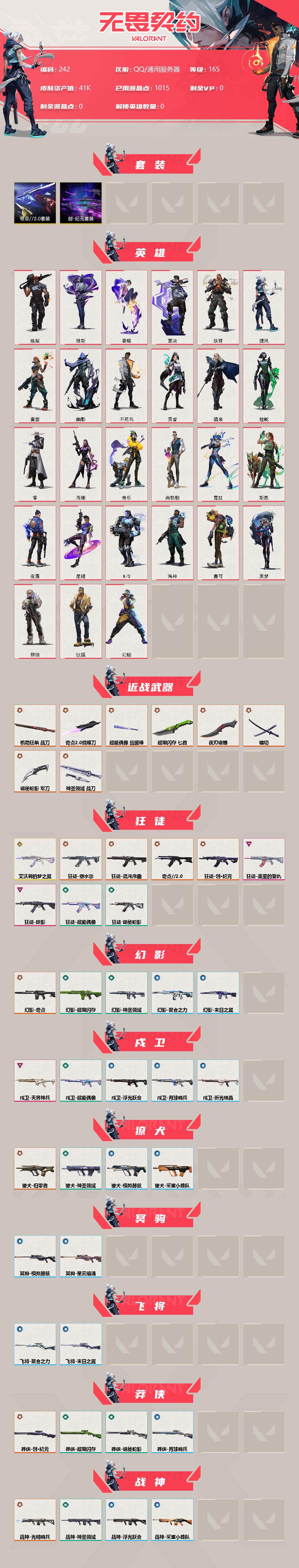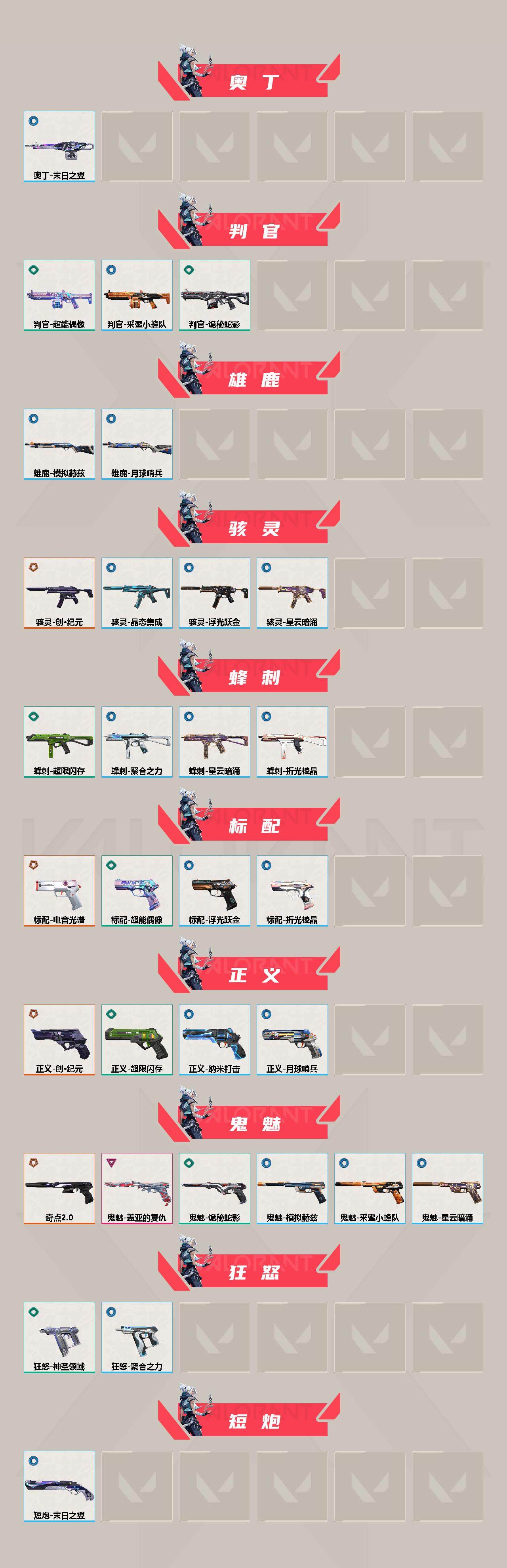 【242】【套装】:创·纪元套装,奇点//2.0套装 【英雄】:幻棱,炼狱,维斯,暮蝶,钛狐,壹决,铁臂,捷风,雷兹,幽影,不死鸟,贤者,猎枭,蝰蛇,零,芮娜,奇乐,尚勃勒,霓虹,斯凯,夜露,星礈,k/o,海神,盖可,黑梦,钢锁 【近战 武器】:近战武器-奇点//2.0 蝴蝶刀,近战武器-镭切,近战武器-超能偶像 应援棒,近战武器-超限闪存 匕首,近战武器-机动狂飙 战刀,近战武器-夜刃诡镰,近战武器-诡秘蛇影 军刀,近战武器-神圣领域 战刀 【狂徒】:狂徒-艾沃莉的梦之翼,狂徒-混沌序曲,狂徒-奇点//2.0,狂徒-塑水宗,狂徒-创·纪元,狂徒-掠影,狂徒-盖亚的复仇,狂徒-超能偶像,狂徒-诡秘蛇影 【幻影】:幻影-奇点,幻影-超限闪存,幻影-神圣领域,幻影-聚合之力,幻影-末日之翼 【戍卫】:戍卫-天界神兵,戍卫-超能偶像,戍卫-浮光跃金,戍卫-月球哨兵,戍卫-折光棱晶 【獠犬】:獠犬-归零者,獠犬-神圣领域,獠犬-采蜜小蜂队,獠犬-模拟赫兹 【冥驹】:冥驹-模拟赫兹,冥驹-星云暗涌 【飞将】:飞将-聚合之力,飞将-末日之翼 【莽侠】:莽侠-创·纪元,莽侠-超限闪存,莽侠-诡秘蛇影,莽侠-月球哨兵 【战神】:战神-光明哨兵,战神-神圣领域,战神-采蜜小蜂队,战神-浮光跃金 【奥丁】:奥丁-末日之翼 【判官】:判官-超能偶像,判官-诡秘蛇影,判官-采蜜小蜂队 【雄鹿】:雄鹿-模拟赫兹,雄鹿-月球哨兵 【骇灵】:骇灵-创·纪元,骇灵-浮光跃金,骇灵-晶态集成,骇灵-星云暗涌 【蜂刺】:蜂刺-超限闪存,蜂刺-聚合之力,蜂刺-星云暗涌,蜂刺-折光棱晶 【标配】:标配-电音光谱,标配-超能偶像,标配-浮光跃金,标配-折光棱晶,标配-电音光谱 【正义】:正义-创·纪元,正义-超限闪存,正义-纳米打击,正义-月球哨兵 【鬼魅】:鬼魅-奇点//2.0,鬼魅-盖亚的复仇,鬼魅-诡秘蛇影,鬼魅-采蜜小蜂队,鬼魅-模拟赫兹,鬼魅-星云暗涌 【狂怒】:狂怒-神圣领域,狂怒-聚合之力 【短炮】:短炮-末日之翼 【卡面】:终章:激斗汉堡 卡面,进入射程 卡面,精灵大战 卡面,南瓜盛典 卡面,唱片的故事 卡面,钢弓与箭弦 卡面,无畏契约:暮蝶 卡面,排除故障 卡面,奇点//2.0 卡面,战术桌游 卡面,悠享食光 卡面,修车达人 卡面,热舞环节 卡面,模拟赫兹 卡面,浮光跃金 卡面,超限闪存 卡面,维斯工牌 卡面,正义的化身 卡面,铁之华 卡面,失而复得 卡面,时间到 卡面,最高舞台 卡面,复活专家 卡面,归乡 // 蝰蛇 卡面,超能偶像 卡面,生意人麦宝 卡面,声感陷阱设计图 卡面,钢锁工牌 卡面,战术小伙伴的夏日 卡面,采蜜小蜂队 卡面,聚合之力 卡面,梦幻奶茶 卡面,无畏契约go!第一卷:芮娜 卡面,无畏契约go!第一卷:零 卡面,铁臂vs雷兹 卡面,代号红色 卡面,新兵报到 卡面,v契约 卡面,无畏契约 卡面 【喷漆】:嗨宝南瓜灯 喷漆,控场勿近 喷漆,皮蛋呼呼 喷漆,像素星礈 喷漆,图谋不轨的零 喷漆,伤心心 喷漆,小丑猫 喷漆,模拟赫兹 喷漆,高丽风情小熊 喷漆,奇点//2.0 喷漆,蹲到一个 喷漆,全力集中 喷漆,超限闪存 喷漆,rua一下 喷漆,熊抱 喷漆,蛋糕还是爆能器? 喷漆,高丽风情小虎 喷漆,记在小本本 喷漆,防弹企鹅 喷漆,高丽风情小蛙 喷漆,又被闪了 喷漆,终极羞辱 喷漆,超级粉丝 喷漆,黯兽卖萌 喷漆,捷风差距 喷漆,惊声尖叫 喷漆,五人成星 喷漆,超能偶像 喷漆,放我出去 喷漆,掩护我 喷漆,大佬发呛 喷漆,边缘试探 喷漆,拼一呛 喷漆,聚合之力 喷漆,采蜜小蜂队 喷漆,梦幻小队 喷漆,五个全都齐了 喷漆,买装还是存钱 喷漆,胜利属于无畏契约 喷漆,glhf 喷漆,无畏契约 喷漆 【挂饰】:终章:猫猫木乃伊 挂饰,悠闲鸡块 挂饰,伞绳 挂饰,第九季//第三幕 纪念币 挂饰,拳击战术熊 挂饰,工具腰带 挂饰,无畏契约go!第一卷 芮娜 挂饰,无畏契约go!第一卷 零 挂饰,暗藏猫腻 挂饰,高丽风情 挂饰,奇点//2.0 挂饰,熔岩灯 挂饰,超限闪存 挂饰,瞬云履 挂饰,迷你k/o 挂饰,模拟赫兹 挂饰,第九季//第二幕 纪念币 挂饰,终章:这瓜保熟 挂饰,炼狱雪糕 挂饰,糖葫芦 挂饰,袖珍捷风 挂饰,冲上云霄 挂饰,超能偶像 挂饰,迷你浓缩 挂饰,这瓜保熟 挂饰,采蜜小蜂队 挂饰,第九季//第一幕 纪念币 挂饰,聚合之力 挂饰,天外飞客 挂饰,无畏契约 纪念币 挂饰