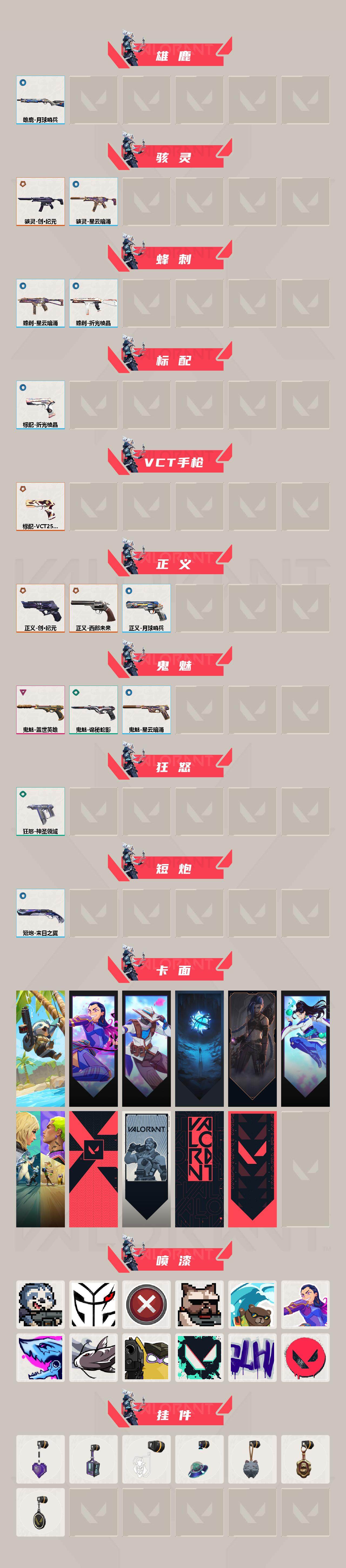 【238】【套装】:vct 2025 赛季套装,西部未来套装,创·纪元套装 【英雄】:幻棱,炼狱,维斯,暮蝶,钛狐,壹决,铁臂,捷风,雷兹,幽影,不死鸟,贤者,猎枭,蝰蛇,零,芮娜,尚勃勒,霓虹,夜露,盖可 【近战 武器】:近战武器-vct 2025 爪刀,近战武器-镭切,近战武器-未来开拓者,近战武器-诡秘蛇影 军刀,近战武器-神圣领域 战刀 【狂徒】:狂徒-创·纪元,狂徒-虚空遗器,狂徒-噬影者,狂徒-rgx 11z pro,狂徒-掠影,狂徒-离子武器//2.0,狂徒-诡秘蛇影 【幻影】:幻影-西部未来,幻影-侦察力量,幻影-神圣领域,幻影-末日之翼,幻影-西部未来 【戍卫】:戍卫-月球哨兵,戍卫-折光棱晶 【獠犬】:獠犬-神圣领域 【冥驹】:冥驹-rgx 11z pro//2.0,冥驹-星云暗涌 【飞将】:飞将-西部未来,飞将-末日之翼 【莽侠】:莽侠-创·纪元,莽侠-诡秘蛇影,莽侠-月球哨兵 【战神】:战神-神圣领域 【奥丁】:奥丁-西部未来,奥丁-末日之翼 【判官】:判官-诡秘蛇影 【雄鹿】:雄鹿-月球哨兵 【骇灵】:骇灵-创·纪元,骇灵-星云暗涌 【蜂刺】:蜂刺-星云暗涌,蜂刺-折光棱晶 【标配】:标配-折光棱晶 【vct手呛】:标配-vct25 x g2 【正义】:正义-创·纪元,正义-西部未来,正义-月球哨兵 【鬼魅】:鬼魅-盖世英雄,鬼魅-诡秘蛇影,鬼魅-星云暗涌 【狂怒】:狂怒-神圣领域 【短炮】:短炮-末日之翼 【卡面】:树懒大作战 卡面,无畏契约go!第一卷:芮娜 卡面,无畏契约go!第一卷:零 卡面,无垠星环 卡面,《双城之战》金克丝 卡面,无畏契约go!第一卷:贤者 卡面,钢锁vs盖可 卡面,代号红色 卡面,新兵报到 卡面,v契约 卡面,无畏契约 卡面 【喷漆】:审判之爪 喷漆,vct x g2 喷漆,买装还是存钱 喷漆,关门放狗 喷漆,酷熊冲浪 喷漆,无畏契约go!第一卷:芮娜 喷漆,暴走萝莉 喷漆,松叶 喷漆,放下武器 喷漆,胜利属于无畏契约 喷漆,glhf 喷漆,无畏契约 喷漆 【挂饰】:薰衣草之心 挂饰,动力机箱 挂饰,vct x g2 挂饰,天外飞客 挂饰,《双城之战》魄罗 挂饰,海豹的认可 挂饰,无畏契约 纪念币 挂饰
