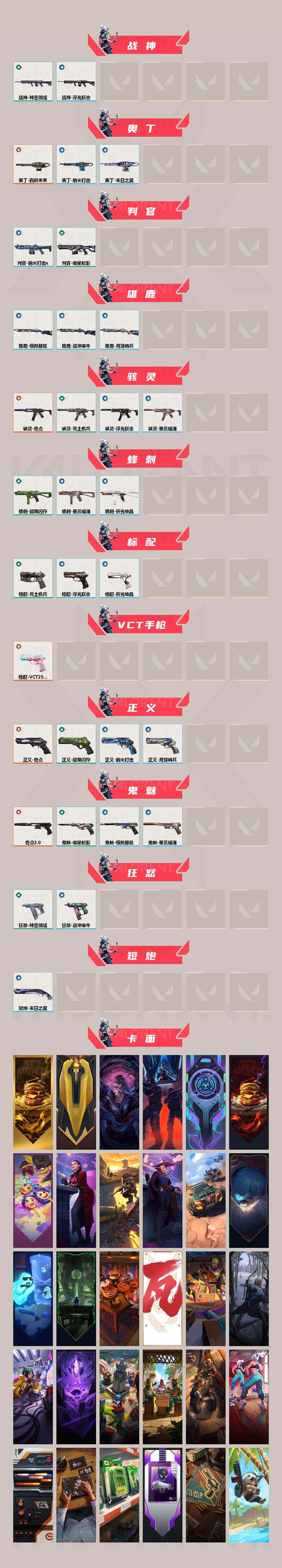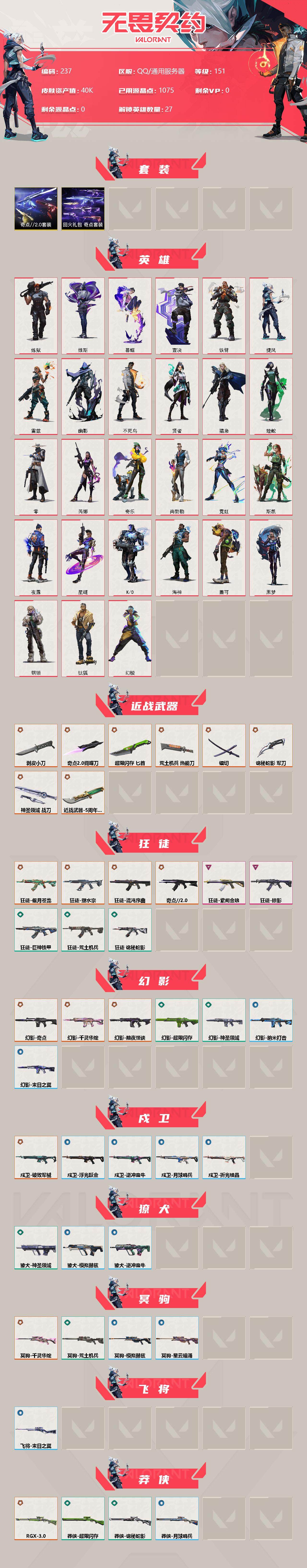 【237】【套装】:奇点//2.0套装,回火礼包:奇点套装 【英雄】:幻棱,炼狱,维斯,暮蝶,钛狐,壹决,铁臂,捷风,雷兹,幽影,不死鸟,贤者,猎枭,蝰蛇,零,芮娜,奇乐,尚勃勒,霓虹,斯凯,夜露,星礈,k/o,海神,盖可,黑梦,钢锁 【近战 武器】:近战武器-5周年//公测重制版 苍龙之刃,近战武器-剥皮小刀,近战武器-奇点//2.0 蝴蝶刀,近战武器-镭切,近战武器-超限闪存 匕首,近战武器-荒土机兵 热能刀,近战武器-诡秘蛇影 军刀,近战武器-神圣领域 战刀 【狂徒】:狂徒-混沌序曲,狂徒-奇点//2.0,狂徒-塑水宗,狂徒-偃月苍龙,狂徒-掠影,狂徒-紫阙金琅,狂徒-荒土机兵,狂徒-巨神铁甲,狂徒-诡秘蛇影 【幻影】:幻影-黯夜怪谈,幻影-奇点,幻影-千灵华绽,幻影-超限闪存,幻影-神圣领域,幻影-纳米打击,幻影-末日之翼 【戍卫】:戍卫-破败军械,戍卫-浮光跃金,戍卫-逆冲蛮牛,戍卫-月球哨兵,戍卫-折光棱晶 【獠犬】:獠犬-神圣领域,獠犬-模拟赫兹,獠犬-逆冲蛮牛 【冥驹】:冥驹-千灵华绽,冥驹-荒土机兵,冥驹-模拟赫兹,冥驹-星云暗涌 【飞将】:飞将-末日之翼 【莽侠】:莽侠-rgx 11z pro//3.0,莽侠-超限闪存,莽侠-诡秘蛇影,莽侠-月球哨兵 【战神】:战神-神圣领域,战神-浮光跃金 【奥丁】:奥丁-西部未来,奥丁-纳米打击,奥丁-末日之翼 【判官】:判官-诡秘蛇影,判官-纳米打击x 【雄鹿】:雄鹿-模拟赫兹,雄鹿-逆冲蛮牛,雄鹿-月球哨兵 【骇灵】:骇灵-奇点,骇灵-荒土机兵,骇灵-浮光跃金,骇灵-星云暗涌 【蜂刺】:蜂刺-超限闪存,蜂刺-星云暗涌,蜂刺-折光棱晶 【标配】:标配-荒土机兵,标配-浮光跃金,标配-折光棱晶 【vct手呛】:标配-vct25 x blg 【正义】:正义-奇点,正义-超限闪存,正义-纳米打击,正义-月球哨兵 【鬼魅】:鬼魅-奇点//2.0,鬼魅-诡秘蛇影,鬼魅-模拟赫兹,鬼魅-星云暗涌 【狂怒】:狂怒-神圣领域,狂怒-逆冲蛮牛 【短炮】:短炮-末日之翼 【卡面】:终章:激斗汉堡 卡面,进入射程 卡面,分崩离析 卡面,纳米打击 卡面,抑制技术 卡面,激斗汉堡 卡面,瓦娃脸雪糕 p2 卡面,从黄昏到黎明 卡面,荒土机兵 卡面,银弹猎手 卡面,逆冲蛮牛 卡面,《双城之战》拥抱 卡面,精灵大战 卡面,欢迎来到底城 卡面,南瓜盛典 卡面,vct cn首冠 卡面,唱片的故事 卡面,钢弓与箭弦 卡面,排除故障 卡面,奇点//2.0 卡面,战术桌游 卡面,悠享食光 卡面,修车达人 卡面,热舞环节 卡面,模拟赫兹 卡面,浮光跃金 卡面,超限闪存 卡面,维斯工牌 卡面,正义的化身 卡面,树懒大作战 卡面,clutch 卡面,无畏契约:尚勃勒 卡面,打造专属狂徒 卡面,无畏契约go!第一卷:芮娜 卡面,无畏契约go!第一卷:零 卡面,《双城之战》金克丝 卡面,代号红色 卡面,新兵报到 卡面,v契约 卡面,无畏契约 卡面 【喷漆】:小小心意 喷漆,战“素”兔 喷漆,宇宙的指引 喷漆,请求重启 喷漆,逆冲蛮牛 喷漆,纳米打击 喷漆,鼻尖上的蝴蝶 喷漆,简笔画黯兽 喷漆,独守蝰腹 喷漆,他们将落荒而逃 喷漆,通缉:战术企鹅 喷漆,荒土机兵 喷漆,别挡我吃球! 喷漆,嗨宝南瓜灯 喷漆,嘭! 喷漆,都算到了 喷漆,控场勿近 喷漆,皮蛋呼呼 喷漆,像素星礈 喷漆,图谋不轨的零 喷漆,小丑猫 喷漆,模拟赫兹 喷漆,高丽风情小熊 喷漆,奇点//2.0 喷漆,蹲到一个 喷漆,全力集中 喷漆,超限闪存 喷漆,rua一下 喷漆,熊抱 喷漆,蛋糕还是爆能器? 喷漆,高丽风情小虎 喷漆,记在小本本 喷漆,防弹企鹅 喷漆,高丽风情小蛙 喷漆,致命优雅 喷漆,别挡我的路! 喷漆,霓光四射 喷漆,买装还是存钱 喷漆,无畏契约go!第一卷:捷风 喷漆,无畏契约go!第一卷:贤者 喷漆,胜利属于无畏契约 喷漆,glhf 喷漆,无畏契约 喷漆 【挂饰】:终章:猫猫木乃伊 挂饰,荒土机兵 挂饰,悠闲鸡块 挂饰,猫猫木乃伊 挂饰,水壶 挂饰,纳米打击 挂饰,逆冲蛮牛 挂饰,可爱糖糖 挂饰,伞绳 挂饰,《双城之战》小蛋糕 挂饰,第九季//第三幕 纪念币 挂饰,拳击战术熊 挂饰,工具腰带 挂饰,暗藏猫腻 挂饰,高丽风情 挂饰,奇点//2.0 挂饰,熔岩灯 挂饰,超限闪存 挂饰,瞬云履 挂饰,迷你k/o 挂饰,模拟赫兹 挂饰,第九季//第二幕 纪念币 挂饰,天外飞客 挂饰,无畏契约 纪念币 挂饰