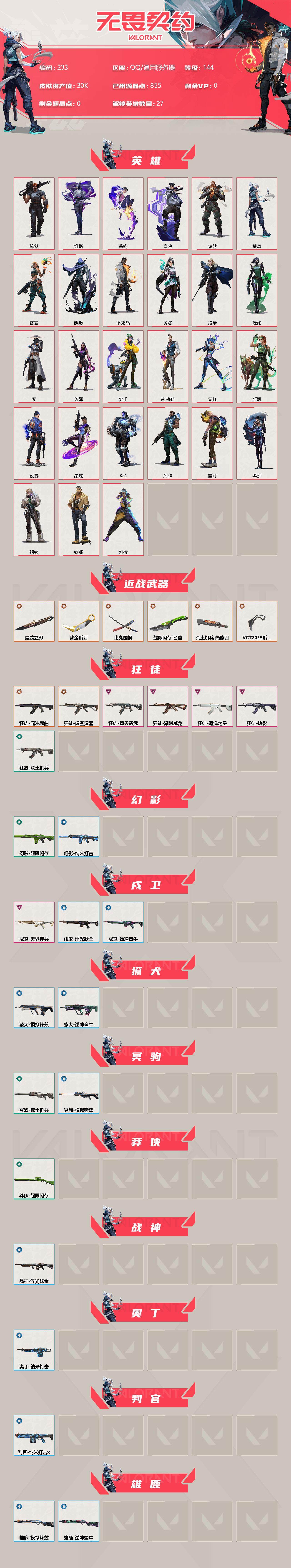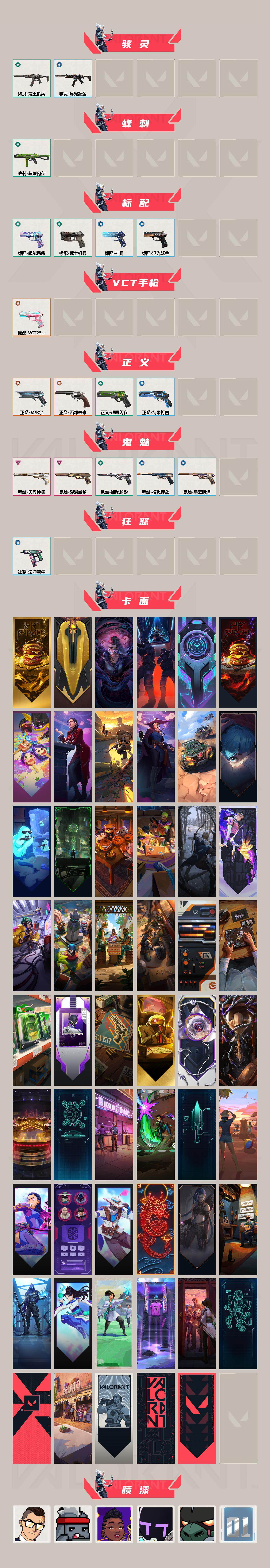 【233】【套装】:vct 2025 赛季套装,耀鳞威龙套装 【英雄】:幻棱,炼狱,维斯,暮蝶,钛狐,壹决,铁臂,捷风,雷兹,幽影,不死鸟,贤者,猎枭,蝰蛇,零,芮娜,奇乐,尚勃勒,霓虹,斯凯,夜露,星礈,k/o,海神,盖可,黑梦,钢锁 【近战 武器】:近战武器-vct 2025 爪刀,近战武器-紫金爪刀,近战武器-威龙之刃,近战武器-鬼丸国纲,近战武器-超限闪存 匕首,近战武器-荒土机兵 热能刀 【狂徒】:狂徒-混沌序曲,狂徒-虚空遗器,狂徒-堕天遗武,狂徒-掠影,狂徒-海洋之星,狂徒-耀鳞威龙,狂徒-荒土机兵 【幻影】:幻影-超限闪存,幻影-纳米打击 【戍卫】:戍卫-天界神兵,戍卫-浮光跃金,戍卫-逆冲蛮牛 【獠犬】:獠犬-模拟赫兹,獠犬-逆冲蛮牛 【冥驹】:冥驹-荒土机兵,冥驹-模拟赫兹 【莽侠】:莽侠-超限闪存 【战神】:战神-浮光跃金 【奥丁】:奥丁-纳米打击 【判官】:判官-纳米打击x 【雄鹿】:雄鹿-模拟赫兹,雄鹿-逆冲蛮牛 【骇灵】:骇灵-荒土机兵,骇灵-浮光跃金 【蜂刺】:蜂刺-超限闪存 【标配】:标配-超能偶像,标配-荒土机兵,标配-浮光跃金,标配-神罚 【vct手呛】:标配-vct25 x blg 【正义】:正义-塑水宗,正义-西部未来,正义-超限闪存,正义-纳米打击 【鬼魅】:鬼魅-天界神兵,鬼魅-耀鳞威龙,鬼魅-诡秘蛇影,鬼魅-模拟赫兹,鬼魅-星云暗涌 【狂怒】:狂怒-逆冲蛮牛 【卡面】:终章:激斗汉堡 卡面,进入射程 卡面,分崩离析 卡面,纳米打击 卡面,抑制技术 卡面,激斗汉堡 卡面,瓦娃脸雪糕 p2 卡面,从黄昏到黎明 卡面,荒土机兵 卡面,银弹猎手 卡面,逆冲蛮牛 卡面,《双城之战》拥抱 卡面,精灵大战 卡面,欢迎来到底城 卡面,南瓜盛典 卡面,唱片的故事 卡面,钢弓与箭弦 卡面,无畏契约:暮蝶 卡面,排除故障 卡面,战术桌游 卡面,悠享食光 卡面,修车达人 卡面,模拟赫兹 卡面,浮光跃金 卡面,超限闪存 卡面,维斯工牌 卡面,正义的化身 卡面,终章:生意人麦宝 卡面,铁之华 卡面,时间到 卡面,最高舞台 卡面,声感陷阱设计图 卡面,梦幻奶茶 卡面,源能反应 卡面,零点嗅探设计图 卡面,沙雕爆能器 卡面,无畏契约go!第一卷:芮娜 卡面,清除名单 卡面,无畏契约go!第一卷:零 卡面,龍记 卡面,《双城之战》金克丝 卡面,完美调谐 卡面 ,暗呛 卡面,无畏契约go!第一卷:贤者 卡面,夯实根基 卡面,"luie" 卡面,热烈欢迎 卡面,铁臂设计图 卡面,代号红色 卡面,冰淇淋店 卡面,新兵报到 卡面,v契约 卡面,无畏契约 卡面 【喷漆】:小小心意 喷漆,战“素”兔 喷漆,宇宙的指引 喷漆,请求重启 喷漆,逆冲蛮牛 喷漆,纳米打击 喷漆,鼻尖上的蝴蝶 喷漆,简笔画黯兽 喷漆,独守蝰腹 喷漆,他们将落荒而逃 喷漆,通缉:战术企鹅 喷漆,荒土机兵 喷漆,别挡我吃球! 喷漆,嗨宝南瓜灯 喷漆,嘭! 喷漆,都算到了 喷漆,控场勿近 喷漆,皮蛋呼呼 喷漆,像素星礈 喷漆,图谋不轨的零 喷漆,伤心心 喷漆,小丑猫 喷漆,模拟赫兹 喷漆,高丽风情小熊 喷漆,蹲到一个 喷漆,全力集中 喷漆,超限闪存 喷漆,rua一下 喷漆,熊抱 喷漆,高丽风情小虎 喷漆,记在小本本 喷漆,防弹企鹅 喷漆,高丽风情小蛙 喷漆,超级粉丝 喷漆,捷风差距 喷漆,惊声尖叫 喷漆,2021冠军巡回赛花火 喷漆,拼一呛 喷漆,我的刀呢? 喷漆,uwu 喷漆,新潮流 喷漆,双击点赞 喷漆,买装还是存钱 喷漆,醒狮贺春 喷漆,无畏契约go!第一卷:芮娜 喷漆,蕊形灯 喷漆,老铁困了 喷漆,口袋贤者 喷漆,胜利属于无畏契约 喷漆,glhf 喷漆,无畏契约 喷漆 【挂饰】:终章:猫猫木乃伊 挂饰,荒土机兵 挂饰,悠闲鸡块 挂饰,猫猫木乃伊 挂饰,水壶 挂饰,纳米打击 挂饰,逆冲蛮牛 挂饰,可爱糖糖 挂饰,伞绳 挂饰,《双城之战》小蛋糕 挂饰,第九季//第三幕 纪念币 挂饰,拳击战术熊 挂饰,工具腰带 挂饰,无畏契约go!第一卷 芮娜 挂饰,无畏契约go!第一卷 零 挂饰,暗藏猫腻 挂饰,高丽风情 挂饰,熔岩灯 挂饰,超限闪存 挂饰,迷你k/o 挂饰,模拟赫兹 挂饰,第九季//第二幕 纪念币 挂饰,终章:这瓜保熟 挂饰,糖葫芦 挂饰,袖珍捷风 挂饰,迷你浓缩 挂饰,第九季//第一幕 纪念币 挂饰,荧光棒 挂饰,第八季//第三幕 纪念币 挂饰,传世莲华 挂饰,第八季//第二幕 纪念币 挂饰 ,天外飞客 挂饰,好运福爪 挂饰,《双城之战》魄罗 挂饰,第八季//第一幕 纪念币 挂饰,冬日絮语 挂饰,第七季//第三幕 纪念币 挂饰,幸运中国结 挂饰,无畏契约 纪念币 挂饰