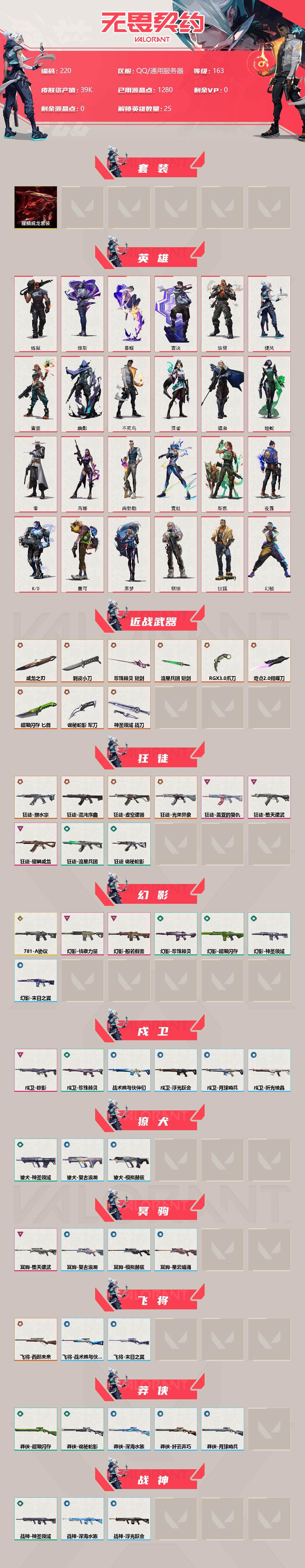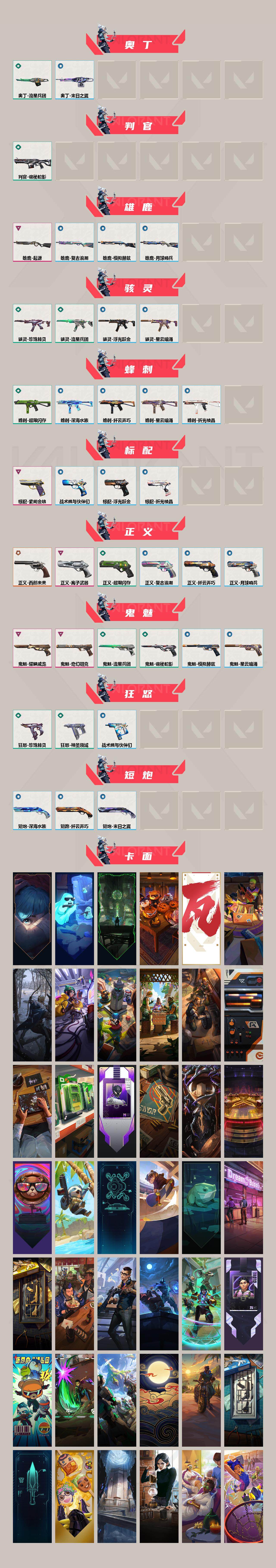【220】【套装】:耀鳞威龙套装 【英雄】:幻棱,炼狱,维斯,暮蝶,钛狐,壹决,铁臂,捷风,雷兹,幽影,不死鸟,贤者,猎枭,蝰蛇,零,芮娜,尚勃勒,霓虹,斯凯,夜露,k/o,盖可,黑梦,钢锁 【近战 武器】:近战武器-剥皮小刀,近战武器-奇点//2.0 蝴蝶刀,近战武器-rgx 11z pro//3.0 爪刀,近战武器-威龙之刃,近战武器-珍珠棘贝 短剑,近战武器-流星兵团 短剑,近战武器-超限闪存 匕首,近战武器-诡秘蛇影 军刀,近战武器-神圣领域 战刀 【狂徒】:狂徒-混沌序曲,狂徒-塑水宗,狂徒-虚空遗器,狂徒-光荣异象,狂徒-堕天遗武,狂徒-盖亚的复仇,狂徒-耀鳞威龙,狂徒-流星兵团,狂徒-诡秘蛇影 【幻影】:幻影-781-a协议,幻影-般若假面,幻影-侦察力量,幻影-超限闪存,幻影-珍珠棘贝,幻影-神圣领域,幻影-末日之翼 【戍卫】:戍卫-掠影,戍卫-珍珠棘贝,戍卫-浮光跃金,戍卫-战术熊与伙伴们,戍卫-月球哨兵,戍卫-折光棱晶 【獠犬】:獠犬-神圣领域,獠犬-复古浪潮,獠犬-模拟赫兹 【冥驹】:冥驹-堕天遗武,冥驹-复古浪潮,冥驹-模拟赫兹,冥驹-星云暗涌 【飞将】:飞将-西部未来,飞将-战术熊与伙伴们,飞将-末日之翼 【莽侠】:莽侠-超限闪存,莽侠-诡秘蛇影,莽侠-深海水族,莽侠-纤云弄巧,莽侠-月球哨兵 【战神】:战神-神圣领域,战神-浮光跃金,战神-深海水族 【奥丁】:奥丁-流星兵团,奥丁-末日之翼 【判官】:判官-诡秘蛇影 【雄鹿】:雄鹿-起源,雄鹿-复古浪潮,雄鹿-模拟赫兹,雄鹿-月球哨兵 【骇灵】:骇灵-流星兵团,骇灵-珍珠棘贝,骇灵-浮光跃金,骇灵-星云暗涌 【蜂刺】:蜂刺-超限闪存,蜂刺-深海水族,蜂刺-纤云弄巧,蜂刺-星云暗涌,蜂刺-折光棱晶 【标配】:标配-紫阙金琅,标配-浮光跃金,标配-战术熊与伙伴们,标配-折光棱晶 【正义】:正义-西部未来,正义-离子武器,正义-超限闪存,正义-复古浪潮,正义-纤云弄巧,正义-月球哨兵 【鬼魅】:鬼魅-奇幻朋克,鬼魅-耀鳞威龙,鬼魅-流星兵团,鬼魅-诡秘蛇影,鬼魅-模拟赫兹,鬼魅-星云暗涌 【狂怒】:狂怒-珍珠棘贝,狂怒-神圣领域,狂怒-战术熊与伙伴们 【短炮】:短炮-深海水族,短炮-纤云弄巧,短炮-末日之翼 【卡面】:《双城之战》拥抱 卡面,精灵大战 卡面,欢迎来到底城 卡面,南瓜盛典 卡面,vct cn首冠 卡面,唱片的故事 卡面,钢弓与箭弦 卡面,排除故障 卡面,战术桌游 卡面,悠享食光 卡面,修车达人 卡面,模拟赫兹 卡面,浮光跃金 卡面,超限闪存 卡面,维斯工牌 卡面,正义的化身 卡面,时间到 卡面,最高舞台 卡面,音熊登场 卡面,树懒大作战 卡面,声感陷阱设计图 卡面,clutch 卡面,霓帧牛蛙 卡面,梦幻奶茶 卡面,终章:打造专属狂徒 卡面,趁热吃 卡面,西装暴徒 卡面,失控边缘 卡面,哨卫者之领域 卡面,暮蝶工牌 卡面,战术熊与伙伴们 卡面,源能反应 卡面,流星兵团 卡面,纤云弄巧 卡面,暂别喧嚣 卡面,打造专属狂徒 卡面,零点嗅探设计图 卡面,终章:瓦娃脸雪糕 卡面,表象之下 卡面,虹吸式咖啡壶 卡面,源能者美容 卡面,脚踝终结者 卡面 ,夜班 卡面,瓦娃脸雪糕 卡面 ,沙雕爆能器 卡面,无畏契约go!第一卷:芮娜 卡面,深海水族 卡面,珍珠棘贝 卡面,复古浪潮 卡面,盖可工牌 卡面,清除名单 卡面,无畏契约go!第一卷:零 卡面,龍记 卡面,《双城之战》金克丝 卡面,完美调谐 卡面 ,暗呛 卡面,无畏契约go!第一卷:贤者 卡面,黑影先生的咖啡! 卡面,胡桃狂想 卡面,夯实根基 卡面,铁臂设计图 卡面,代号红色 卡面,新兵报到 卡面,v契约 卡面,无畏契约 卡面 【喷漆】:嗨宝南瓜灯 喷漆,嘭! 喷漆,都算到了 喷漆,控场勿近 喷漆,皮蛋呼呼 喷漆,像素星礈 喷漆,图谋不轨的零 喷漆,伤心心 喷漆,小丑猫 喷漆,模拟赫兹 喷漆,高丽风情小熊 喷漆,蹲到一个 喷漆,全力集中 喷漆,超限闪存 喷漆,rua一下 喷漆,熊抱 喷漆,高丽风情小虎 喷漆,记在小本本 喷漆,防弹企鹅 喷漆,高丽风情小蛙 喷漆,超级粉丝 喷漆,捷风差距 喷漆,惊声尖叫 喷漆,水晶球 喷漆,2021冠军巡回赛花火 喷漆,战术熊的巴拉莱卡琴 喷漆,审判之爪 喷漆,拼一呛 喷漆,加油!加油! 喷漆,开心到爆炸 喷漆,皮蛋萌舞 喷漆,我觉得不行 喷漆,头号粉丝 喷漆,吸一口快乐 喷漆,永远的答案 喷漆,再来一次? 喷漆,别挡我的路! 喷漆,我的刀呢? 喷漆,当然可以 喷漆,流星兵团 喷漆,战术熊与伙伴们 喷漆,禁止喷漆 喷漆,纤云弄巧 喷漆,霓光四射 喷漆,情绪控制 喷漆,哨卫滑步 喷漆,倒吸一口凉气 喷漆,uwu 喷漆,新潮流 喷漆,逮到一个 喷漆,一个人的孤岛 喷漆,双人比心 喷漆,不予置评 喷漆,三熊合一 喷漆,要喝完噢! 喷漆,双击点赞 喷漆,珍珠棘贝 喷漆,深海水族 喷漆,禁止标配 喷漆 ,铁臂尴尬 喷漆,买装还是存钱 喷漆,醒狮贺春 喷漆,无畏契约go!第一卷:贤者 喷漆,蕊形灯 喷漆,老铁困了 喷漆,胜利属于无畏契约 喷漆,glhf 喷漆,无畏契约 喷漆 【挂饰】:悠闲鸡块 挂饰,伞绳 挂饰,《双城之战》小蛋糕 挂饰,第九季//第三幕 纪念币 挂饰,拳击战术熊 挂饰,工具腰带 挂饰,暗藏猫腻 挂饰,高丽风情 挂饰,熔岩灯 挂饰,超限闪存 挂饰,迷你k/o 挂饰,模拟赫兹 挂饰,第九季//第二幕 纪念币 挂饰,袖珍捷风 挂饰,丢麦 挂饰,迷你浓缩 挂饰,尤克里里 挂饰,第九季//第一幕 纪念币 挂饰,终章:迷你机甲 挂饰,犯困的布鲁诺 挂饰,战术河童 挂饰,招财猫熊 挂饰,迷你机甲 挂饰,荧光棒 挂饰,章鱼烧先生 挂饰,流星兵团 挂饰,云开见日 挂饰,第八季//第三幕 纪念币 挂饰,终章:扭结饼干 挂饰 ,战术抓娃娃:阿丹 挂饰 ,瓶